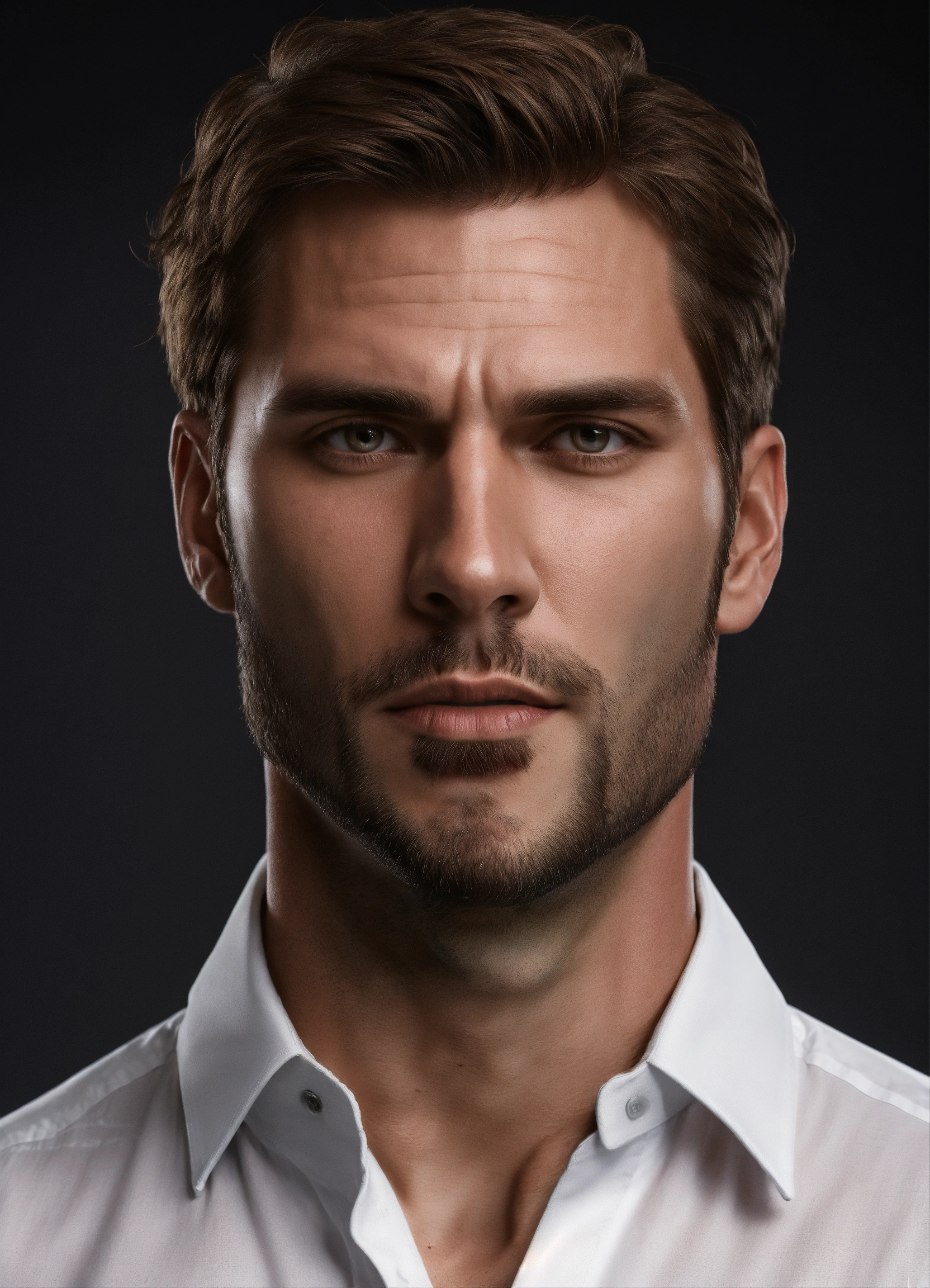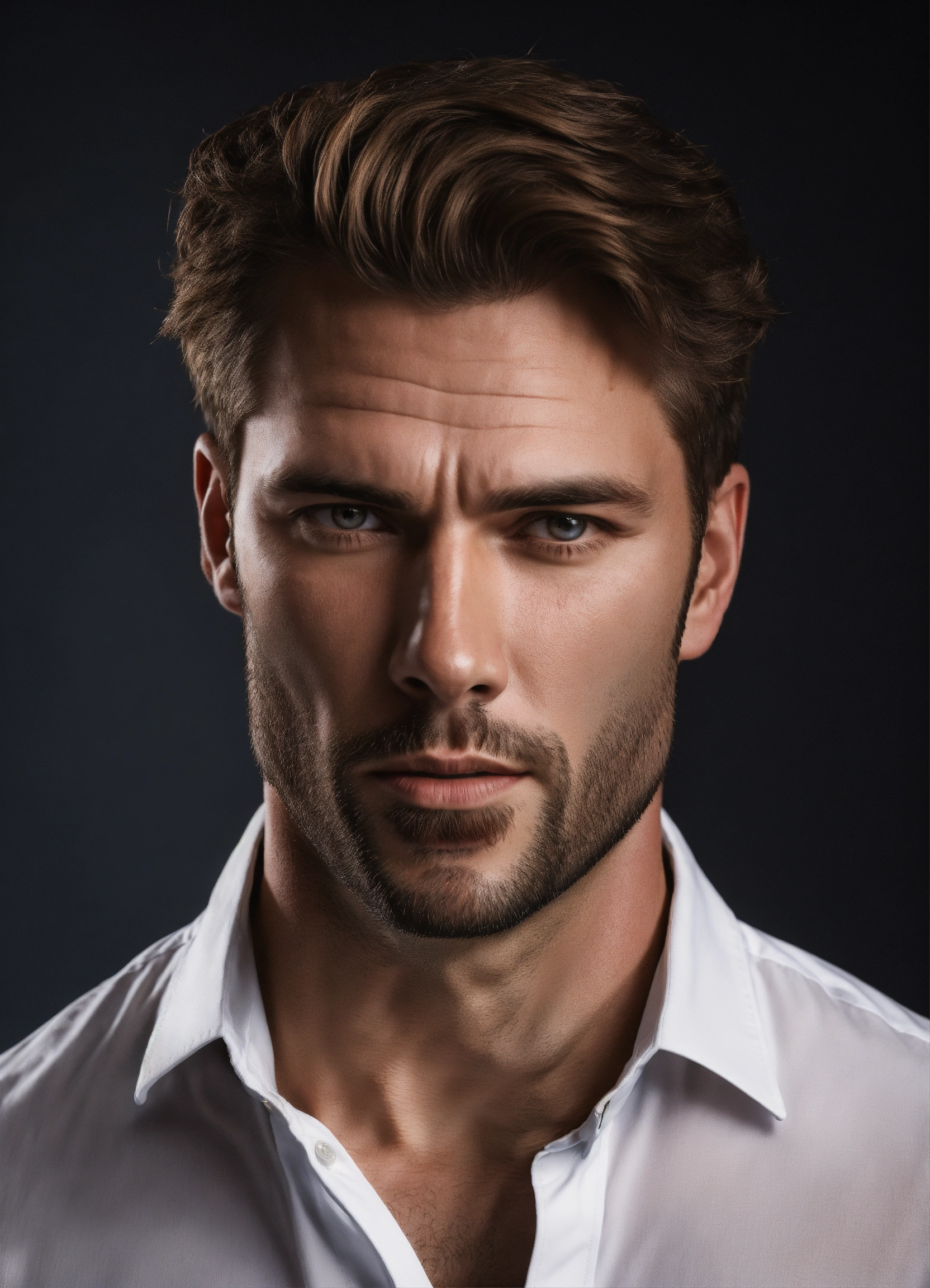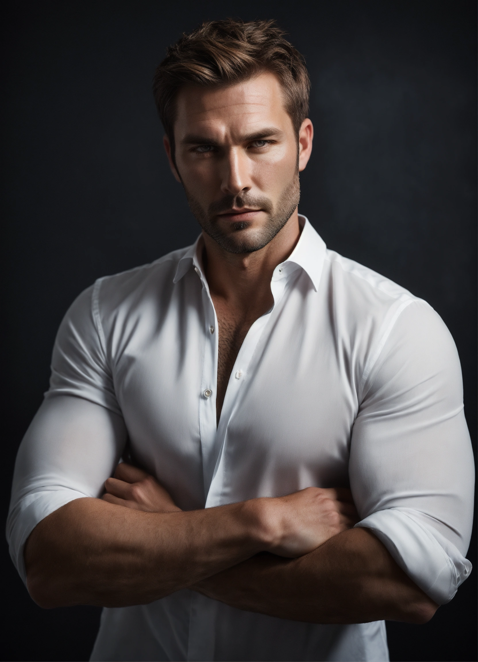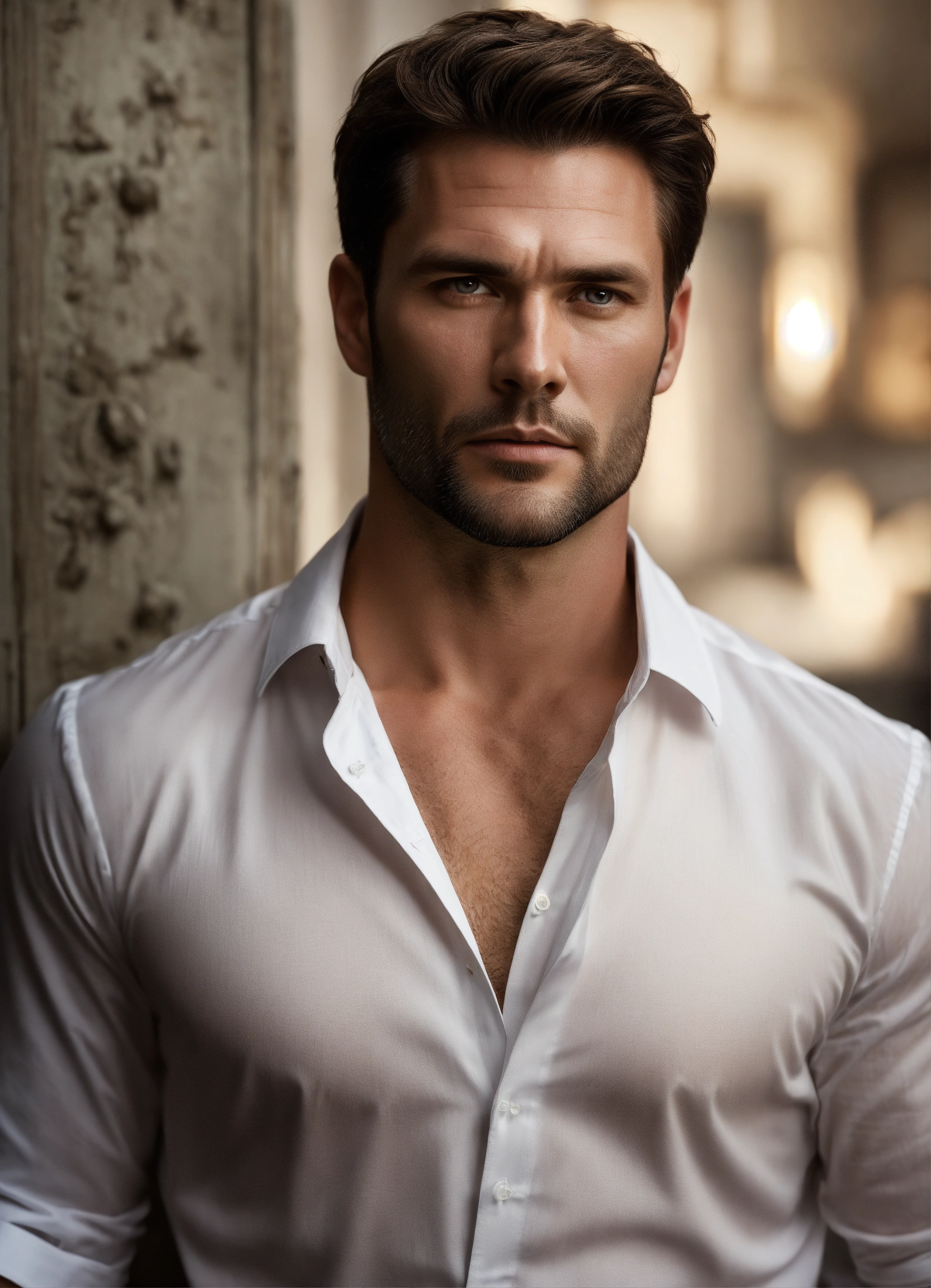 Ultra-realistic handsome brutal 38-year-old man with light brown hair, model with light eyes of european origin, pronounced cheekbones, fashionable strict white shirt slightly unbuttoned with one button, full height, dark background, photorealistic.