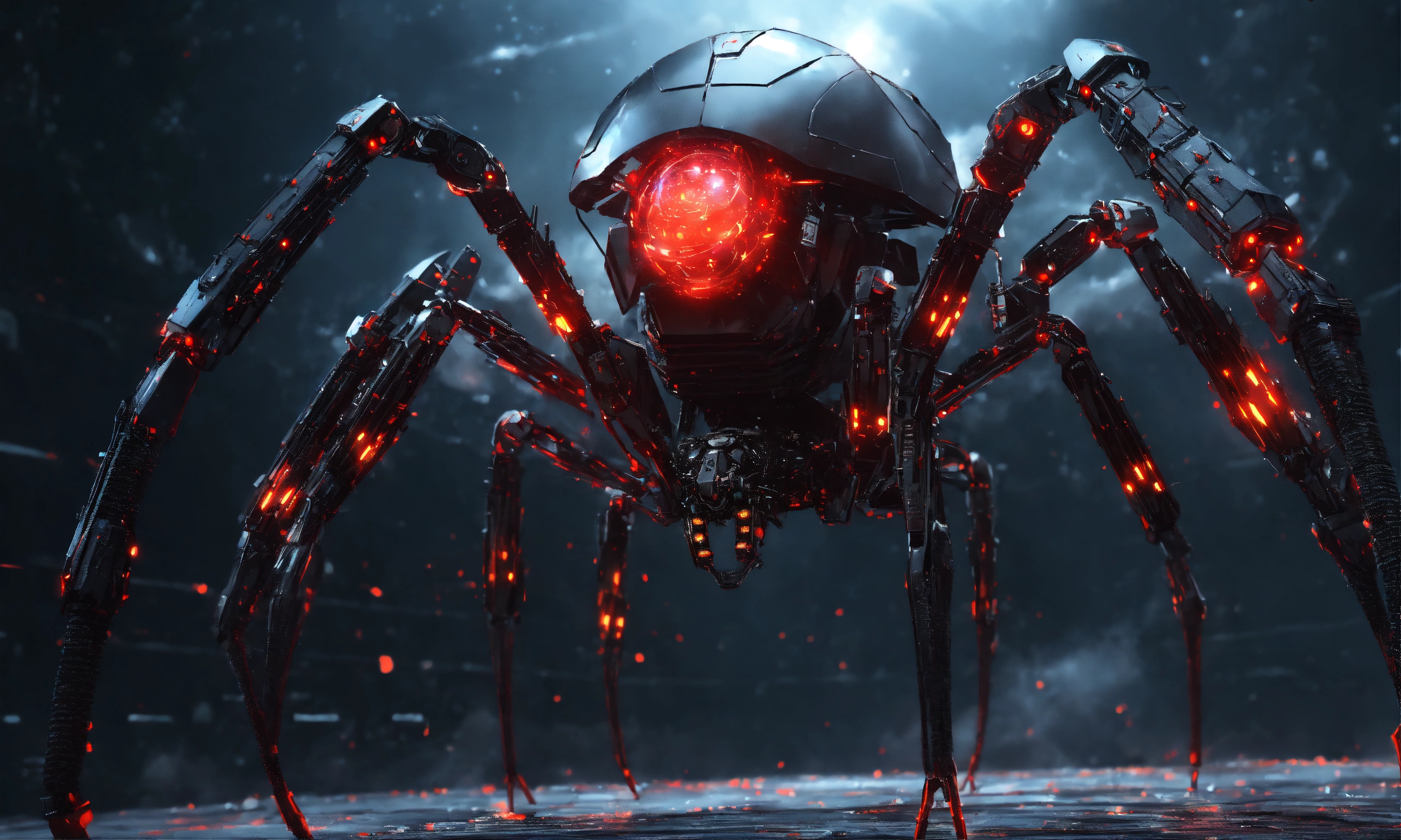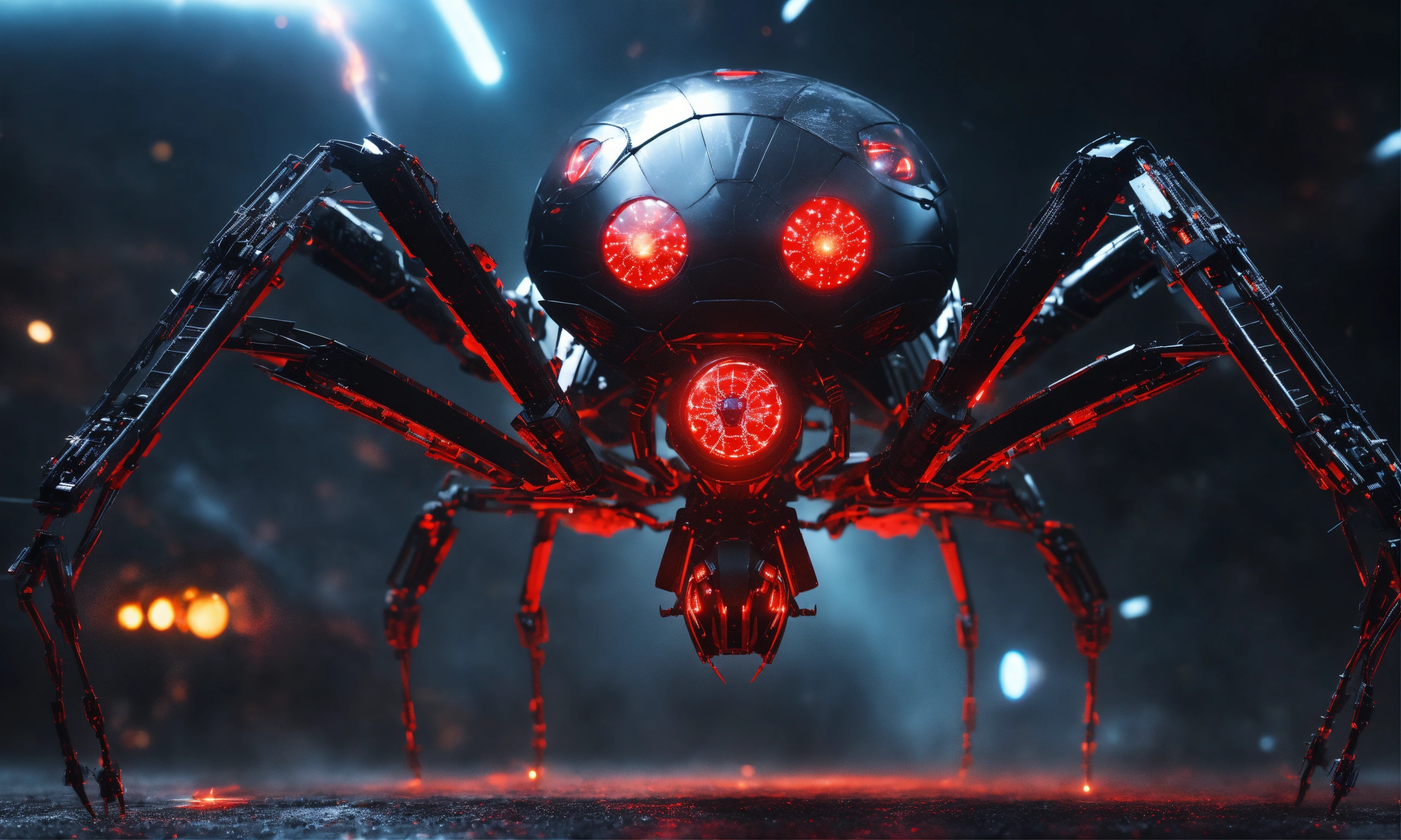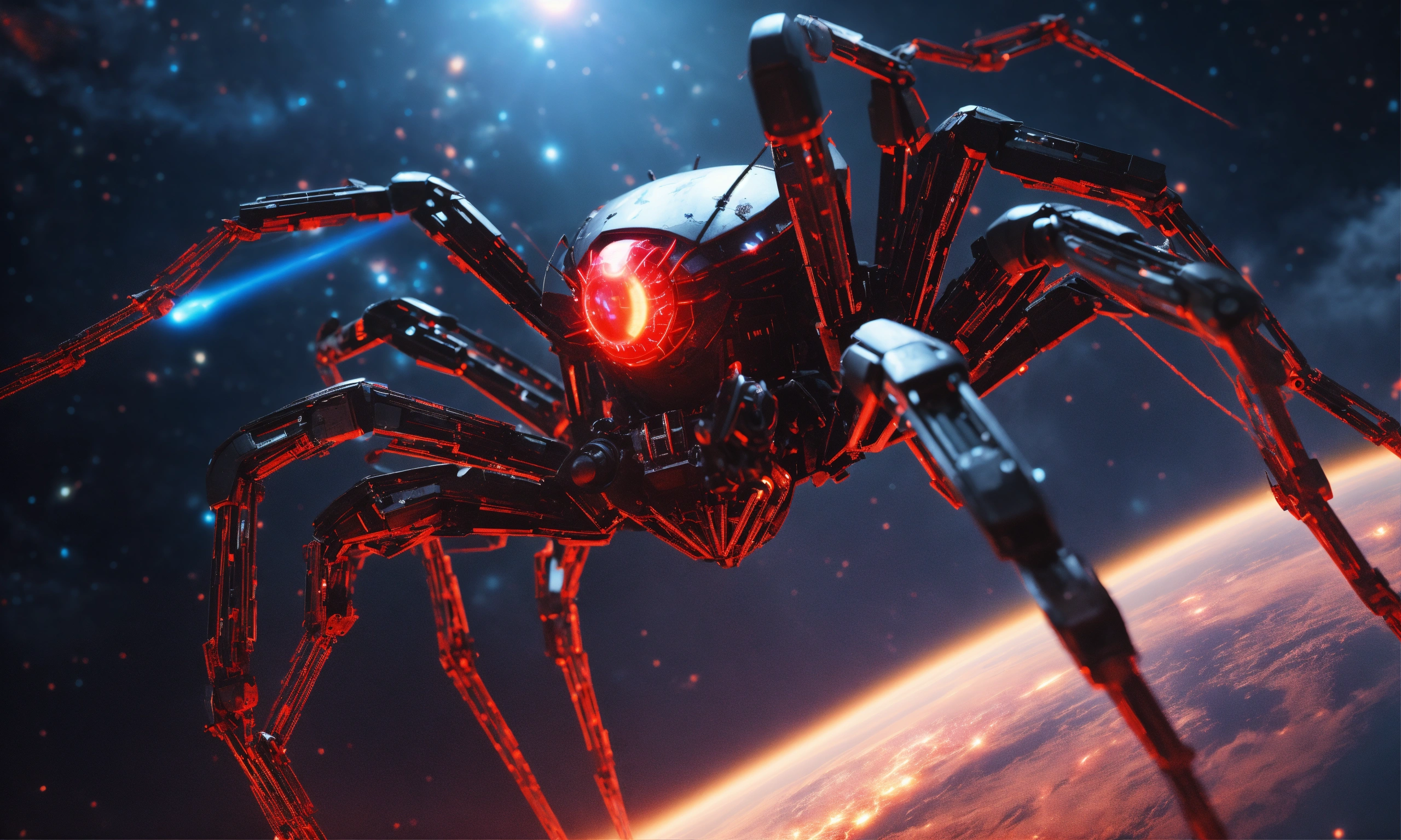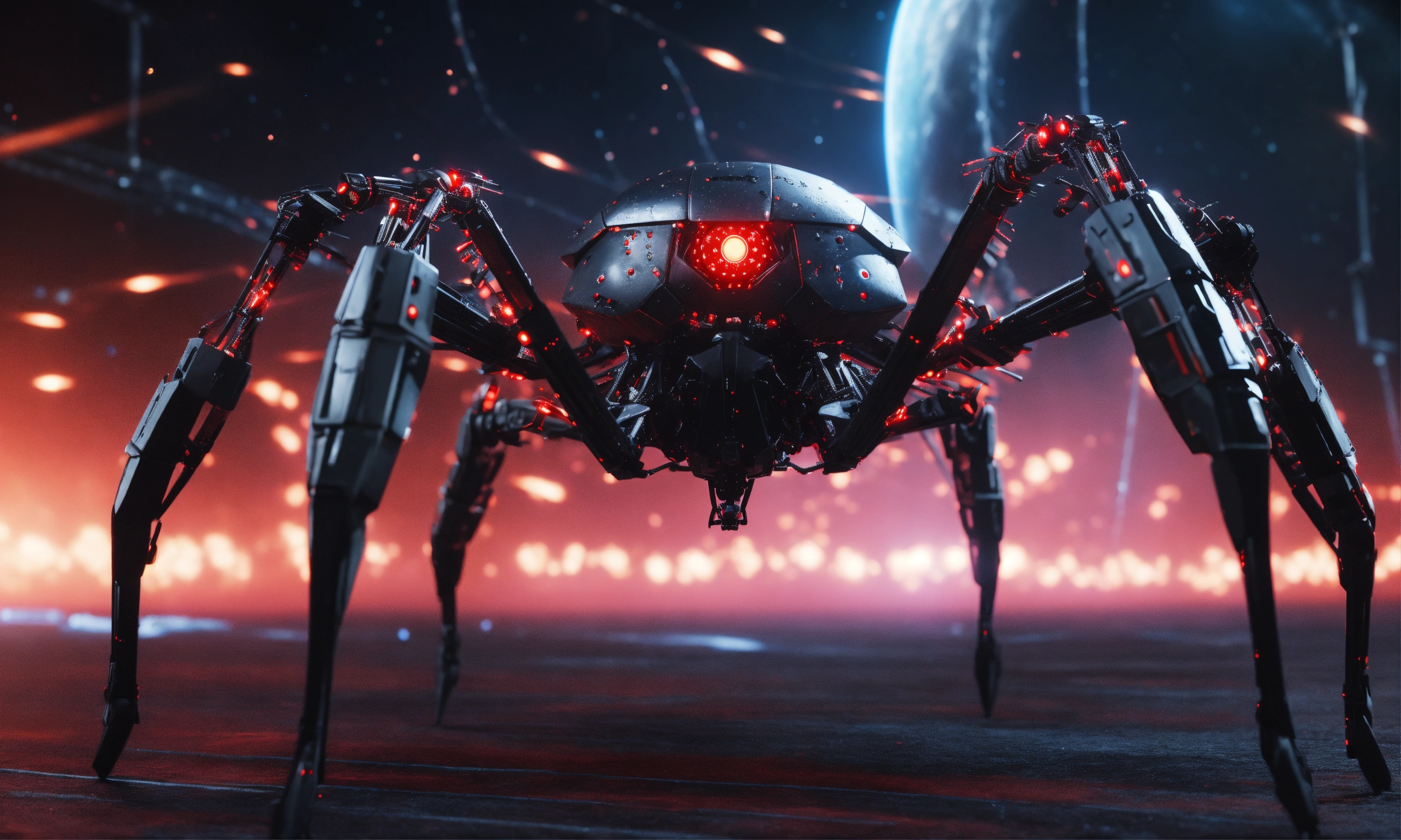 Gigantic black armored robotic spider with red glowing eyes flying in space, feeding off an energy field, the electricity flows surging with power, realistic, 8k
