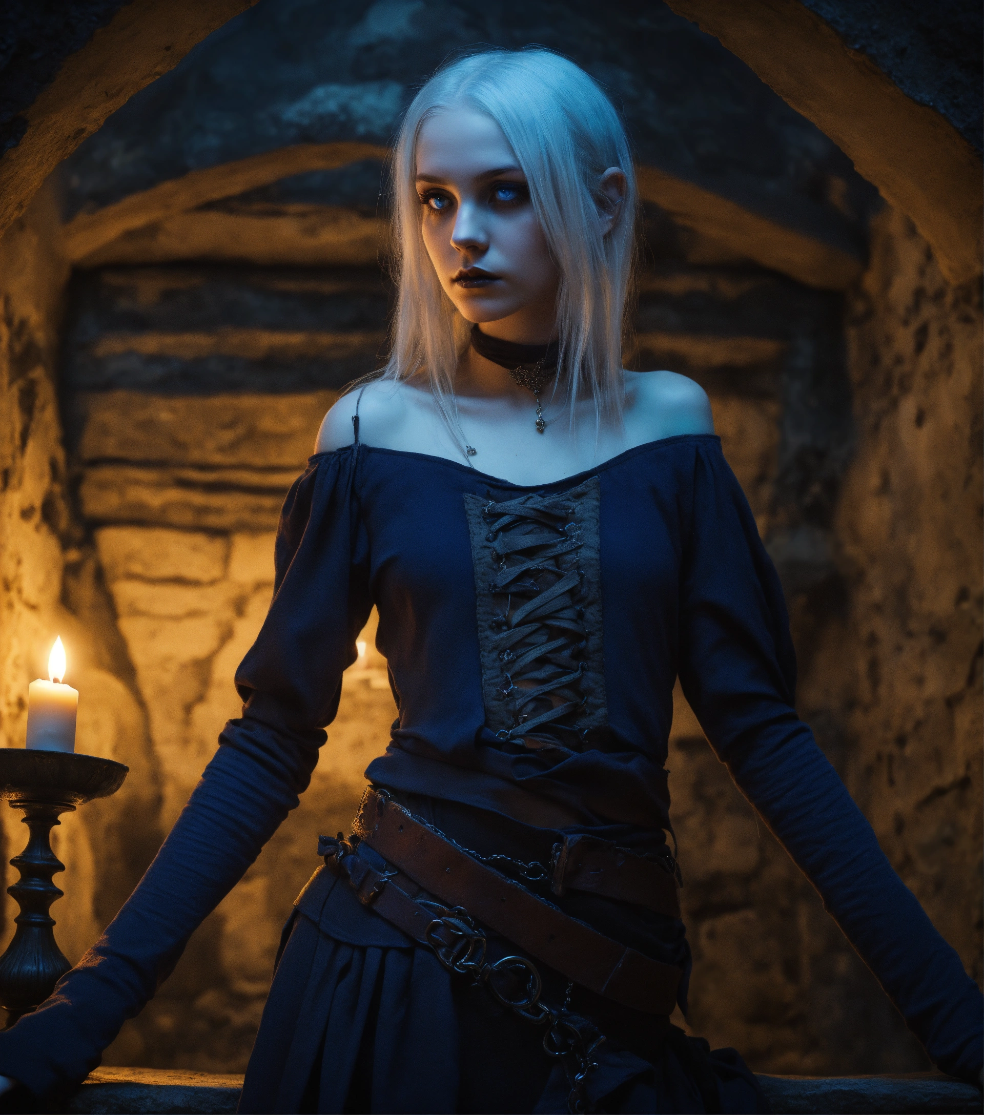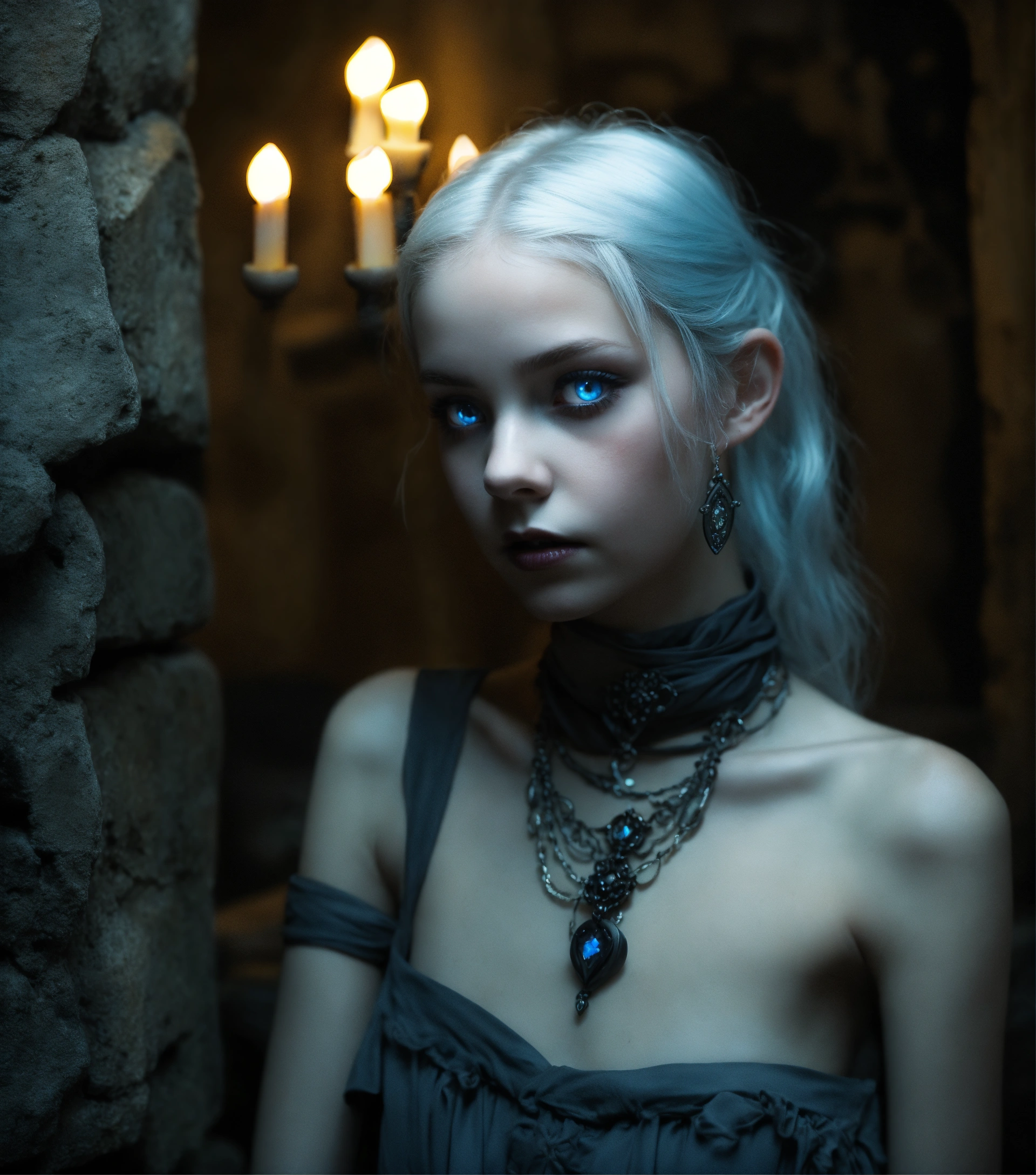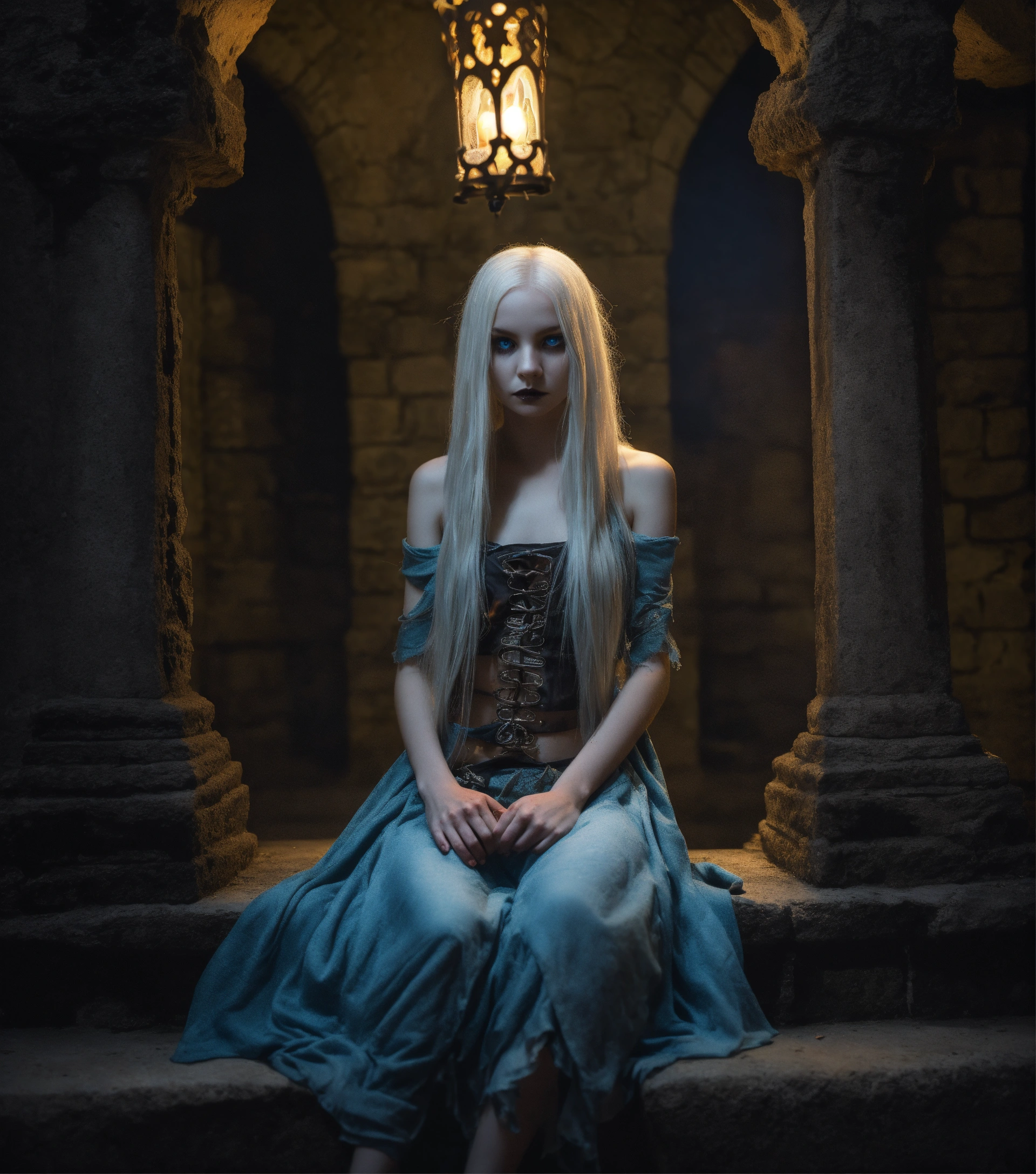 Body portrait of a very childish deadly pale extremely slim twelve year old female child, she is a goth necromancer with waist long silverwhite hair and a short off-the-shoulder crop top and a low worn hip scarf, extremely flat belly, belly button, extremely skinny, extremely slim body, emaciated body, completely emaciated, extremly narrow face, alabaster skin, pale as a corpse, glowing blue eyes, slim face, innocent looking, leans her back lasciviously on a stone bench in a gloomy crypt, innocent pose, kindlich, unschuldig, lasciviously, childlike, graceful, wispy, glowing blue eyes, ghostly, dead, evil, demonic, undead, darkness, grotesque, mysterious, dark, candlelight, cold ambient lighting, extremely detailed, fantasy, medieval setting