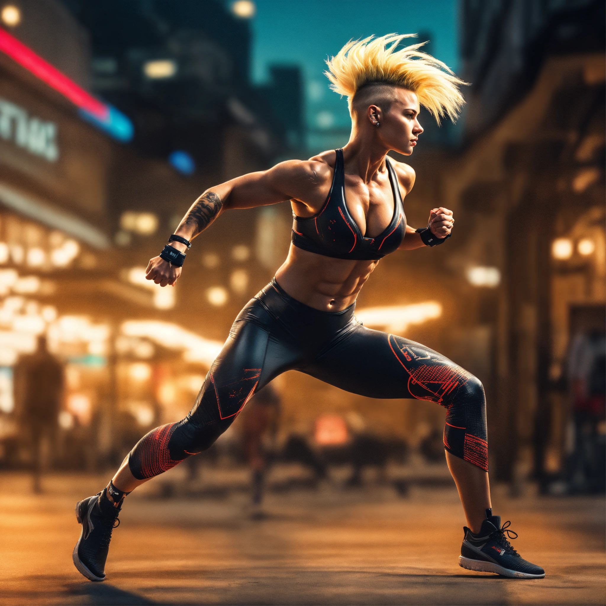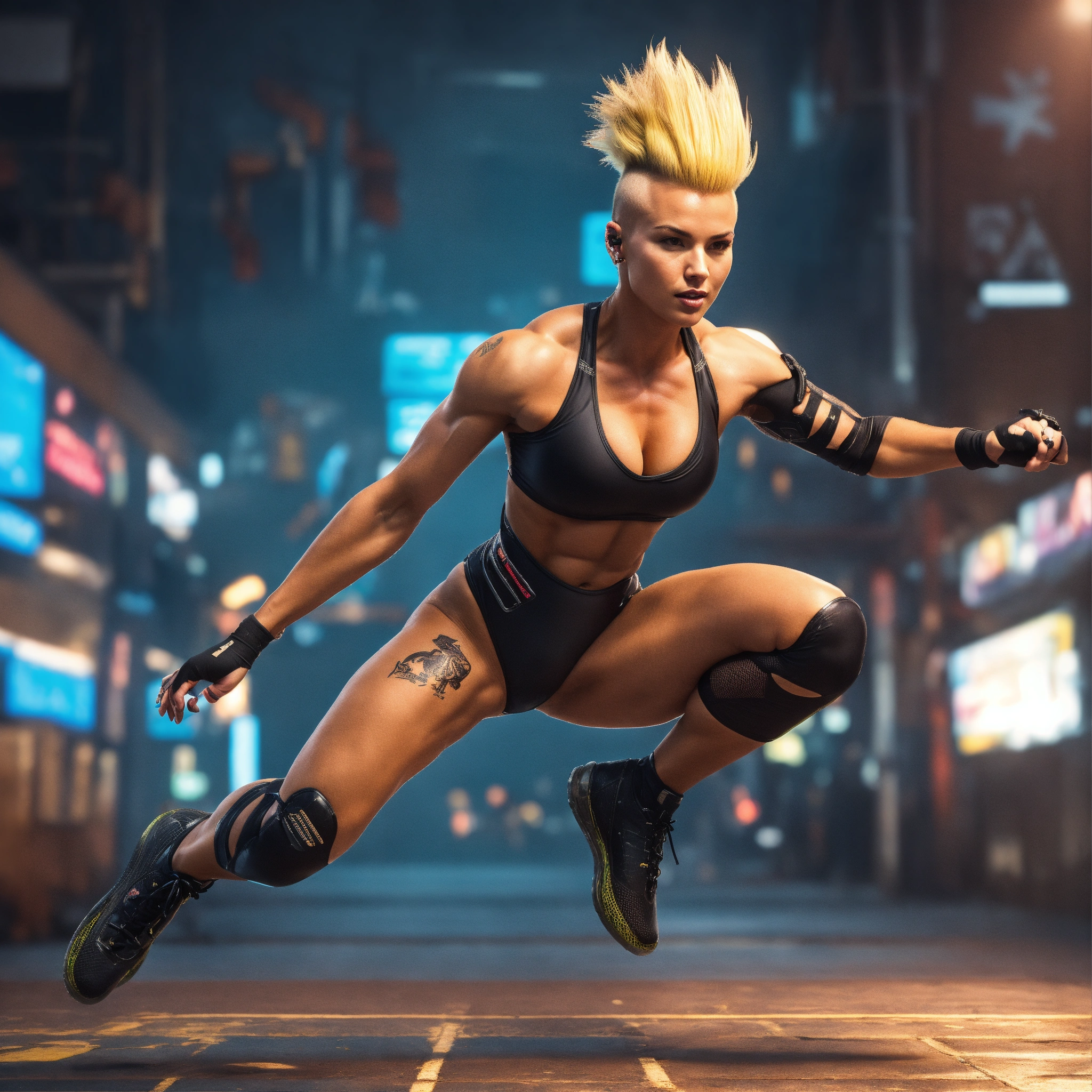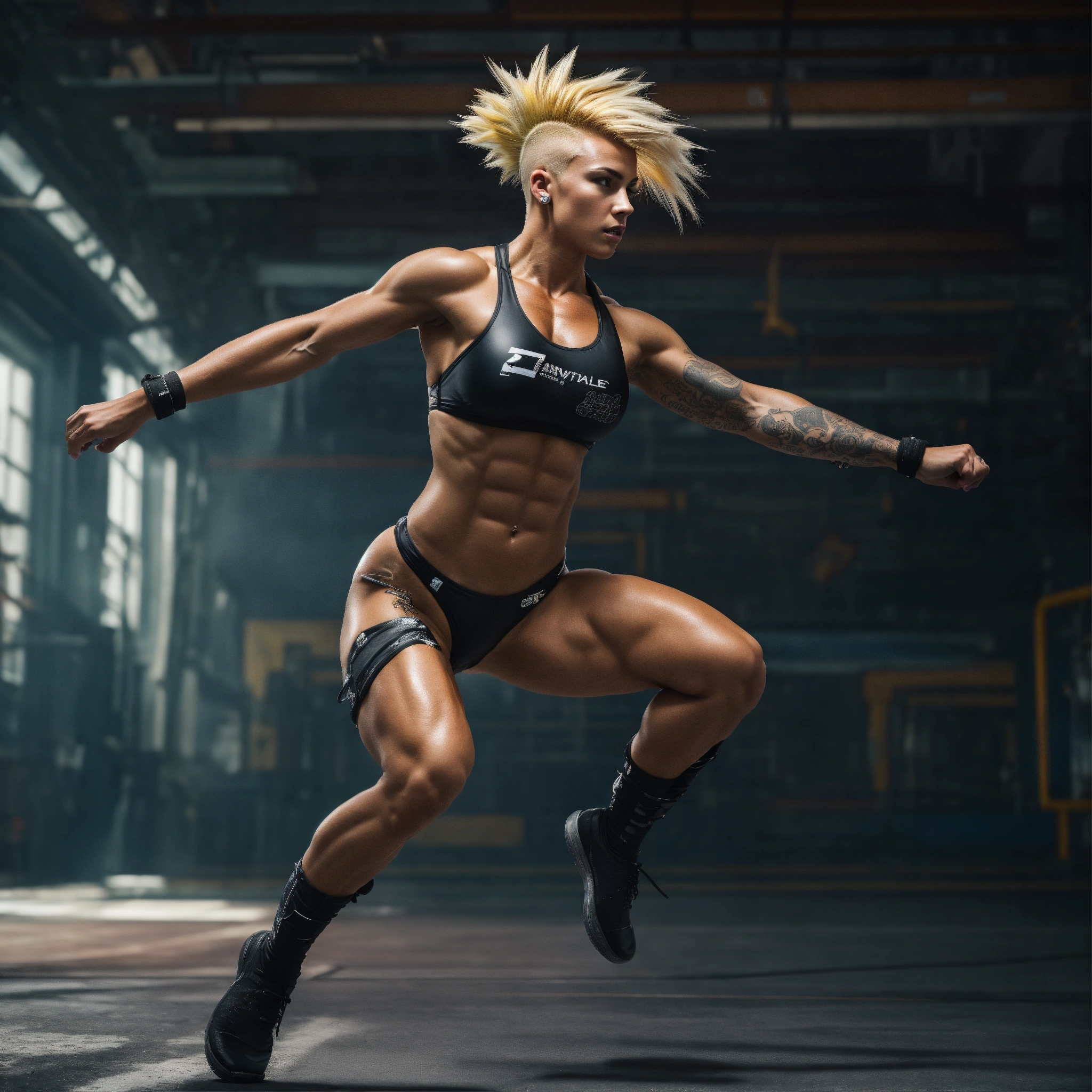 Full body, realistic, photograph, beautiful muscular bodybuilder female with a blonde mohawk wearing a black two piece swimsuit, jumping and kicking, cyberpunk, 3/4 angle, angled