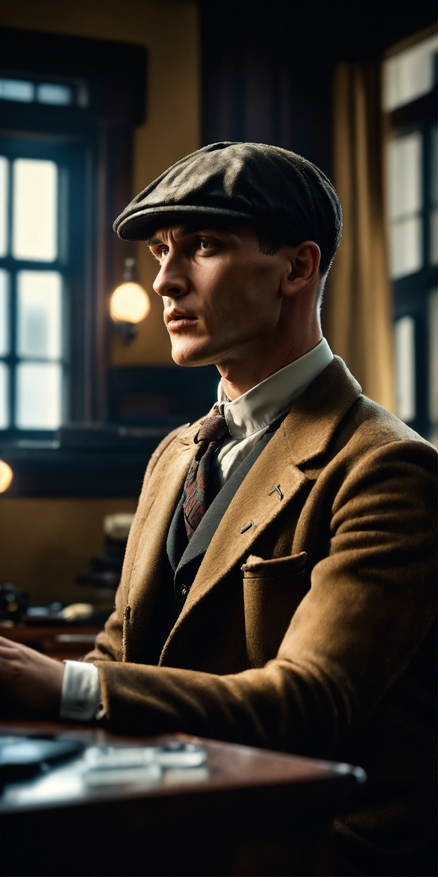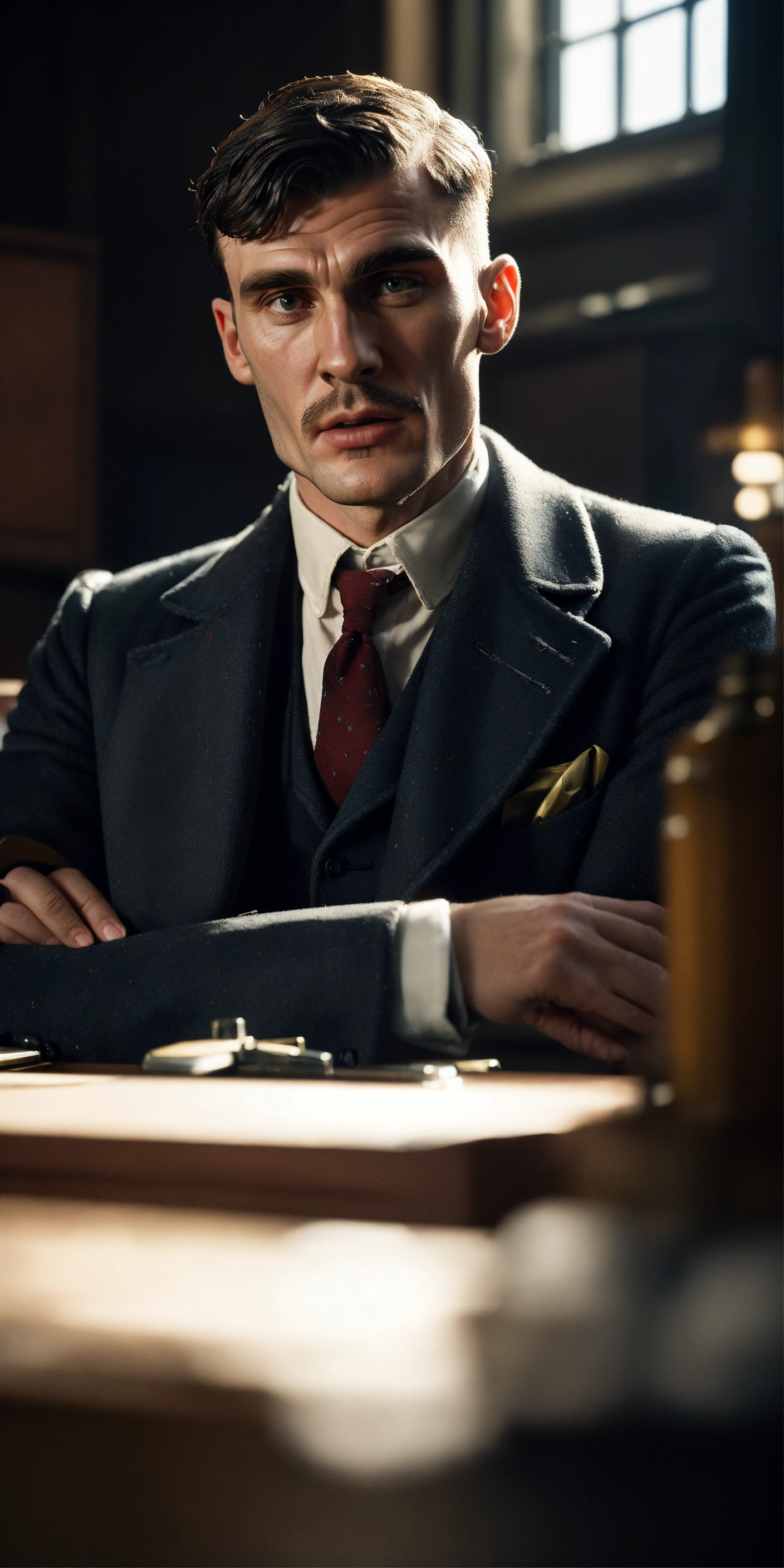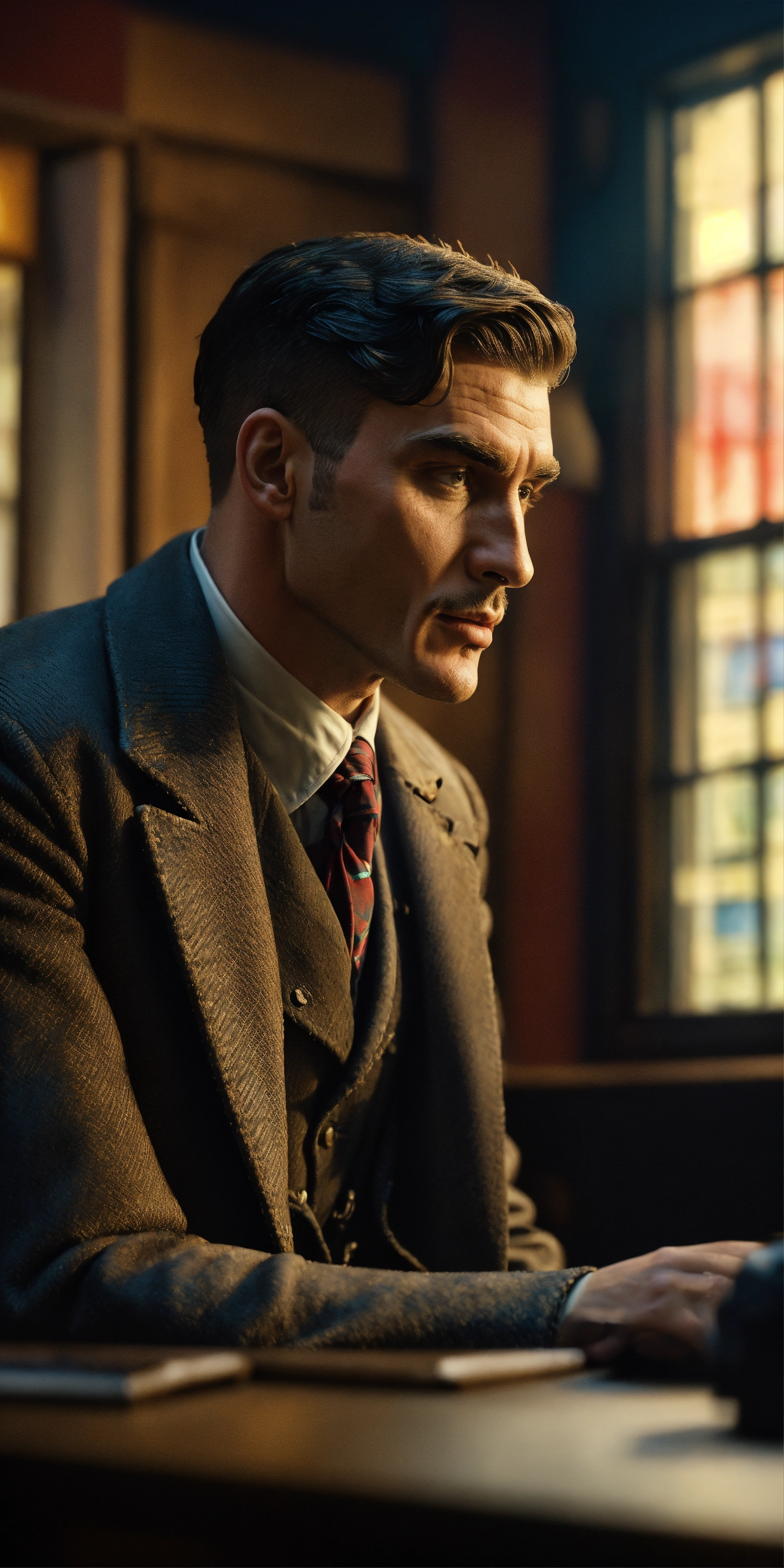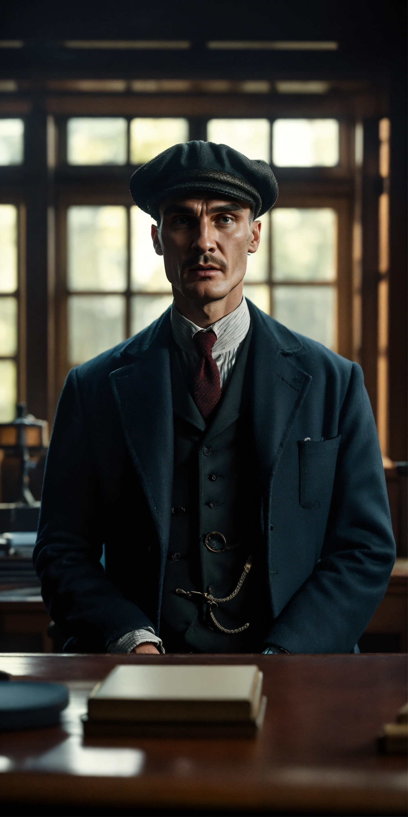 Character in the style of thomas shelby, front view, brightly colored image background, placing the character sitting behind a desk, looking towards the camera, with a large window behind, sharp focus, dramatic spotlighting, very detailed, 8k, autofocus creates an incredibly realistic image, slight blur in the background, studio quality