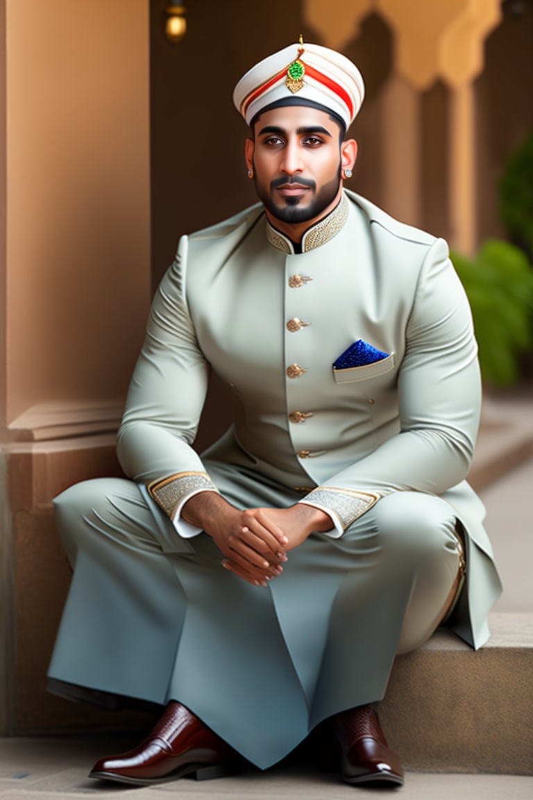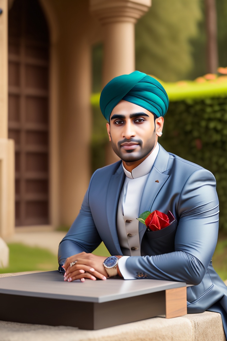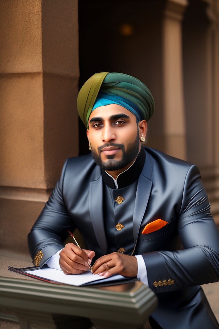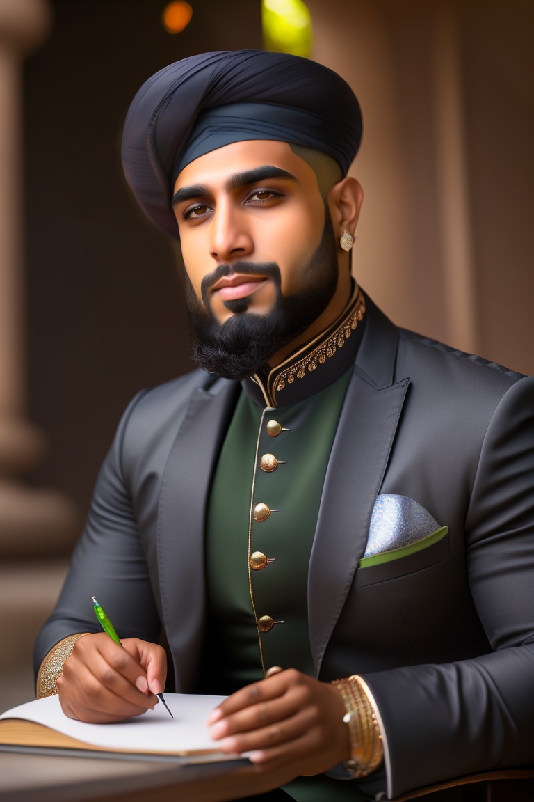 A pakistani imam modern outfit, sitting outside with desk in front with leaf and ink for writing facing straight towards the camera and looking into the camera. realistic looking and young in his 30s