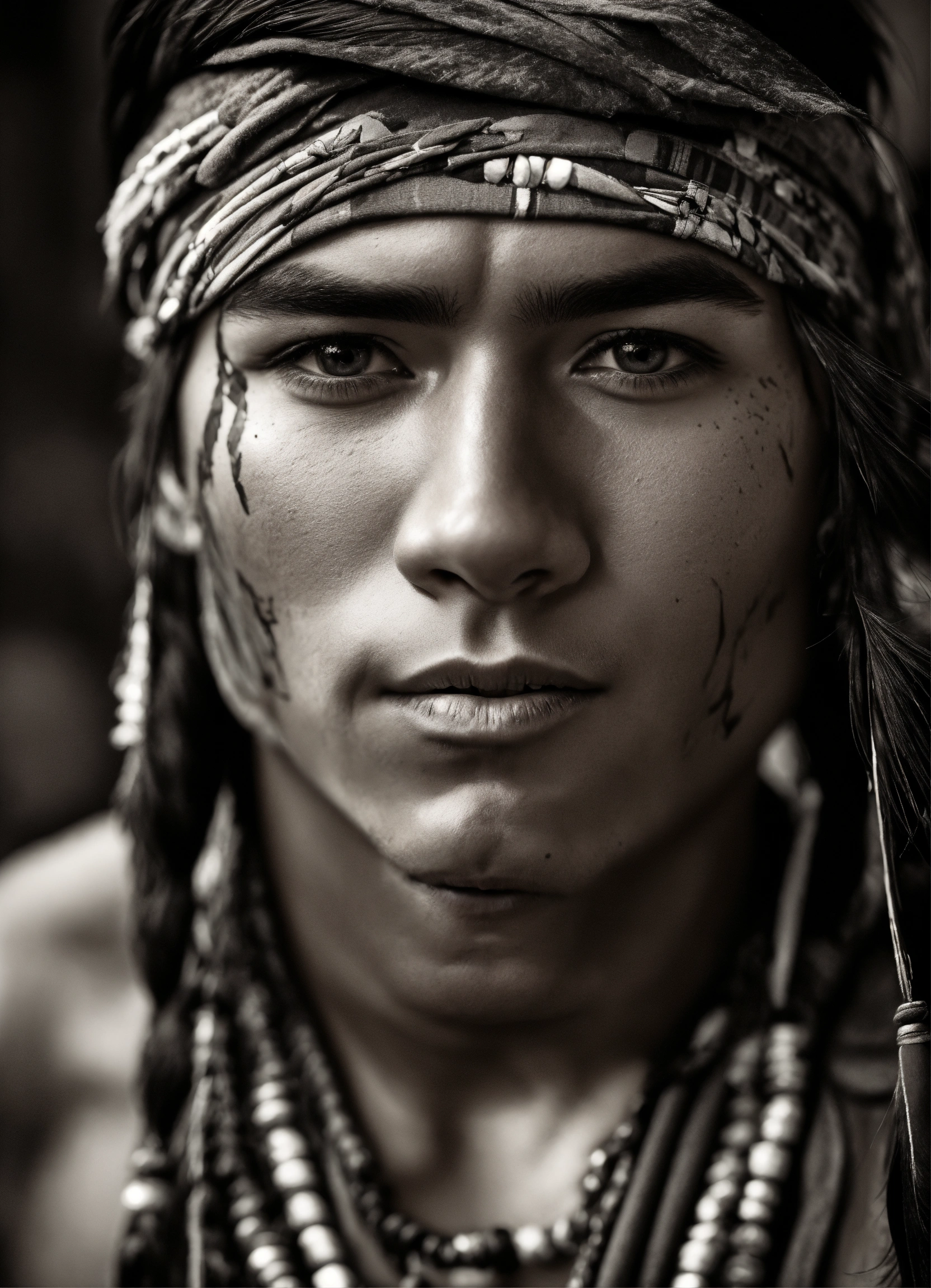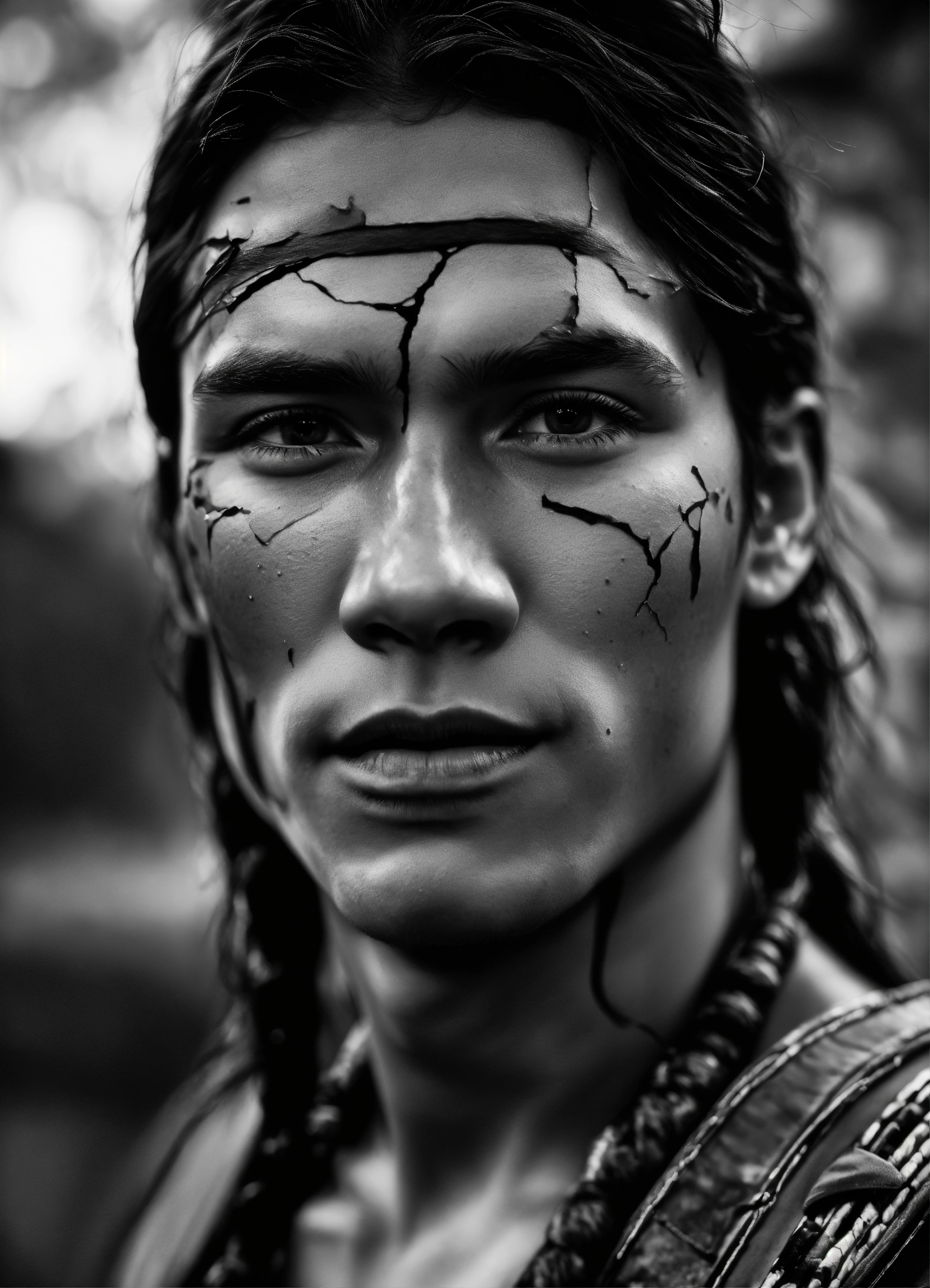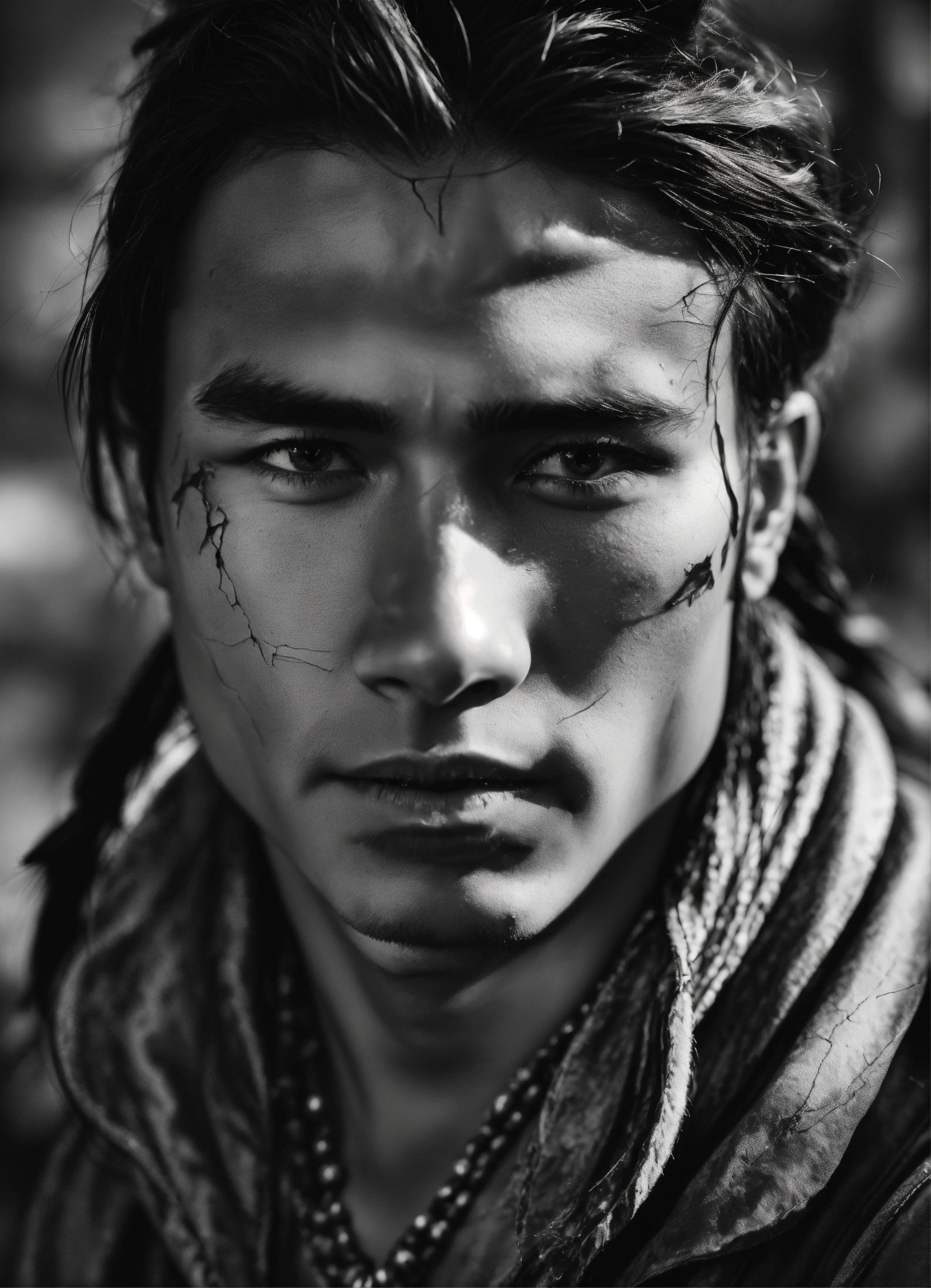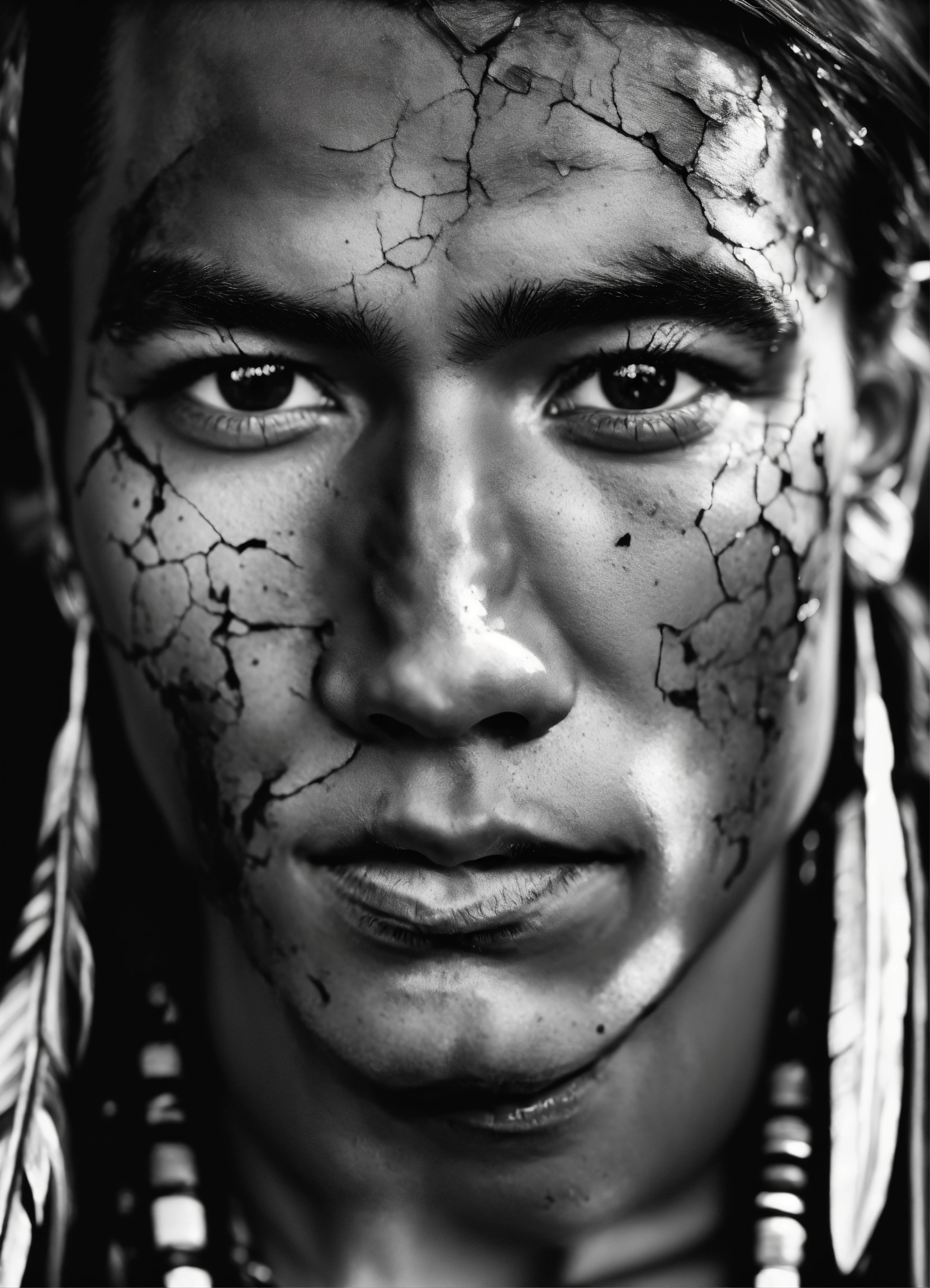Photorealistic, handsome young american native, extreme closeup, portrait, cracked black and white photography, ernest, proud, detailed, 8k