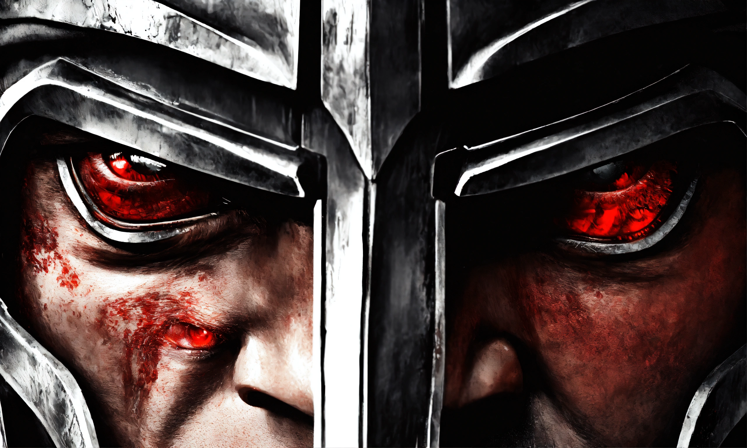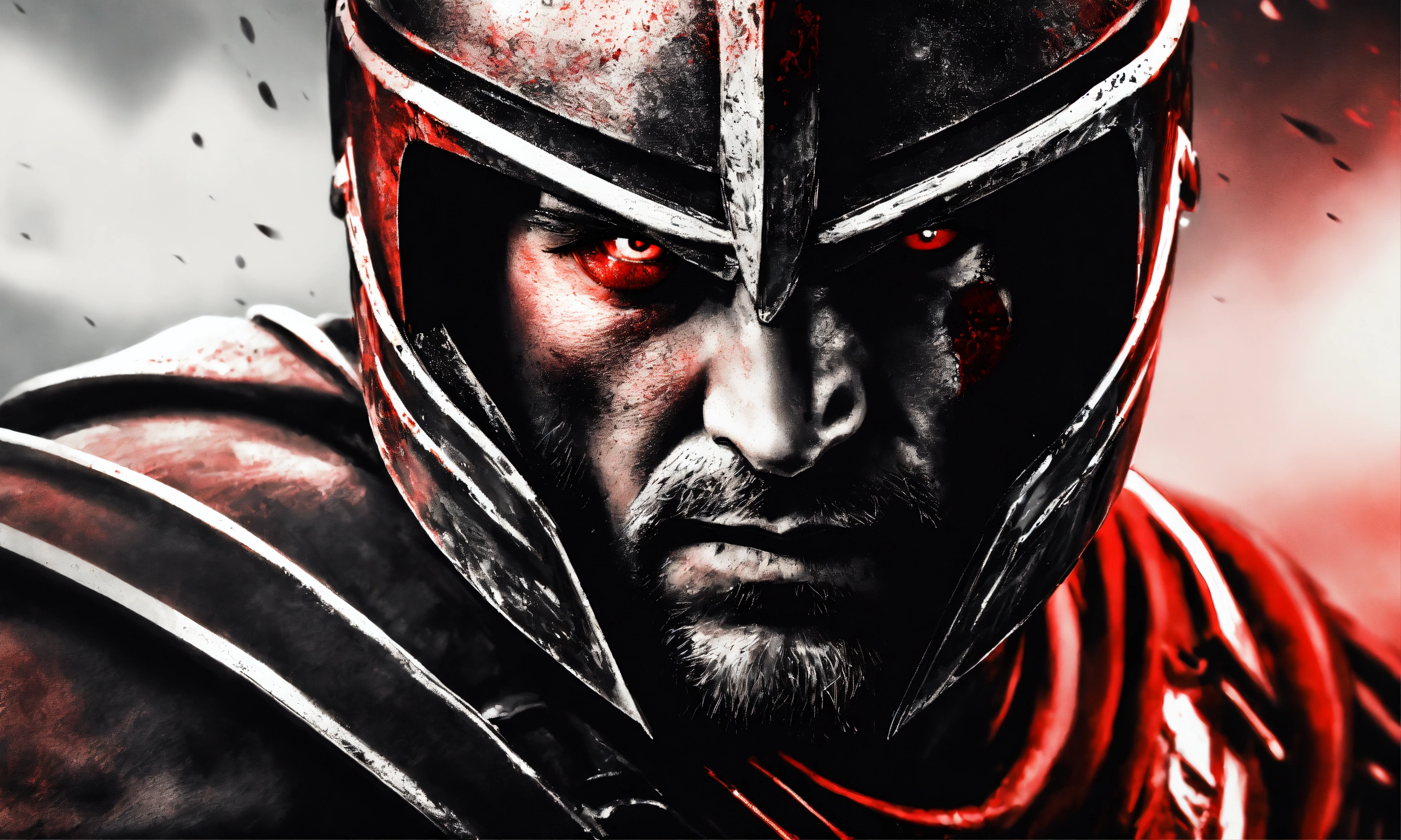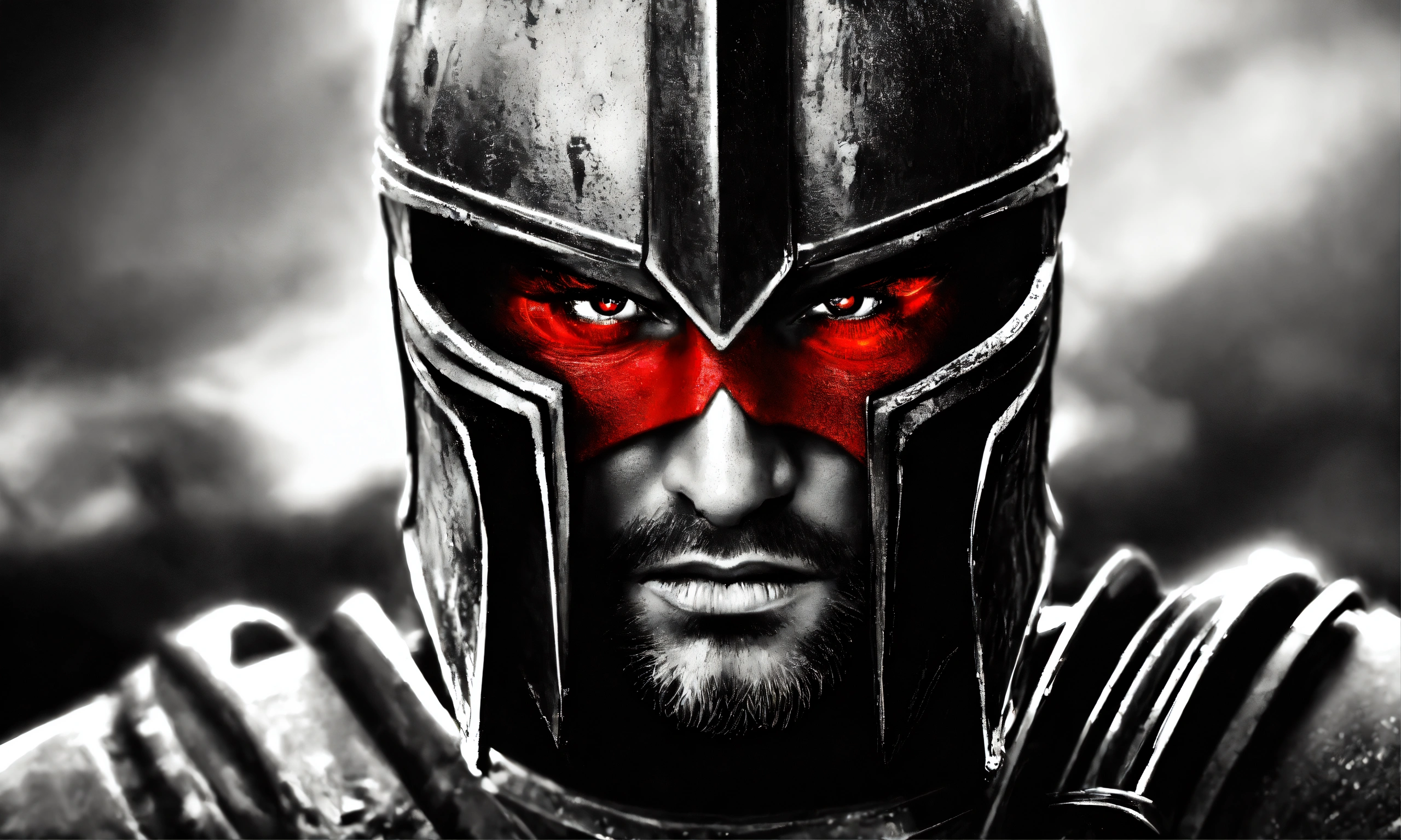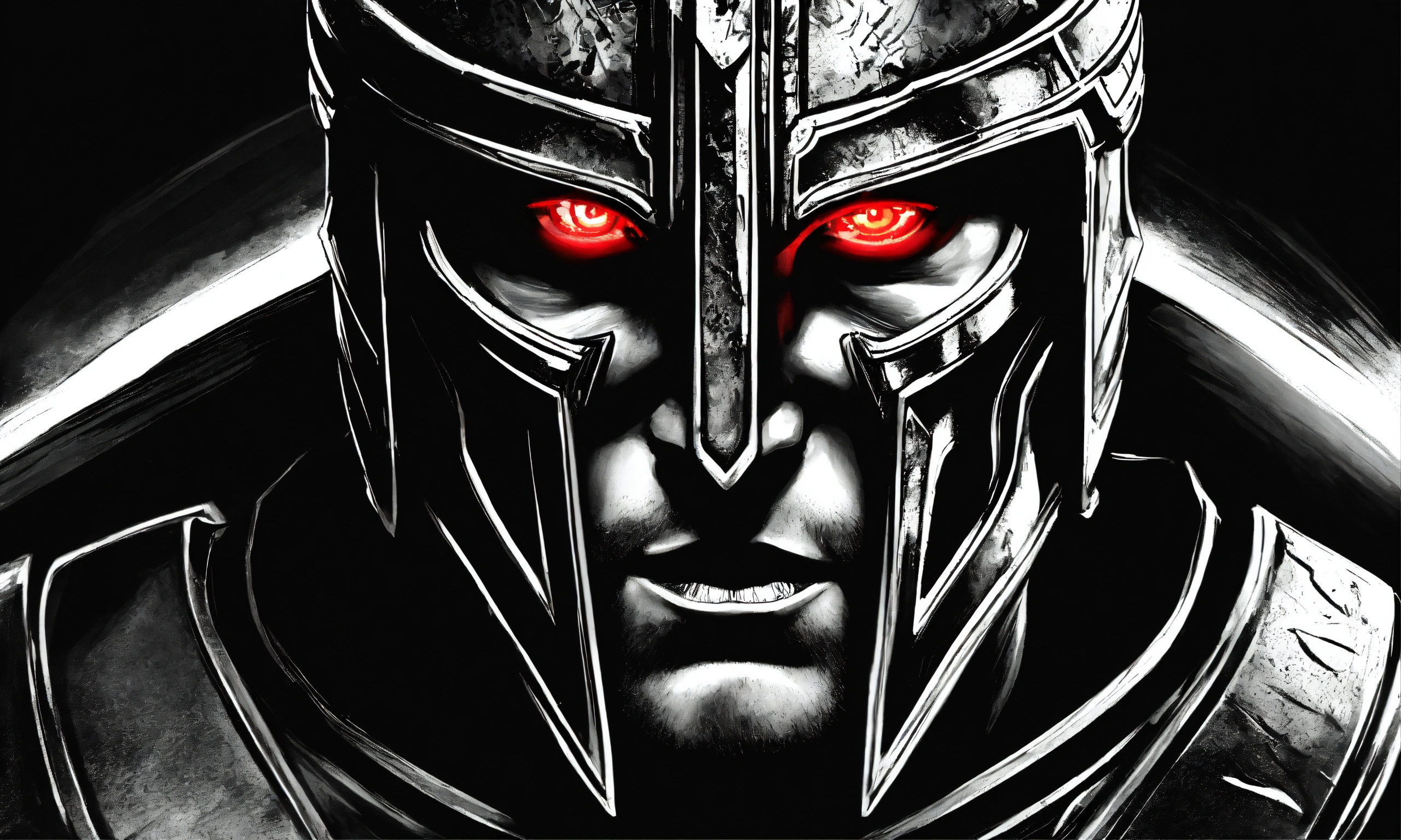 Black and white illustration, realistic, vivid image of spartan warrior, confident, serious, face shot, close up, strong eye contact, evil red eyes, determined, mascuine jaw line