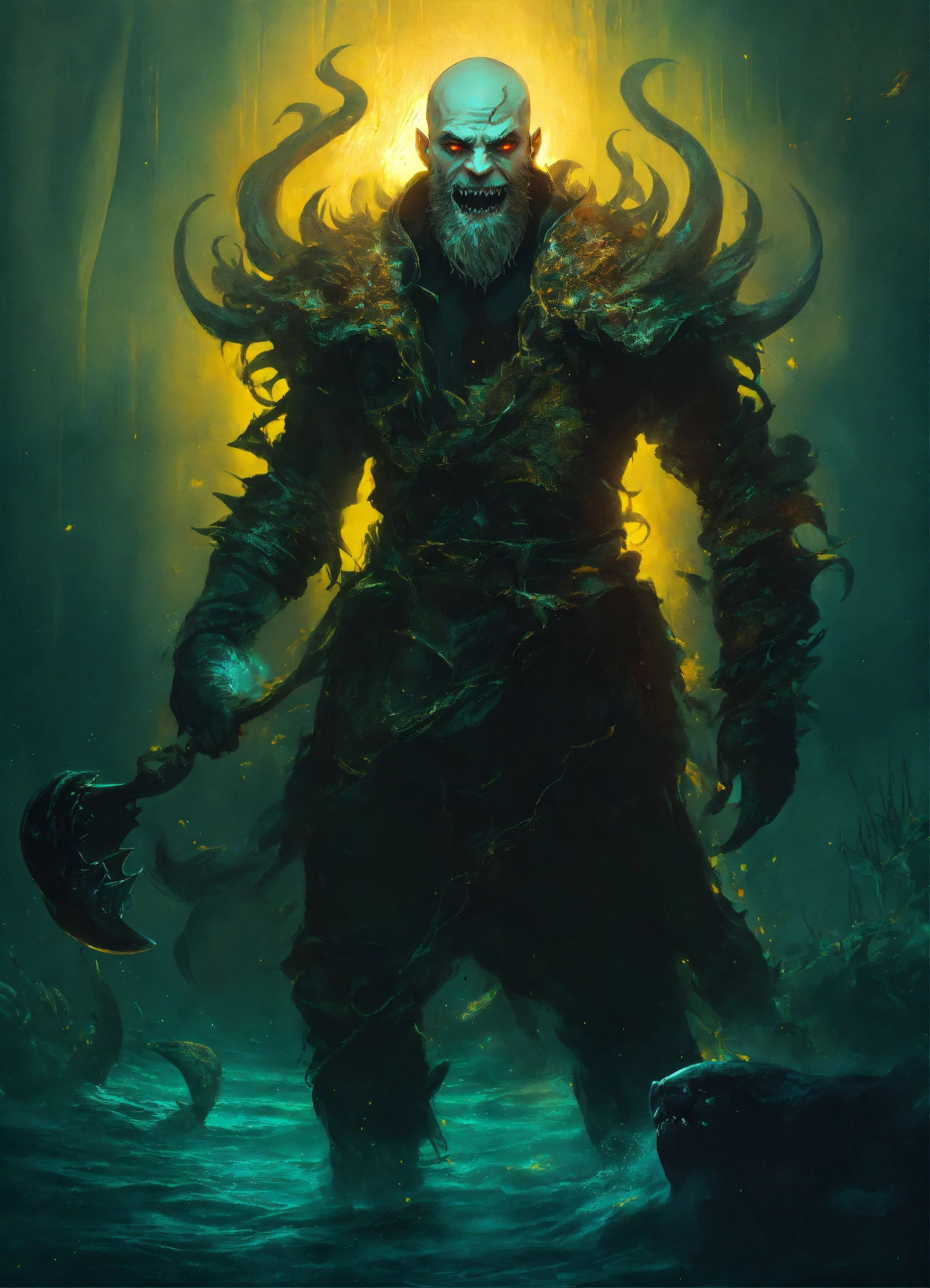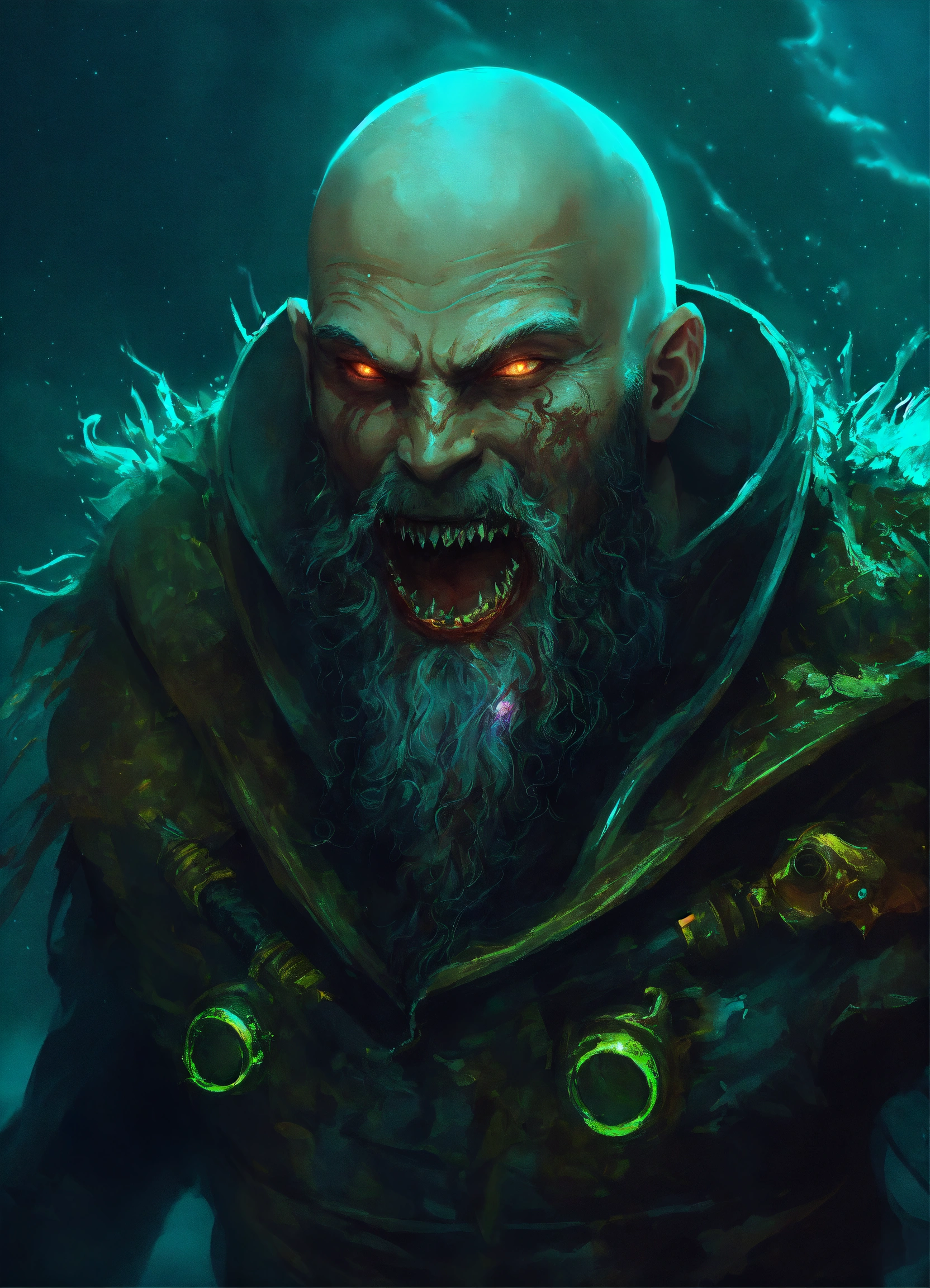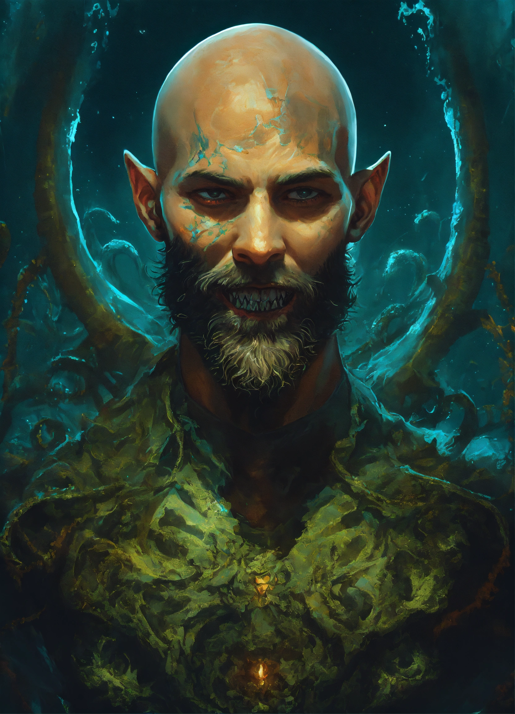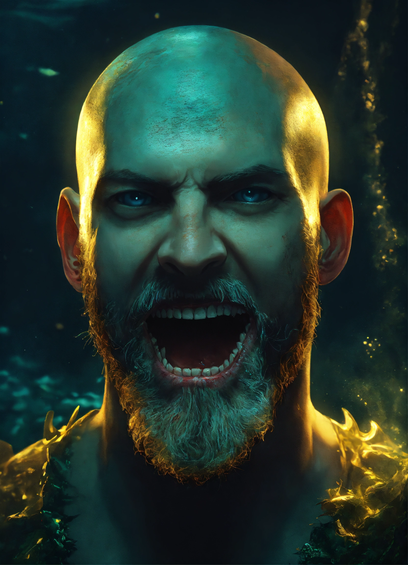 A young bald man with beard creature of the deep, with sharp teeth, bioluminescent features, and a sinister presence in the abyss