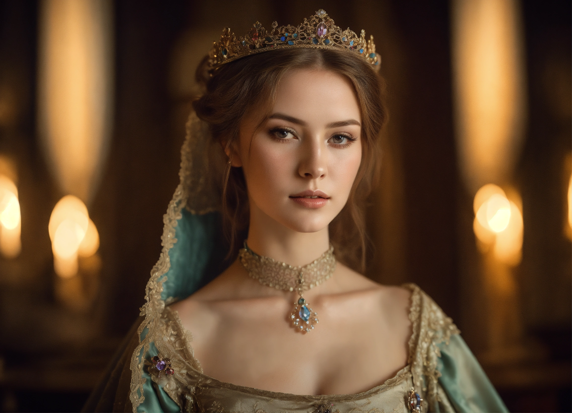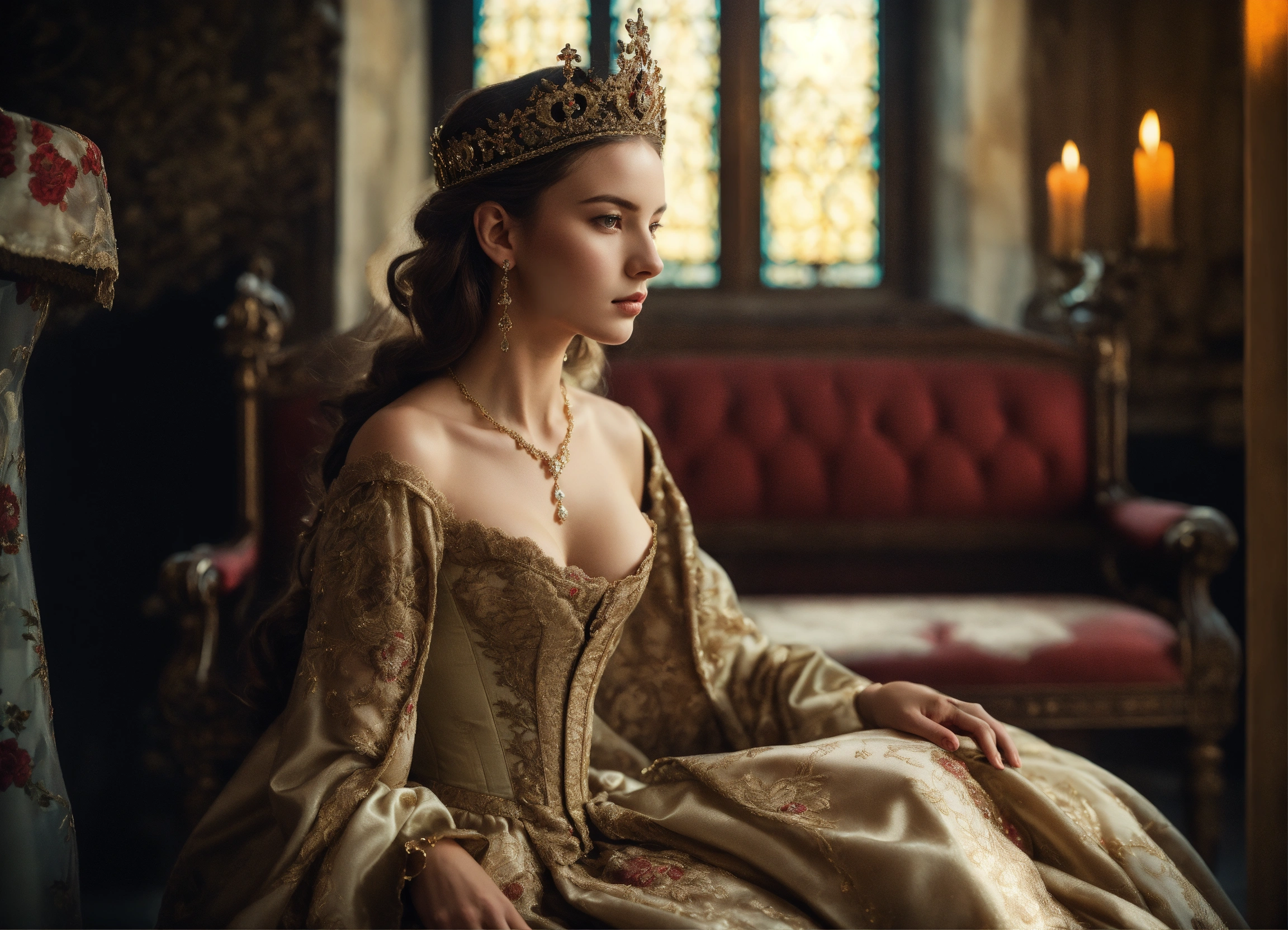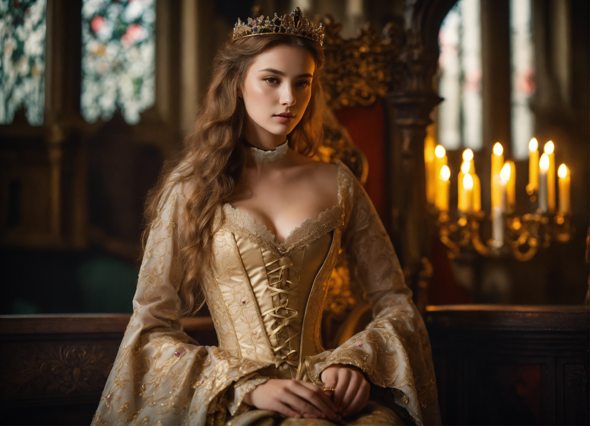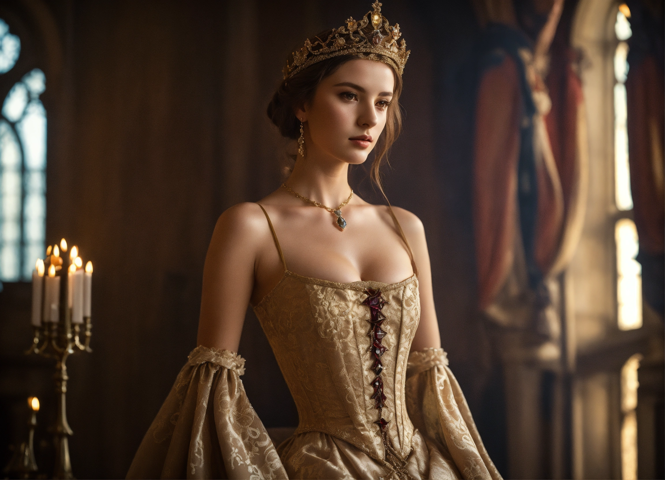 Fine art portrait photography, full body, very slim juvenile noble baroness sits in a noble pose on a throne in a castle, very young and juvenile apperearence, 18 years old, beautiful face, very childish appearance, stunningly beautiful, beauty in perfection, lordly, darkblond hair, narrow cheeks, ultra slim, ultra fragile build, ultra slim body, very flat bust, emaciated and thin, she seems ultra fragile, flawless skin, charmful, very narrow face, very pale, bright eyes, noble and elegant narrow medieval lace silk dress with very low-cut decollete and trumpet sleeves, underneath a tight corset, ultra expansive and deep neckline, magnificent finely chased baroness crown richly set with gemstones and a veil, choker, brocade coat, body portrait, intimate, medieval setting, photo realistic, 8k, soft light, volumetric lighting, highly detailed
