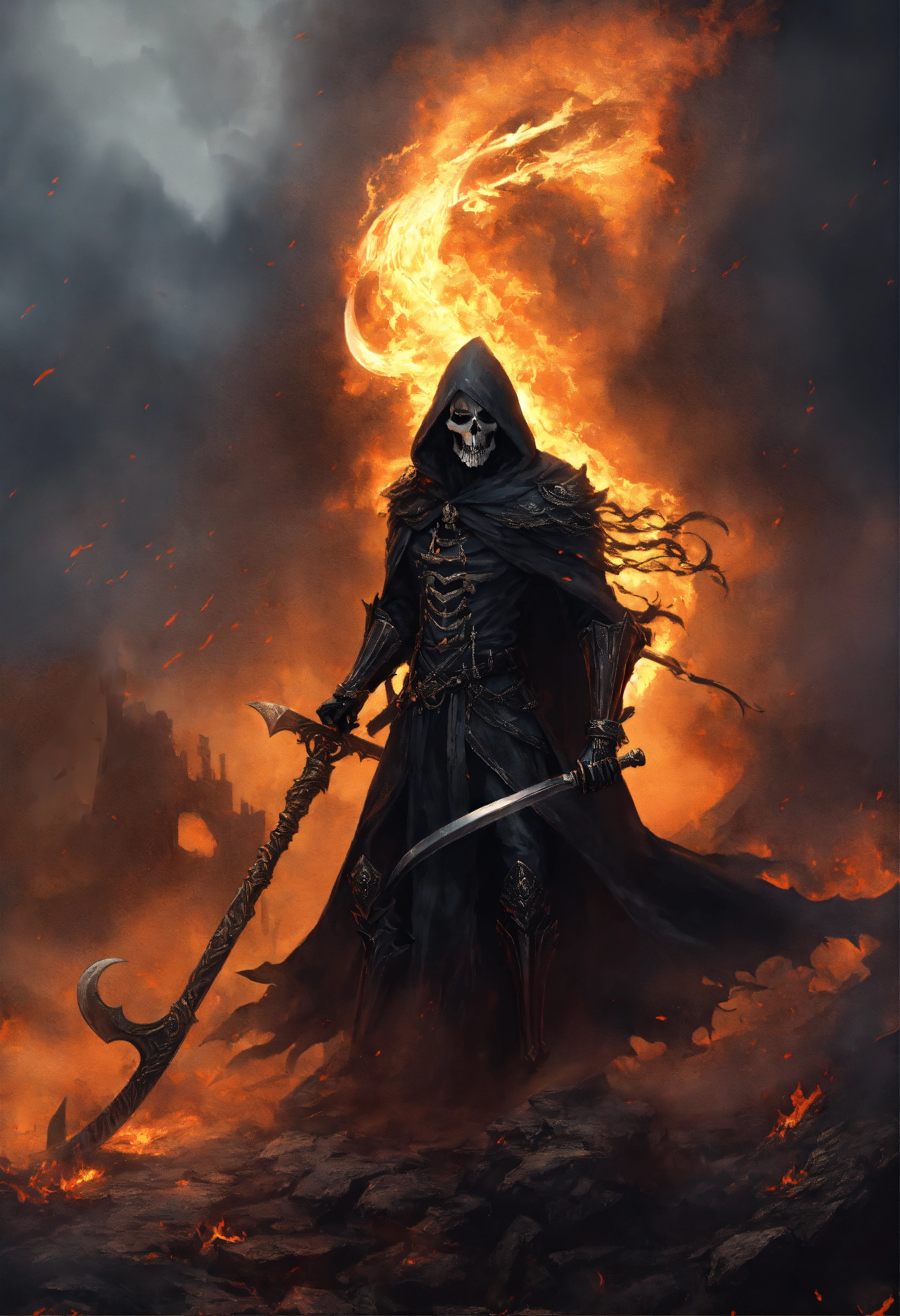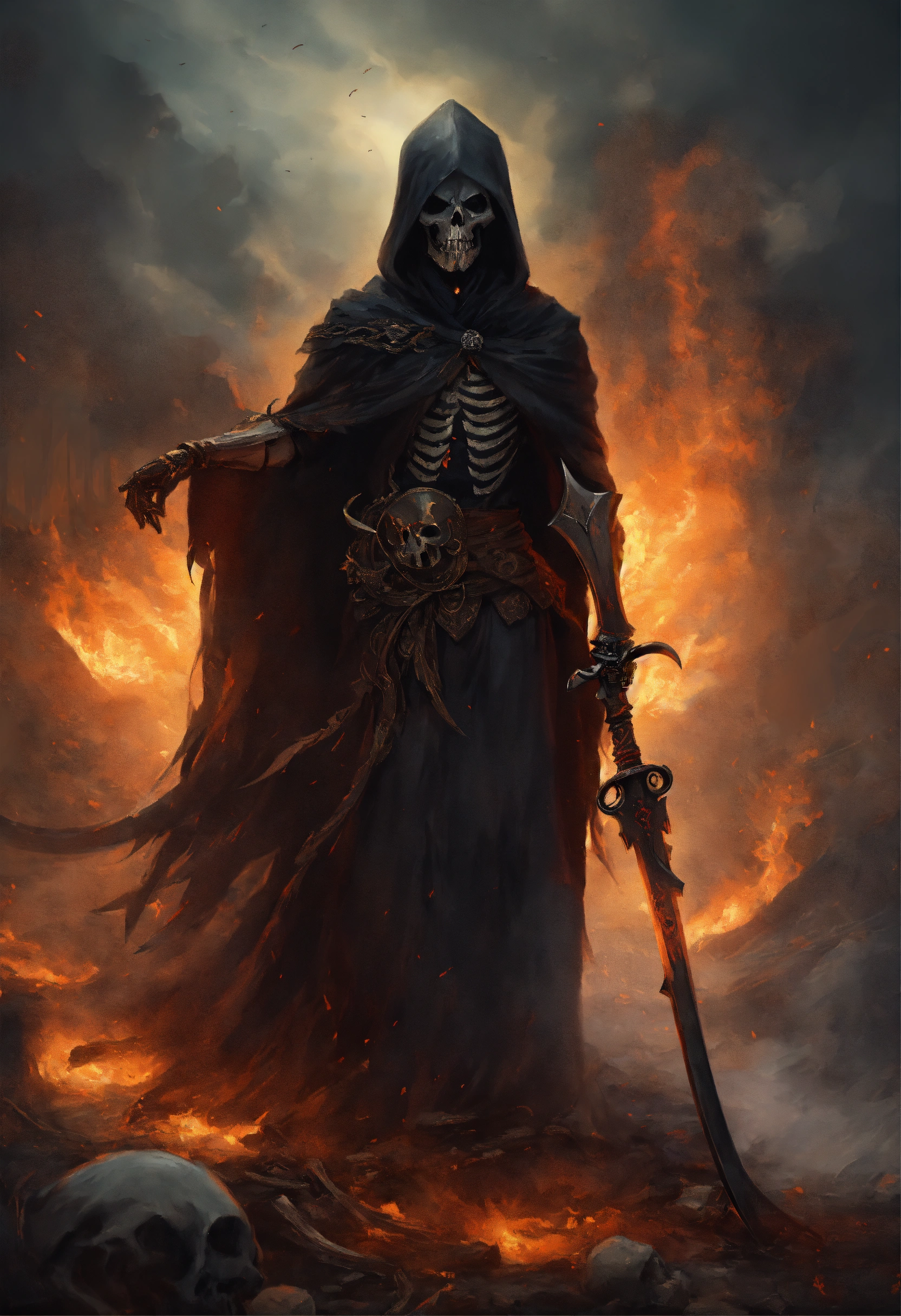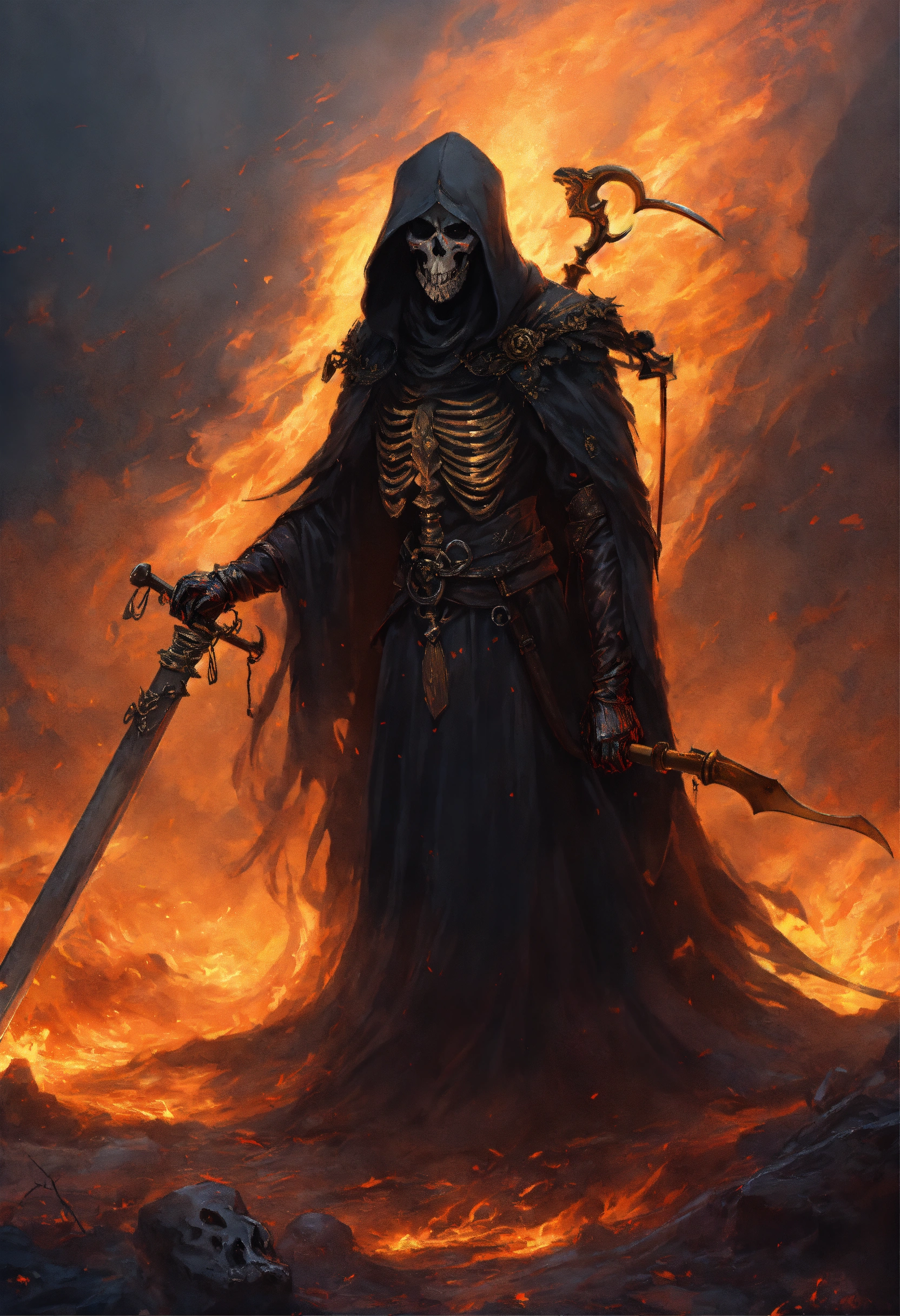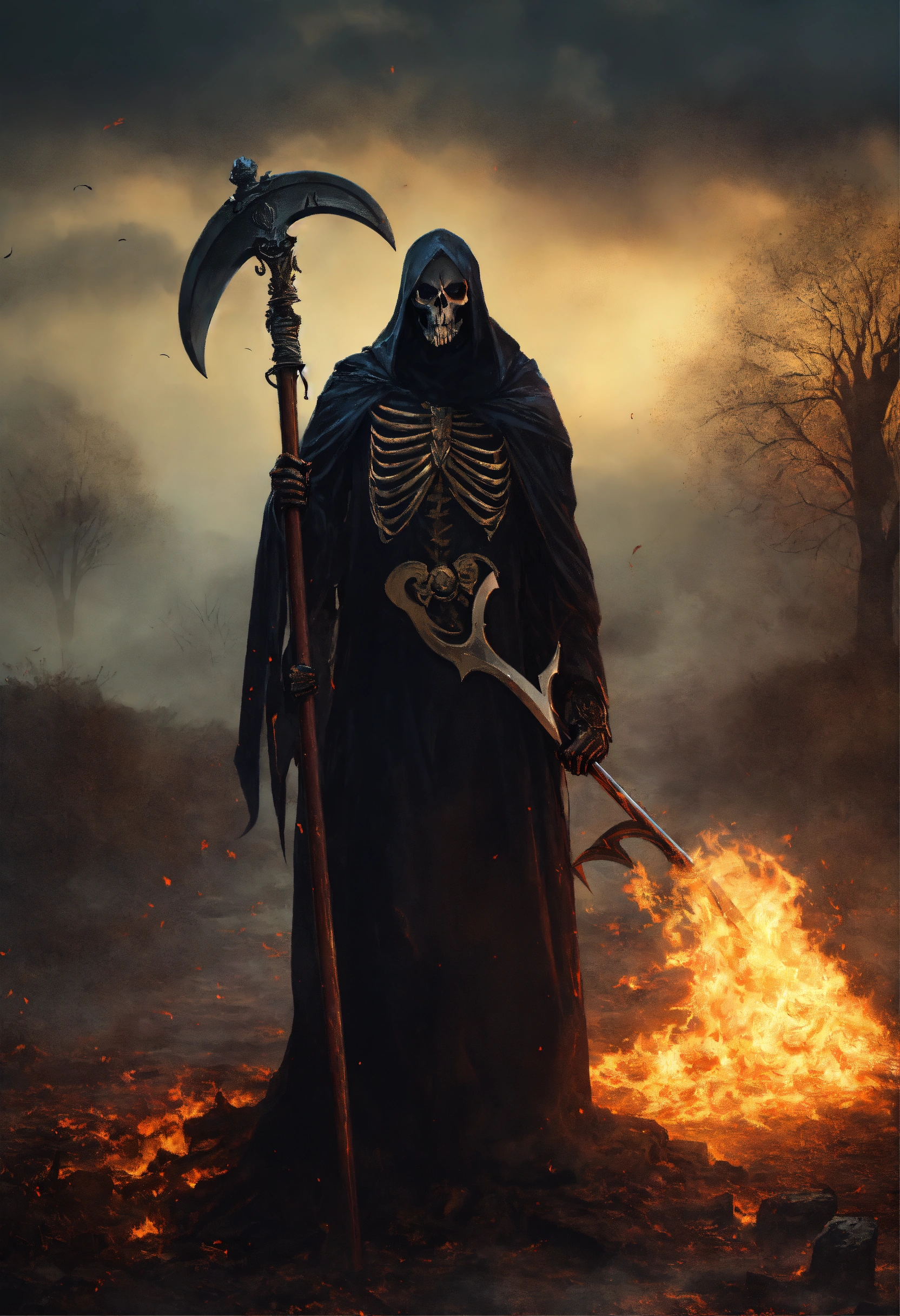 The grim reaper with scythe raised for the kill, flowing robes, surrounded by swirling fog, piles of burning scattered bones at his feet