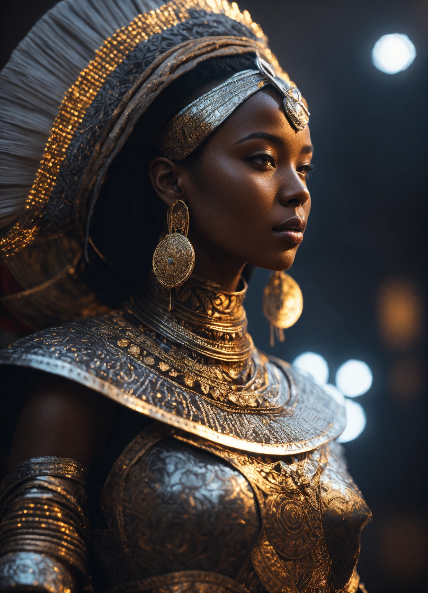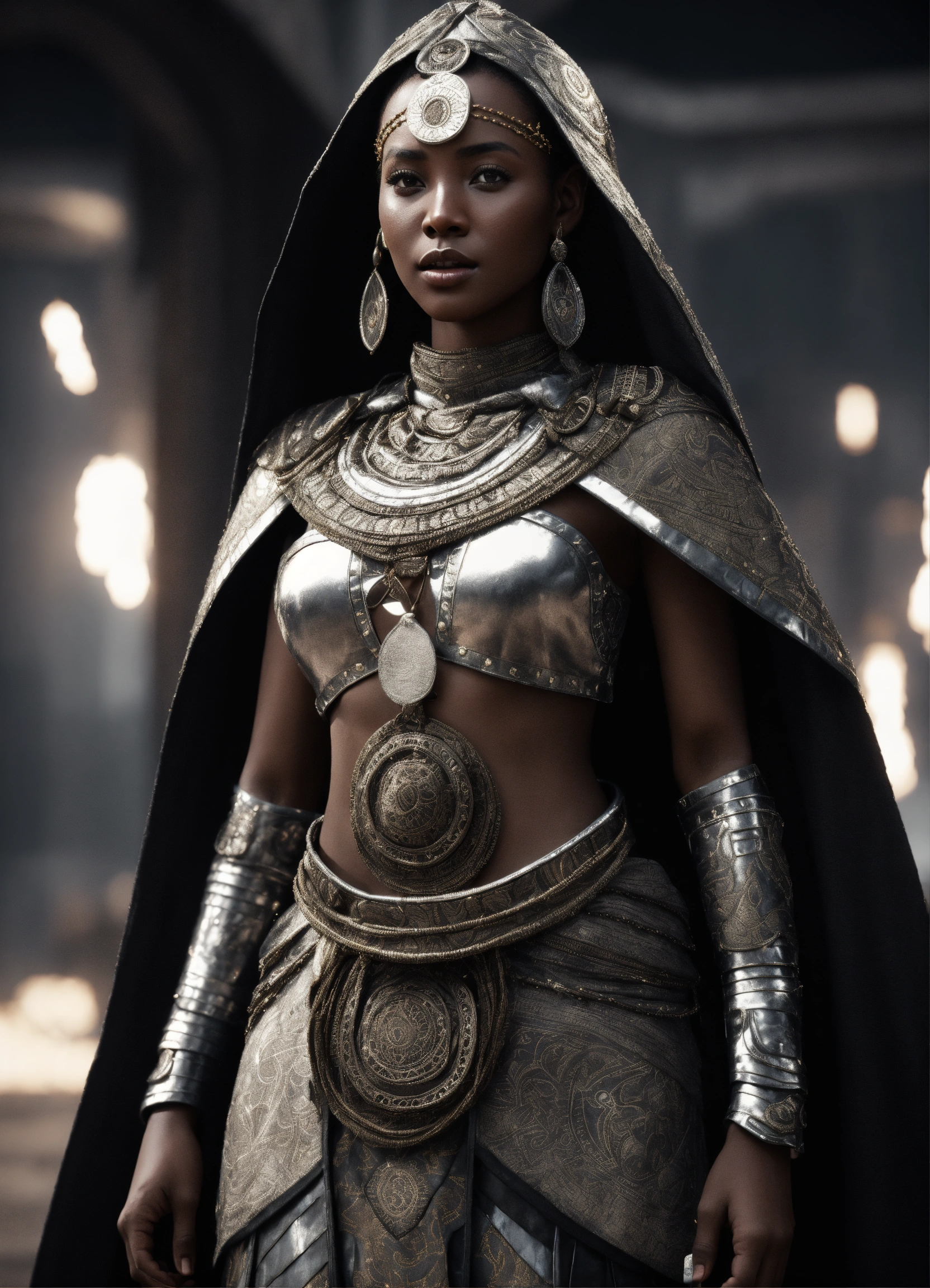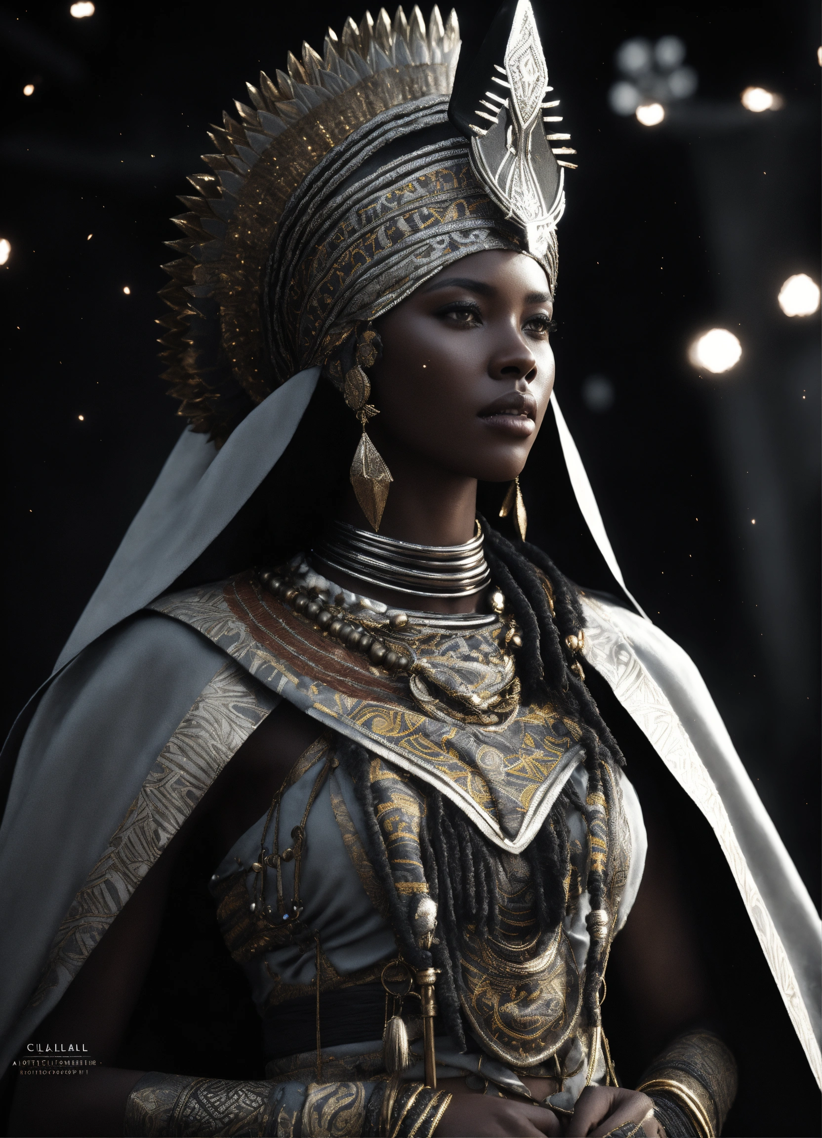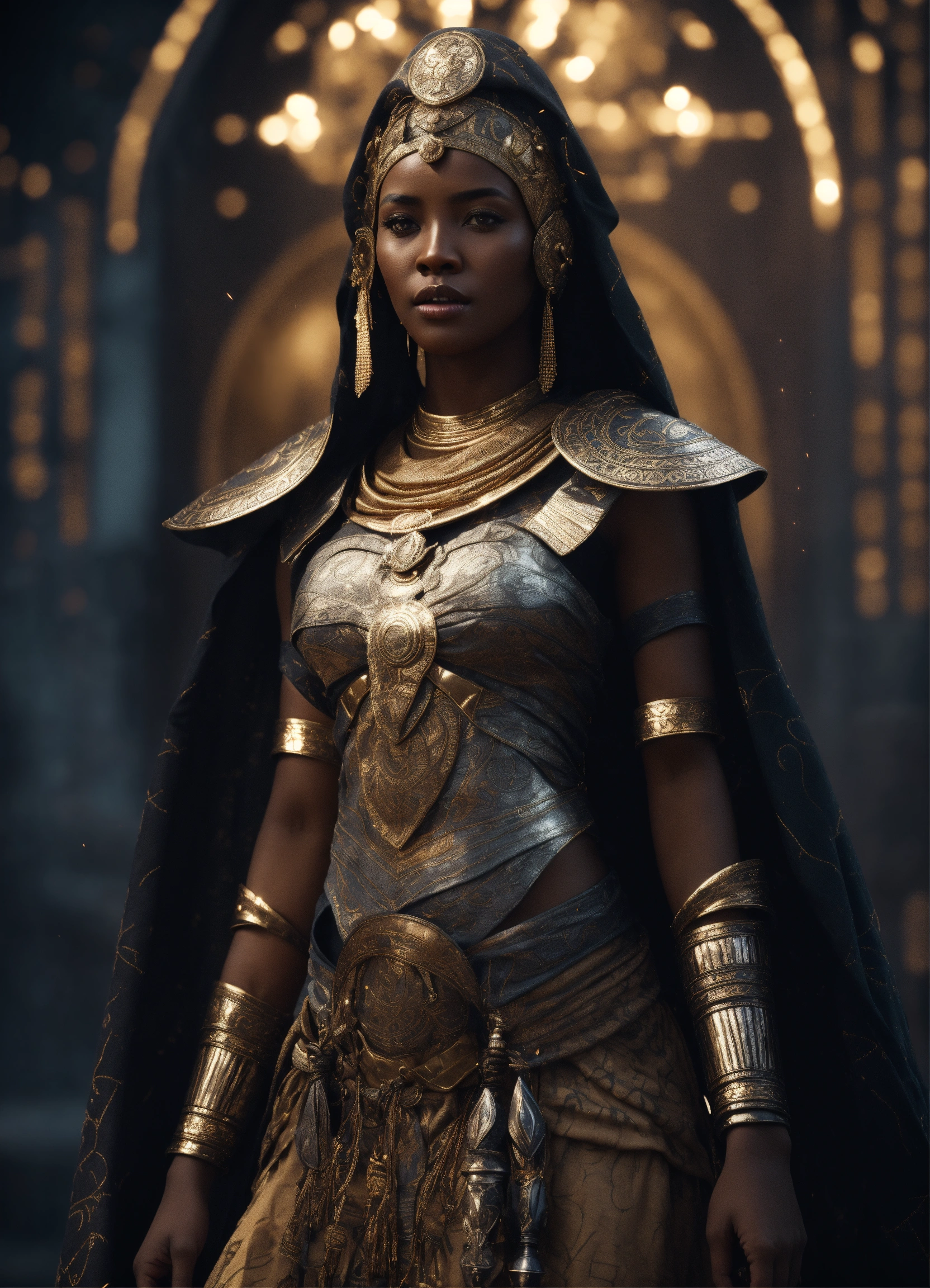 Ethiopian female celestial being, artstation, full body, character concept, intricate african clothing and cape, black and white photography, magical, tribal patterns in armor, sparks, cinematic lighting, cinematic atmosphere, 8 k octane render, unreal engine 5
