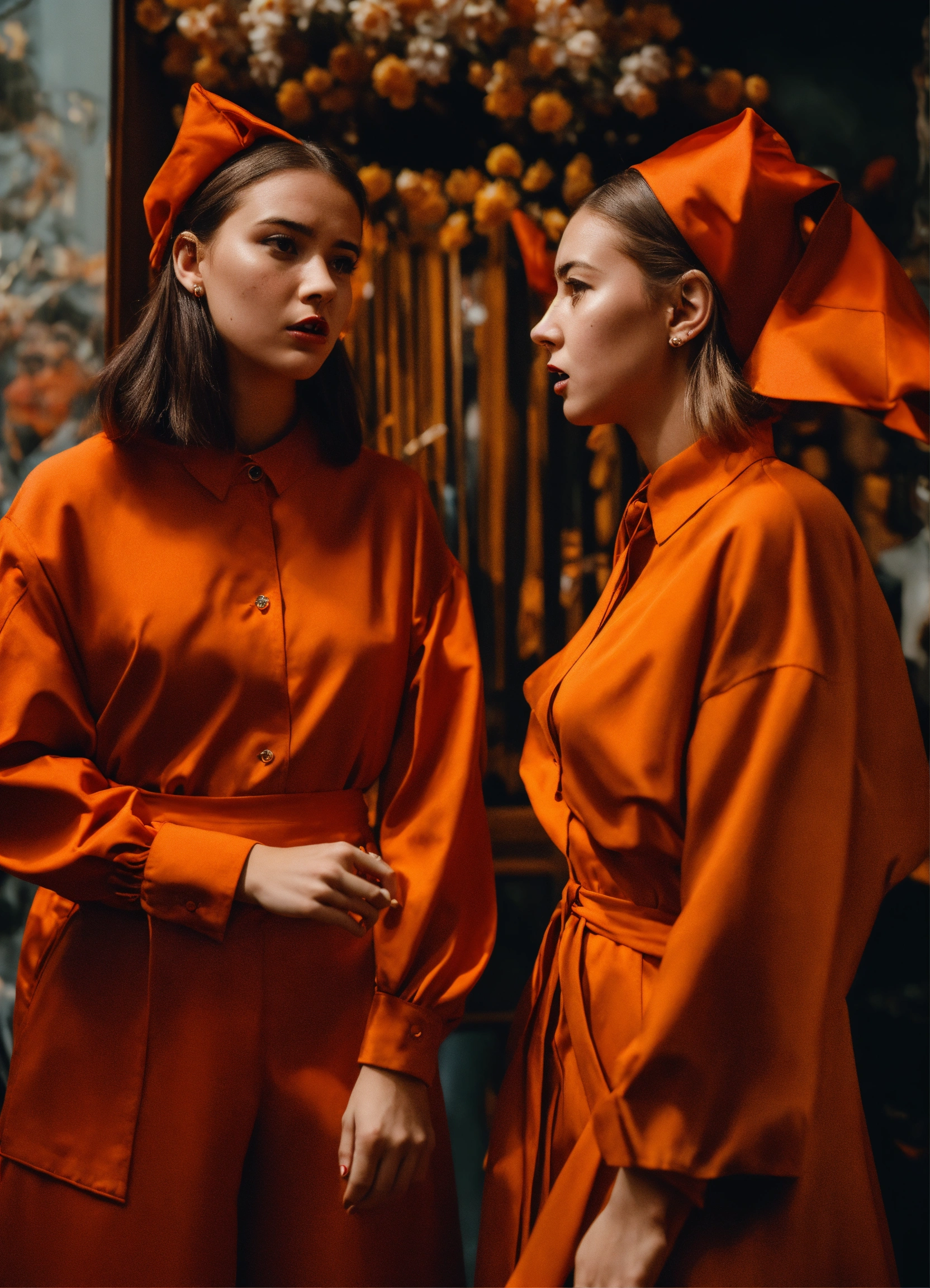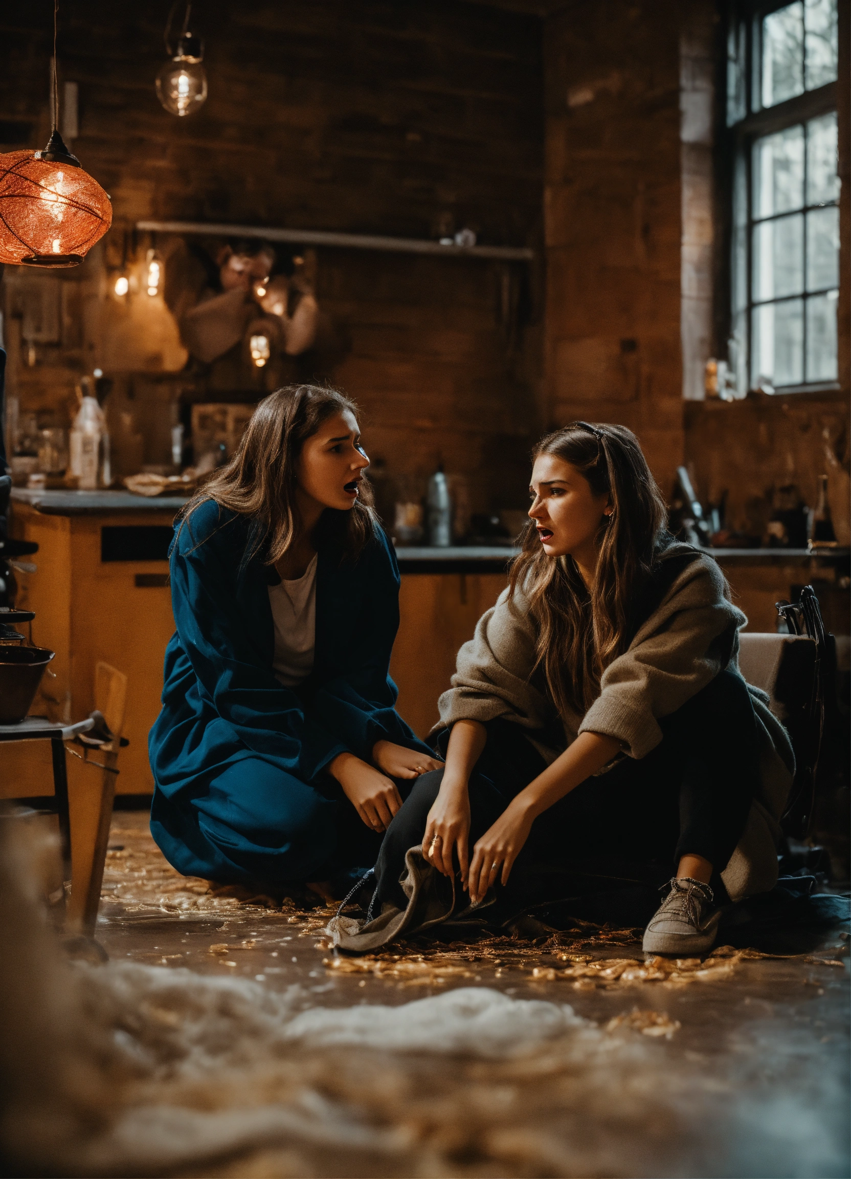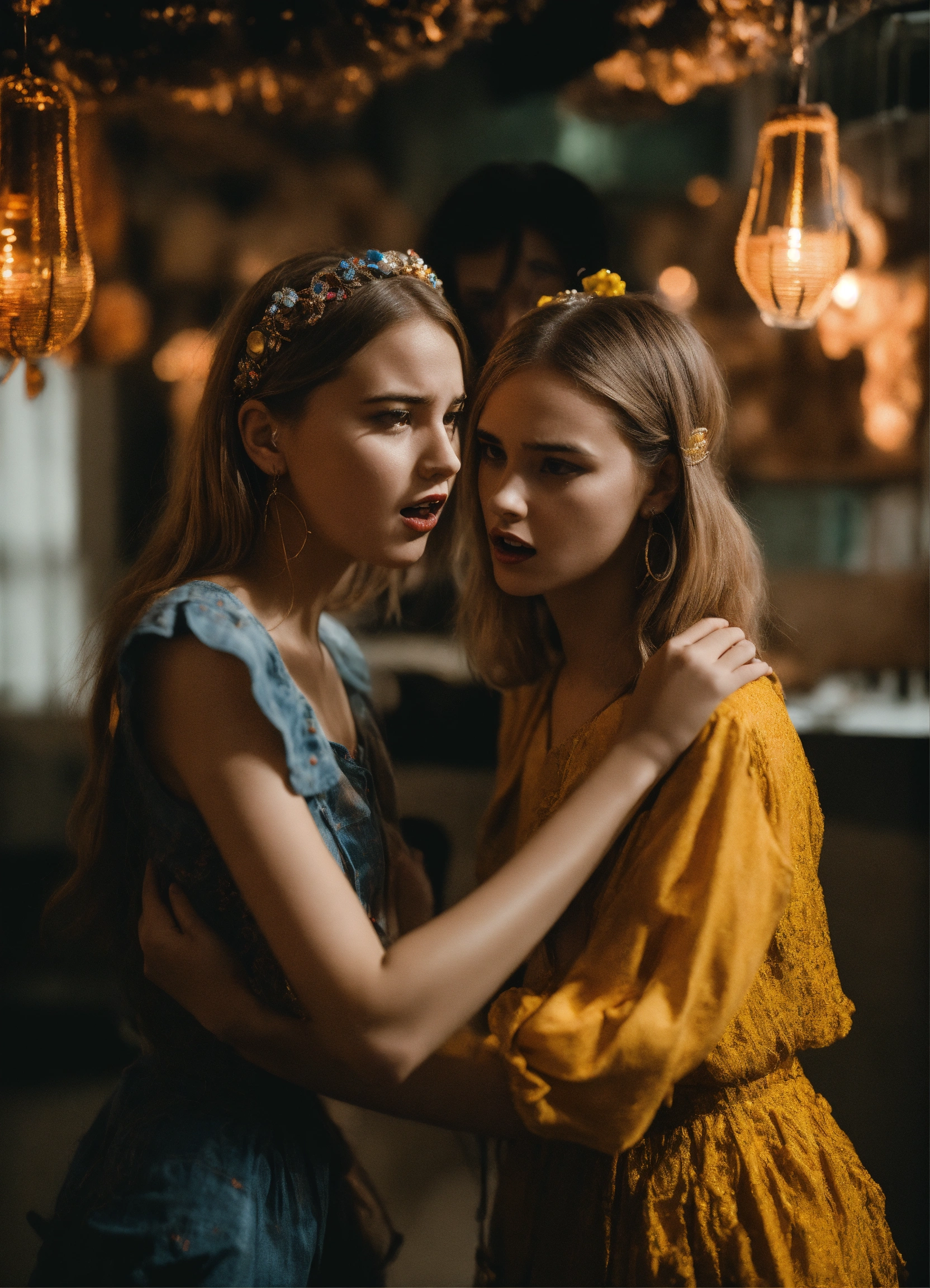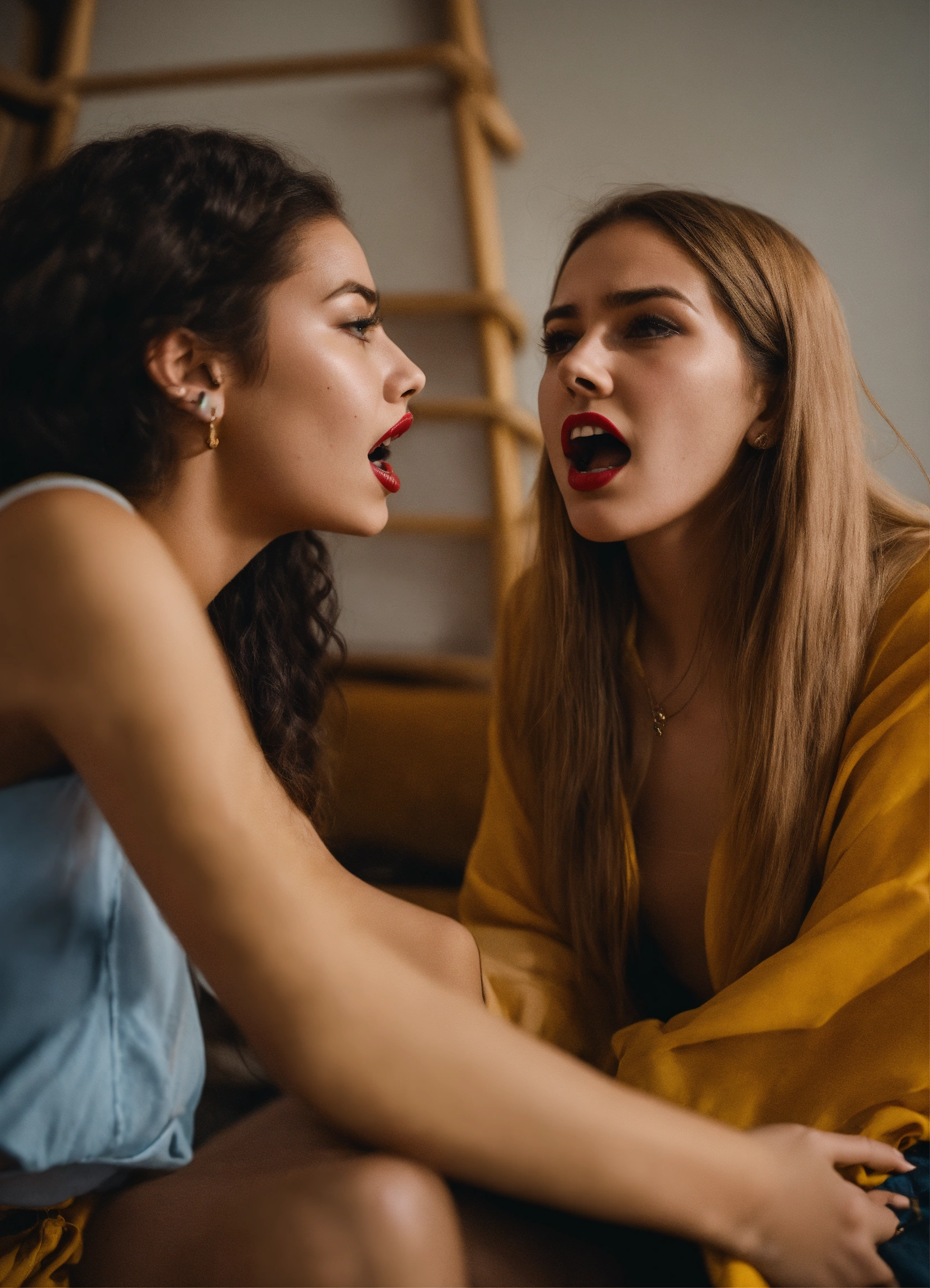 Avant-garde young women sharing in panic with each other about terrifying event