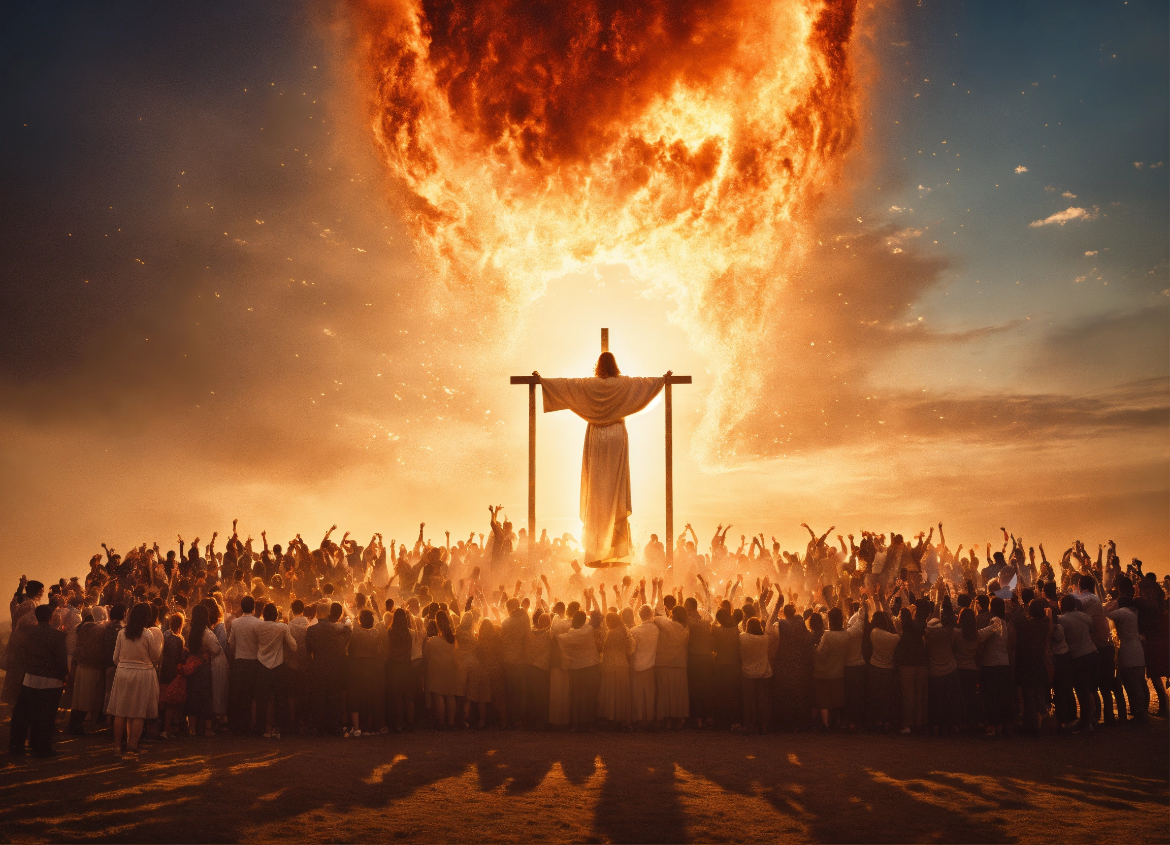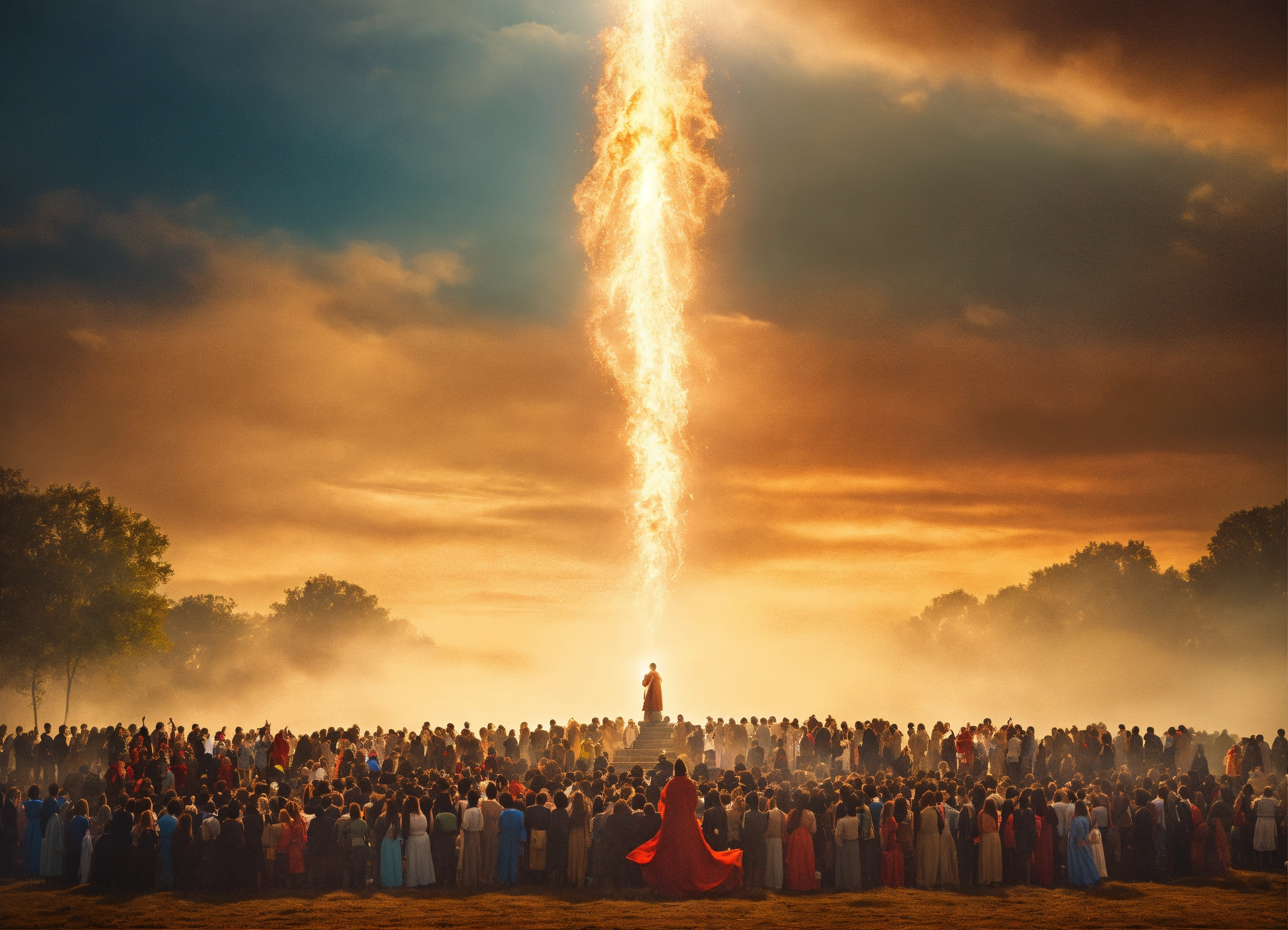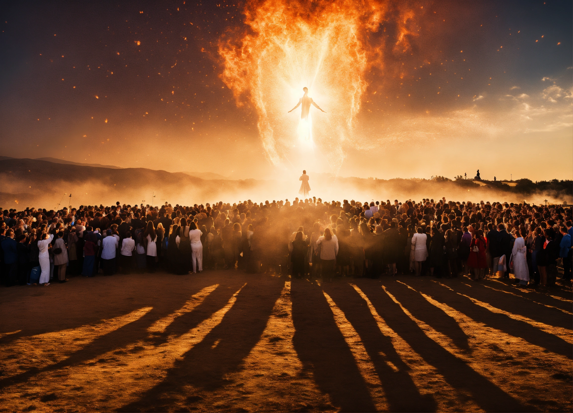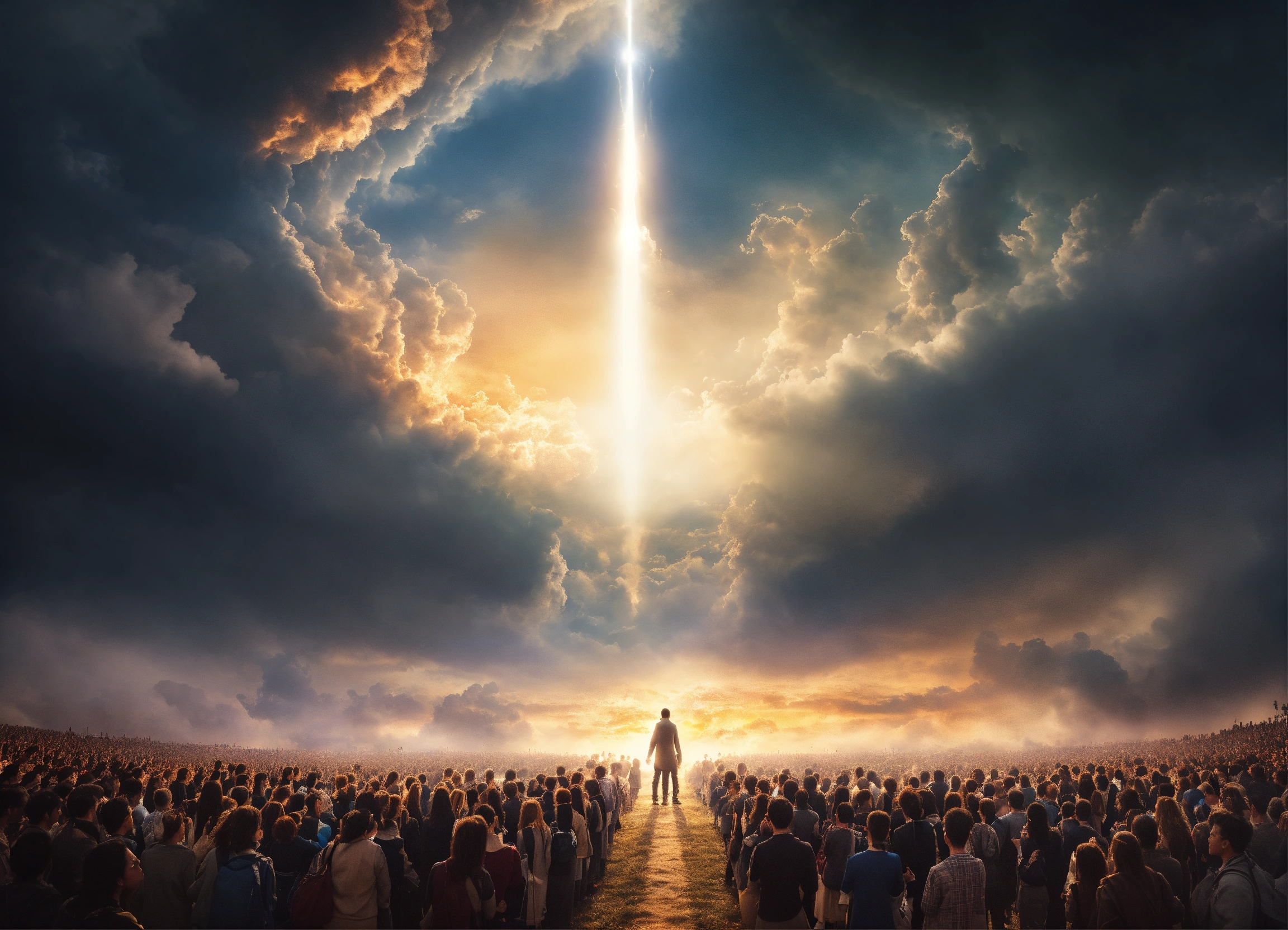 A picture of a spirit rising up to heaven with a lot of people standing on the ground saying goodbye