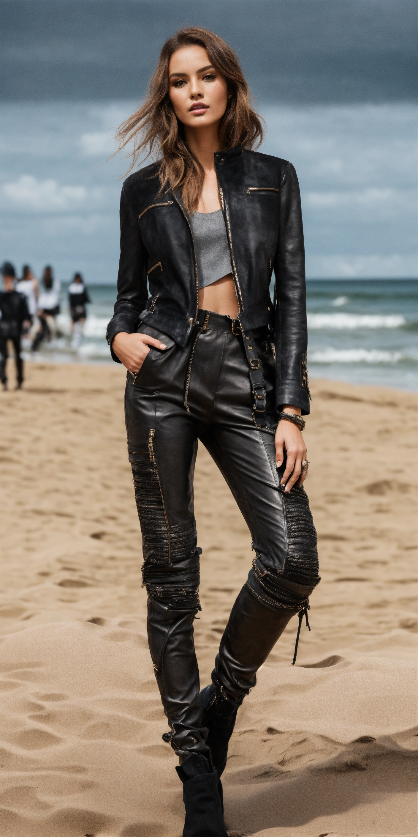 Ultra realistic full body photo of an fashionable model modeling novelty interesting complex unusual sporty modern brave black waxed leather and suede pants, military textures metal walking runway on a beach
