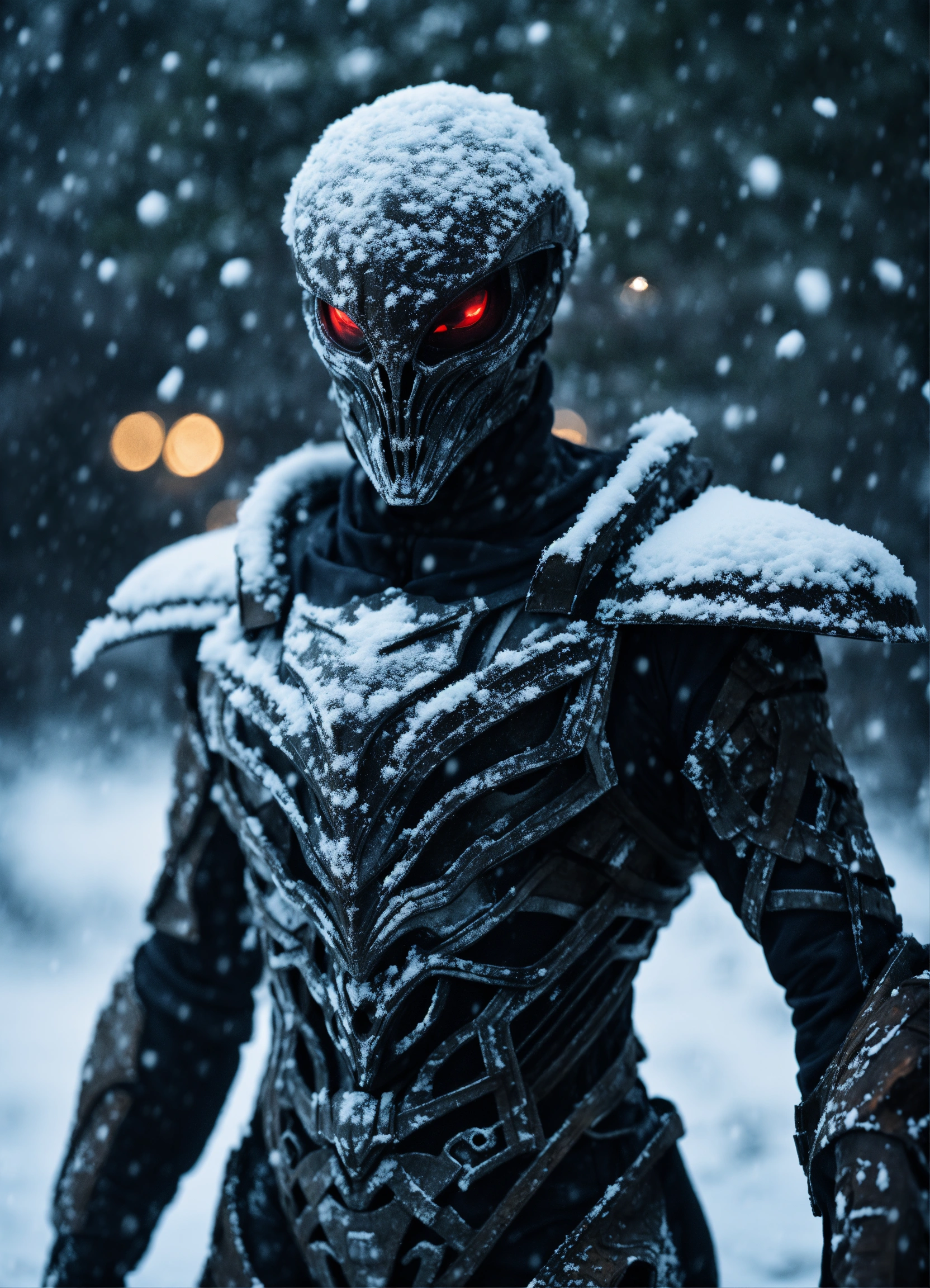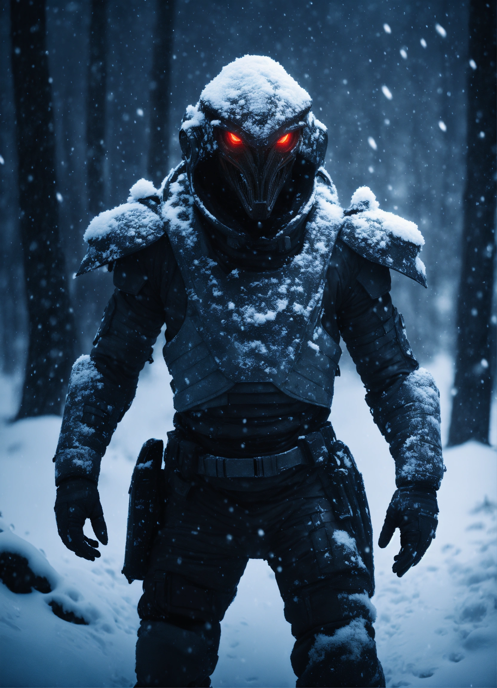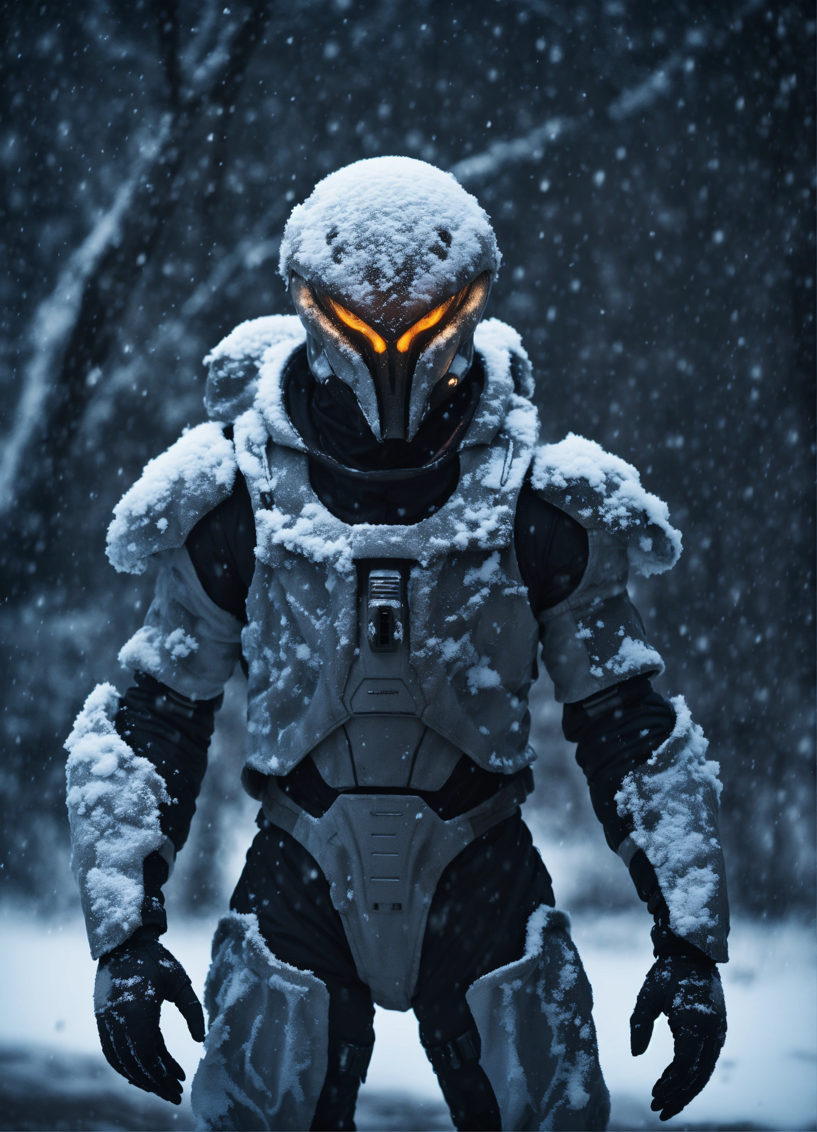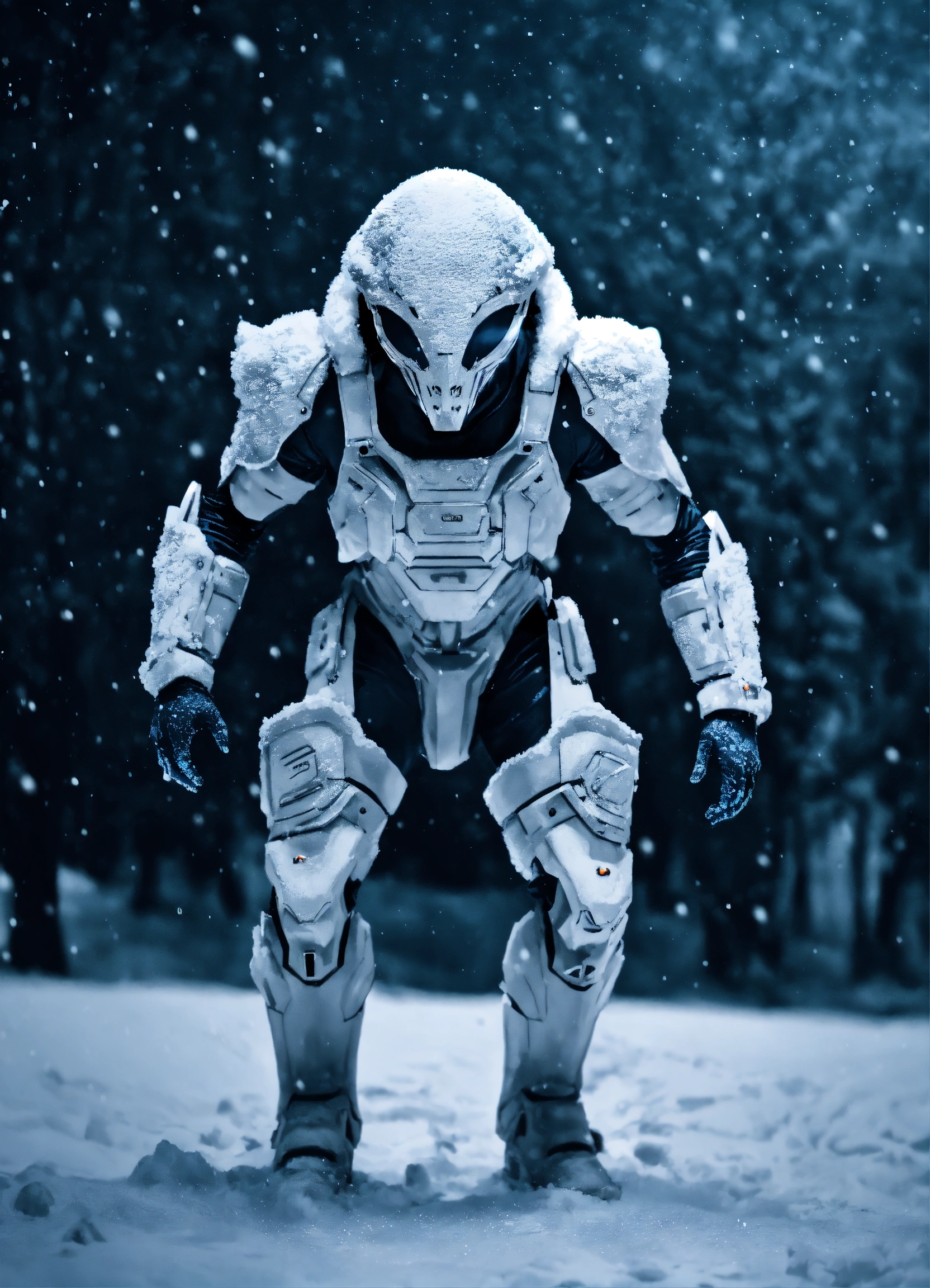 A alien soldier monster, full body portrait in a lanscape, wearing white winter, during a snow storm, dark lighting, intricate details, depth of field, in a cold snowstorm, outdoors, night