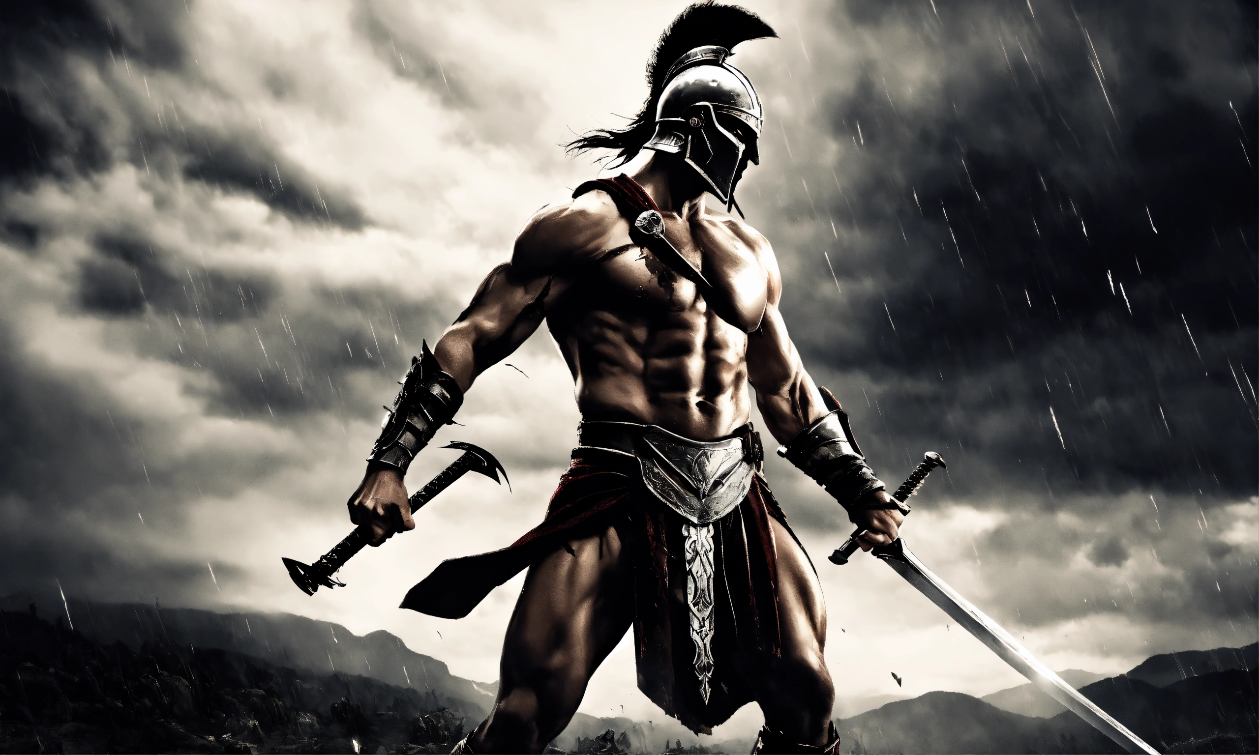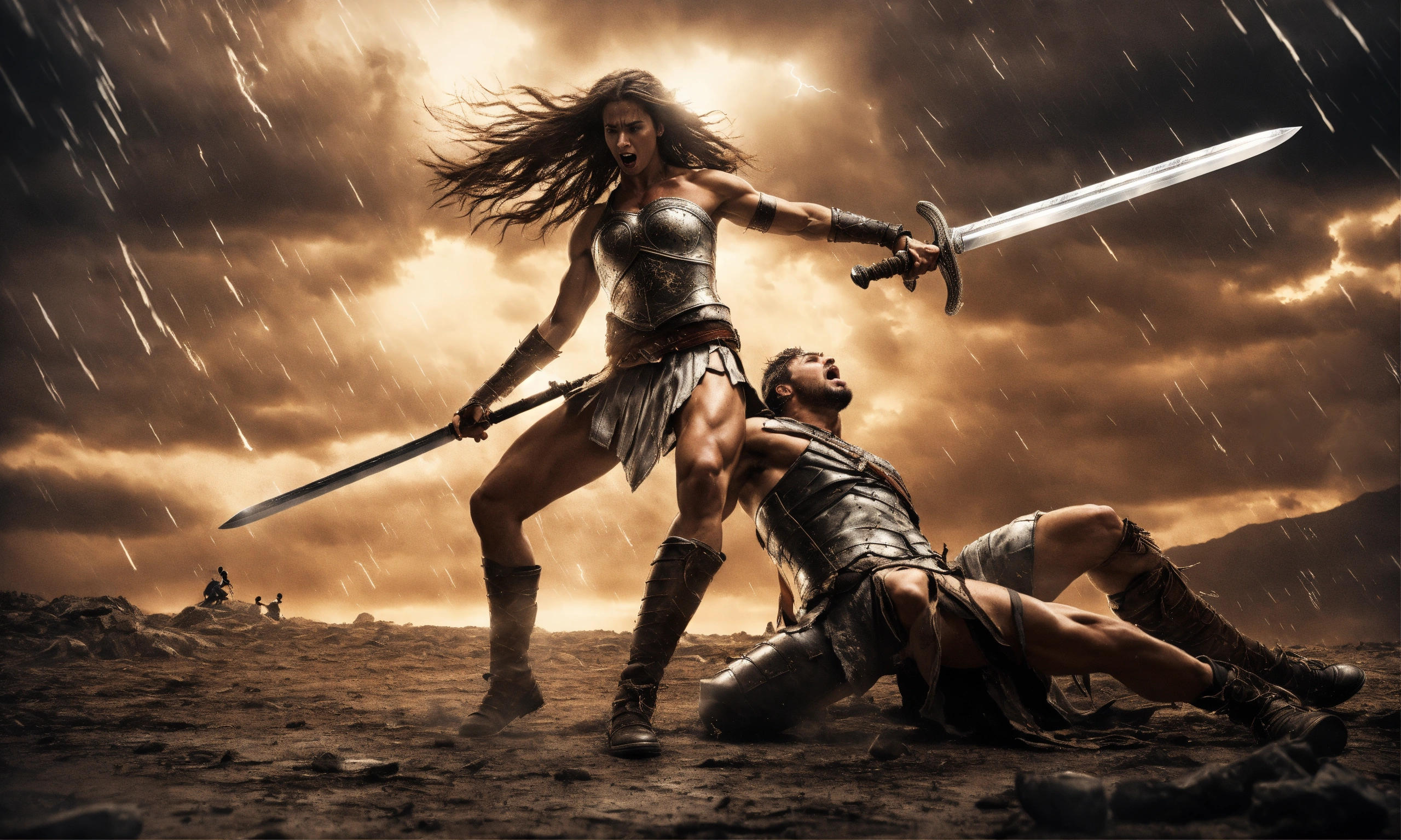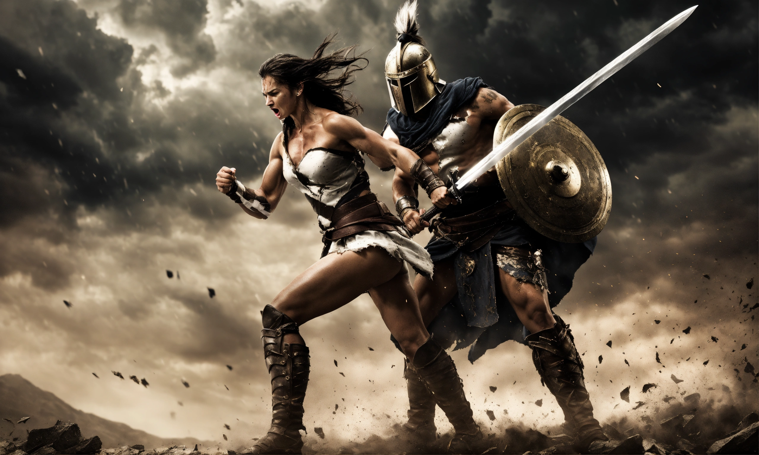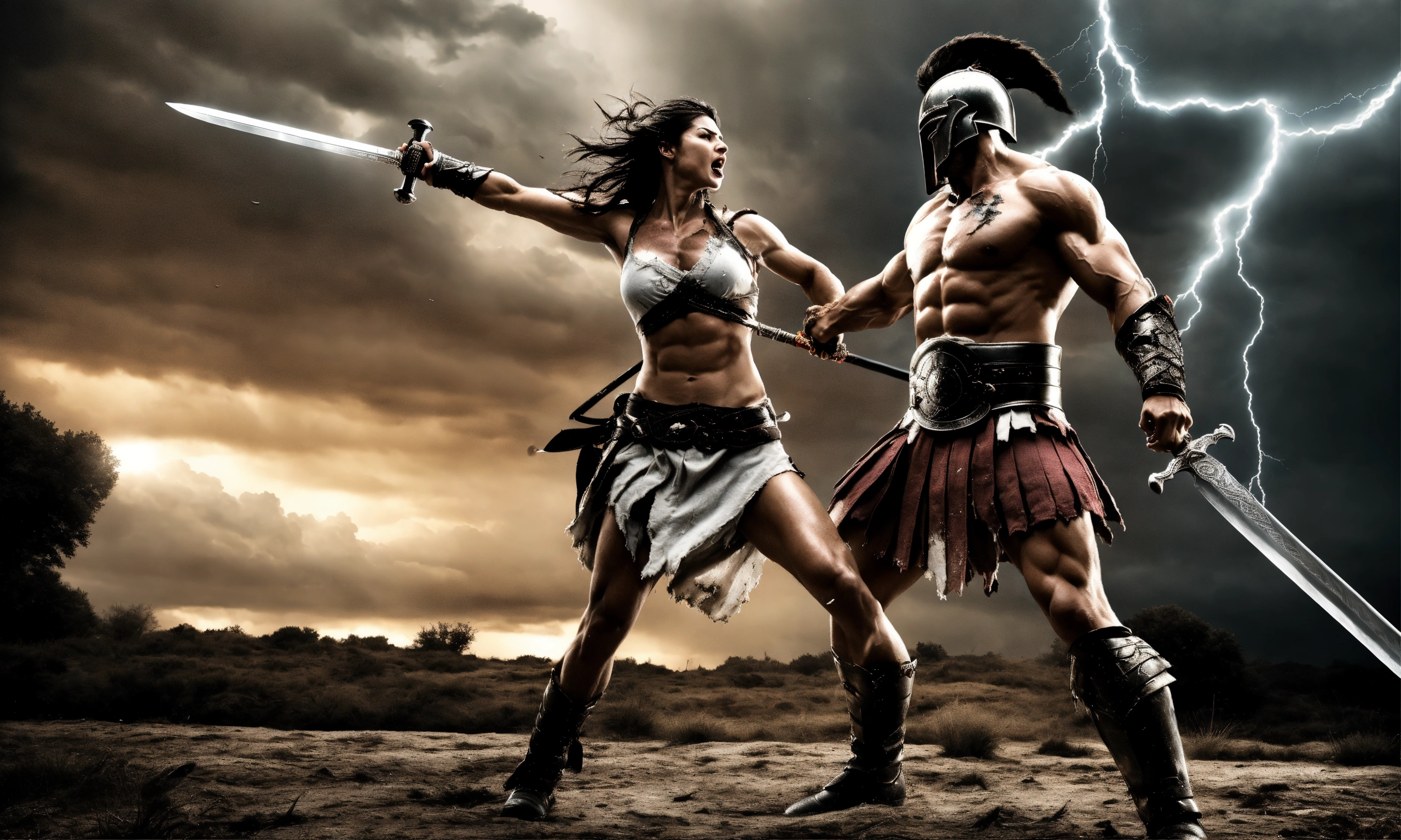 Black and white illustration, wide angle environmental full body shot of male and female spartan warrior having sword fight, defeating woman in sword fight, battling, swining swords, screaming, flexing muscle, standing firmly, dangerous, with lightning and clouds swirling around him, action shot, tattered torn shirt, porcelain cracked skin, (vibrant, photo realistic, realistic, dramatic, dark, sharp focus, 8k).