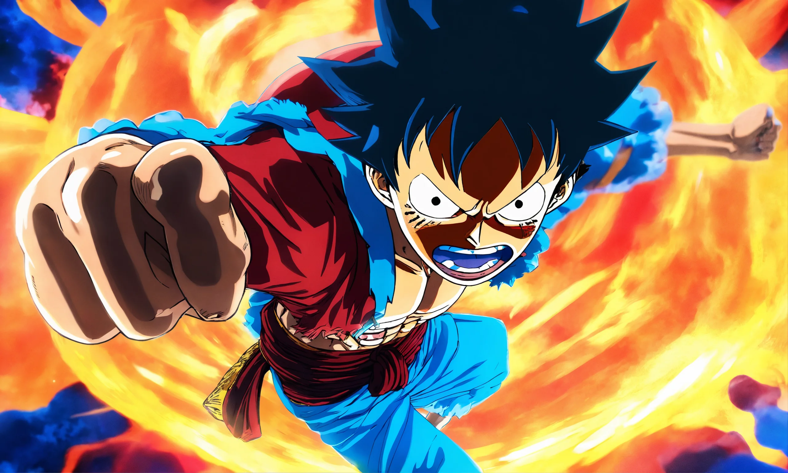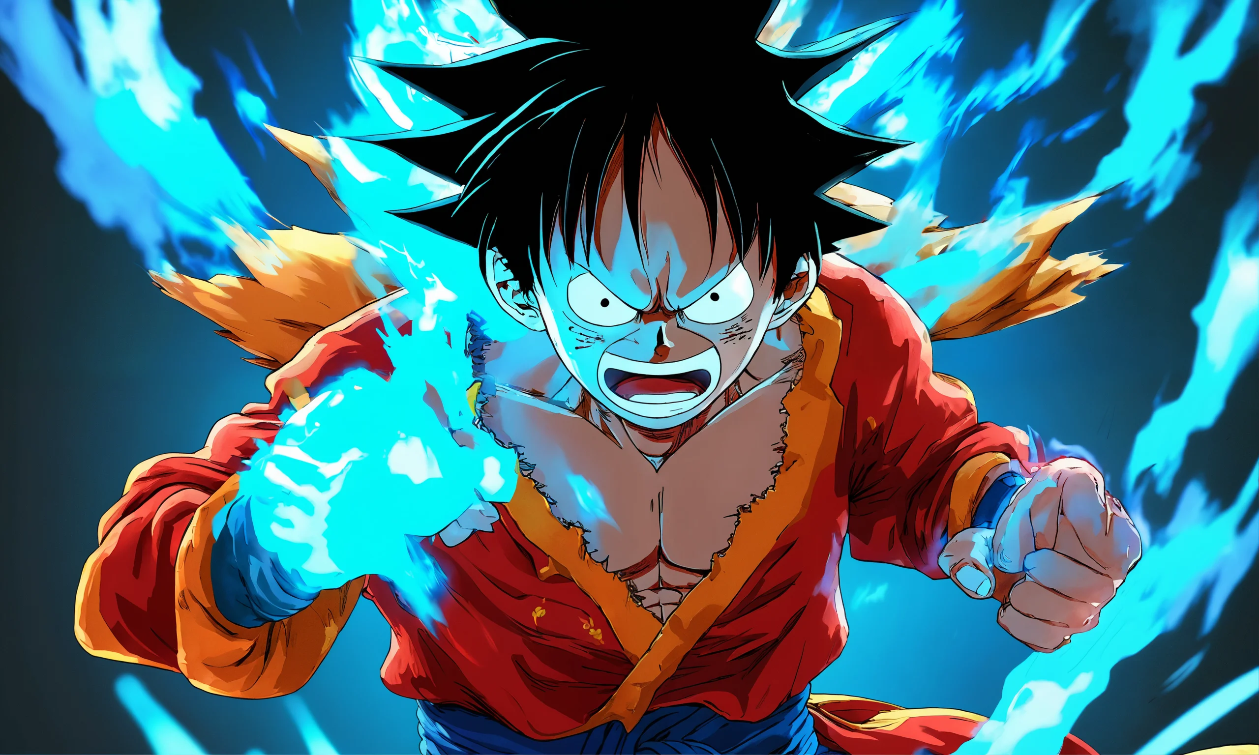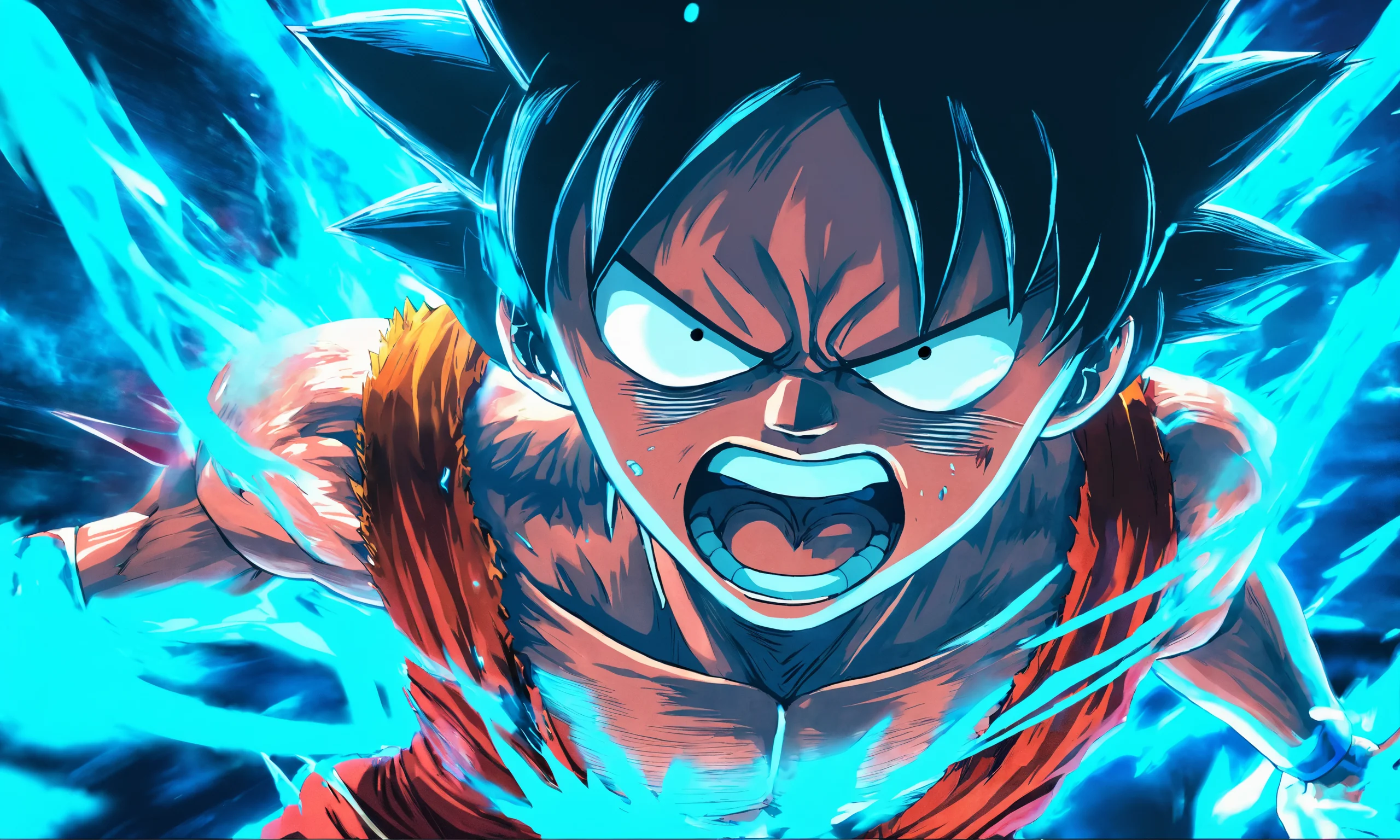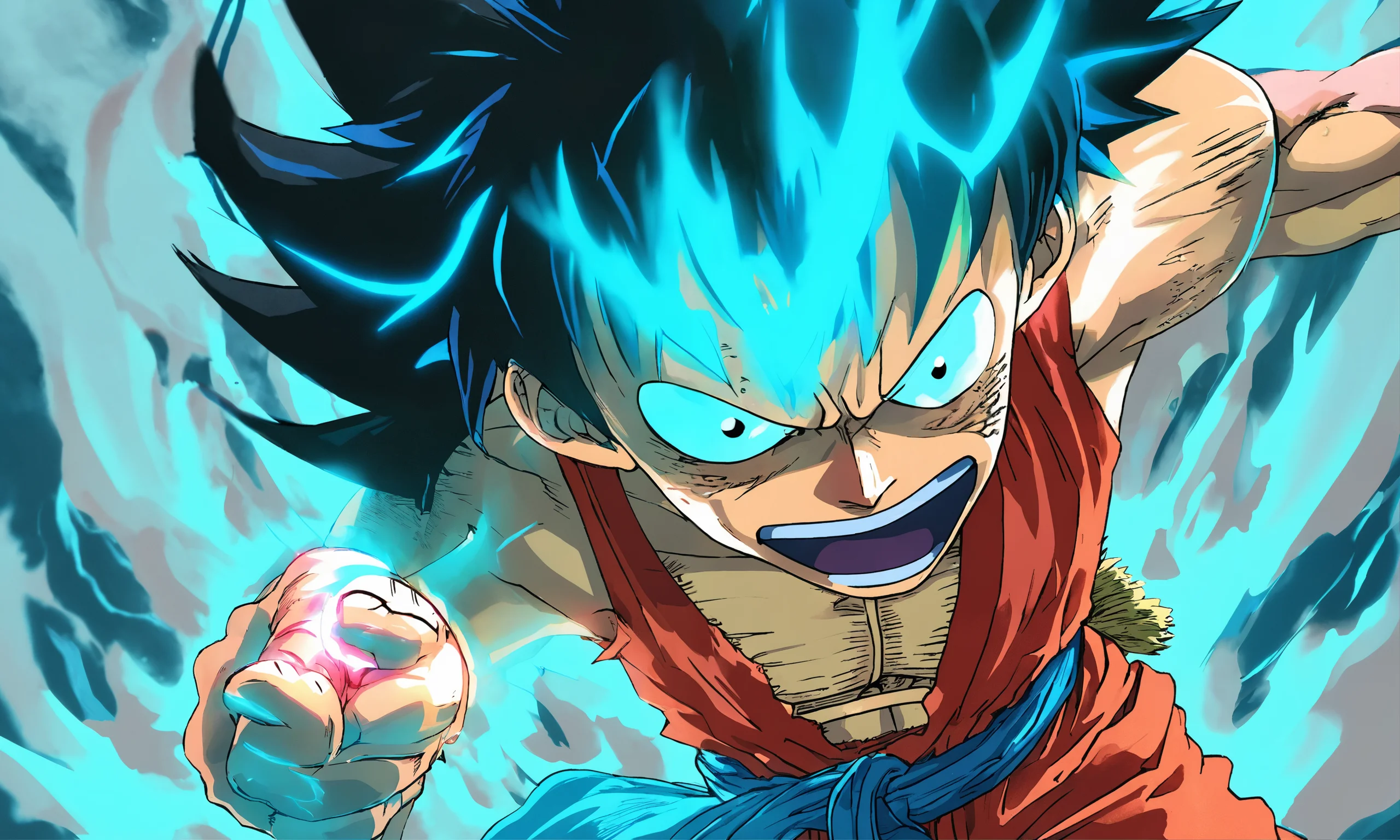 Ultra detailed illustration of luffy in super saiyan blue kaioken style, with a ki aura surrounding his body. the image should be centered, featuring blue hair and a luminous appearance. the bright blue aura should have bolts, and the style should resemble that of akira toriyama and mschiffer, with influences from manga, anime, and saiyan clothing. the illustration should be of the best quality with sharp focus, showcasing an angry look, a fighting pose, and luffy screaming with an open mouth in a very angry expression.