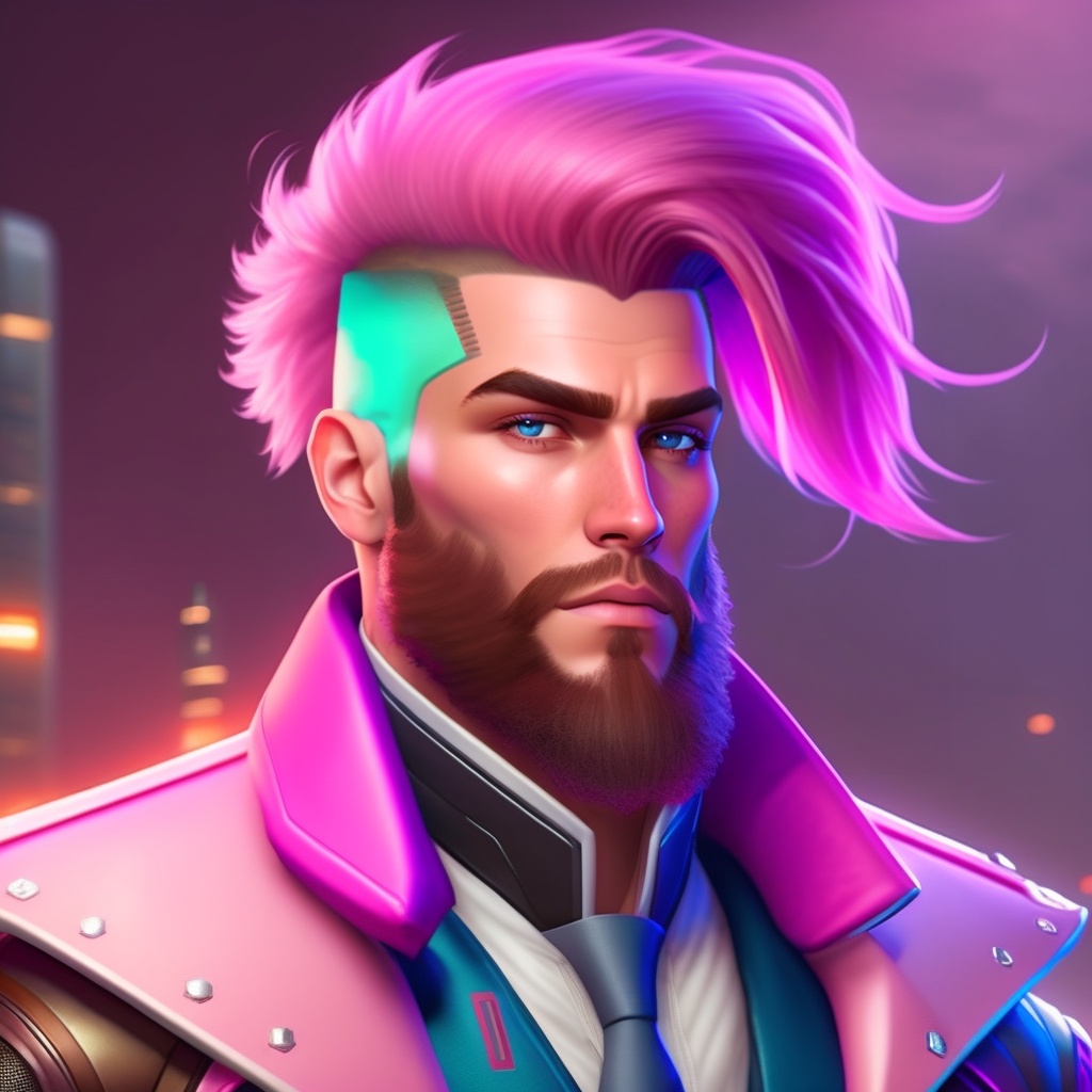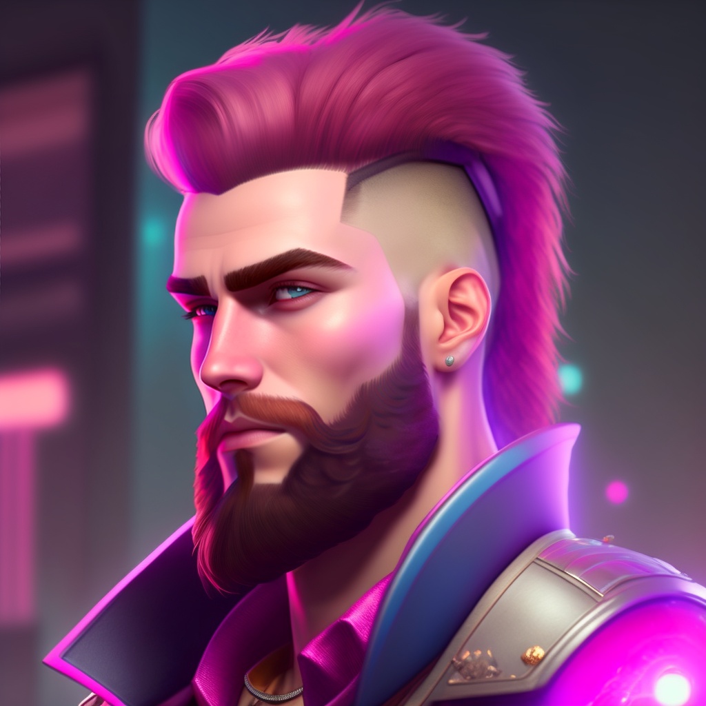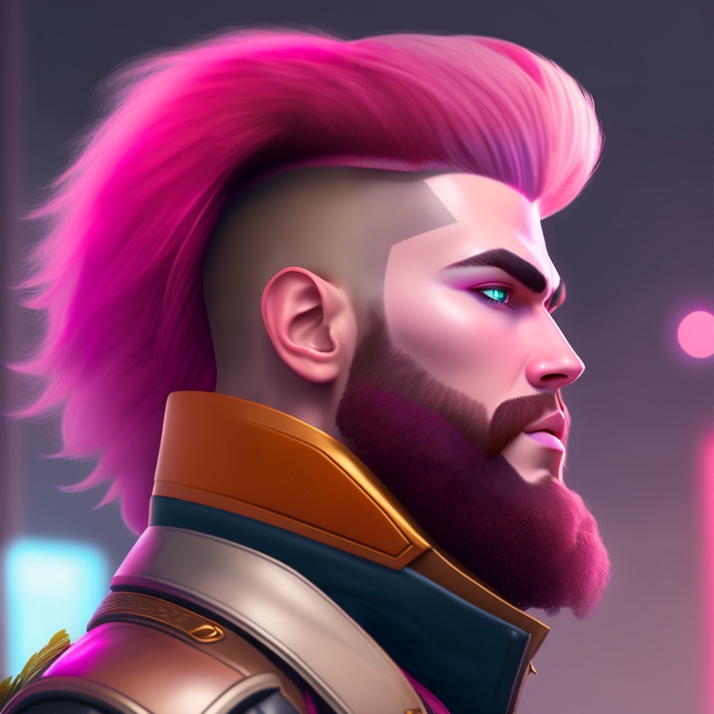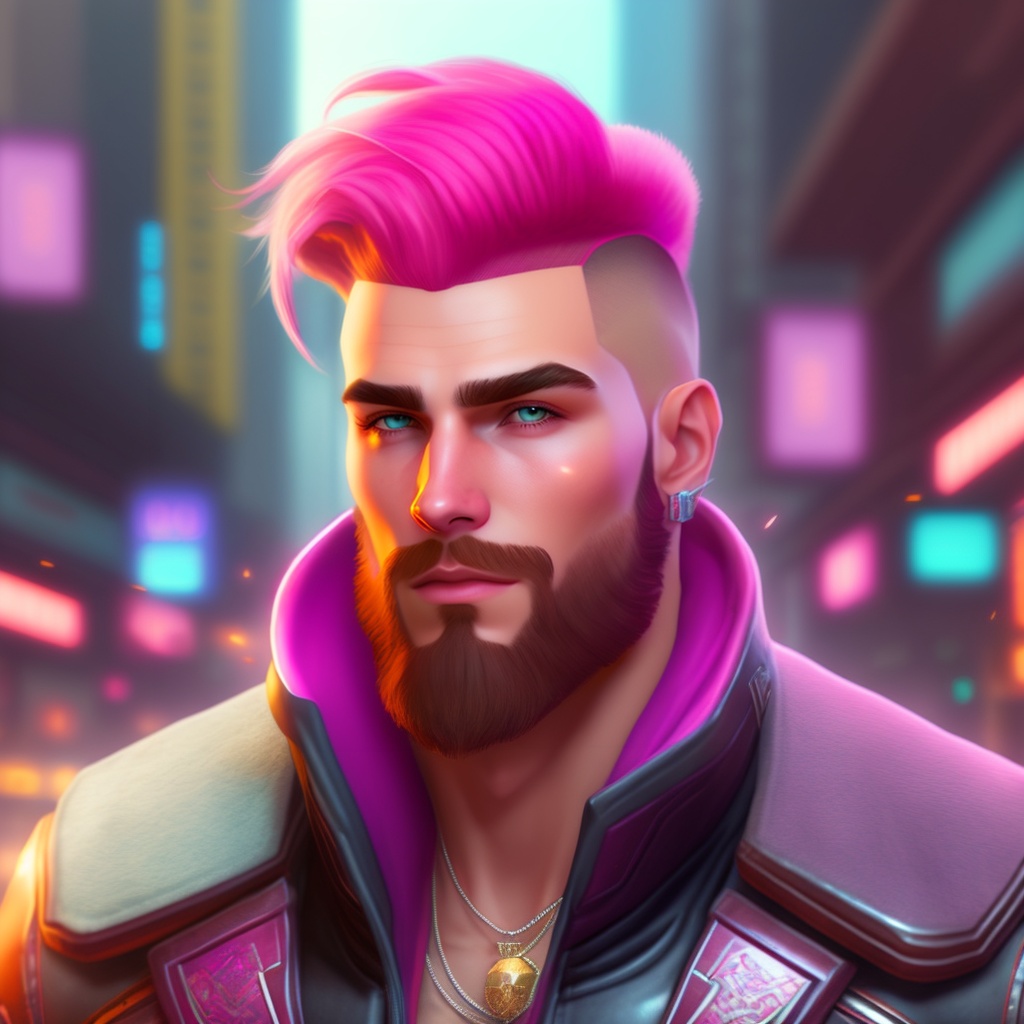 Cyberpunk, male character, fair skin, pink mullet hairstyle, full beard of light brown color, thick eyebrows