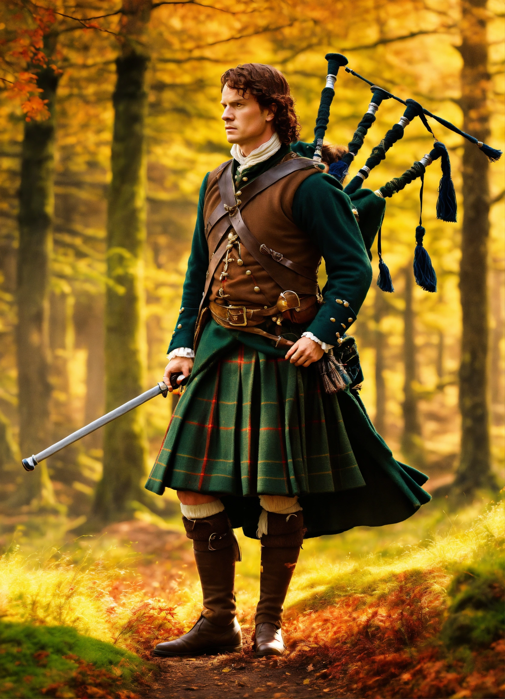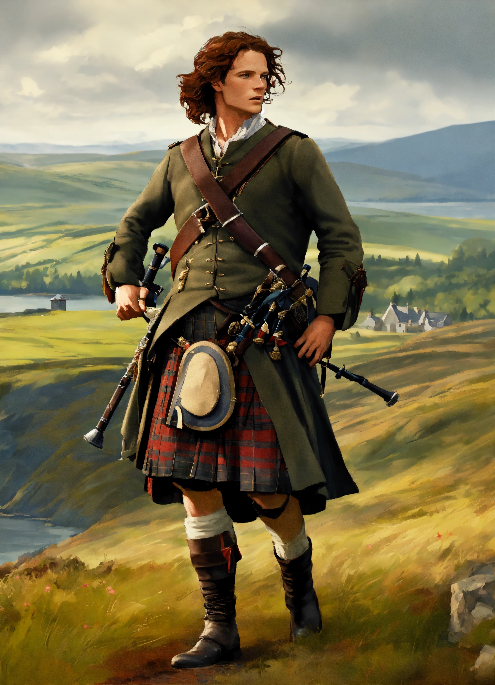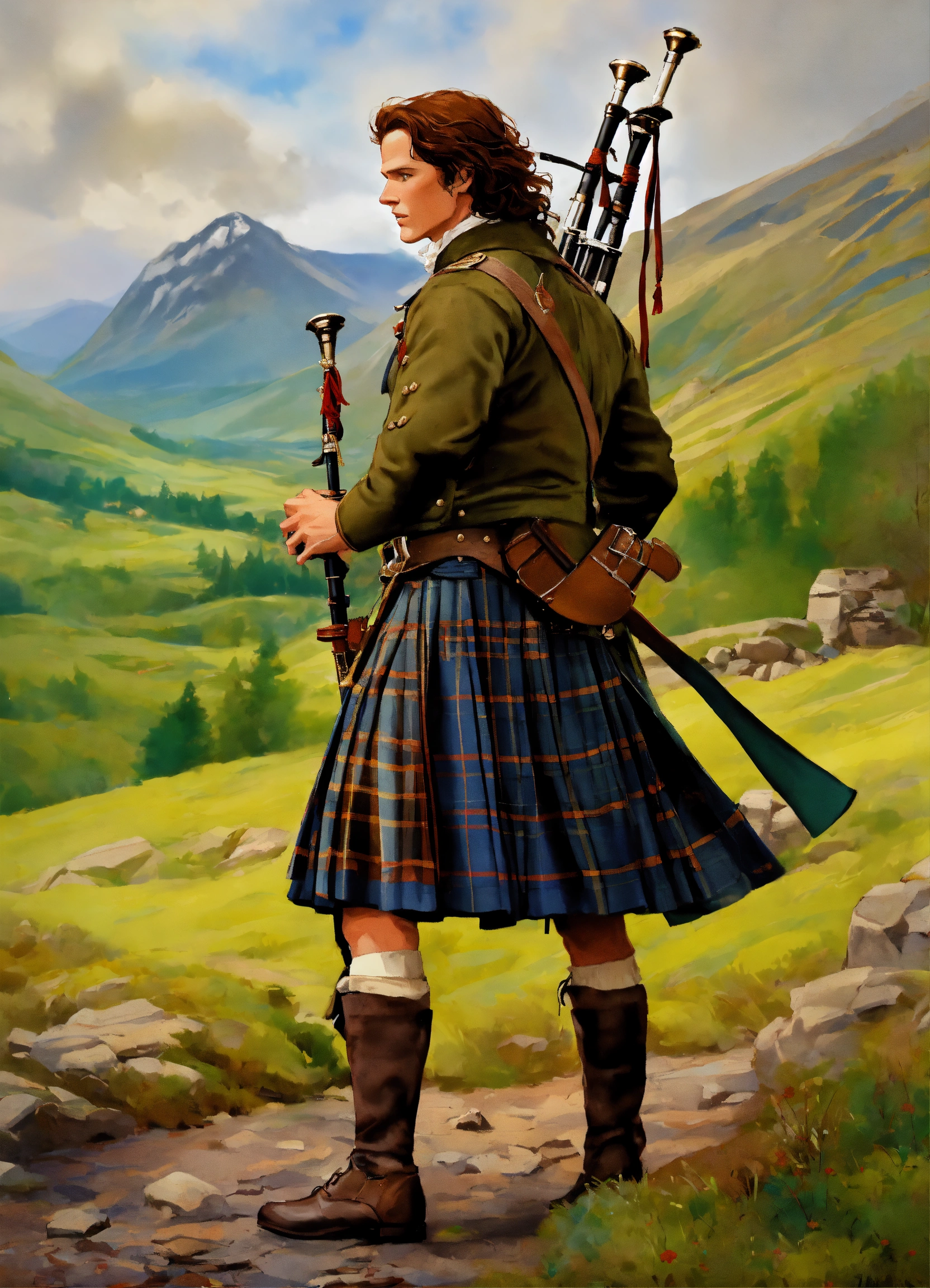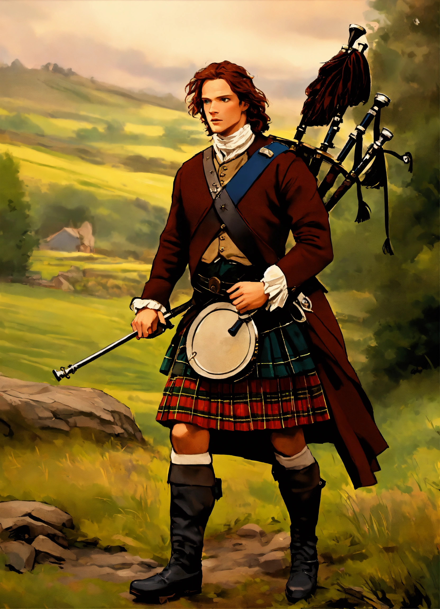 Full body, jamie and claire fraser, the outlander series, kilt and bagpipes, highland, scottish flag, very animated and detailed, high quality, battle of colluden, illustration