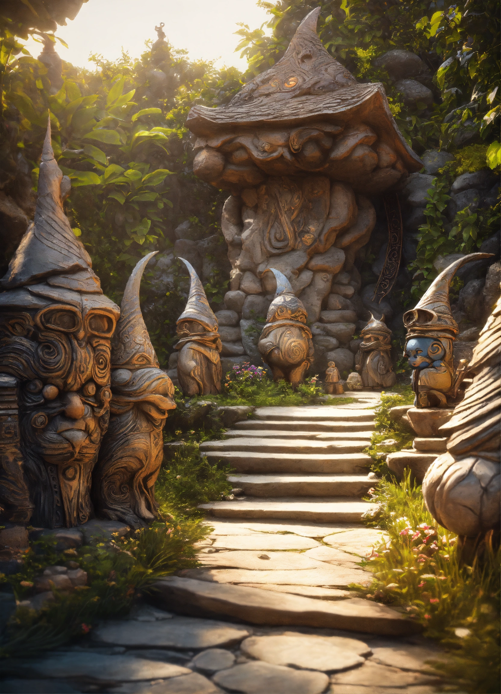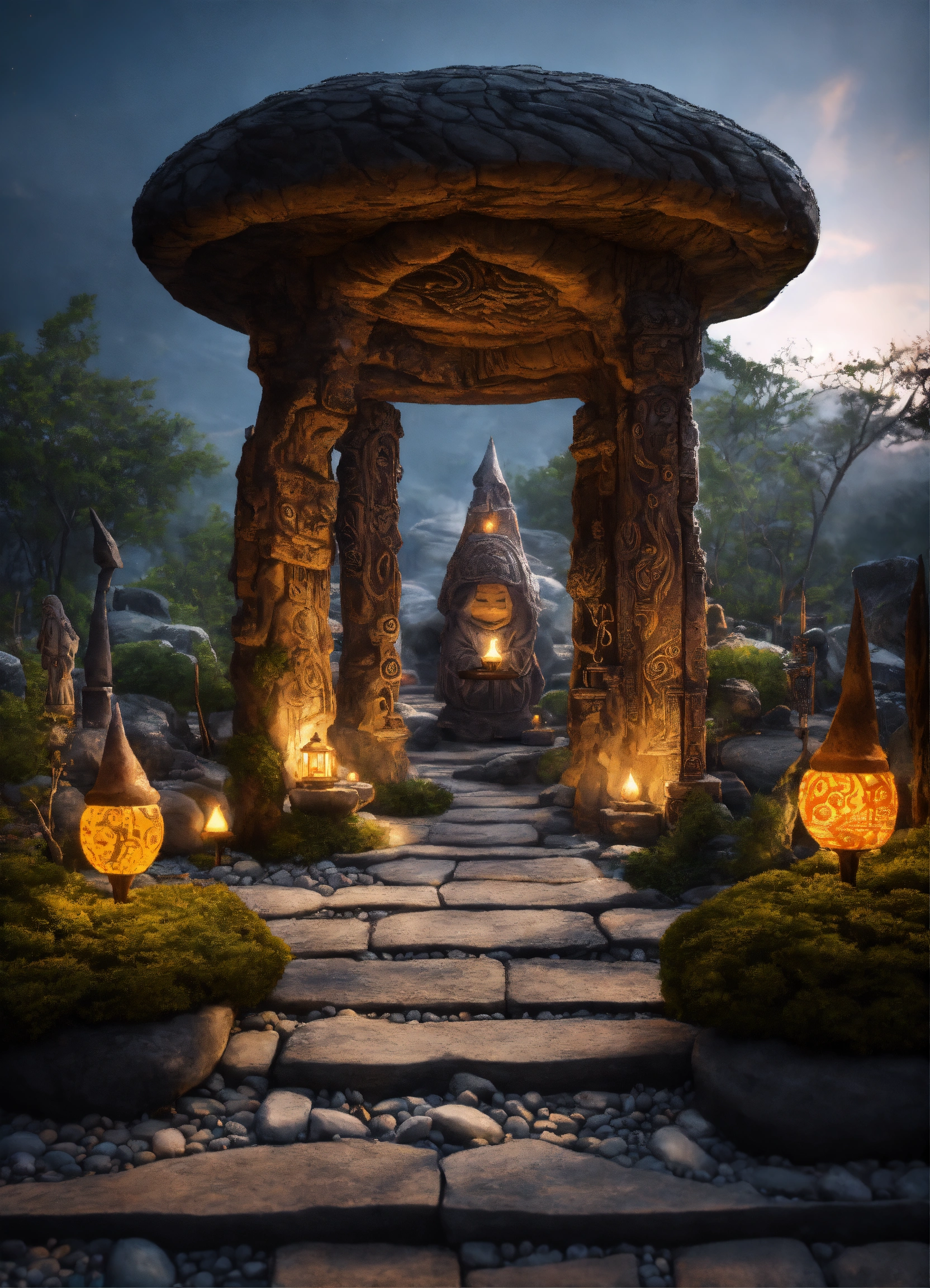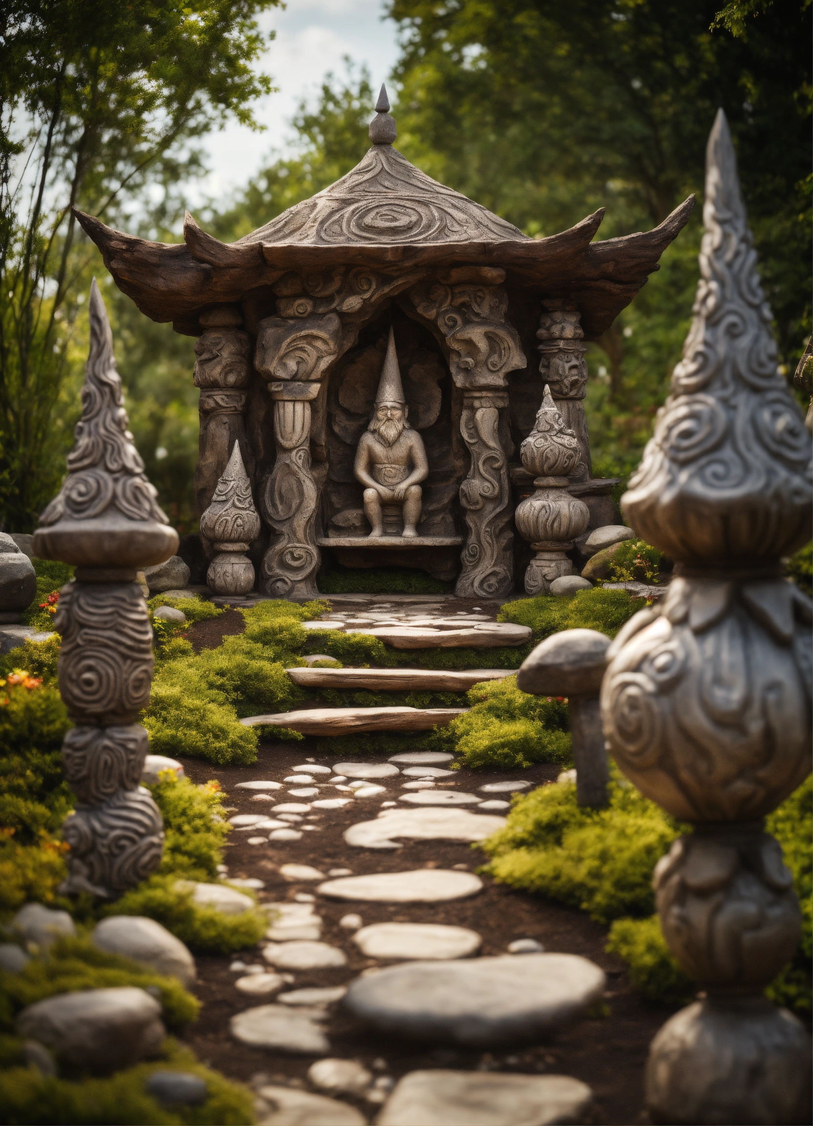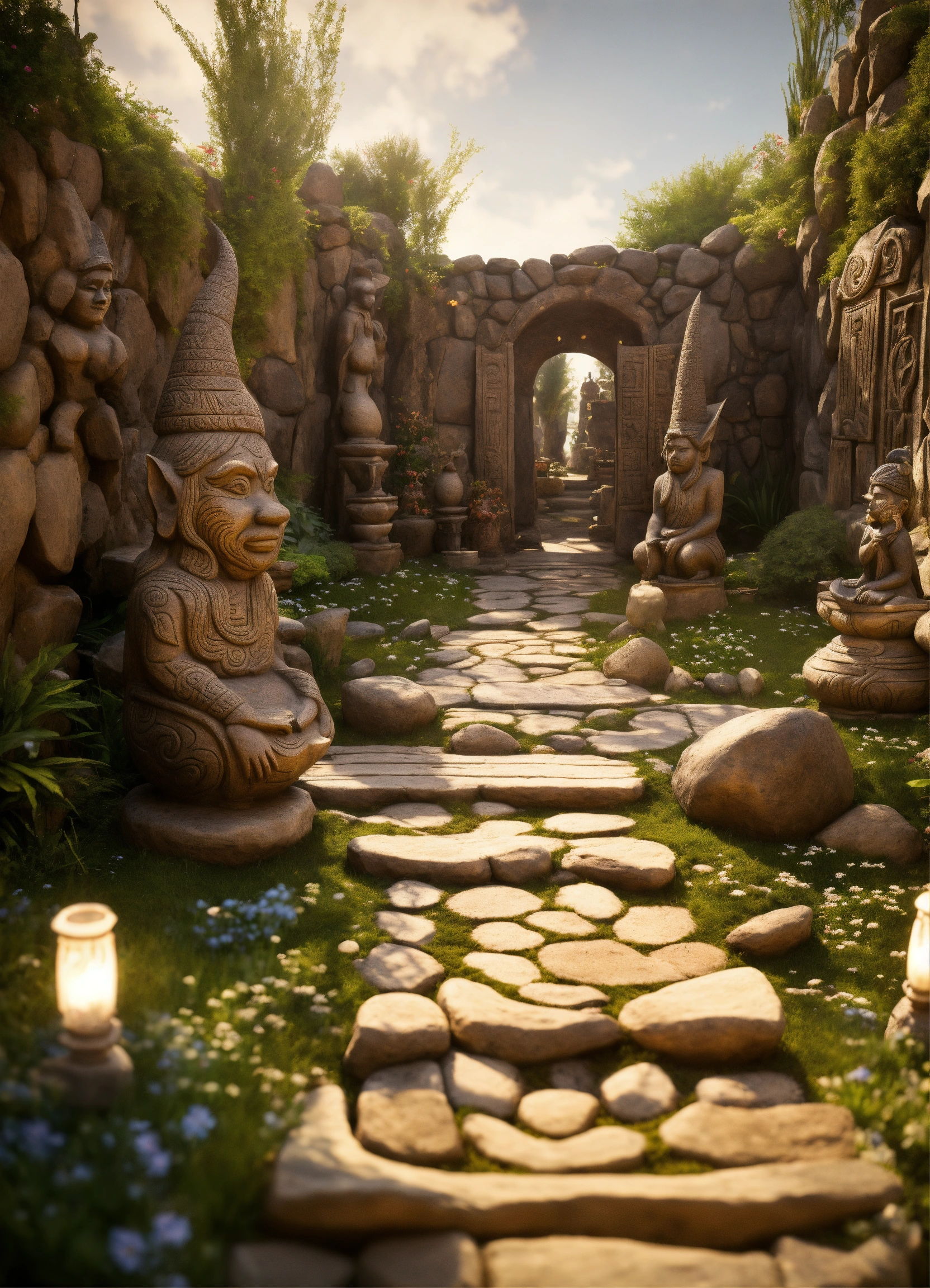 An ancient spiritual gnomes stone pathway rock garden.sculptured . style of alex grey, giger.unreal engine.totem sculptures.swirling patterned stone pathway courtyard.wood.stone.driftwood.statues. artistic sculpture.lanterns.