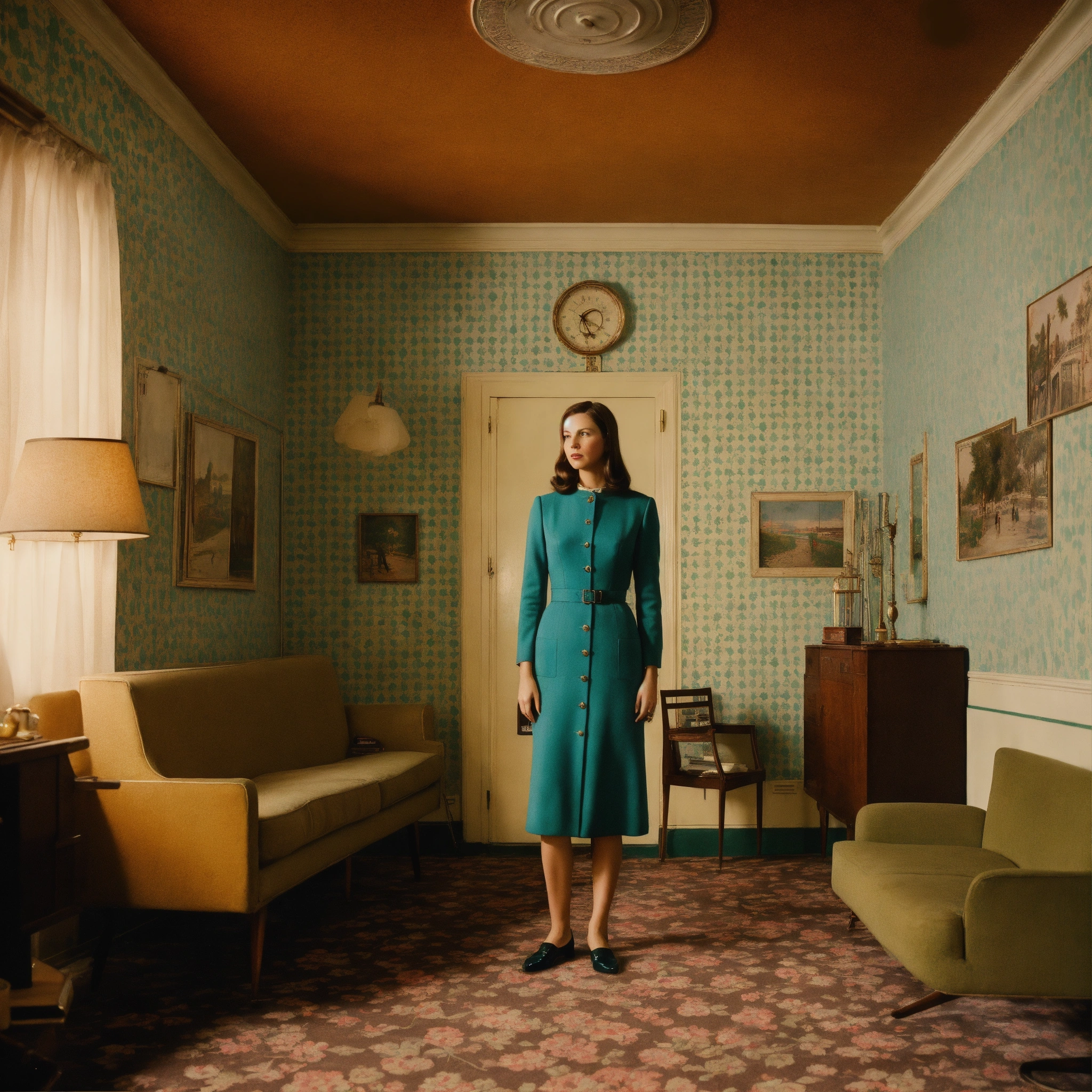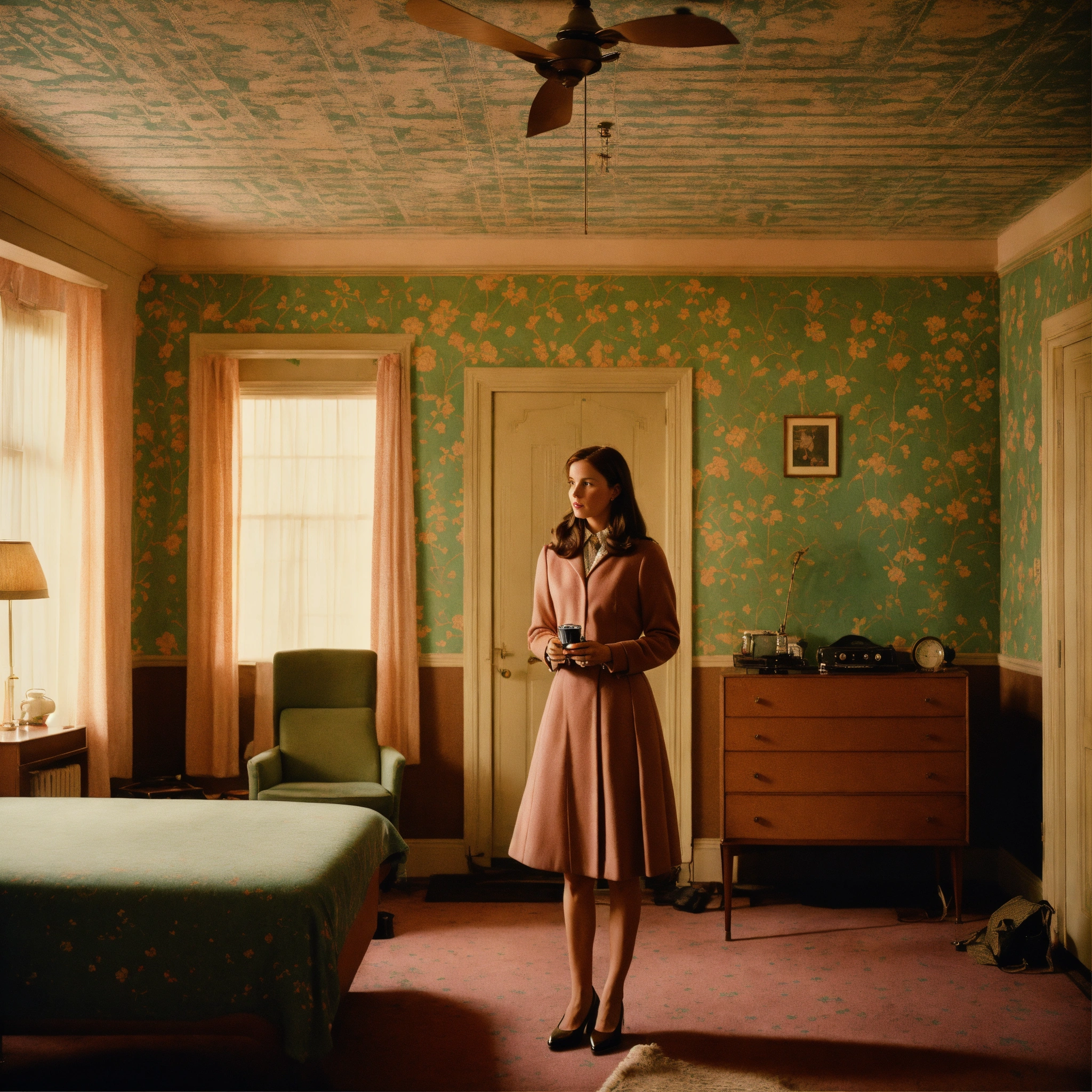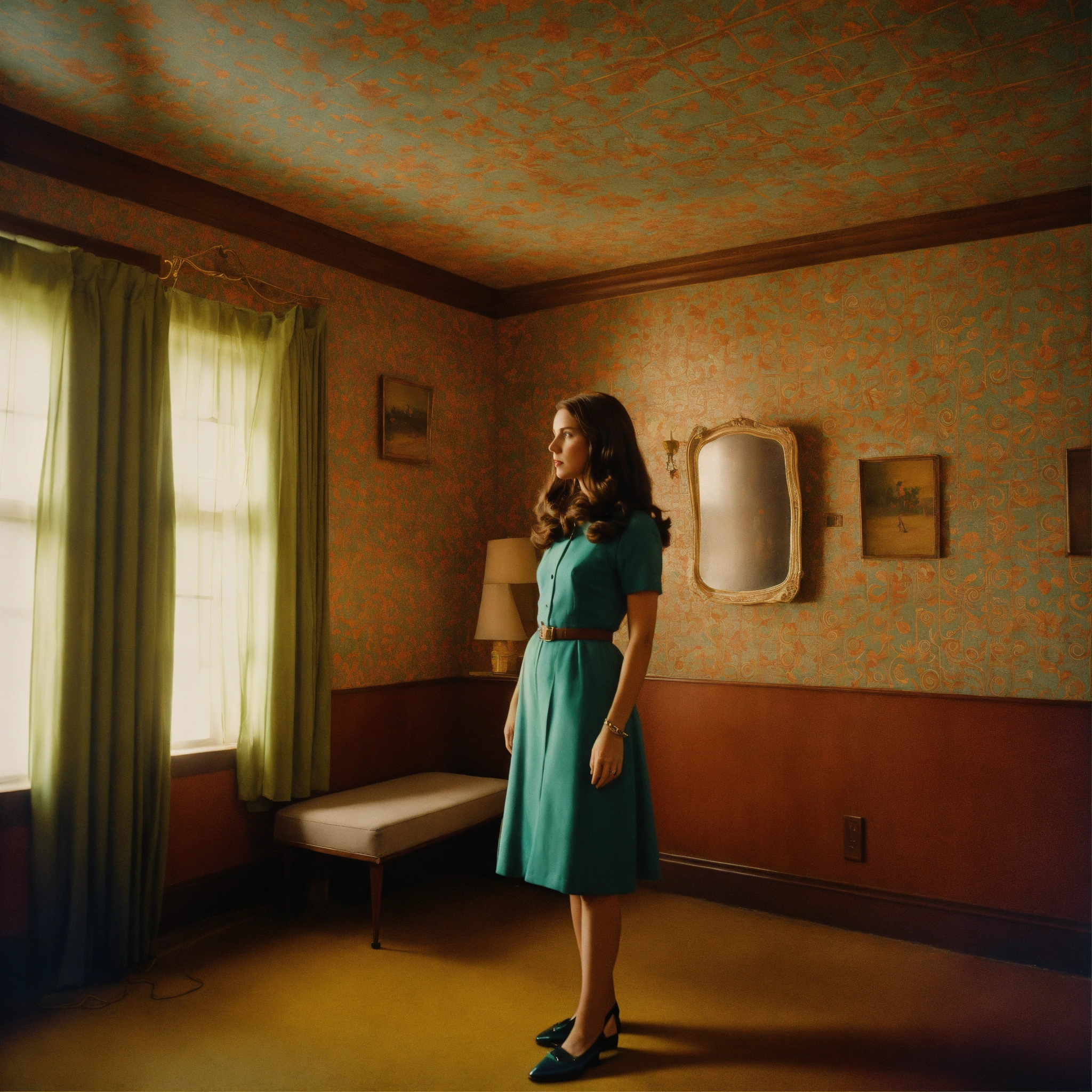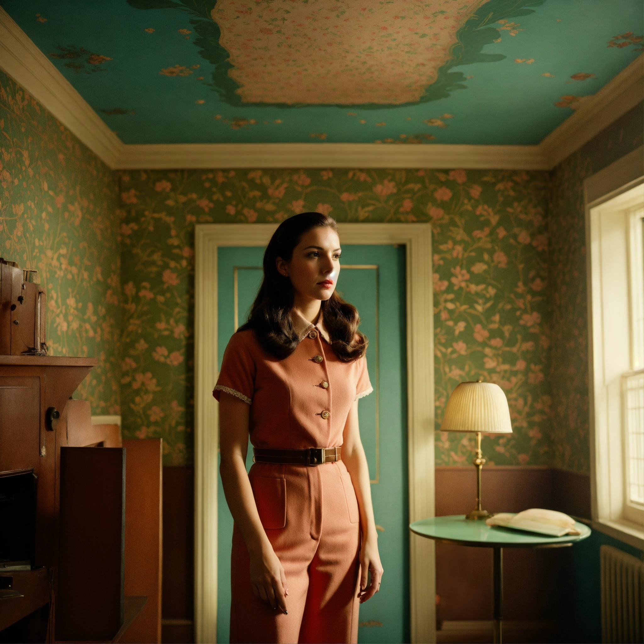 A retro photograph of a woman with long brown hair standing in a room with 1950s wallpaper, a view of the whole room including the ceiling, wes anderson colour and gregory crewdson composition