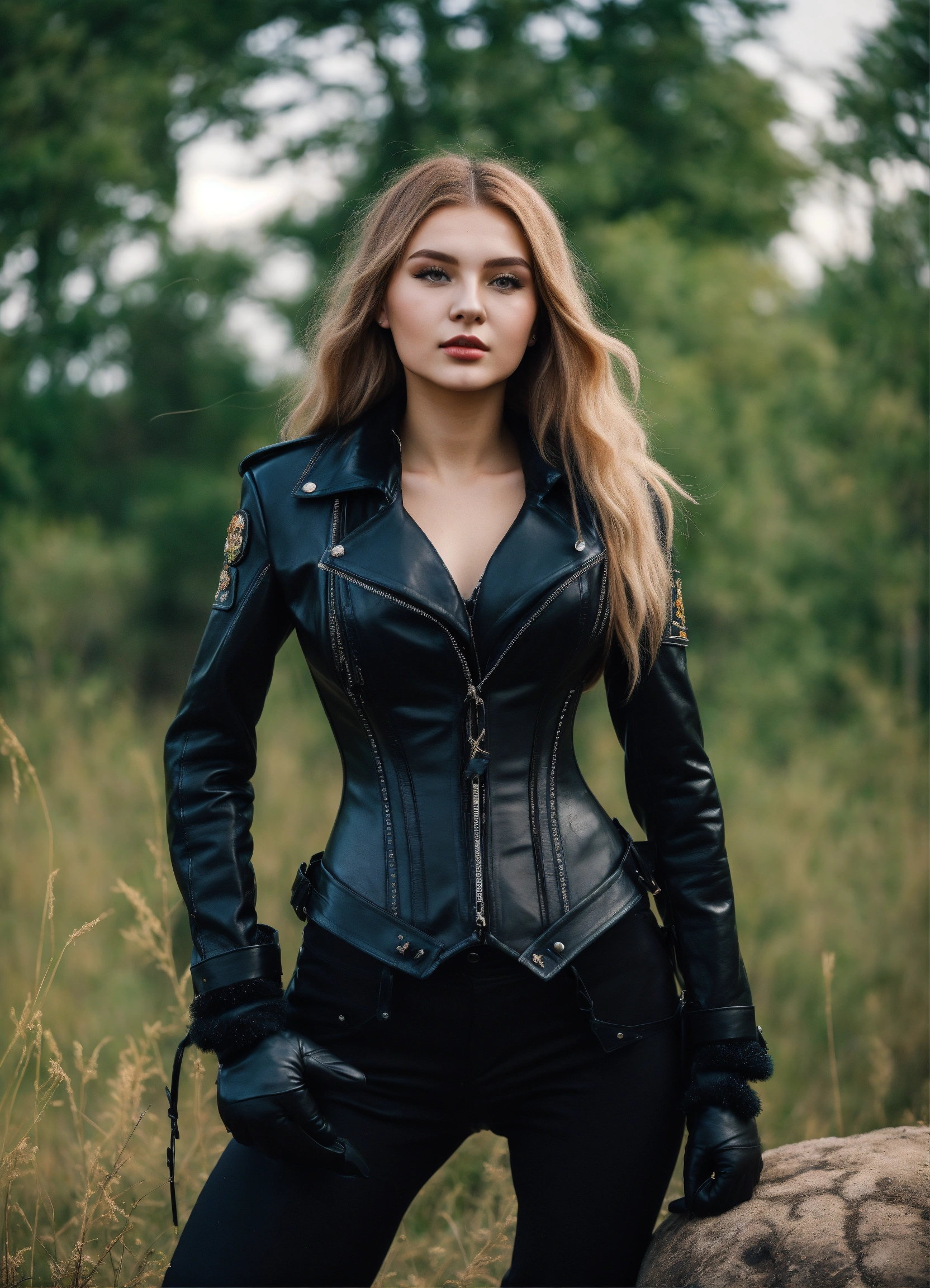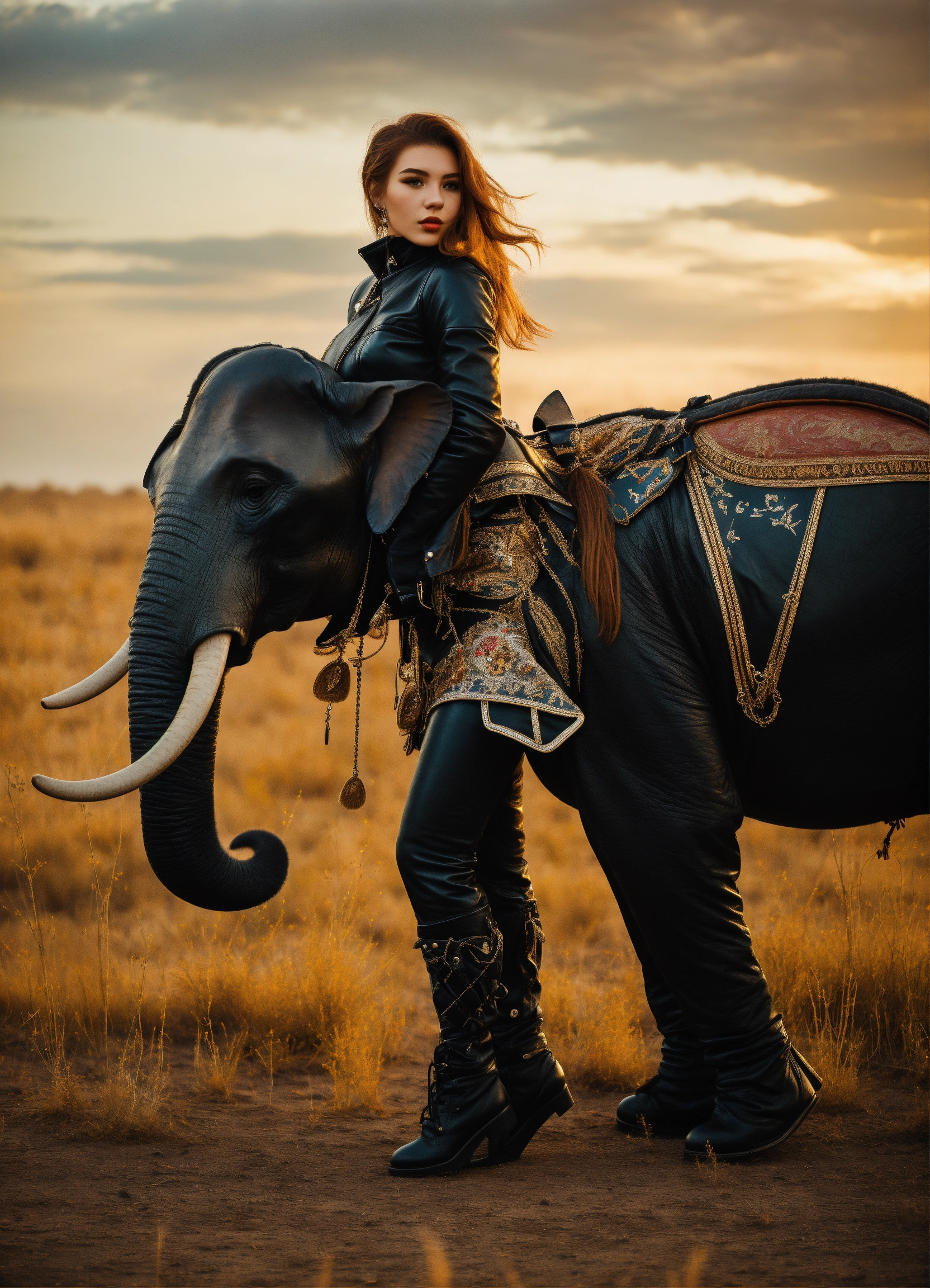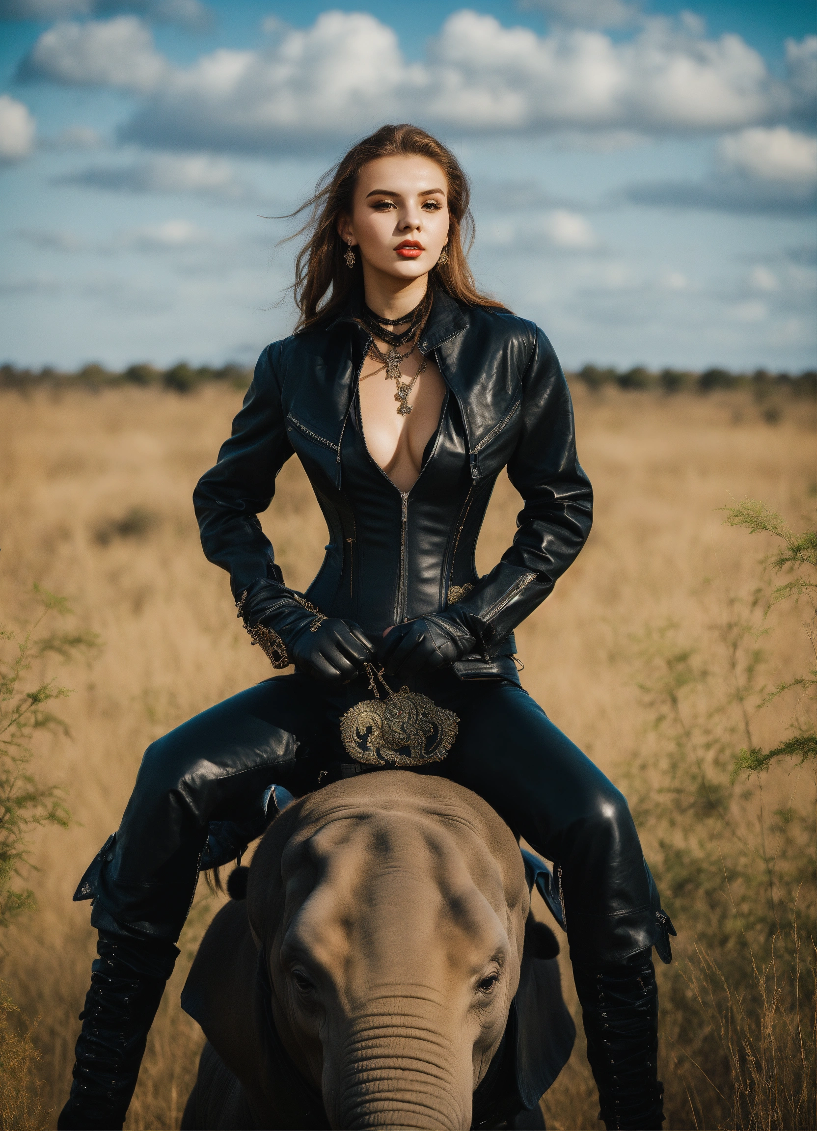 A 20 year old russian female fashion blogger wearing a black leather jacket corset and gloves and pants, juwelry, riding an elefant on the savanna