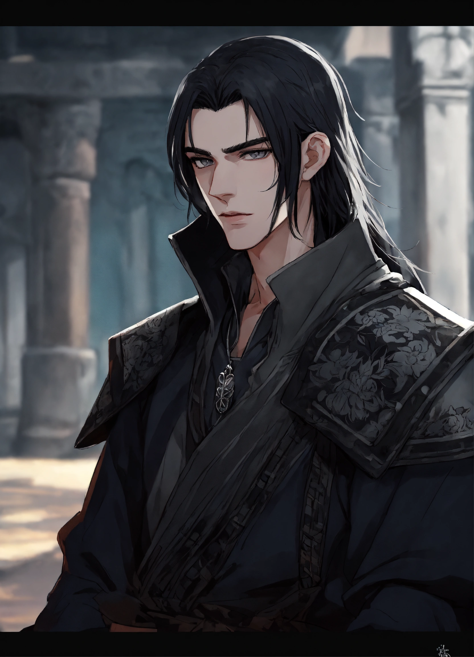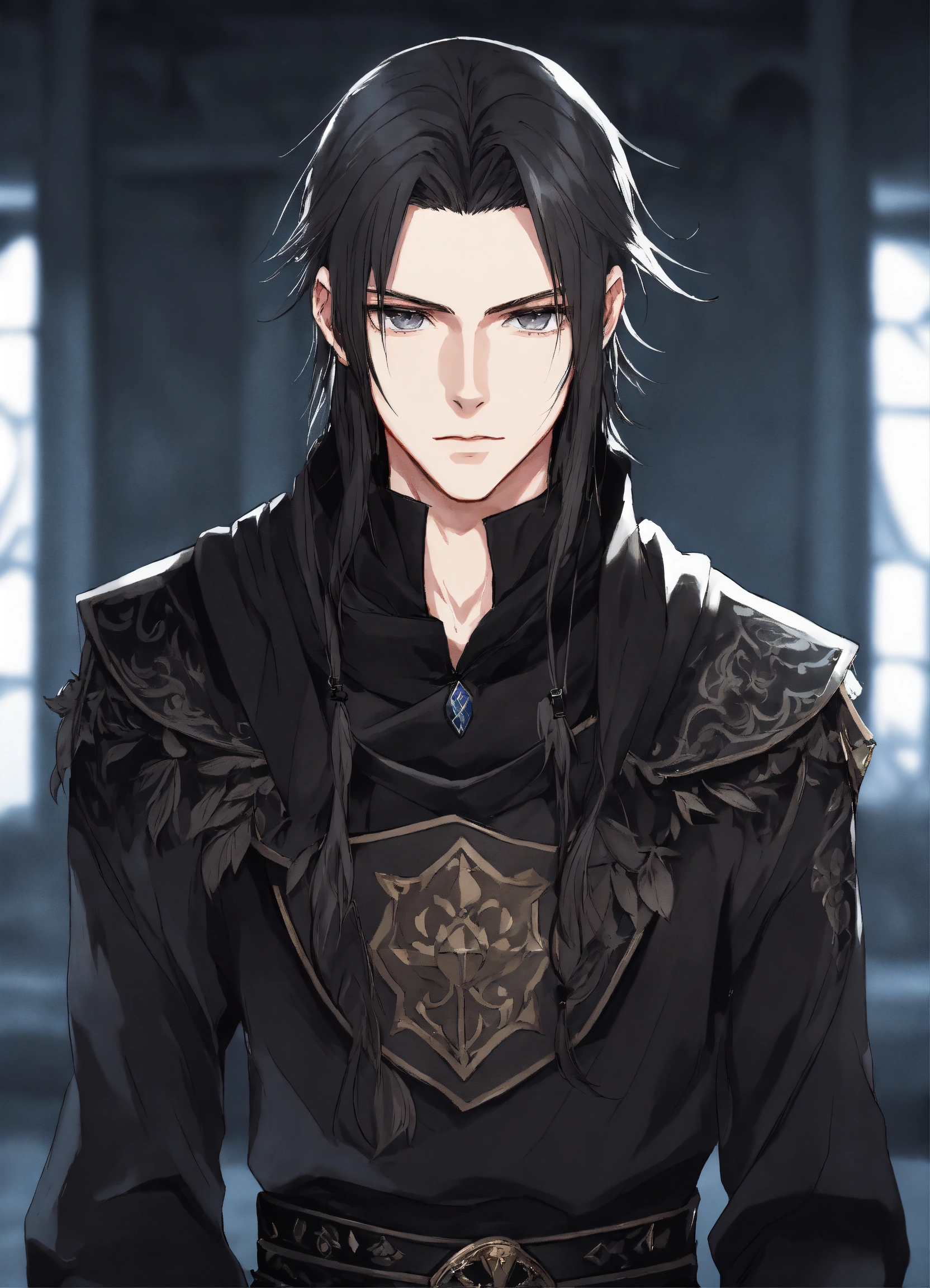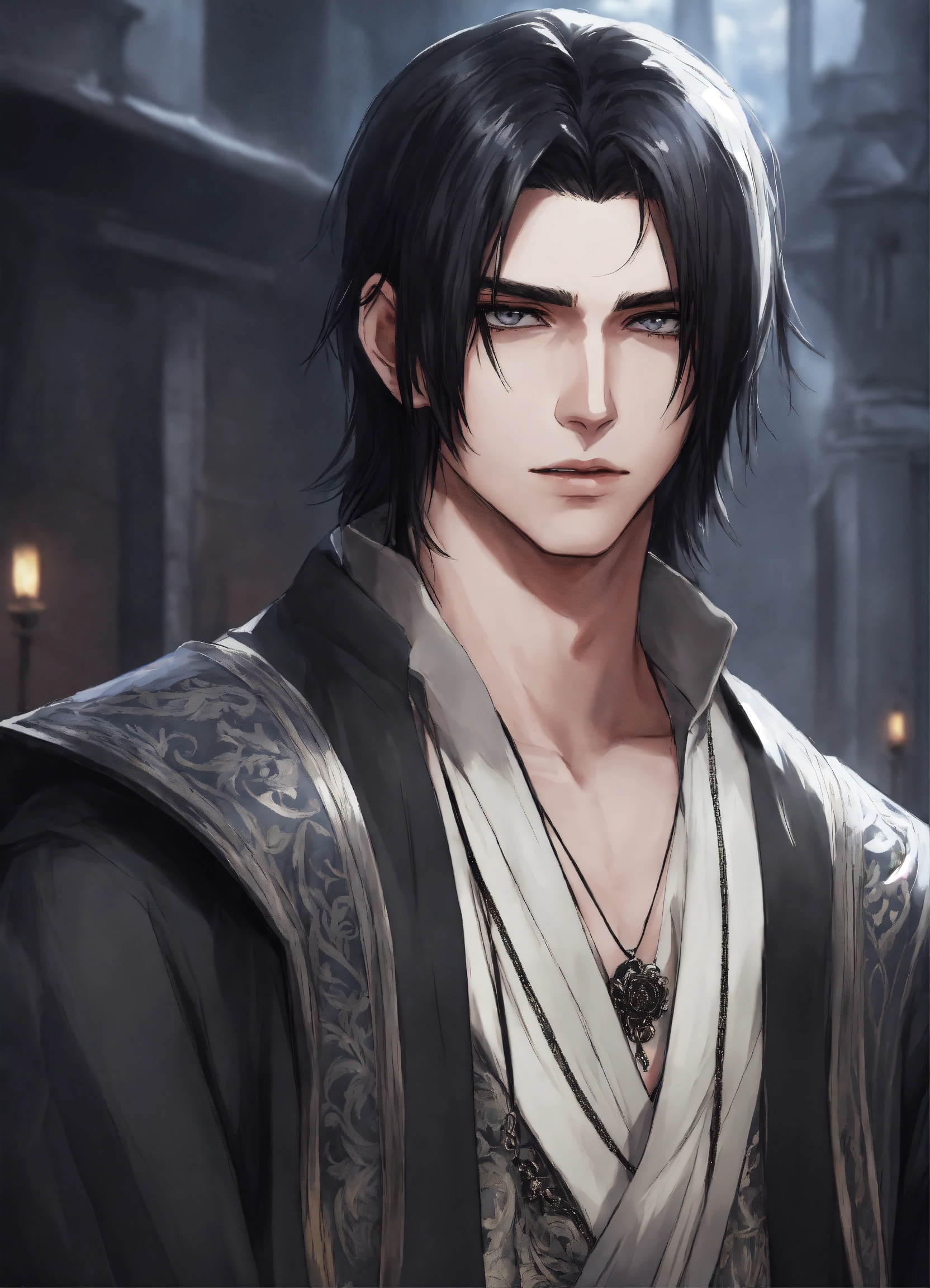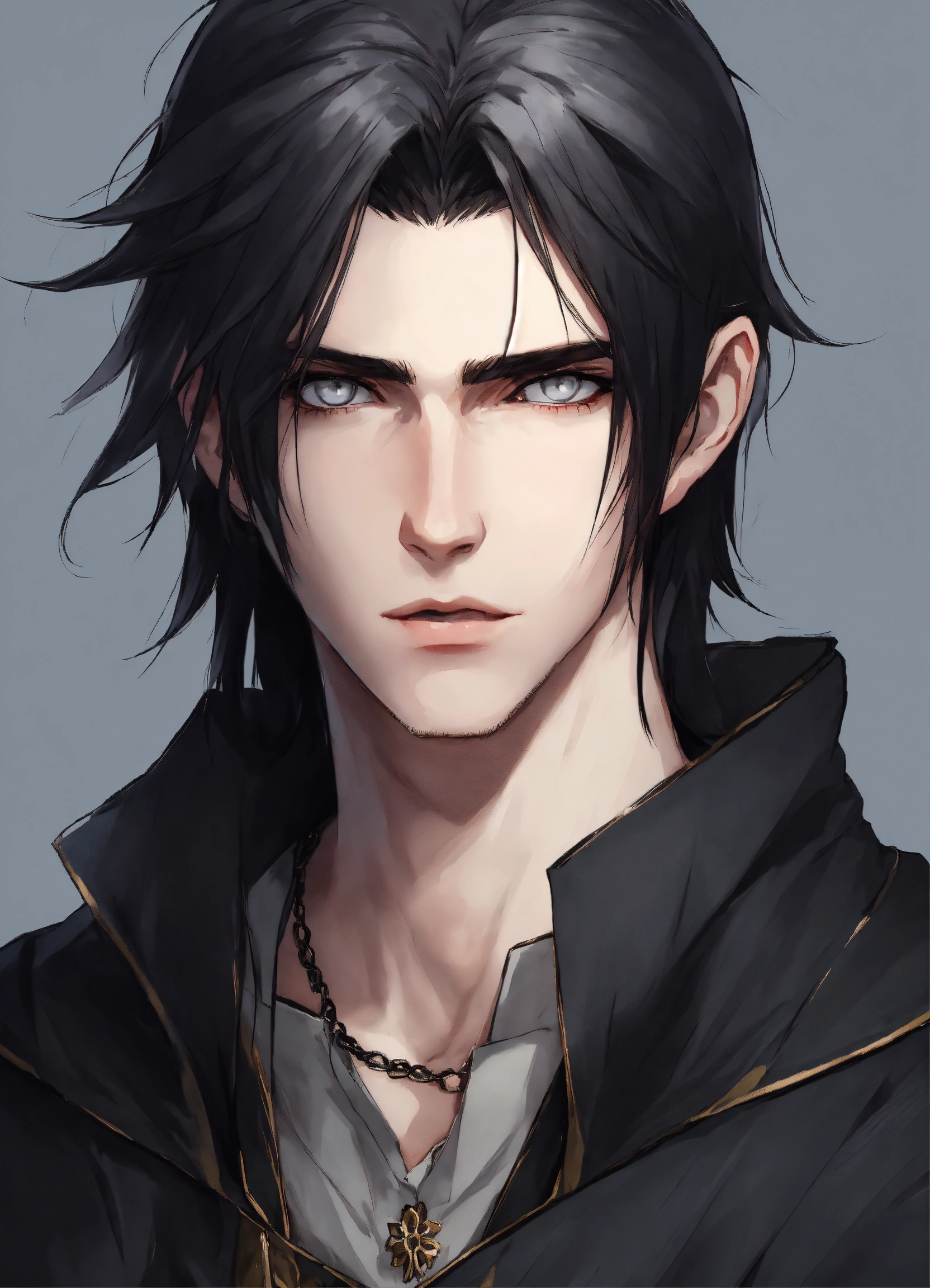 Anime style, 20-year-old slavic man, dark black straight shoulder length hair, grey eyes, deathly pale skin, slvic clothing, dressed in slavic clothes in anime style
