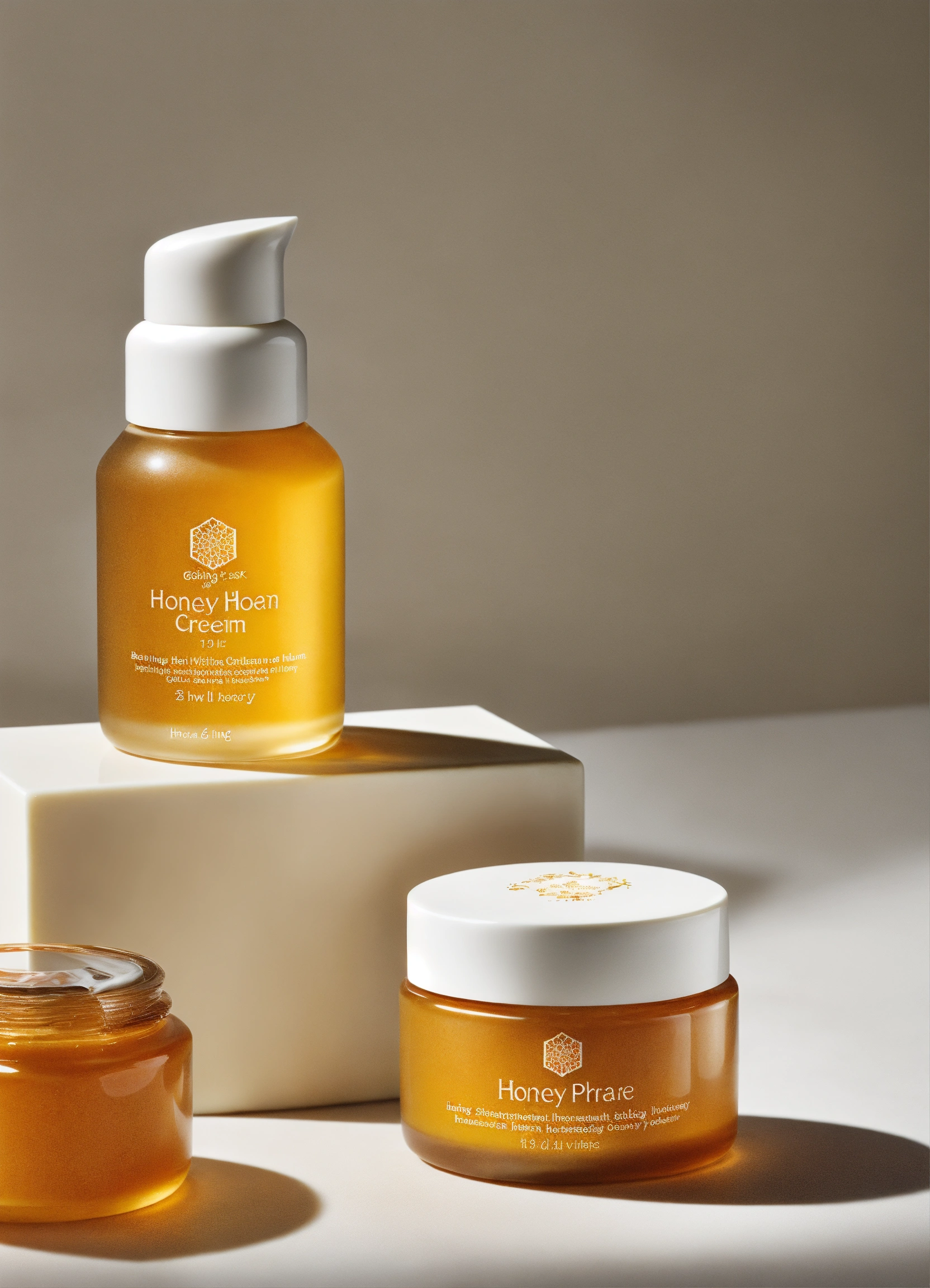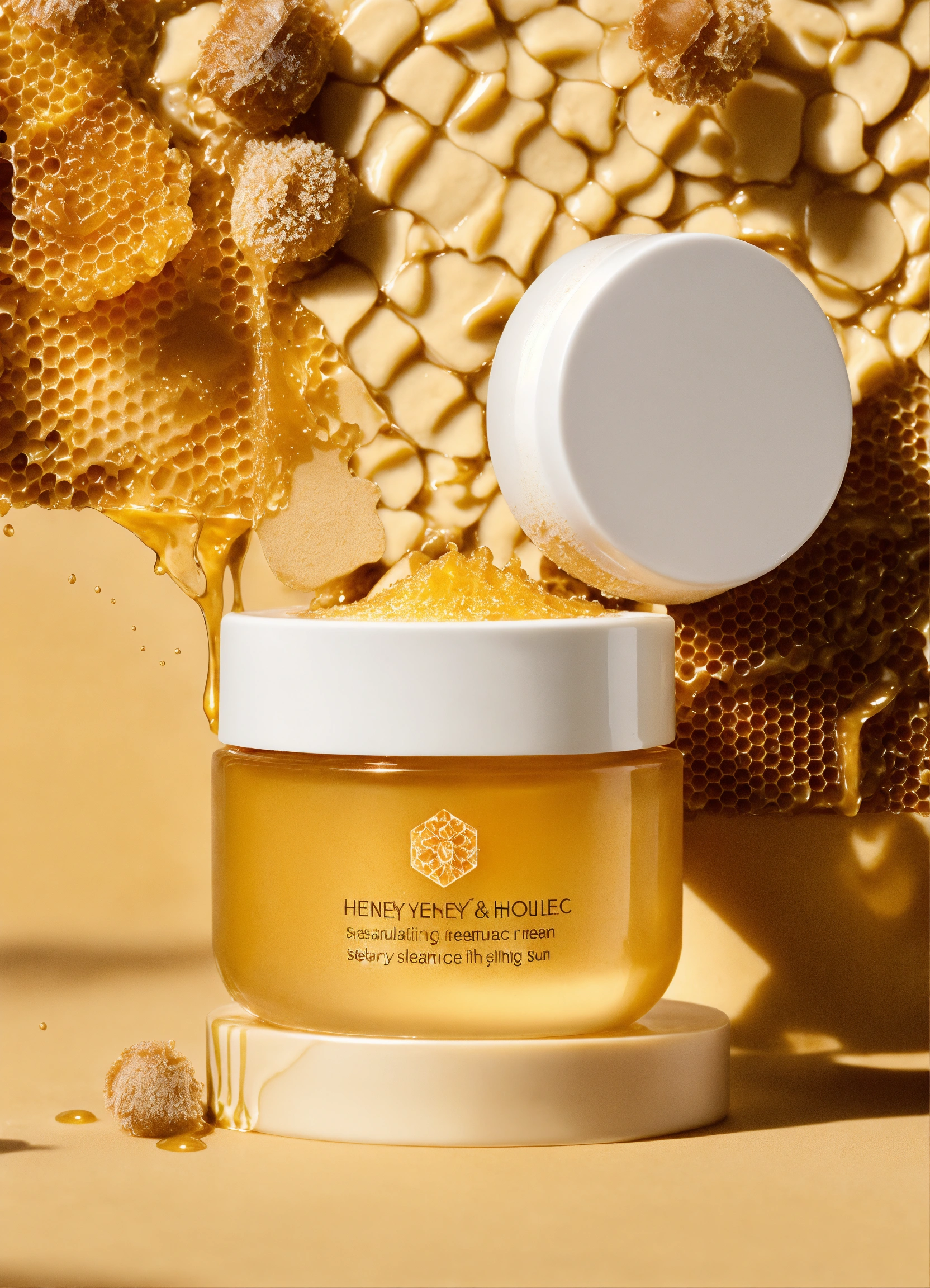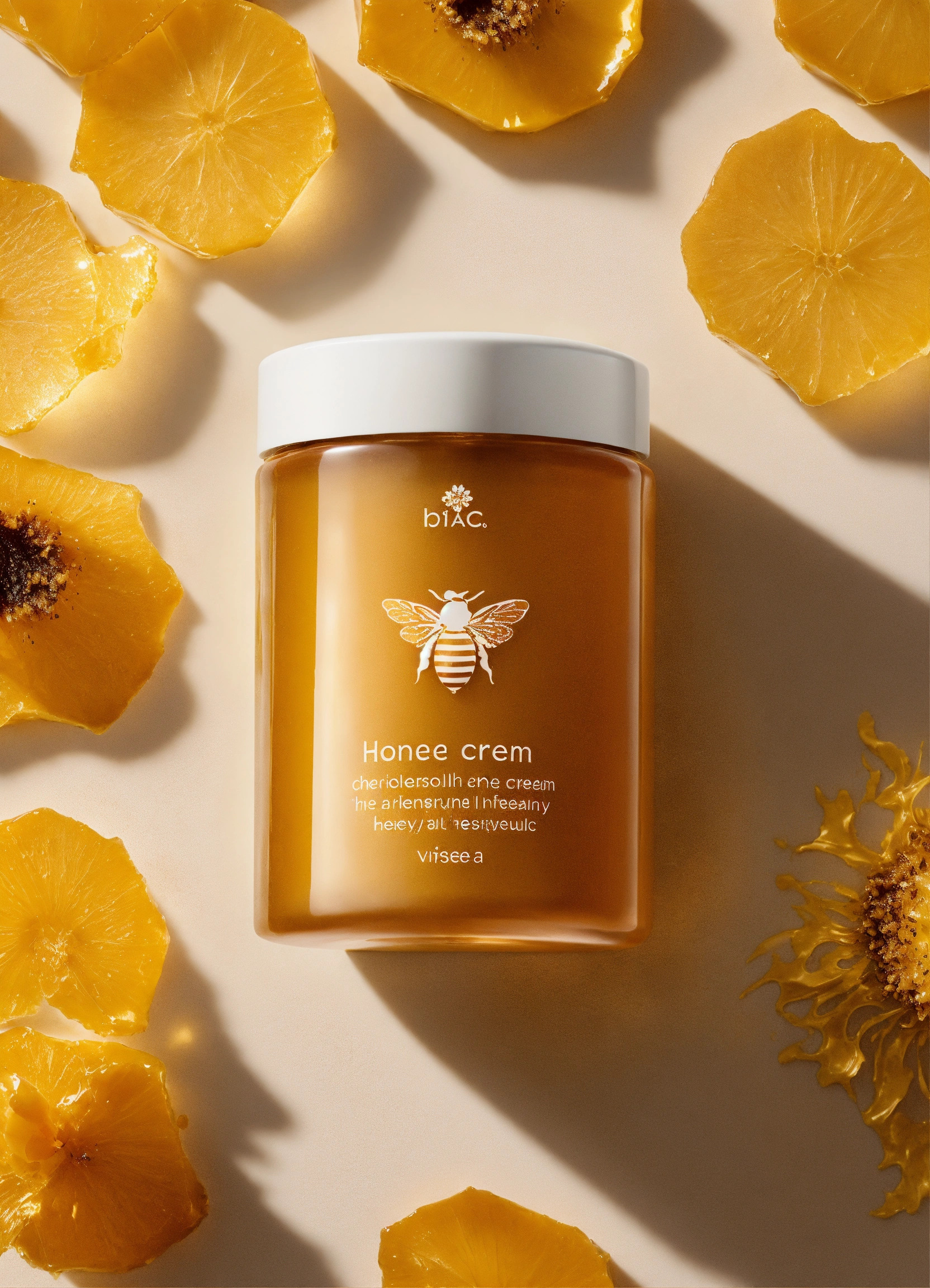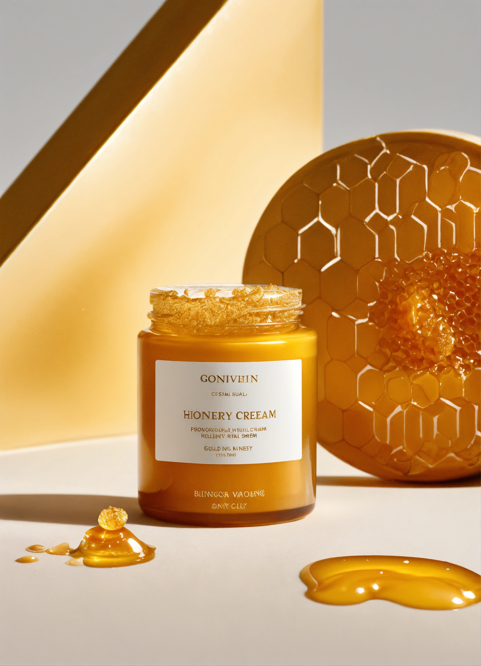 Construct an image that highlights a skincare cream product, positioning it against a stark white backdrop. the product's design and overall aesthetic should deeply resonate with the rich, golden hues and the viscous texture of honey. honey, being symbolic of healing, nourishment, and natural sweetness, should be the pivotal inspiration for this visual.