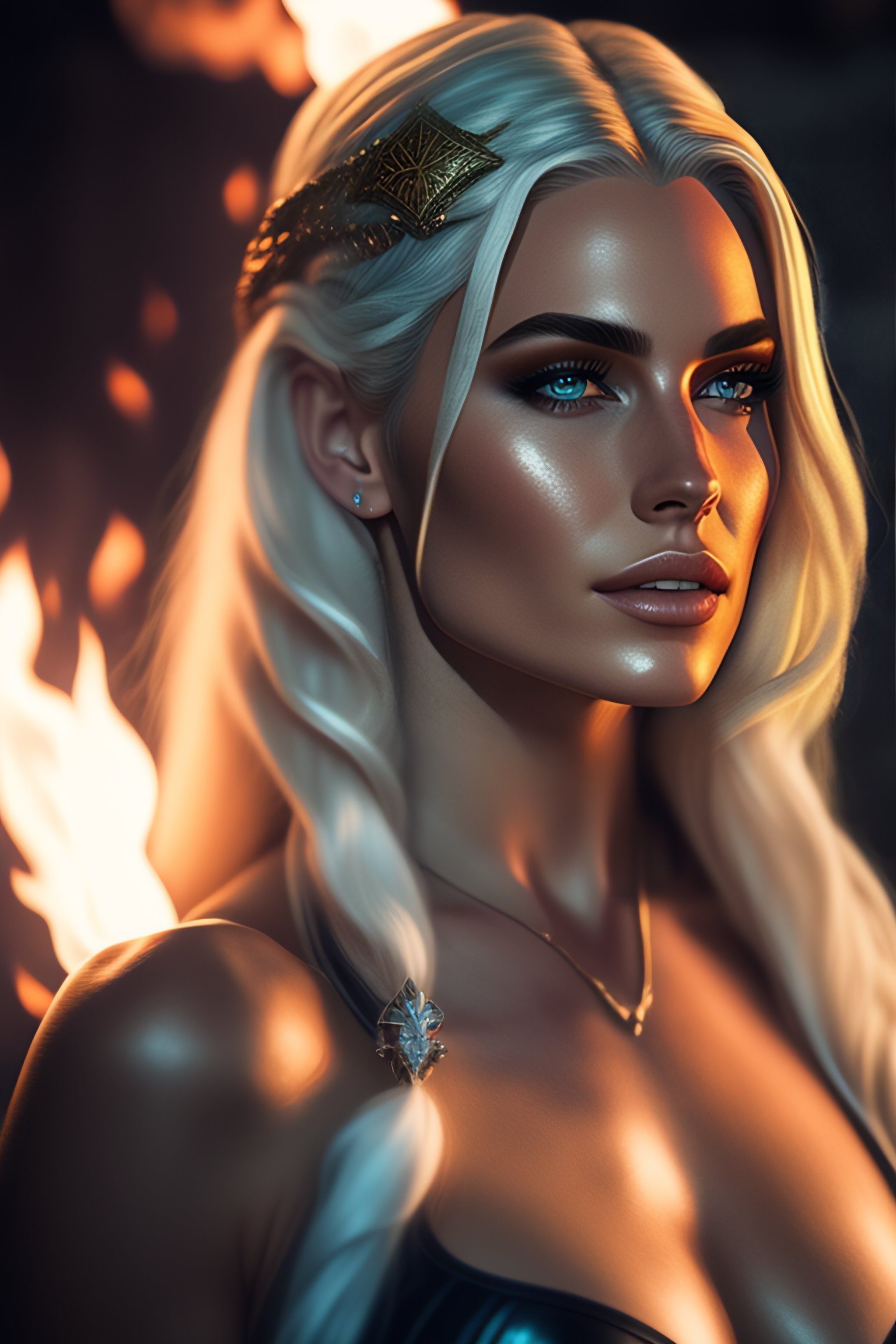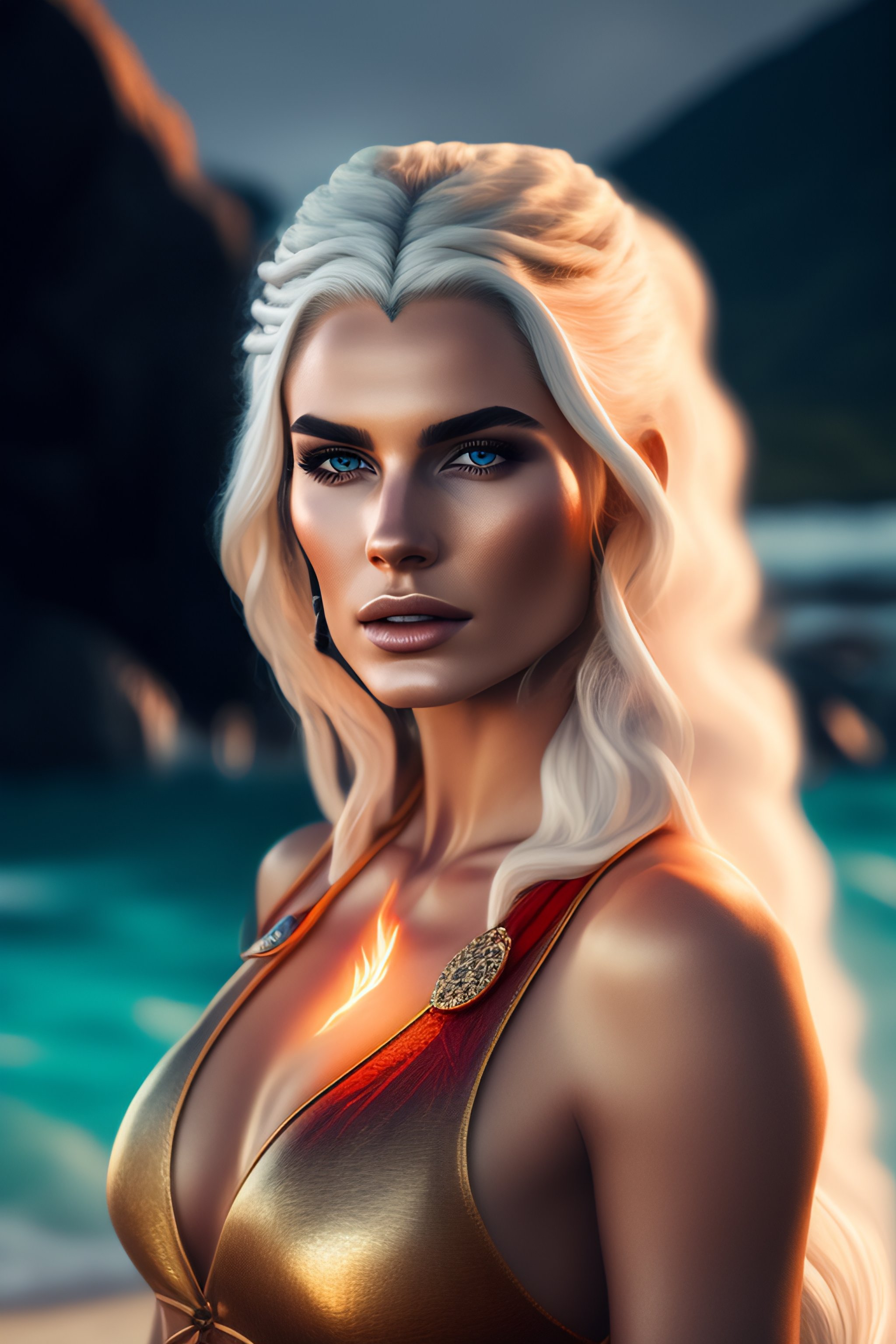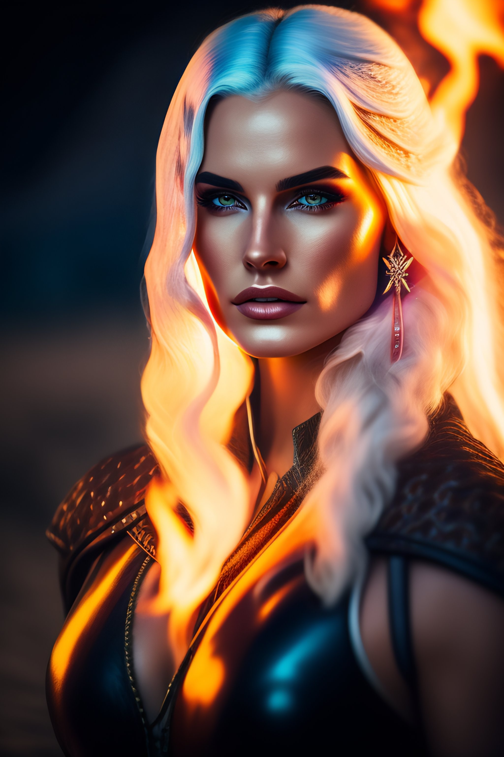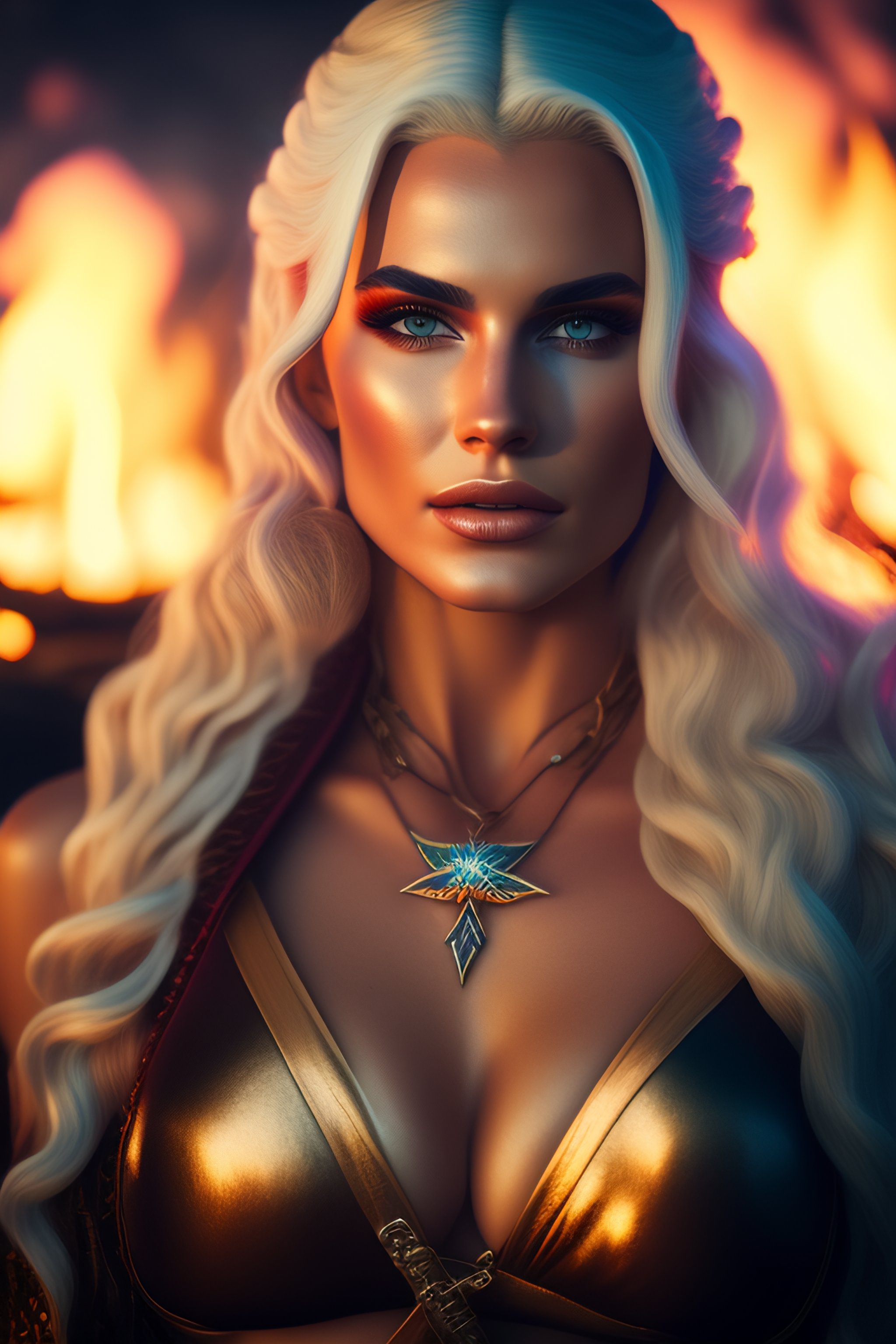 Photo of yennifer from the witcher as blonde, magic, in swimsuit bikini, fire, war, horse, jewels, lightning, leather, braids, canon 35mm, photorealistic, cinematic, 8k, 4k