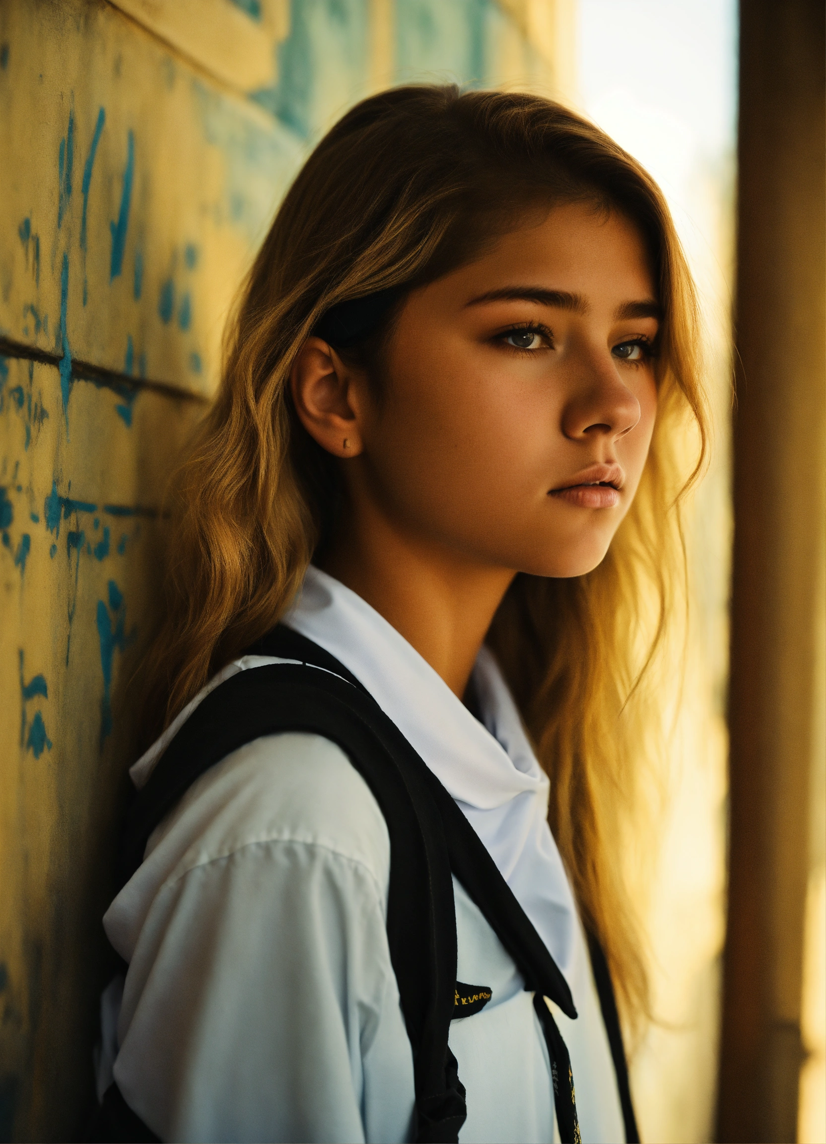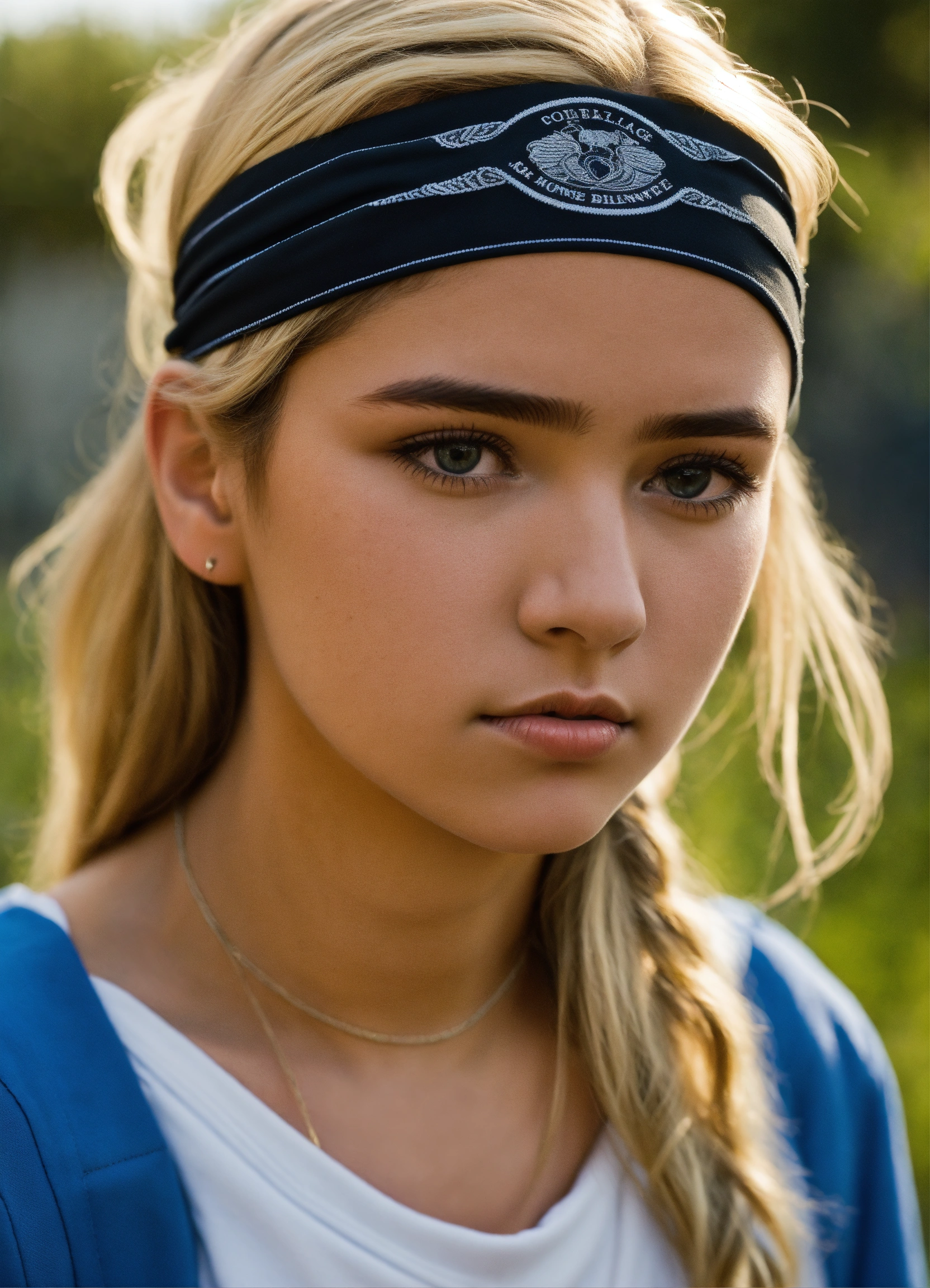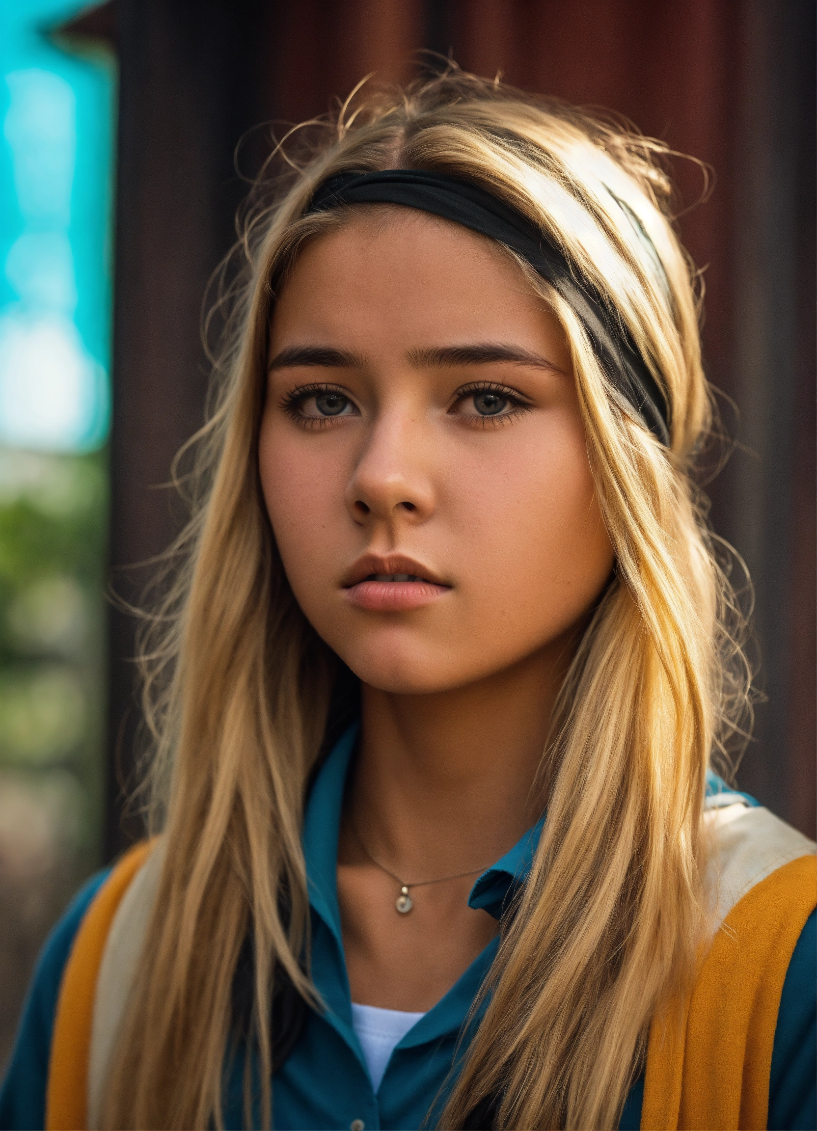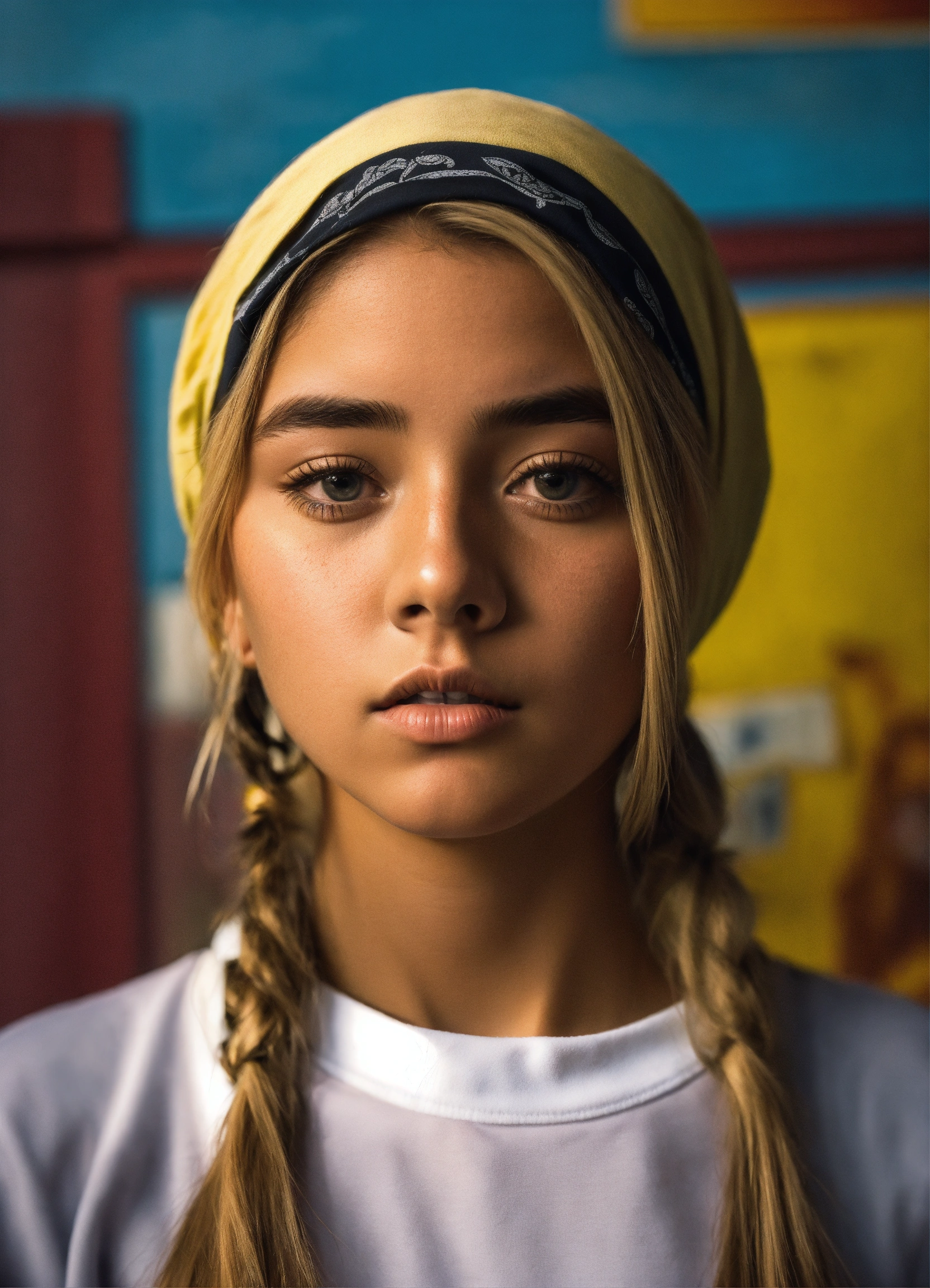 14 yo girl blonde latina, black bandana on head, hopeless, fear, distant view, cinematographic, school uniform, looking front