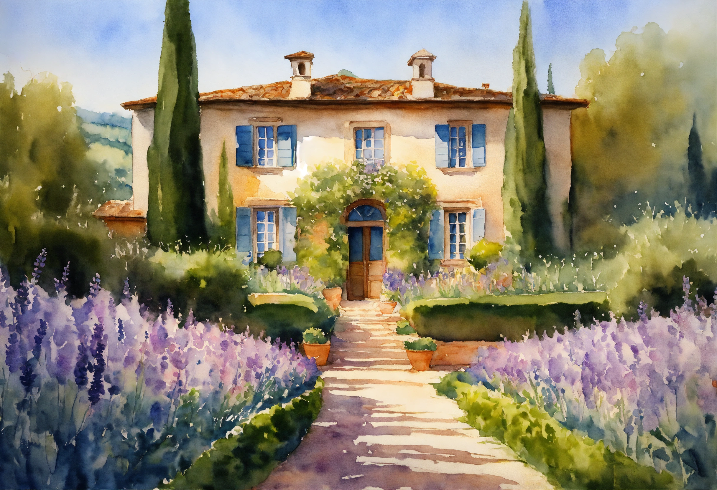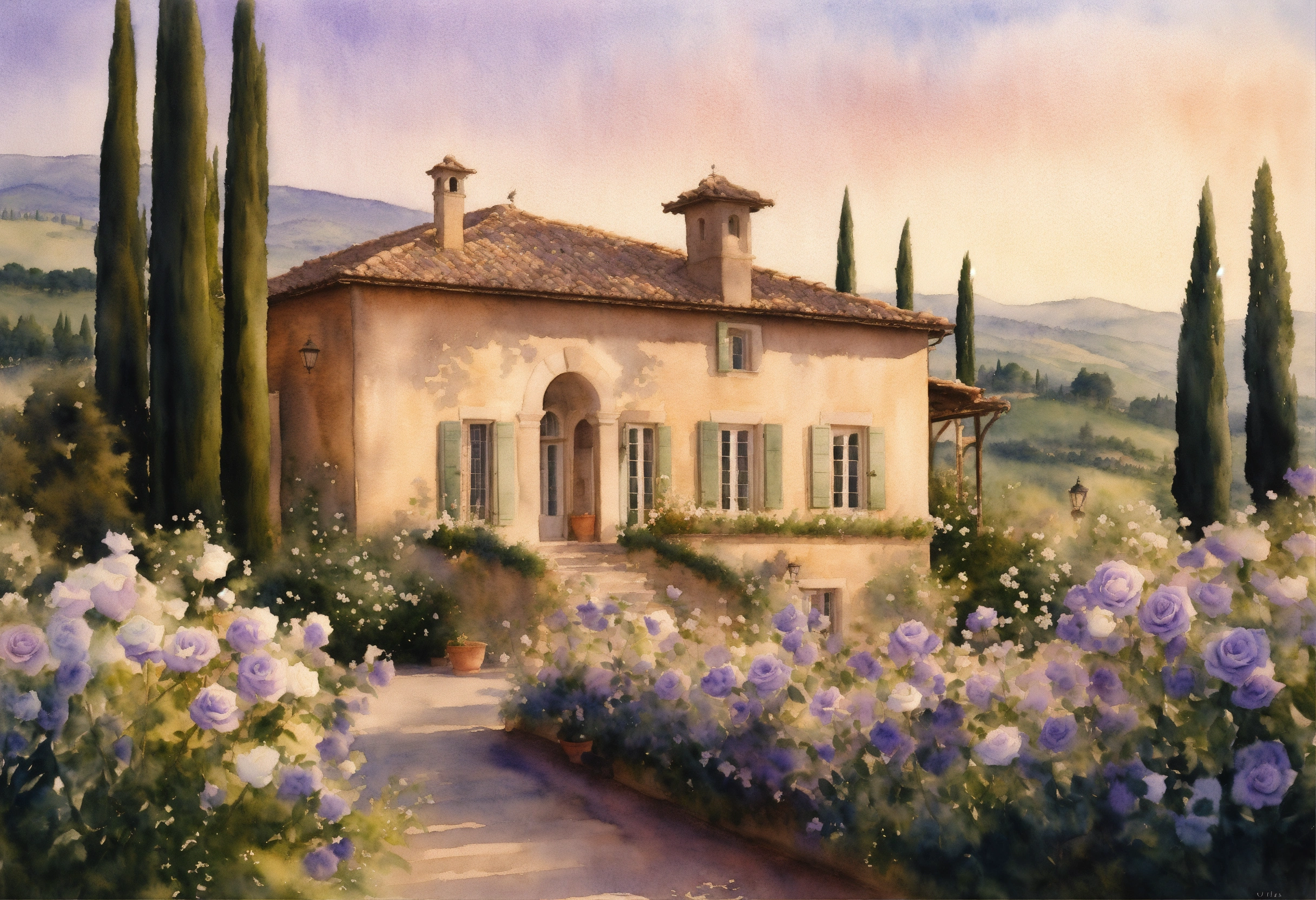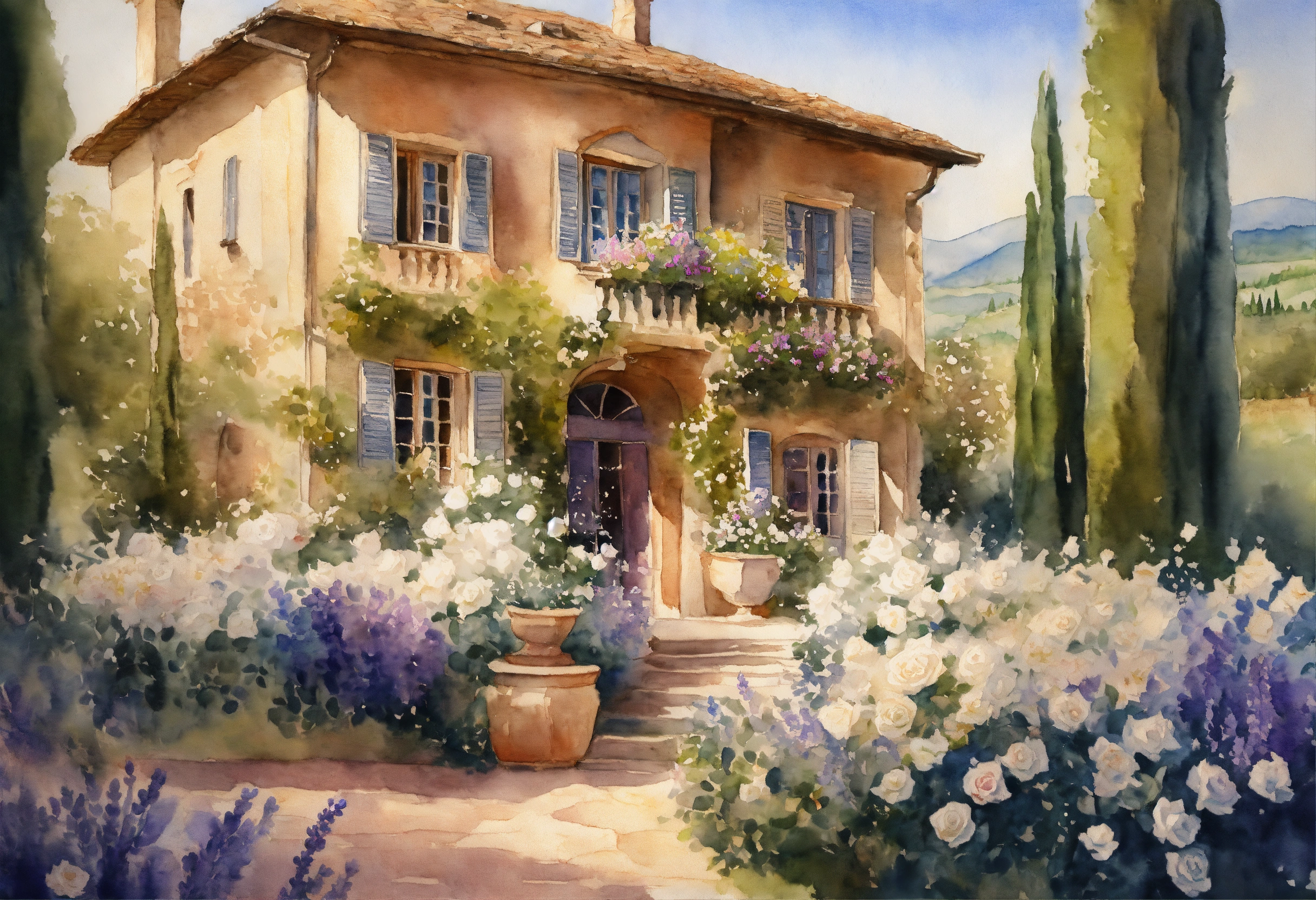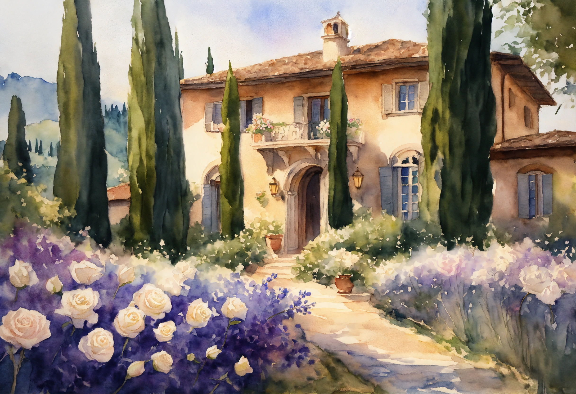 Watercolour painting, pastel colours, warm light, intricate and detailed, tuscany, beautiful garden, beautiful villa, white roses, lavender, 8k, ultra-detailed, sharp focus