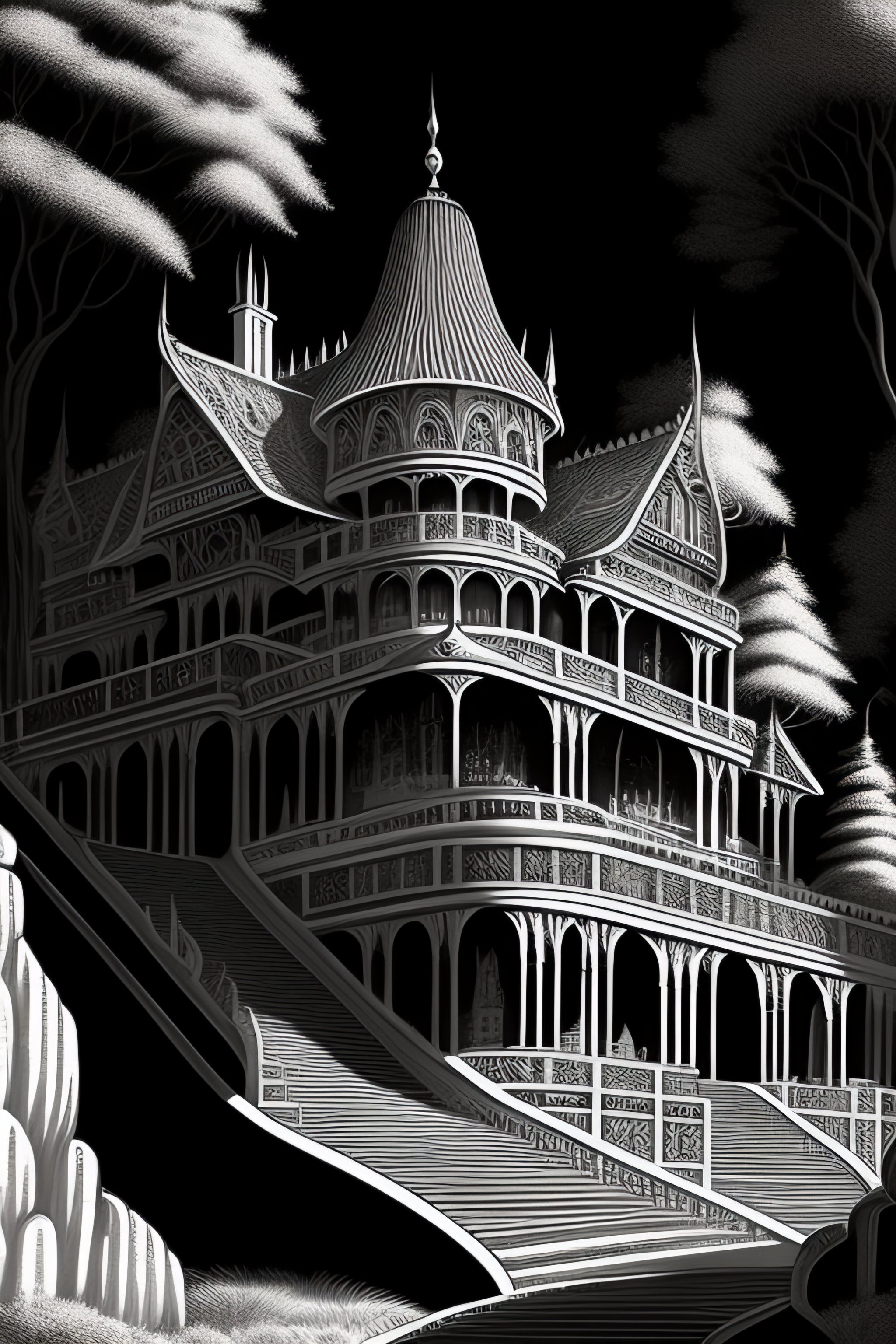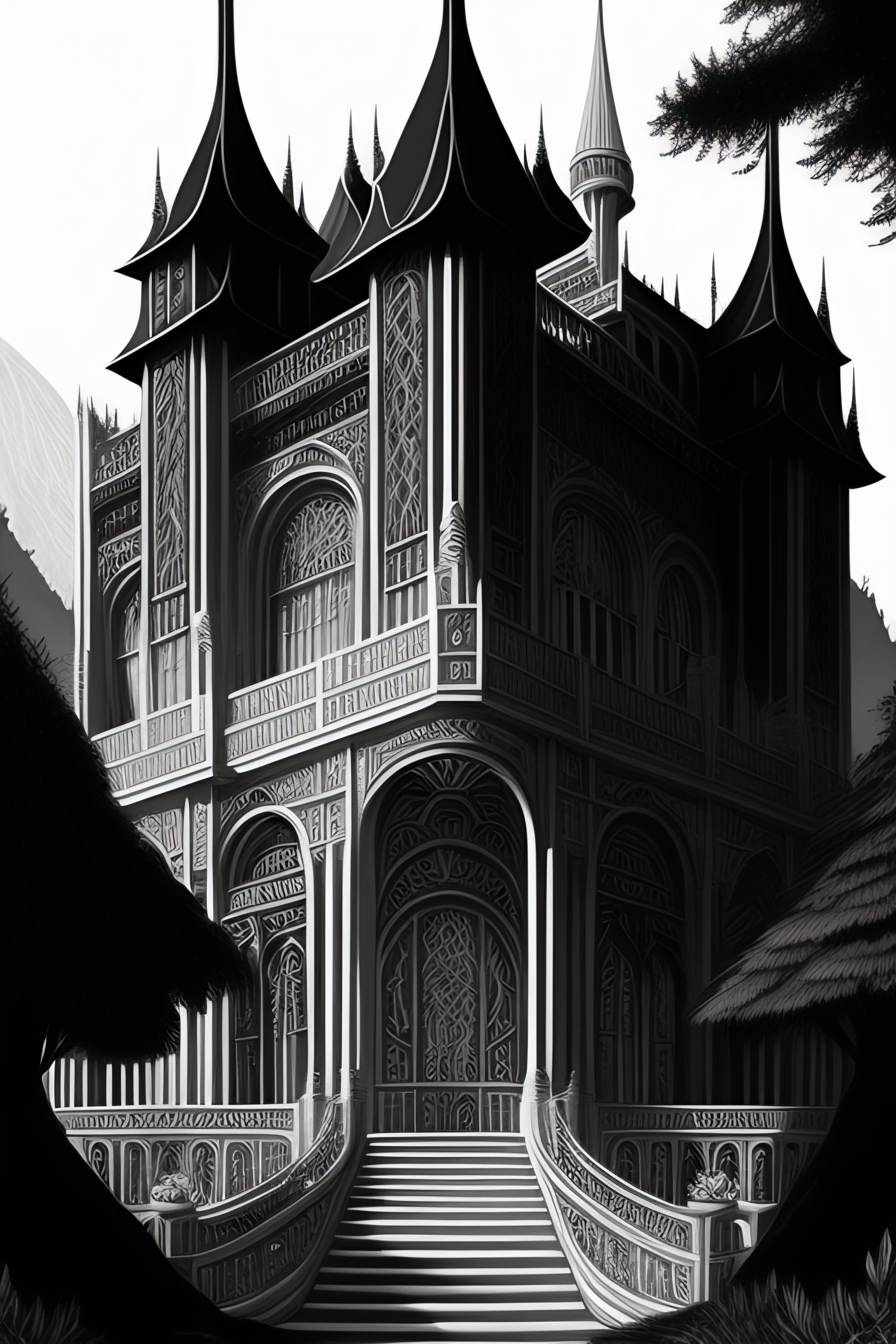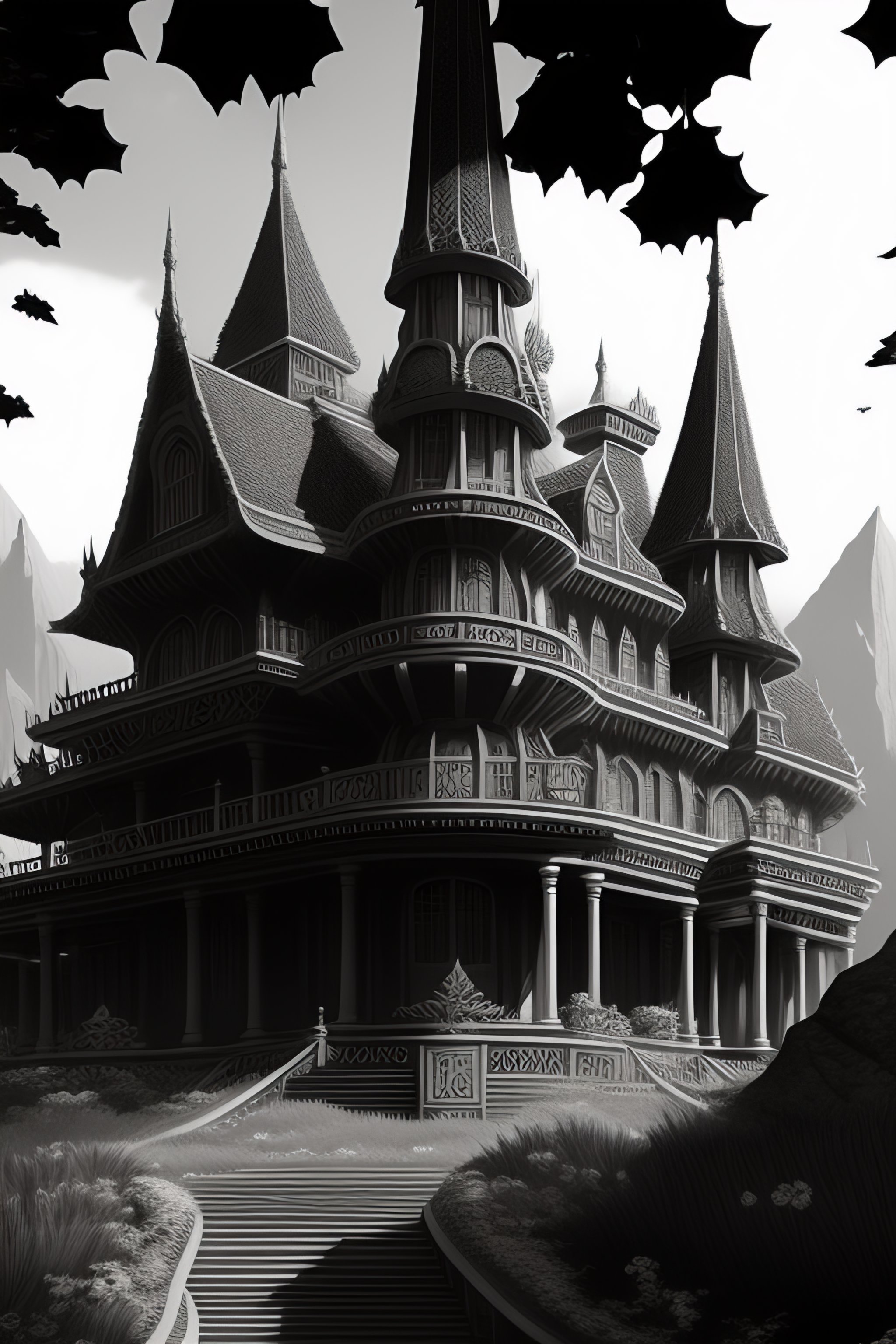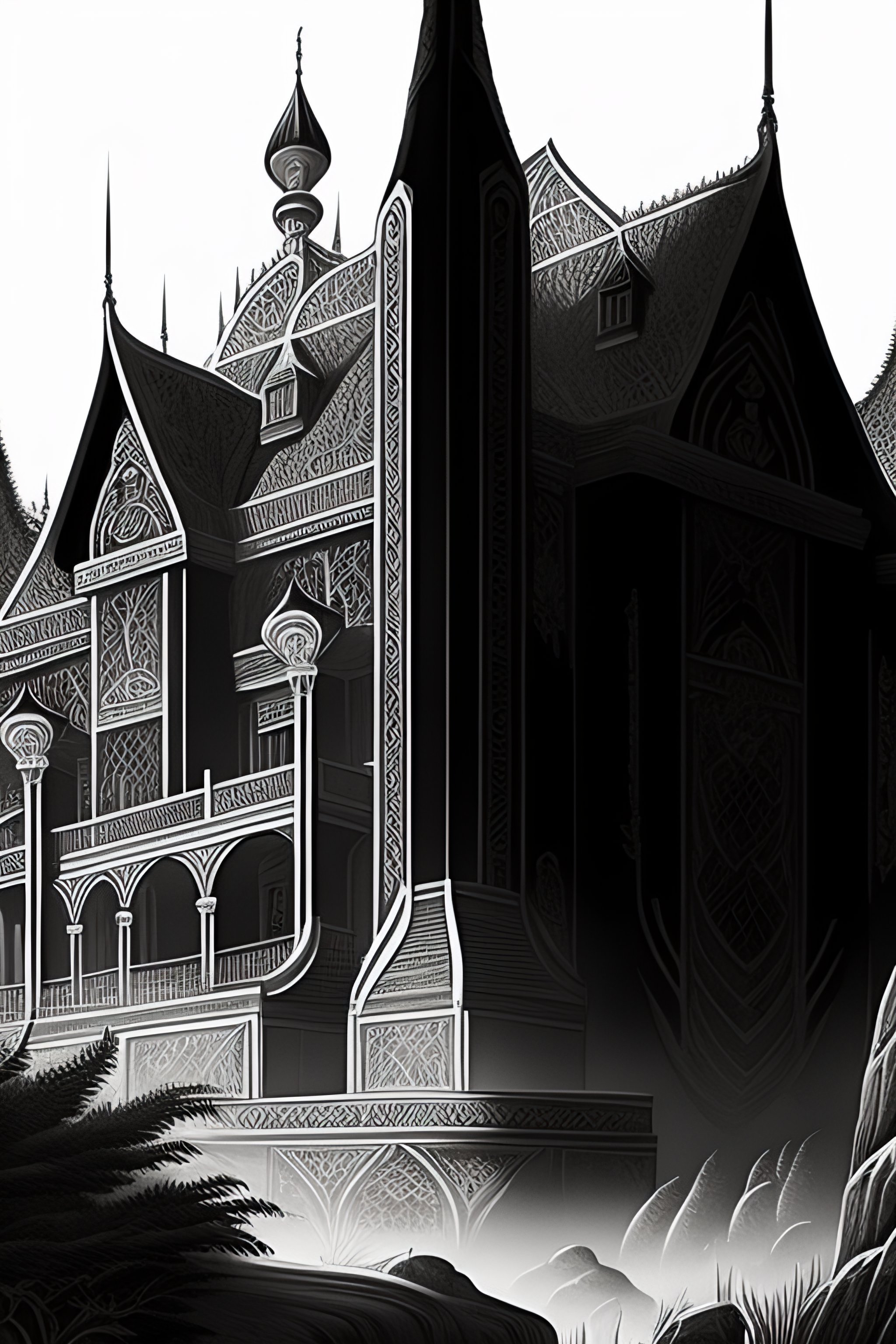 Black and white art deco style ink drawing of detailed the huge haunted house on the edge of a hill, highly detailed, fantasy art, in the style of greg rutkowski, epic, fantasy, intricate, hyper detailed, artstation, concept art, smooth, sharp focus, ray tracing