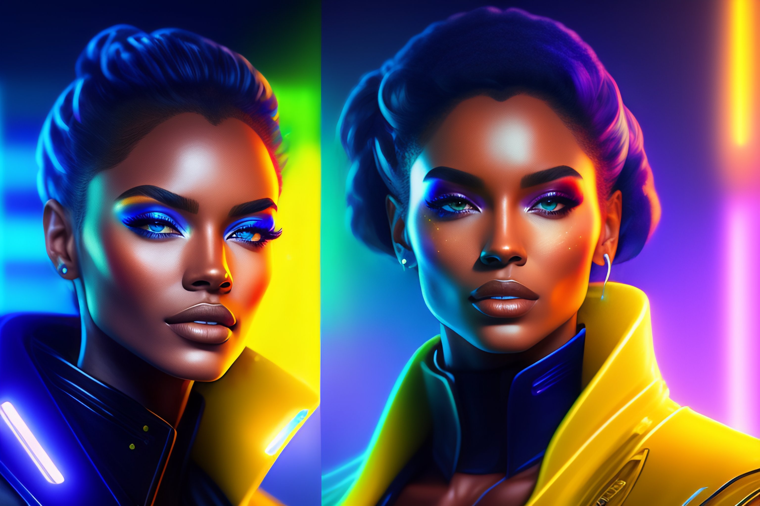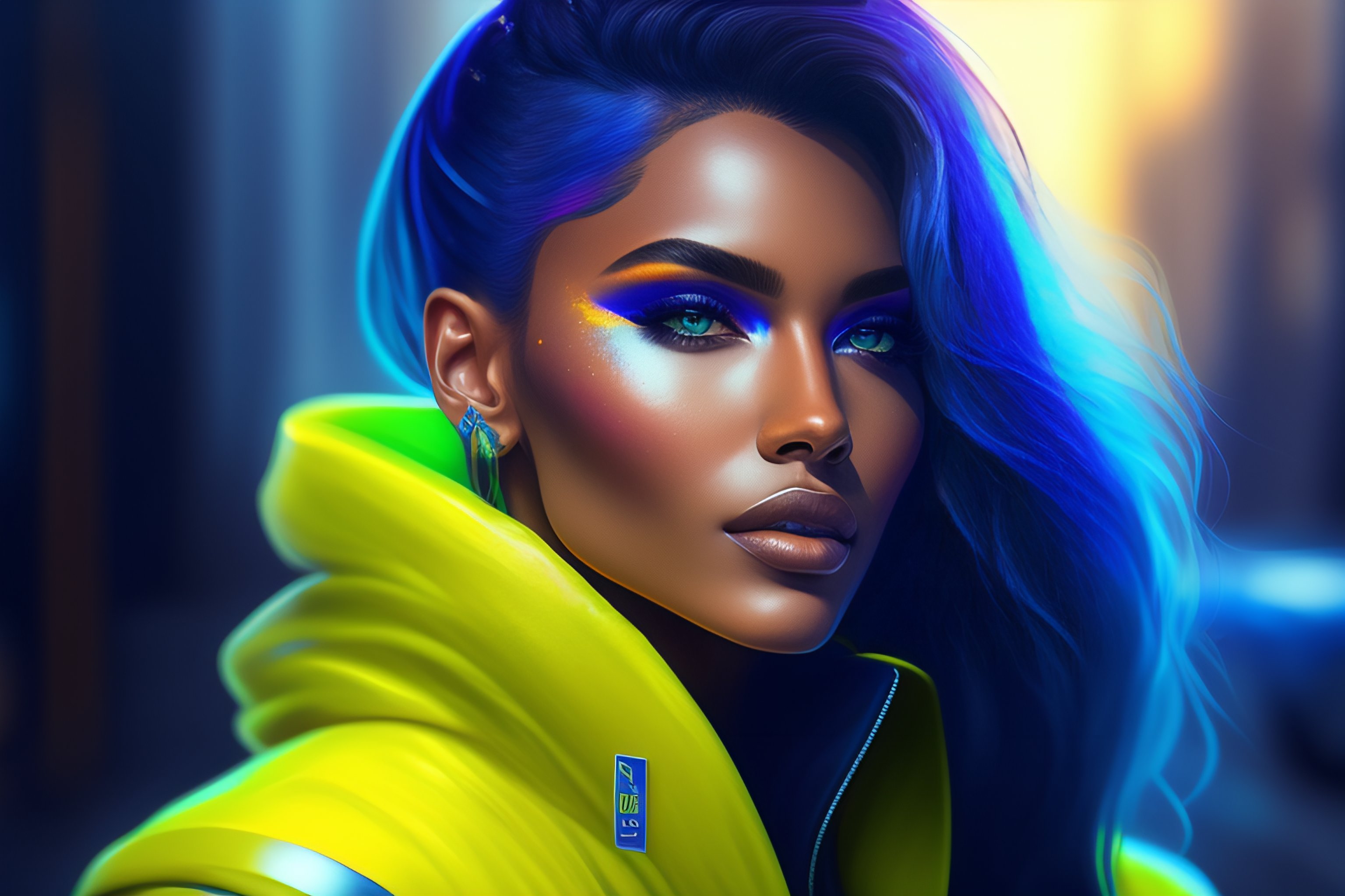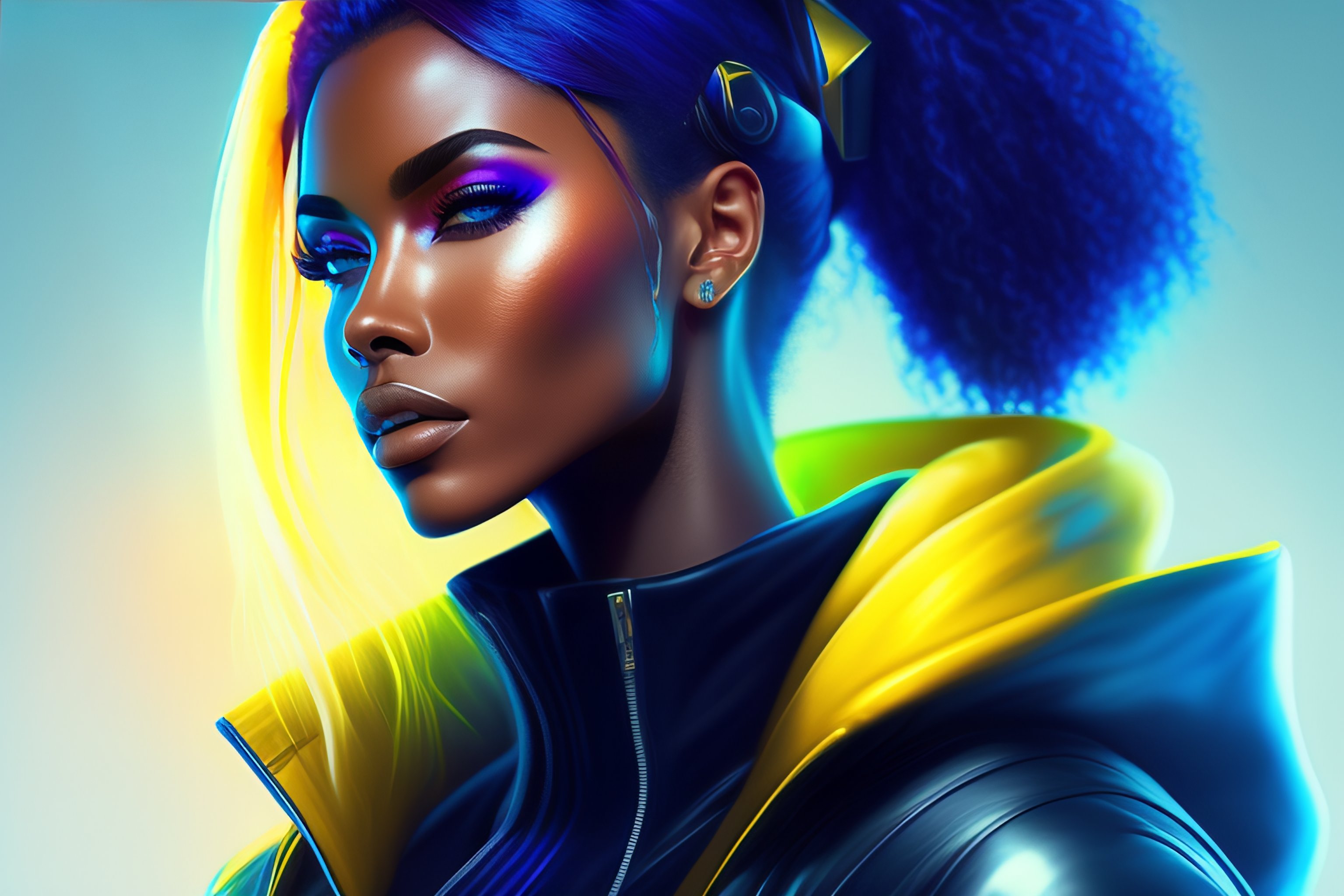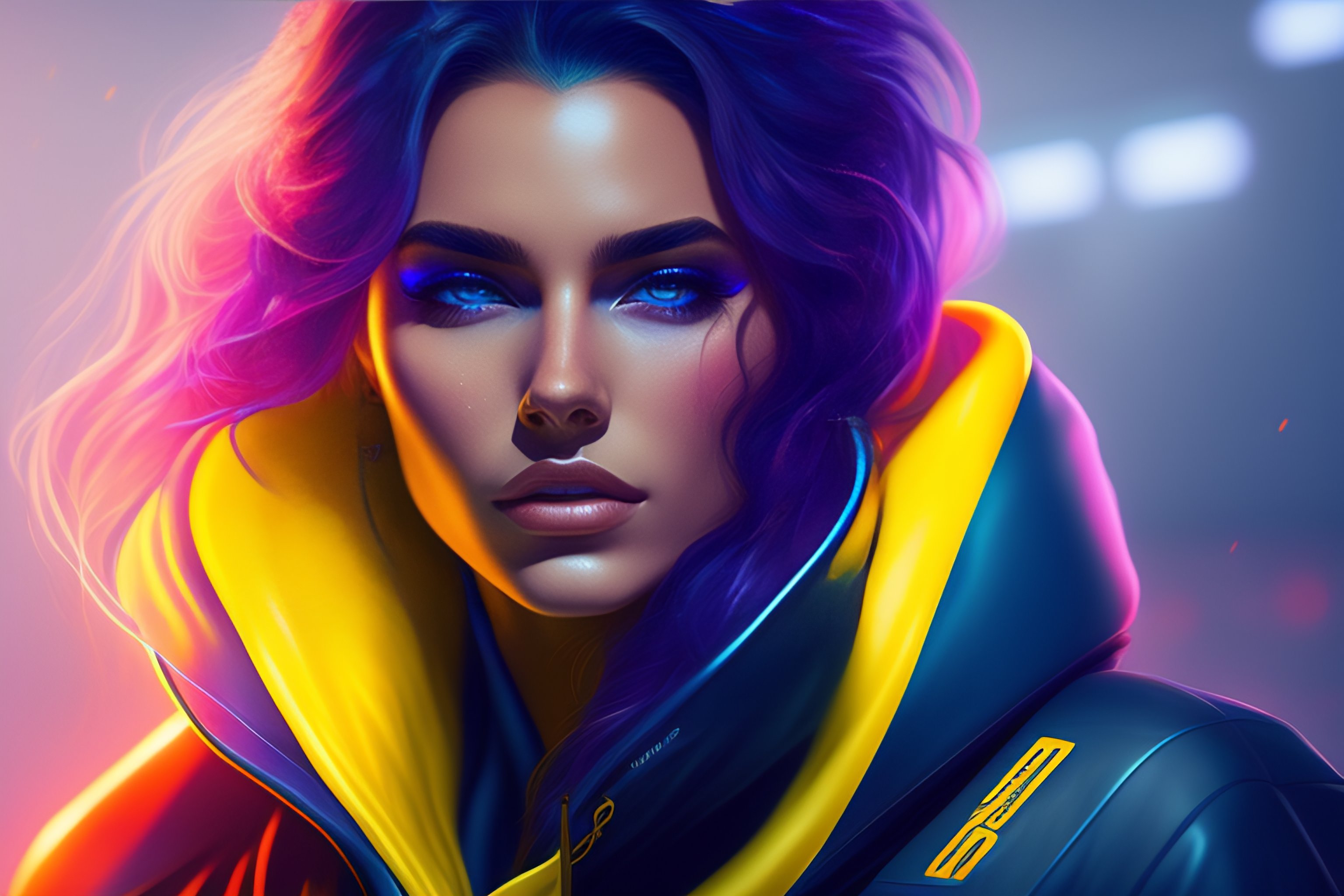 Full body protrait, concept art of neon from valorant, digital art, detailed, realistic, beautiful, blue and yellow