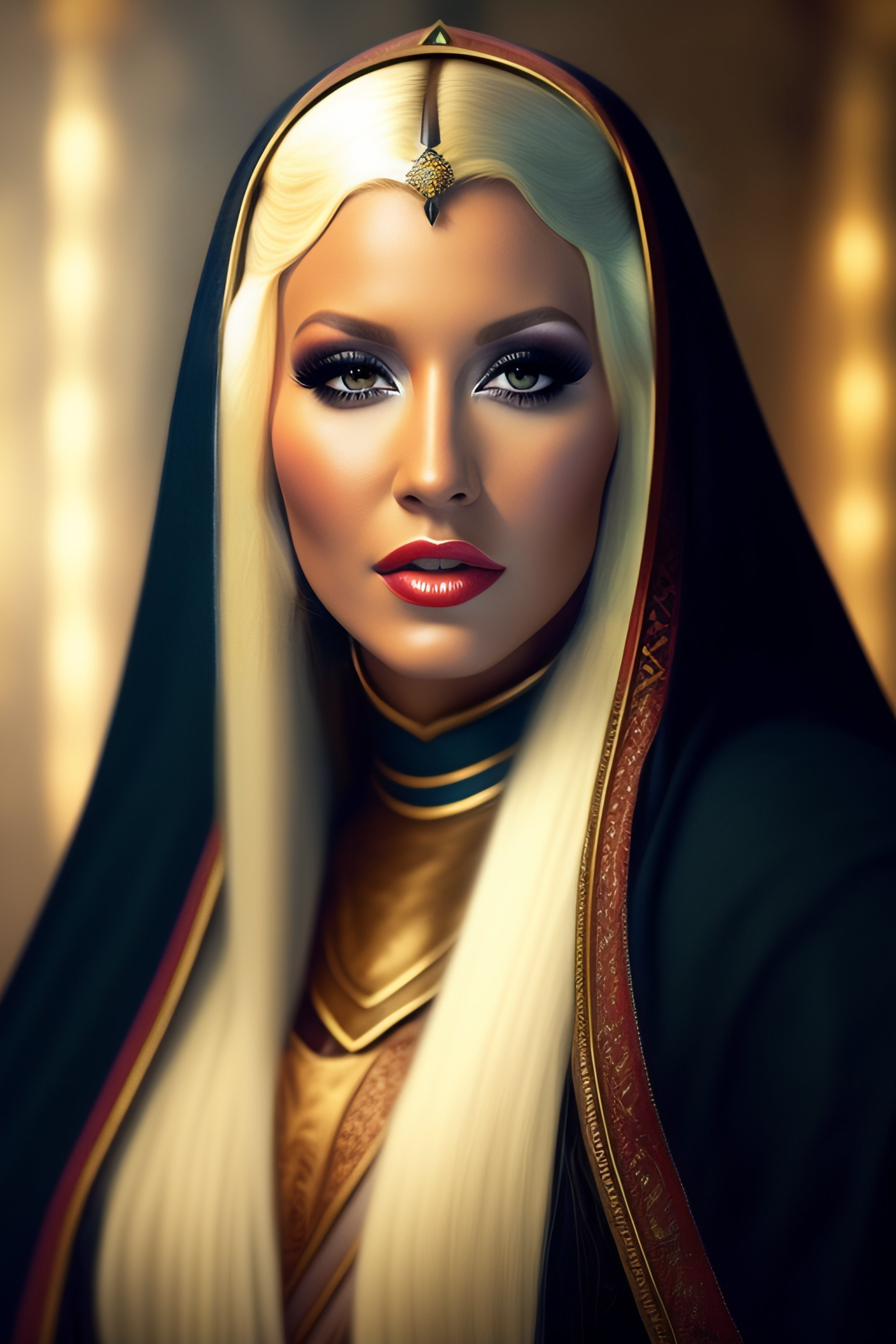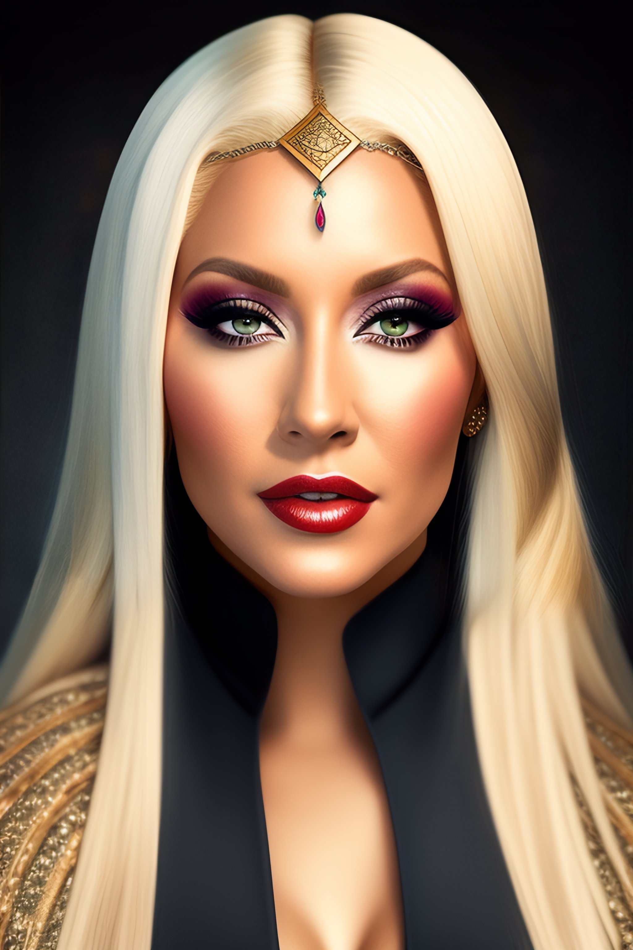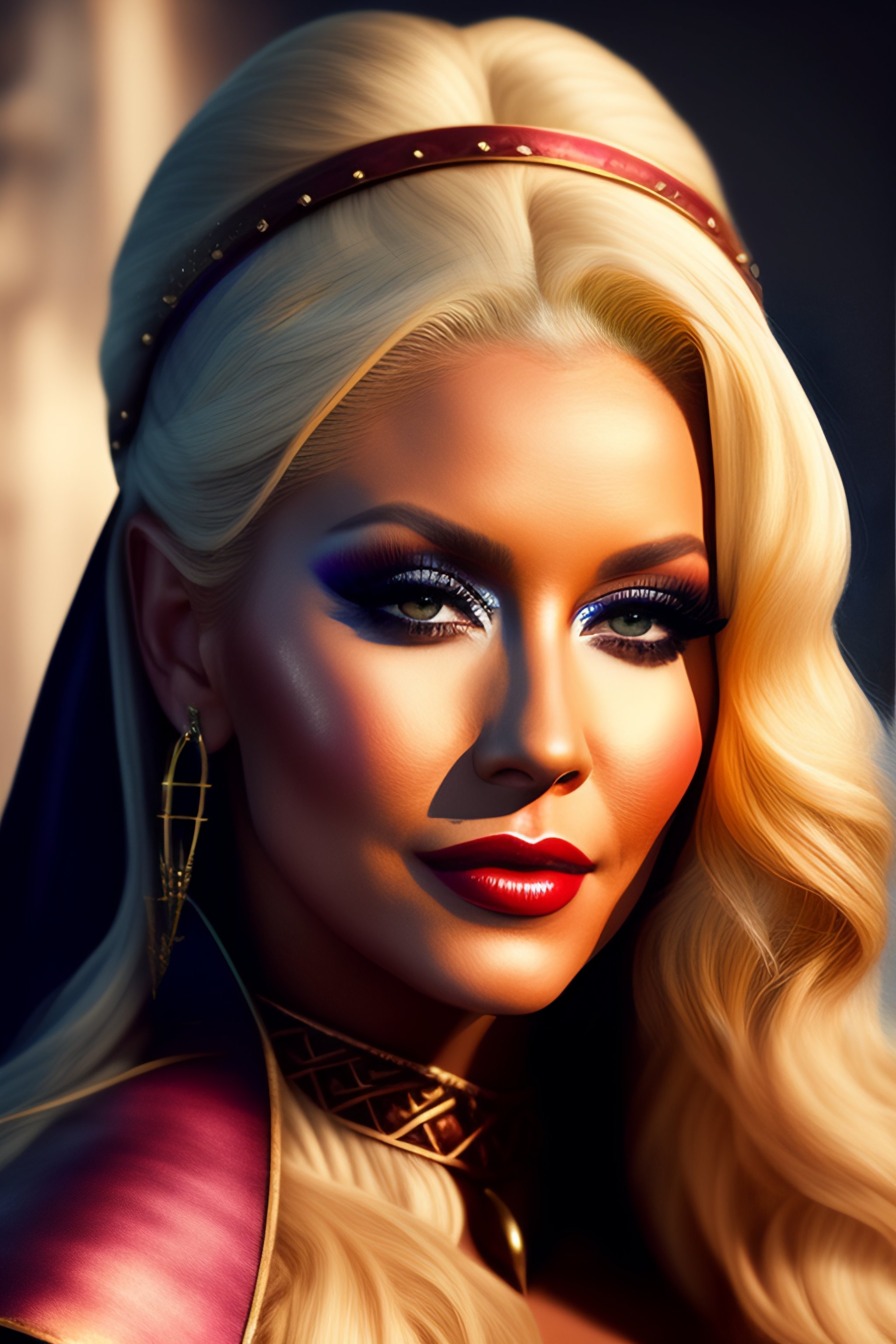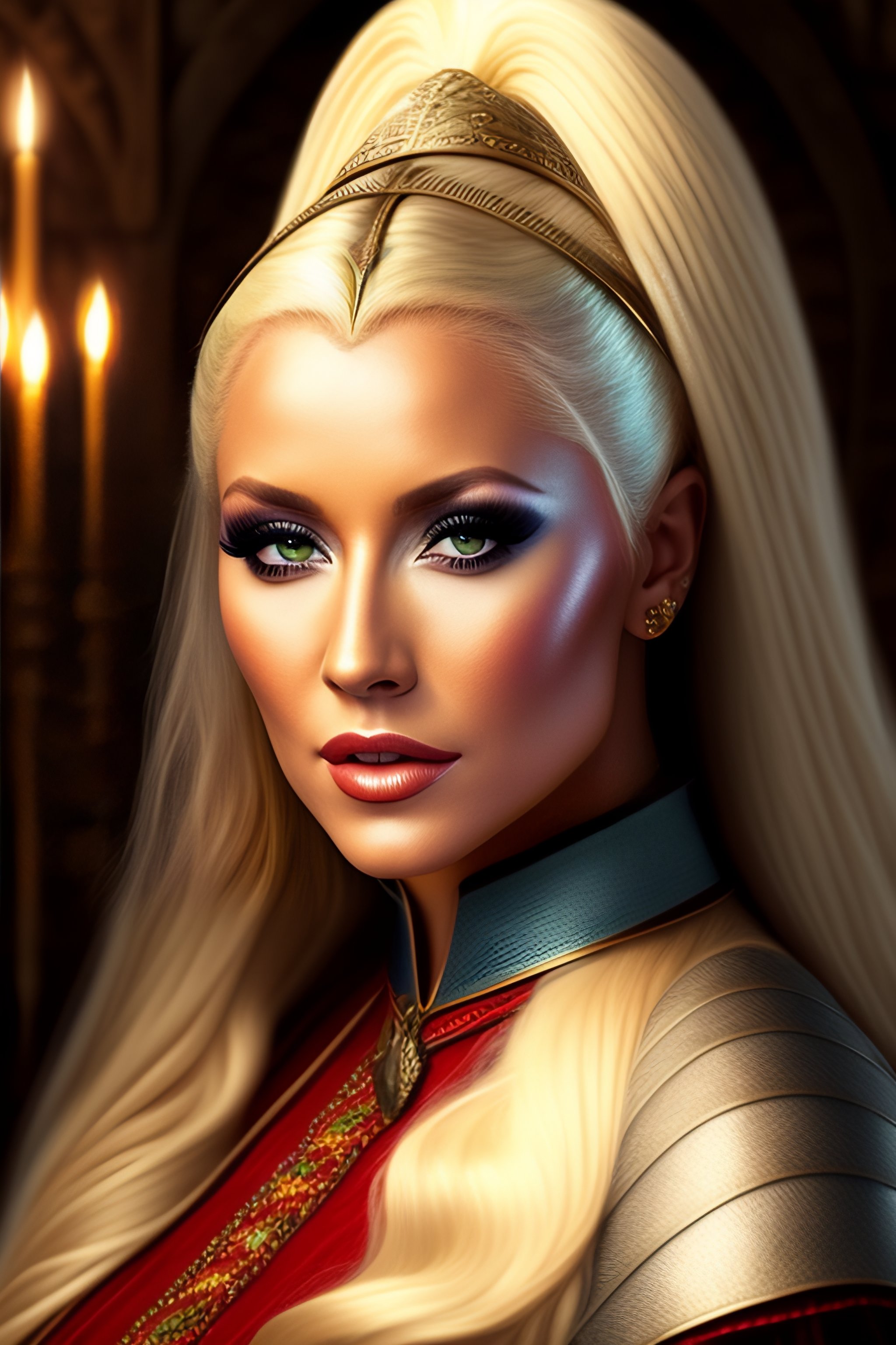 Christina aguilera with pointed ears and slanted eyes in medieval clothing