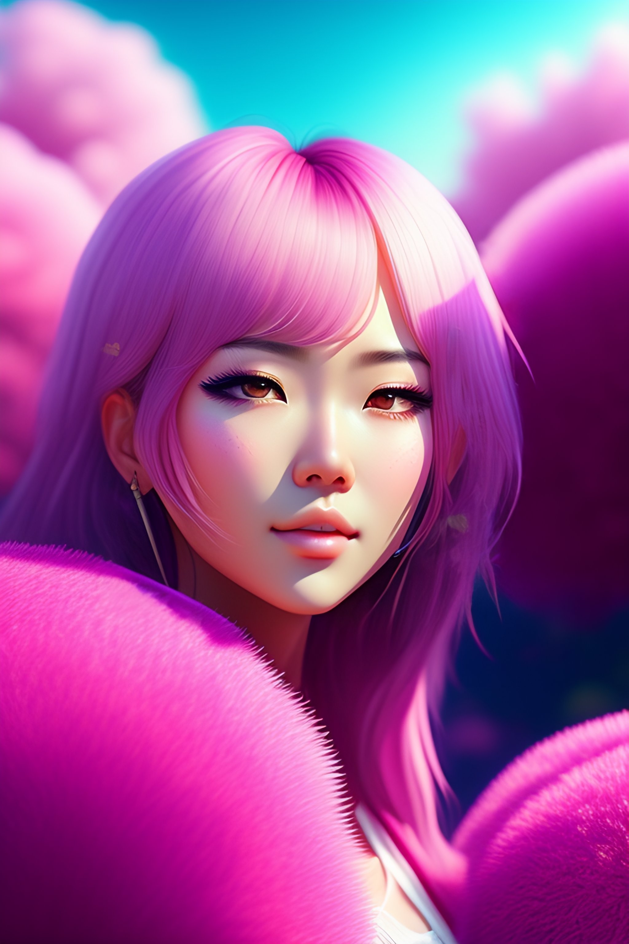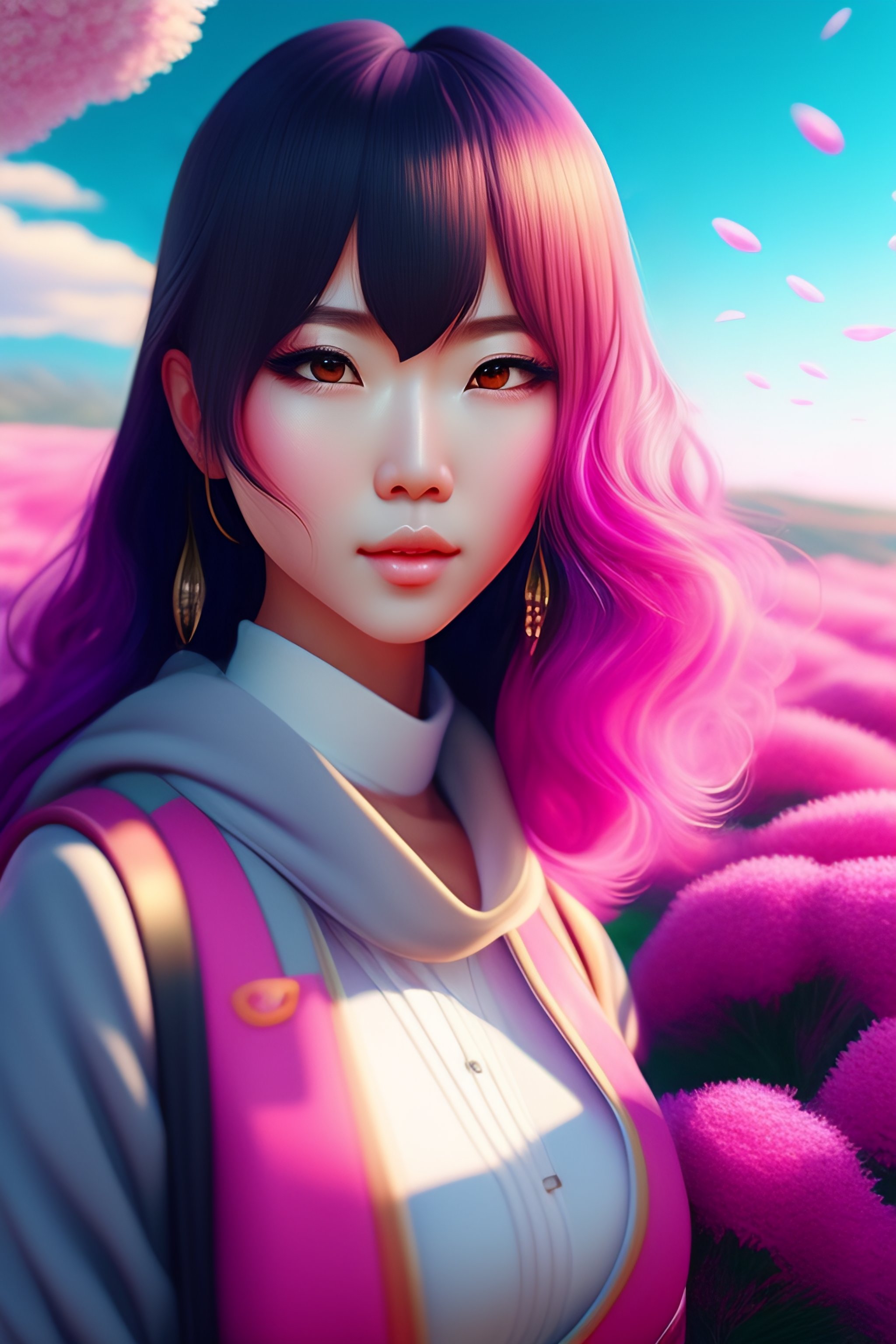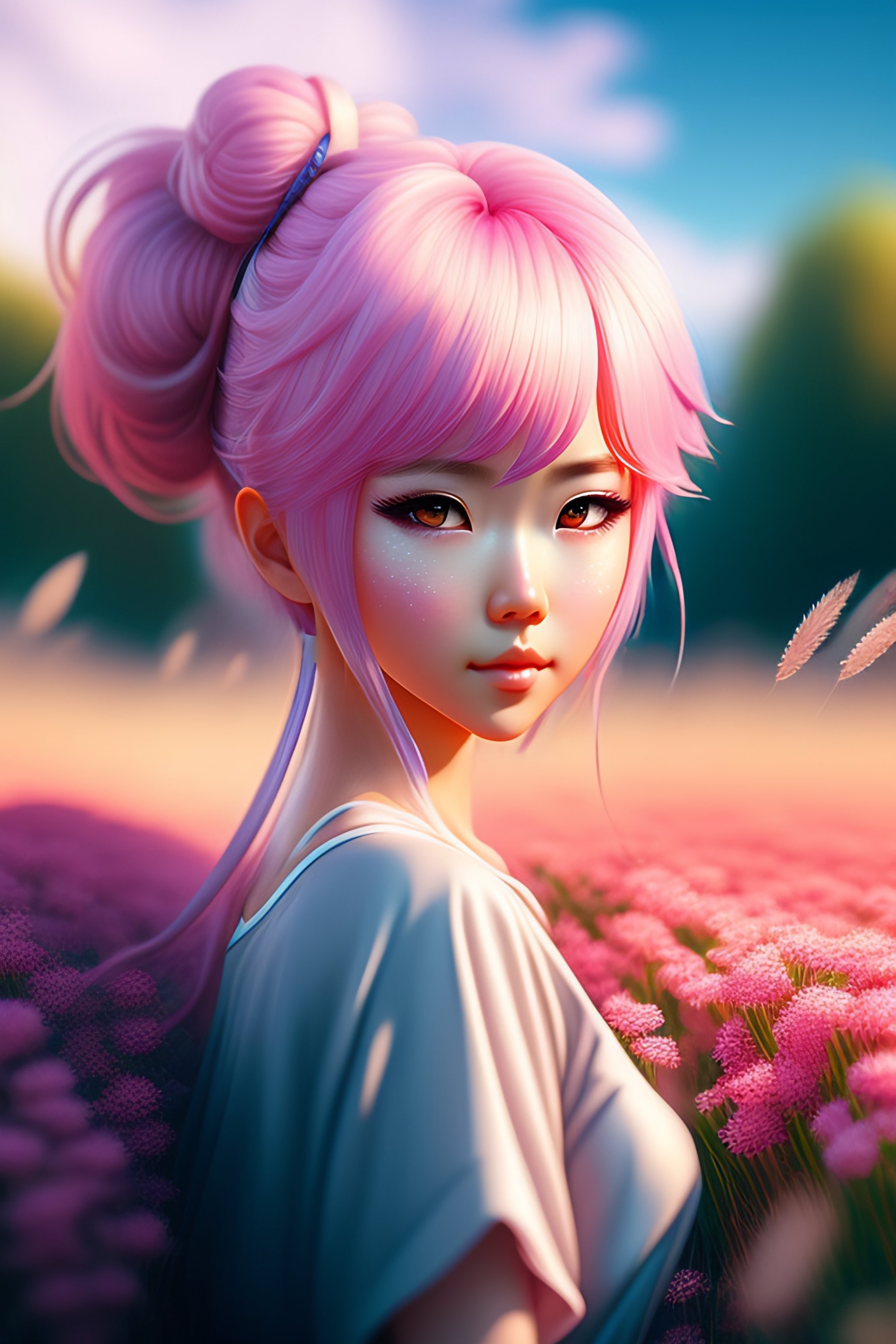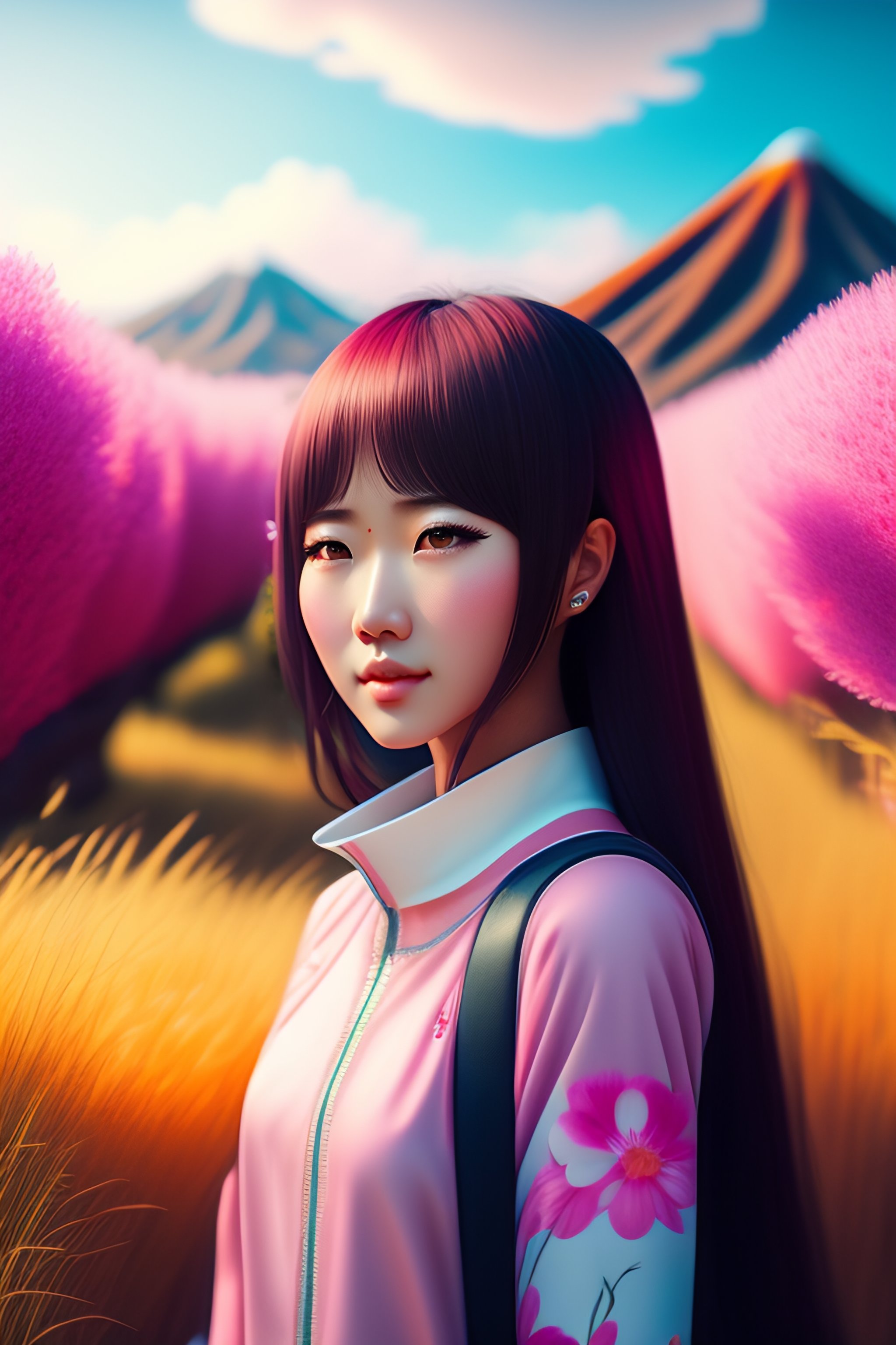 Japanese pink landscape, cute anime character in the grass, colorful, realistic face, detailed face, detailed eyes, ultra detailed digital art, hyper real, detailed, ultra detailed, ground up angle, wide angle, american shot
