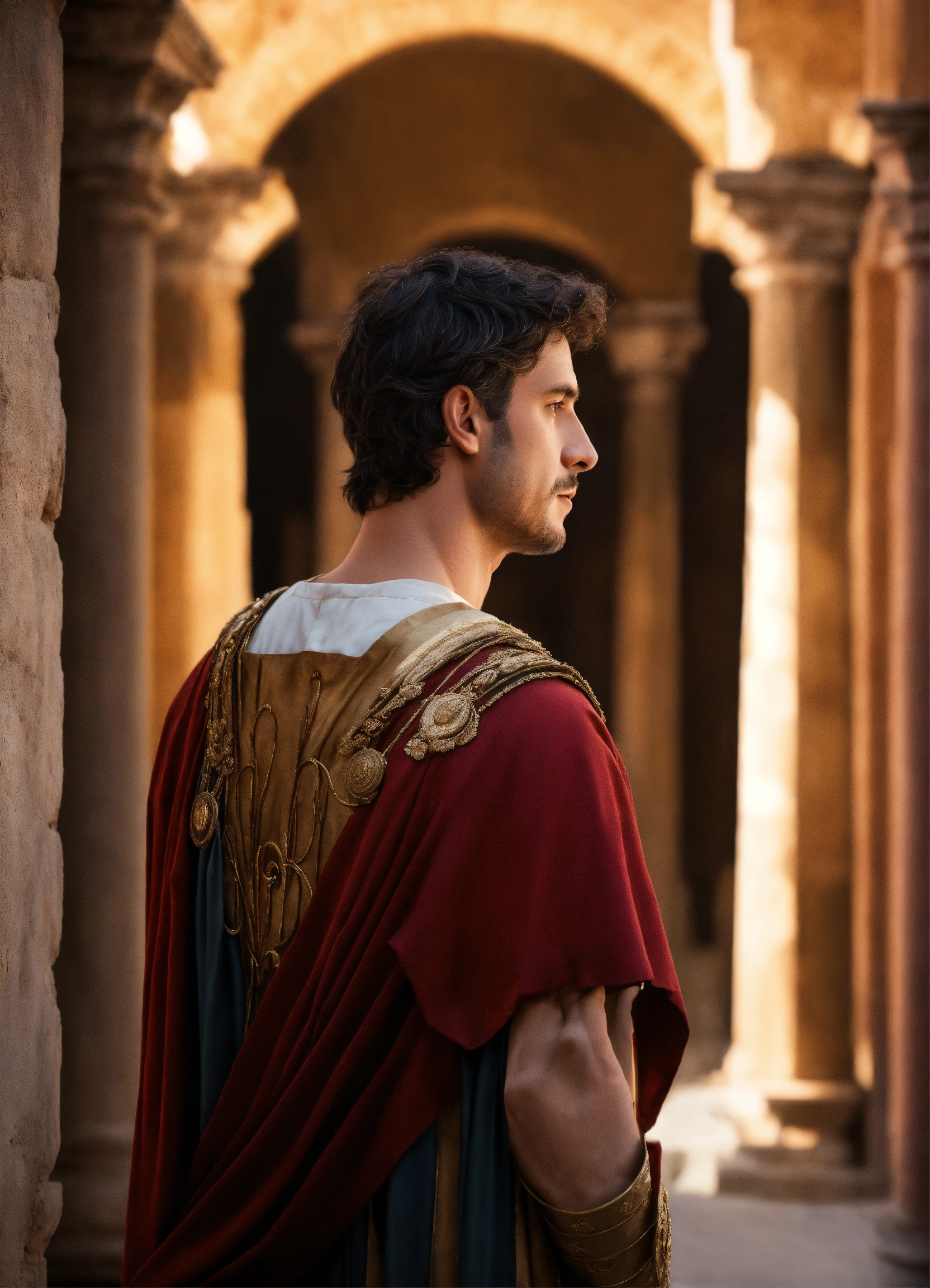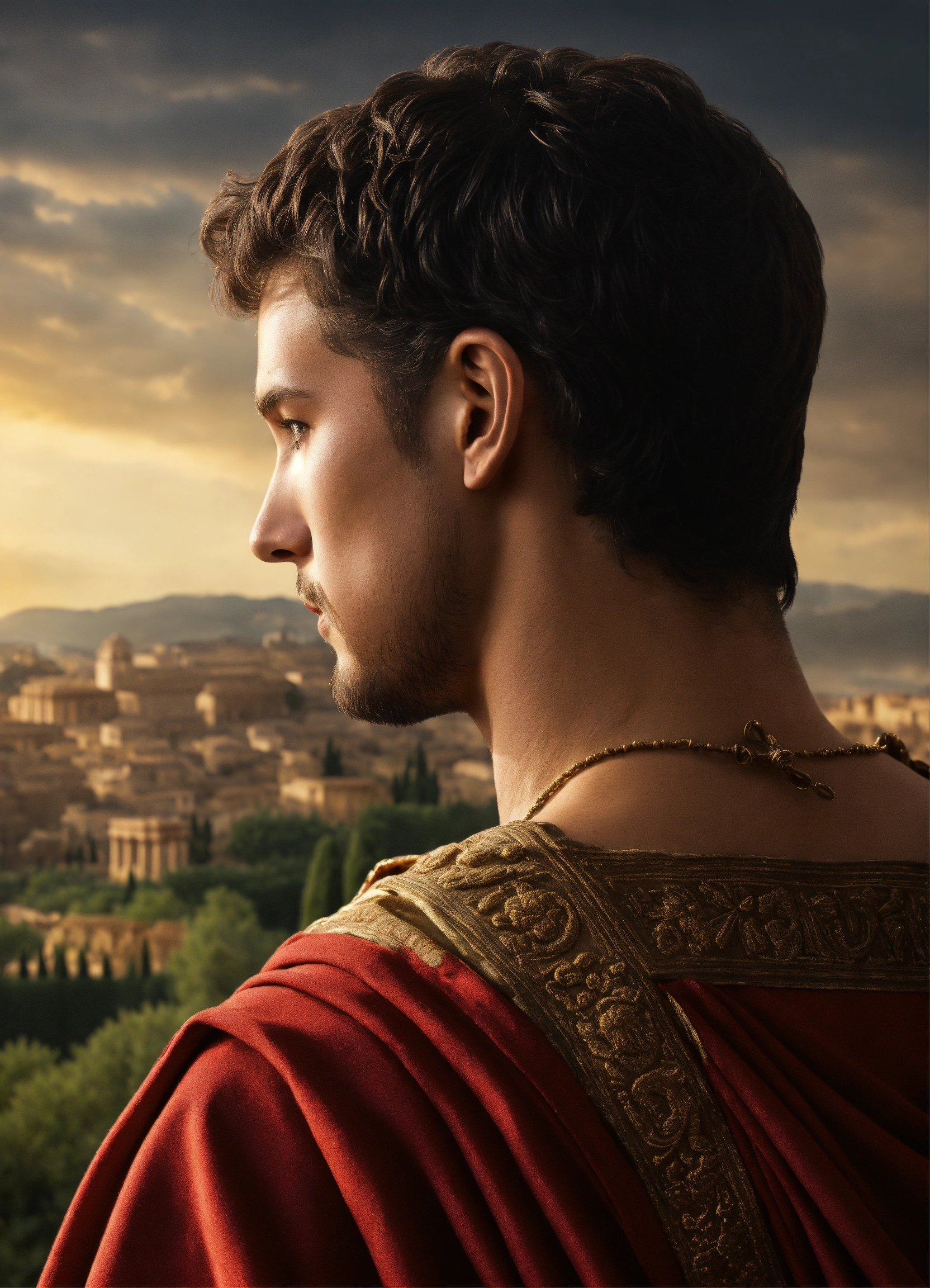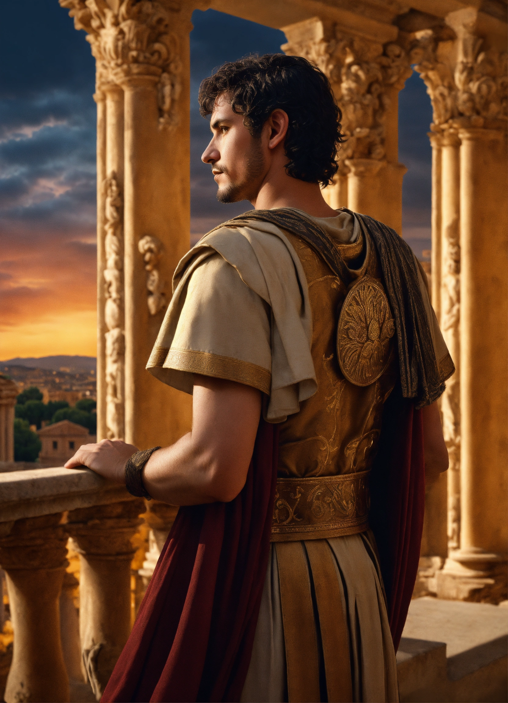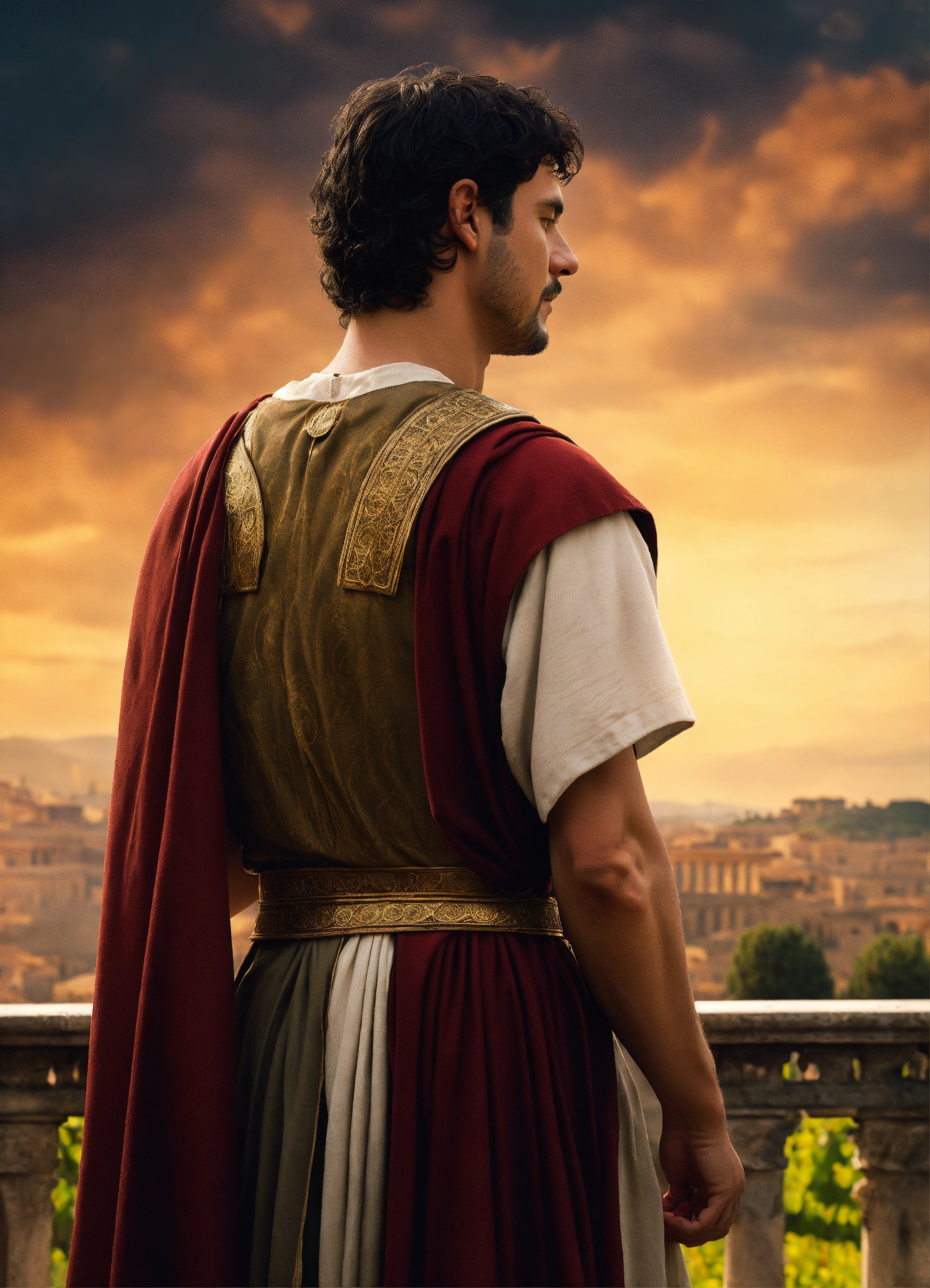 Close-up back view of a young, tall, noble, thin, slender, handsome, short hair, dark-haired roman tribune wearing simple historical roman clothes, light-colored light tunic, solemn, 50 years old, historically accurate, ancient rome, he is looking to the landscape of vineyards from the balcony of his rich and colored roman villa, detailed decor, photo realistic, hyper detailed, it is night. photo realistic, hyper detailed, and historically accurate to ancient rome. the sky is dark and cloudy. noble, calm, hedonist, amused. book cover.