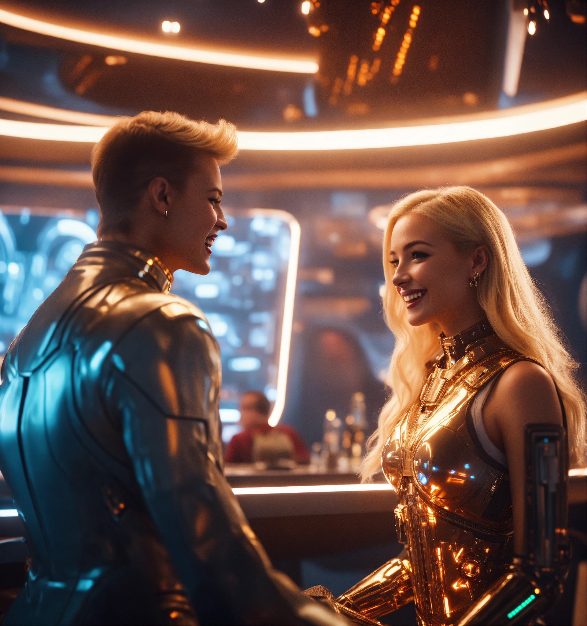 Zoom out from an alluring young blonde babe wearing a fancy 38d space clothes and expensive jewelry in a futuristic space bar hotel laughing with a man, realistic, futuristic, sci-fi, 8k, unreal engine