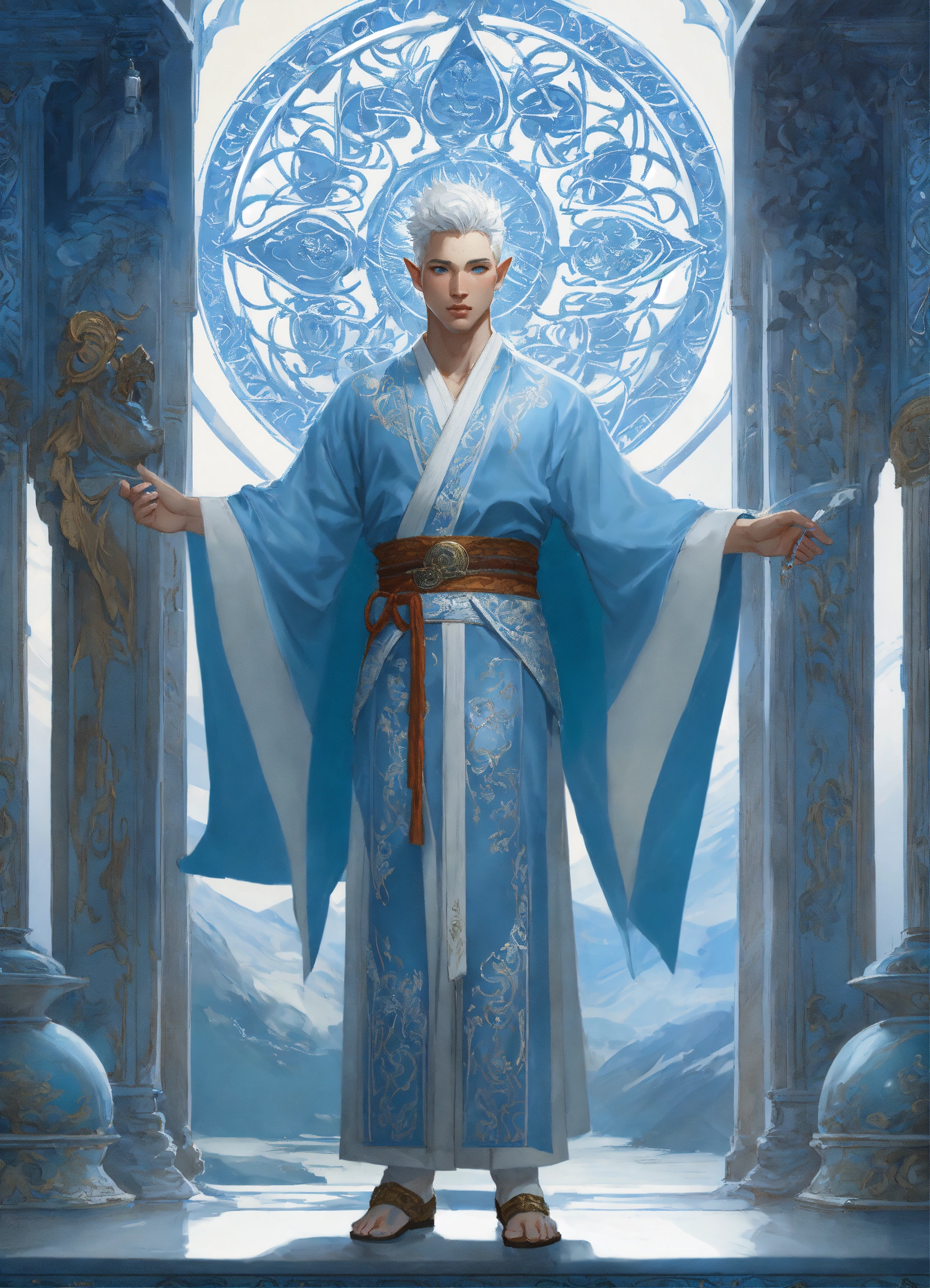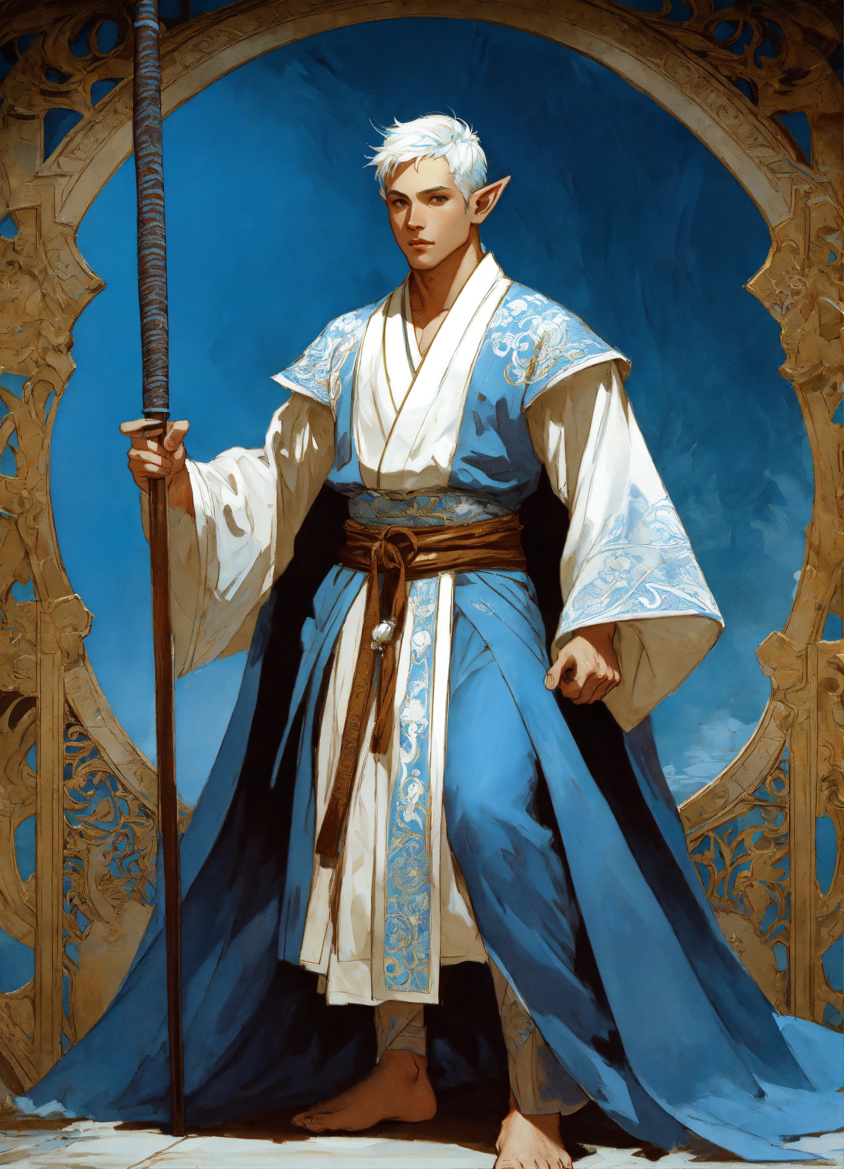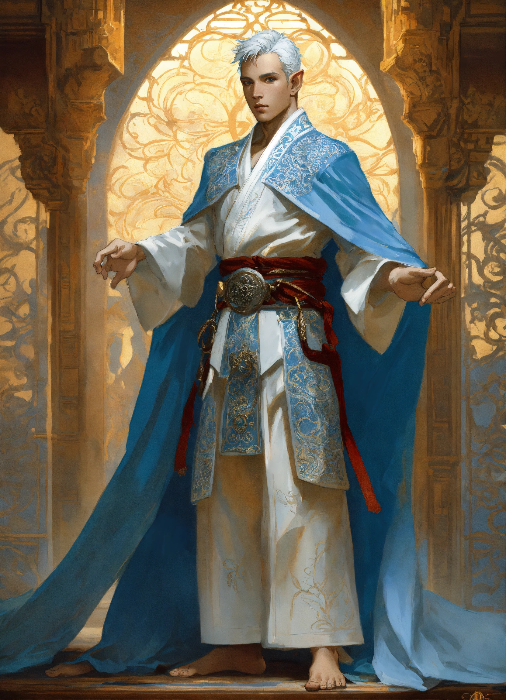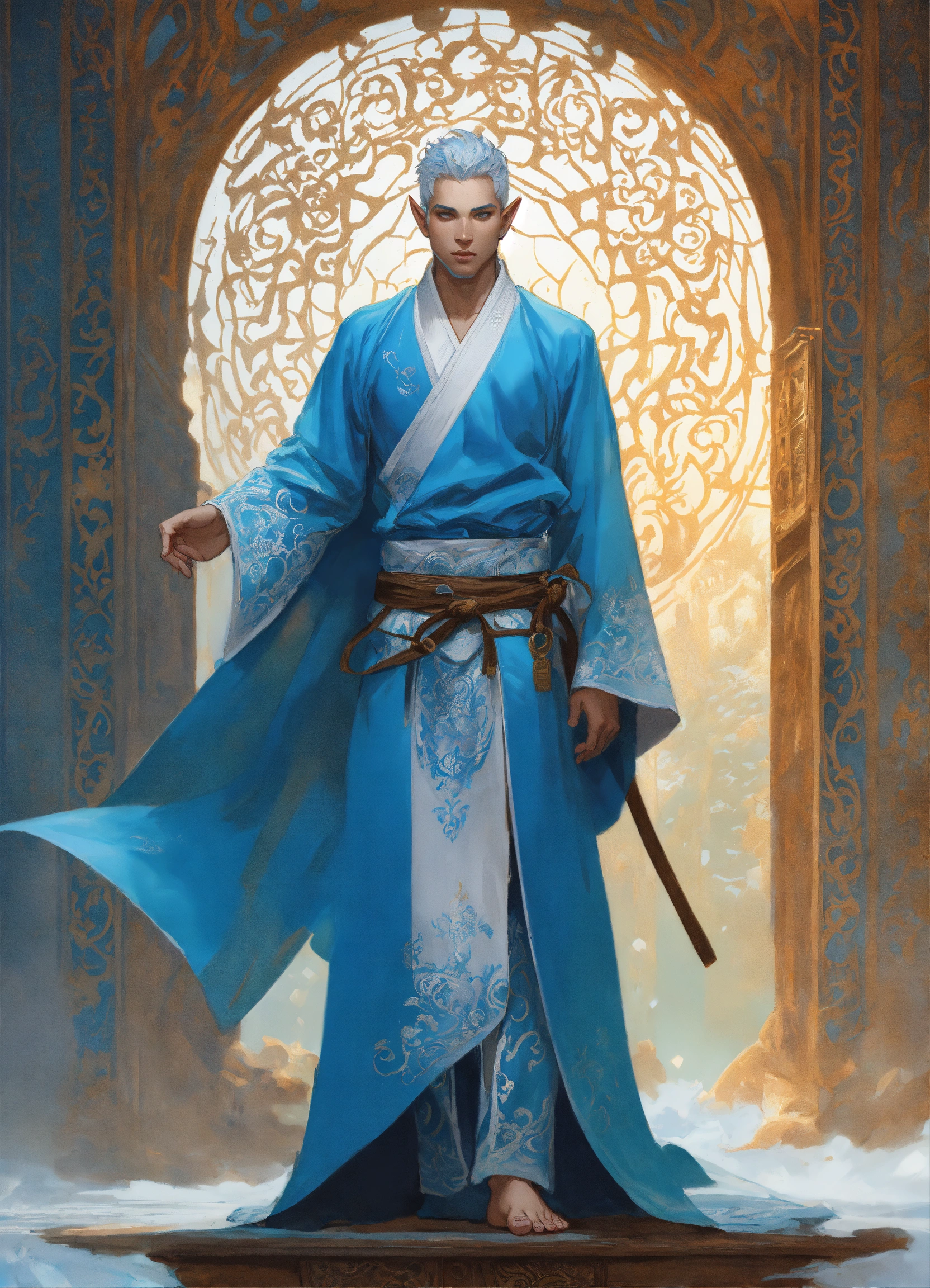 Male elf, ice blue skin color, white white short hair, wearing blue and white martial arts robes, martial arts pose, full body, concept art, intricate details, highly detailed by greg rutkowski, michael whelan, and gustave dore, alphonso mucha
