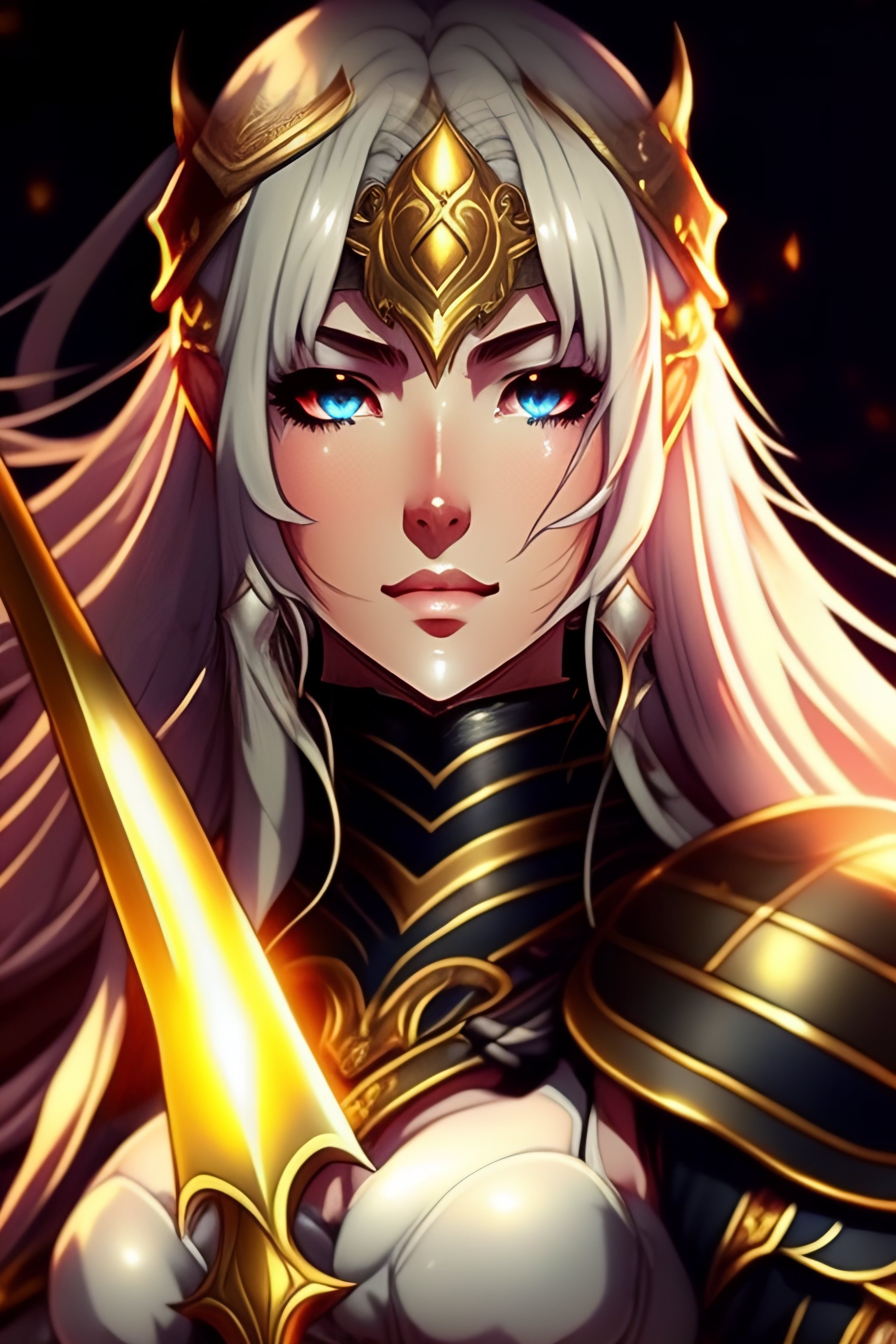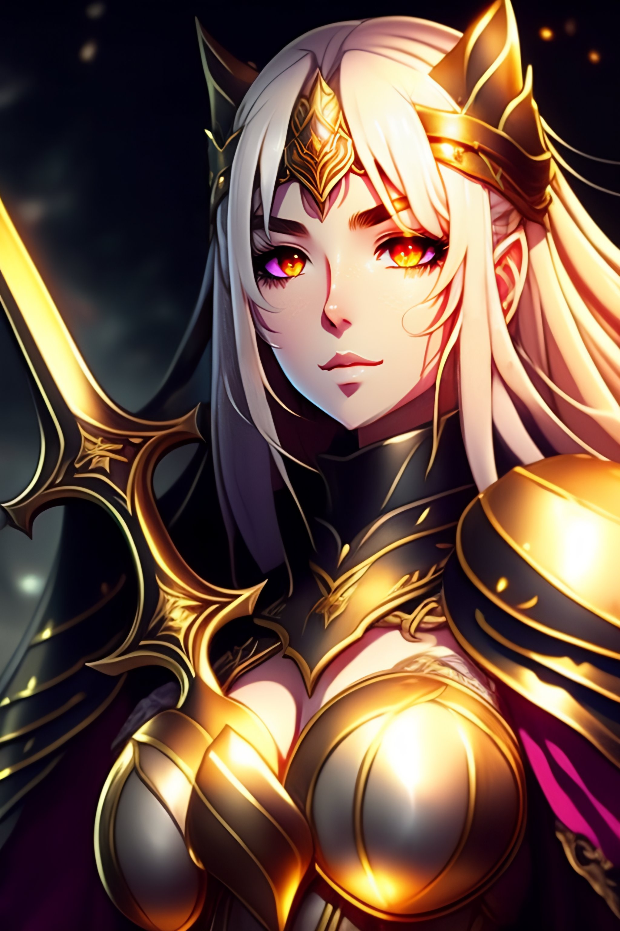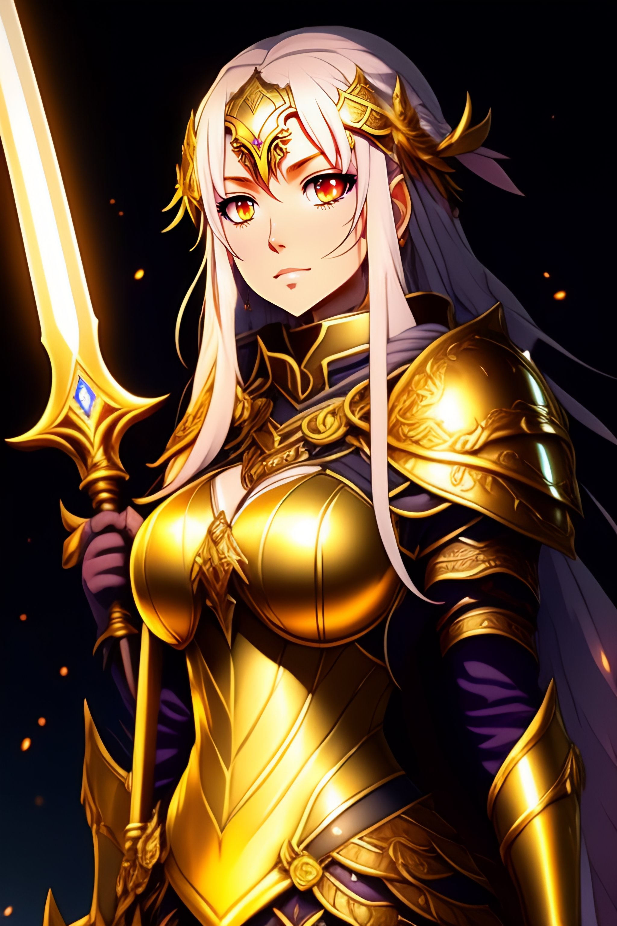 Goblin slayer's sword maiden, sister of beauty, golden glowing eyes, holy, holding holy sword, beauty