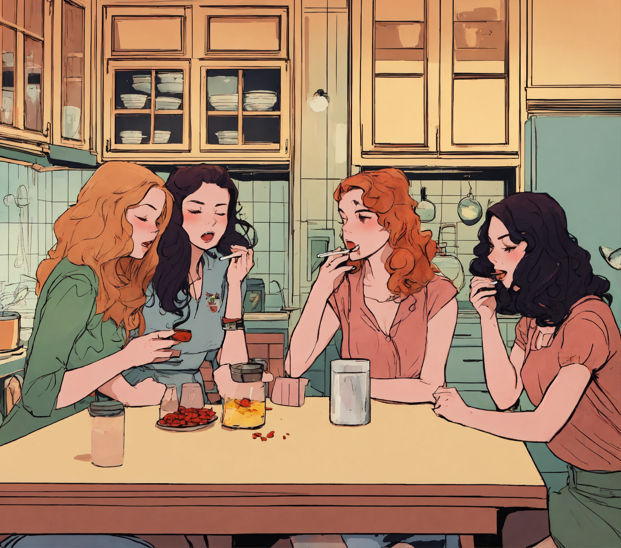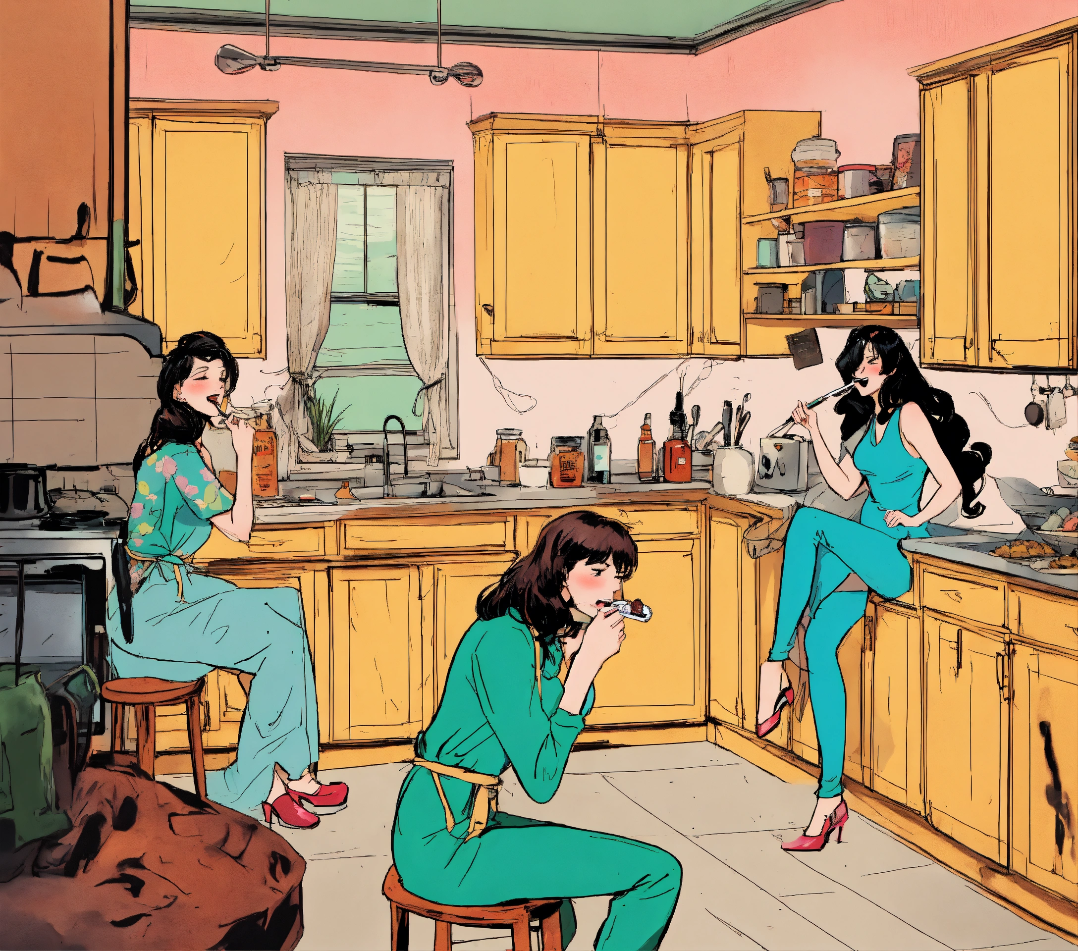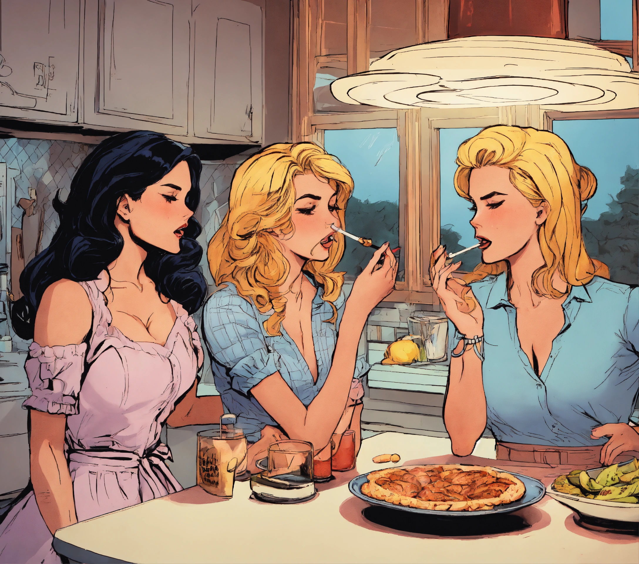 Three pretty ladies secretly smoke scared in the kitchen comics