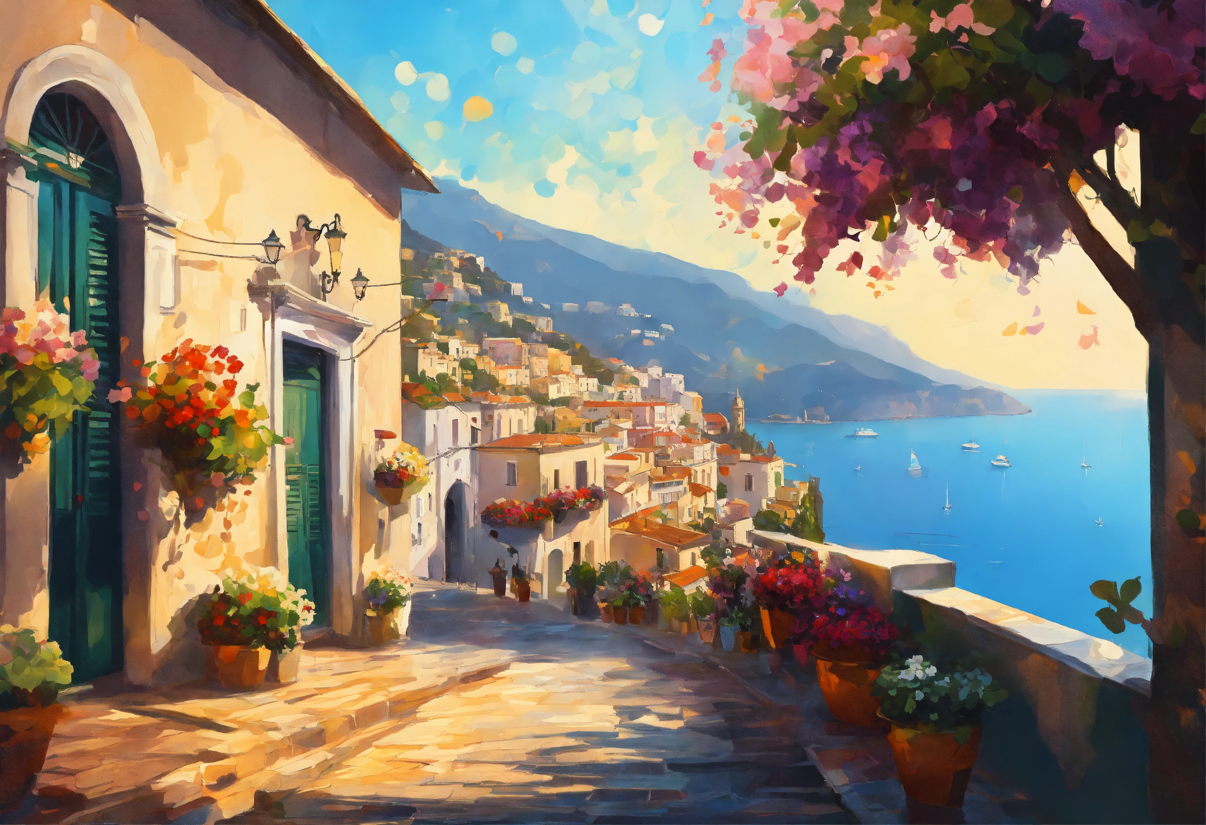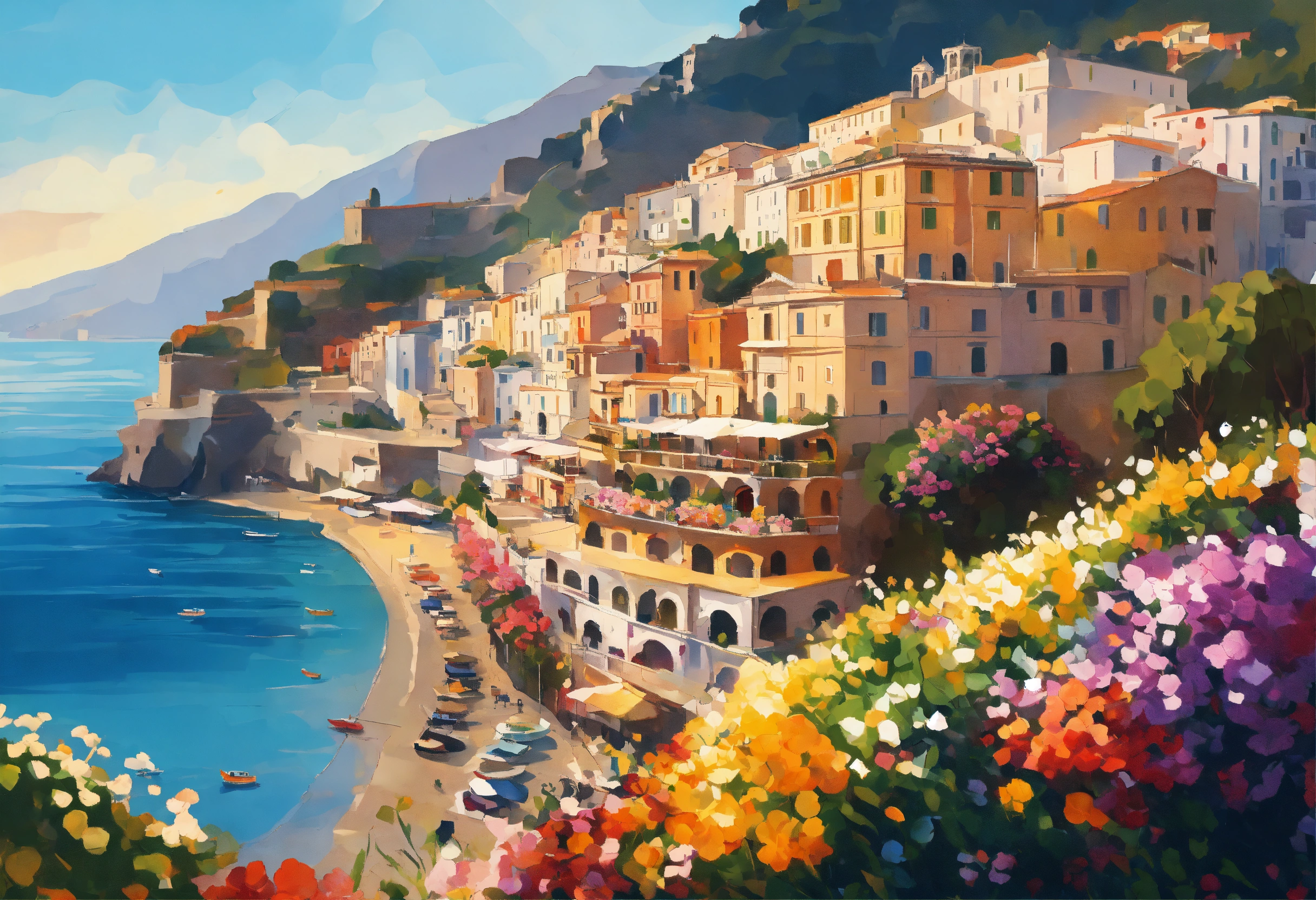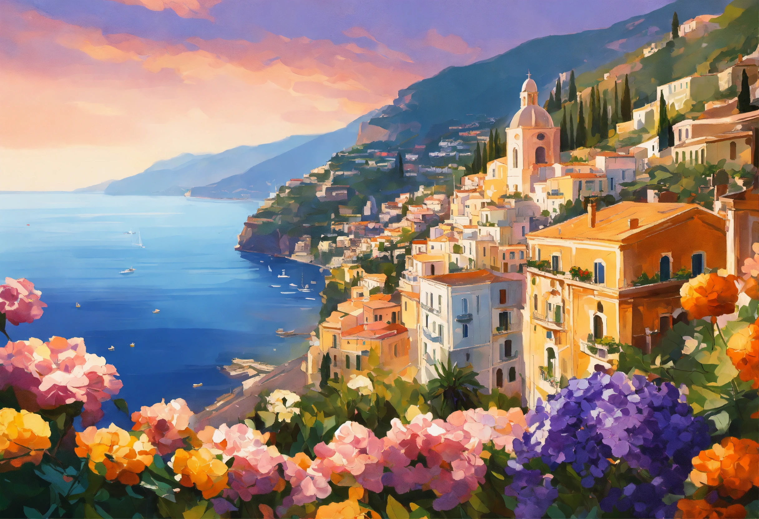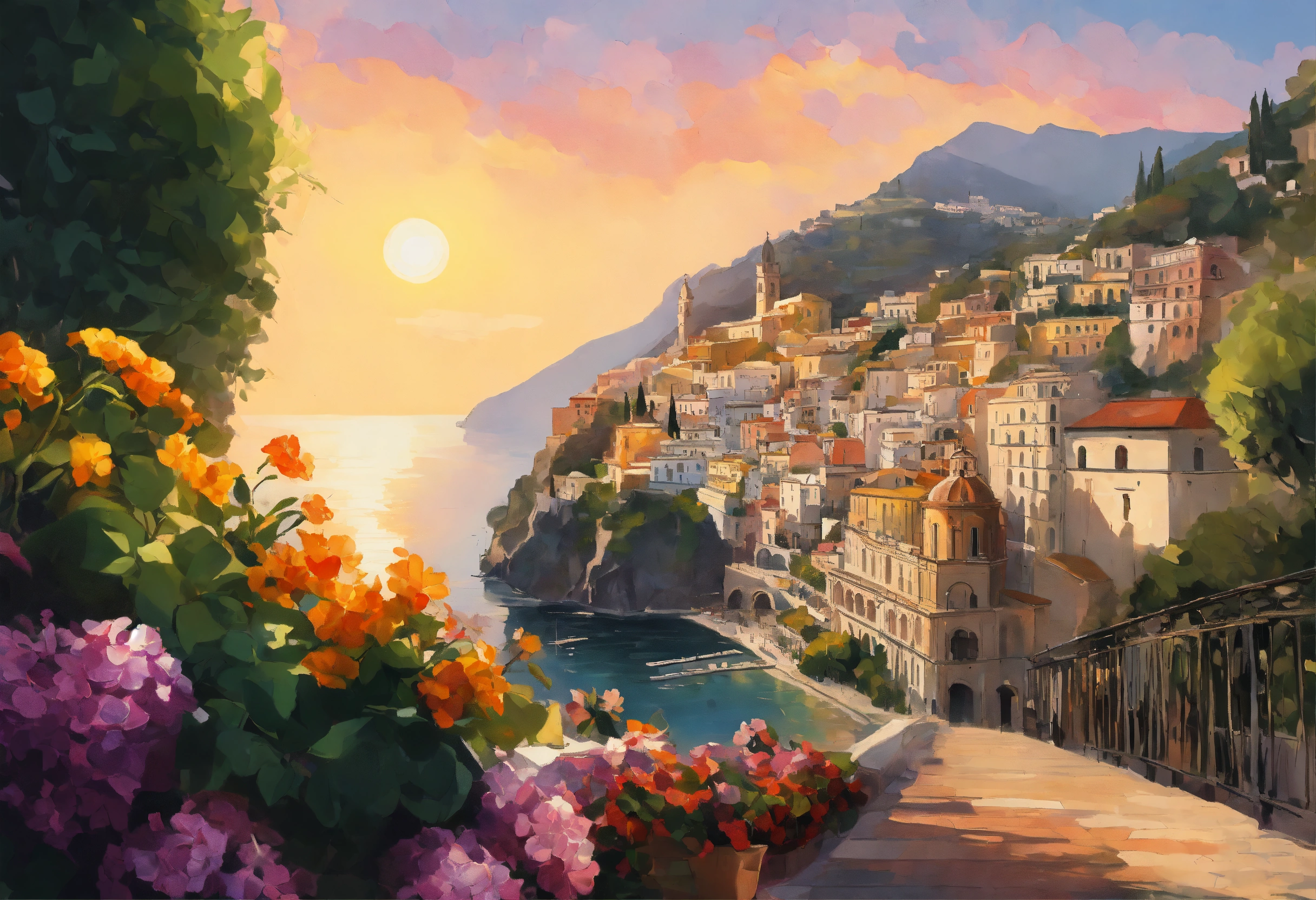 A line art illustration of amalfi towns with flowers, by james gurney and leonid afremov, cinematic lighting, long shadows