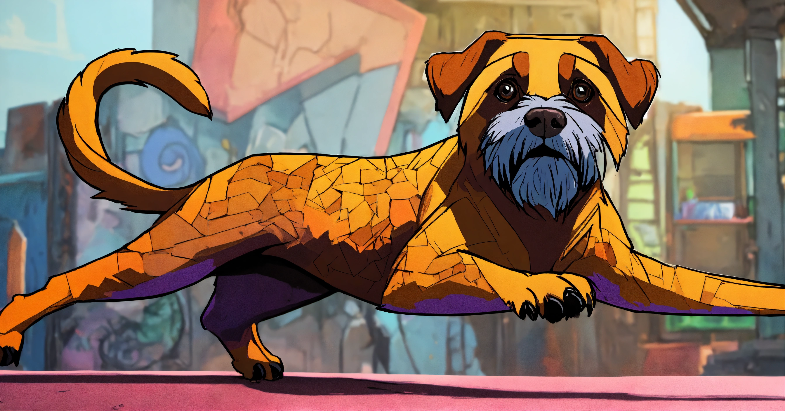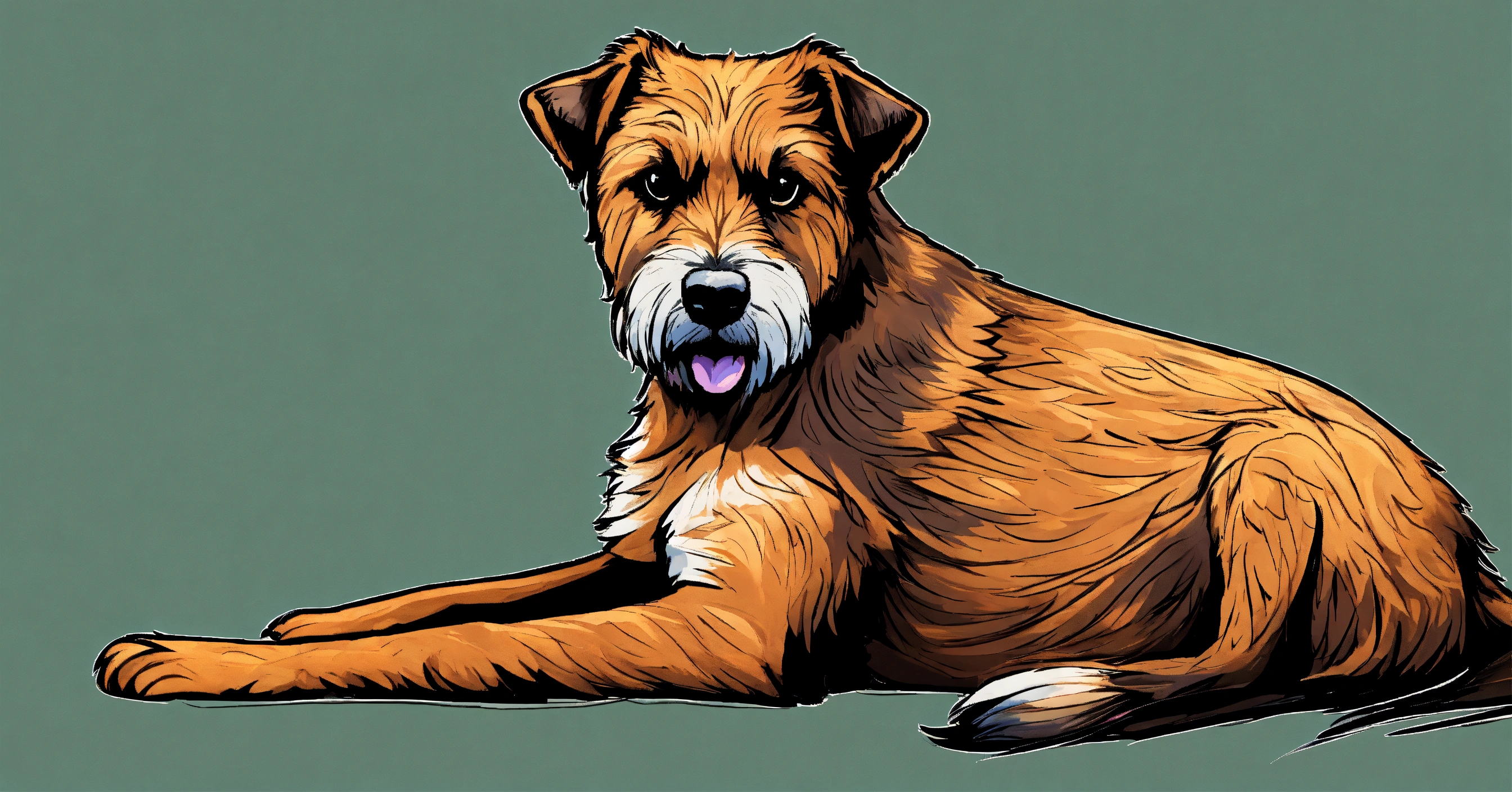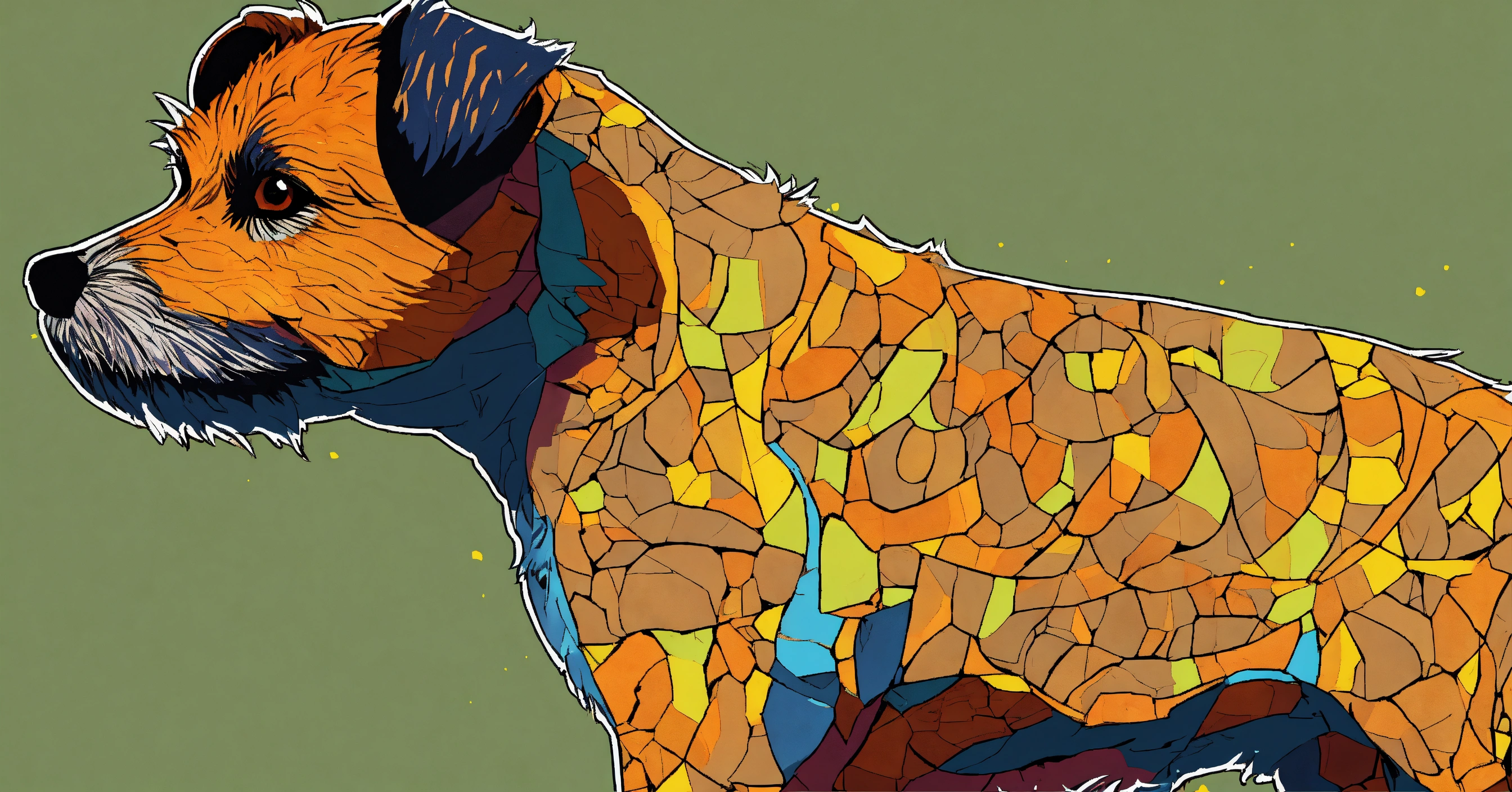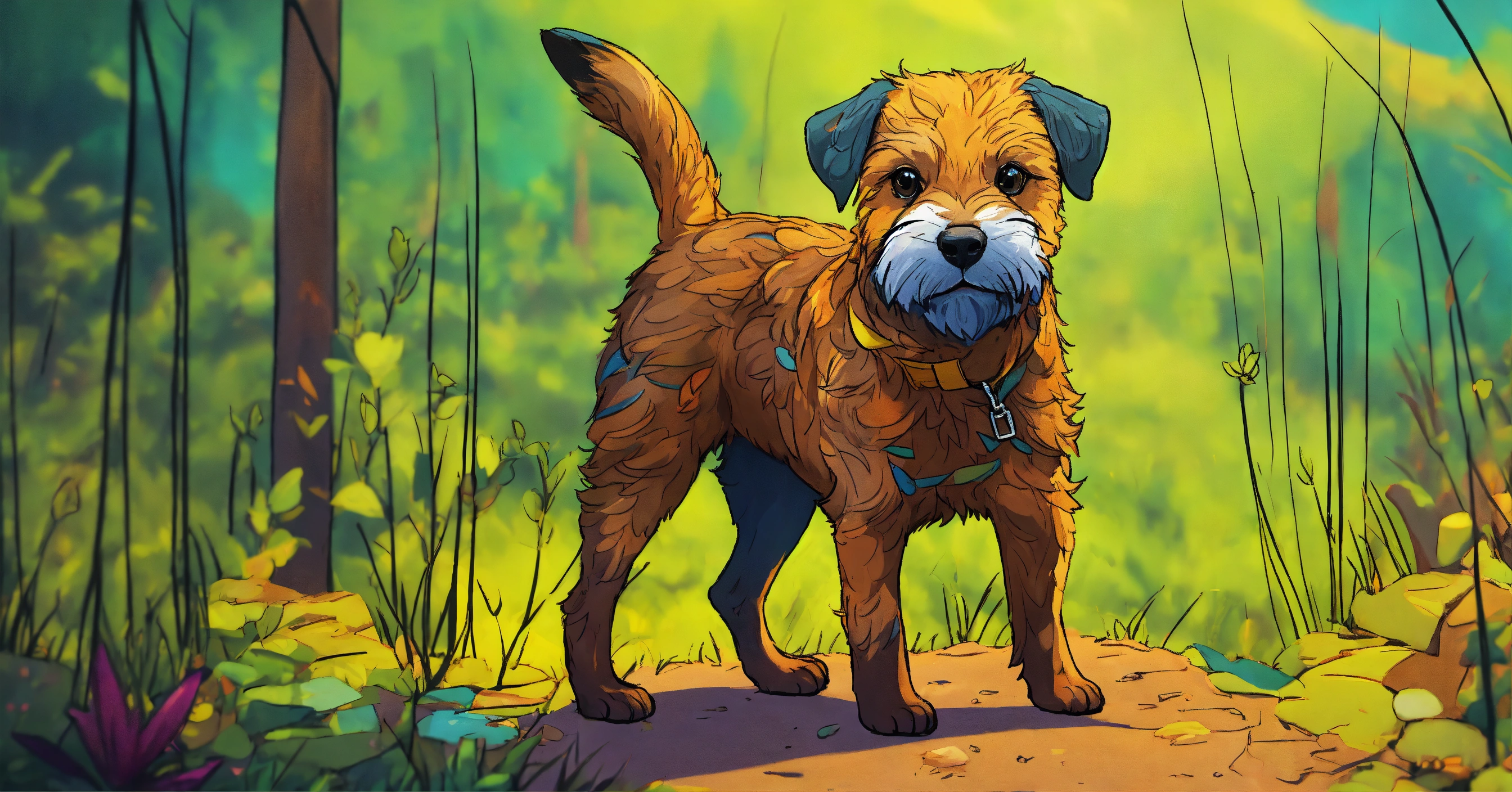 Create a abstract, illustrator, graffiti, border terrier in a natural setting. medium-boned and agile, with a grizzle-colored, wiry, close-fitting coat. feature an 'otter-like' head, dark hazel eyes, and small v-shaped ears. body should be narrow and deep. include muscular fore and hindquarters, and a short, tapering tail carried gaily when alert