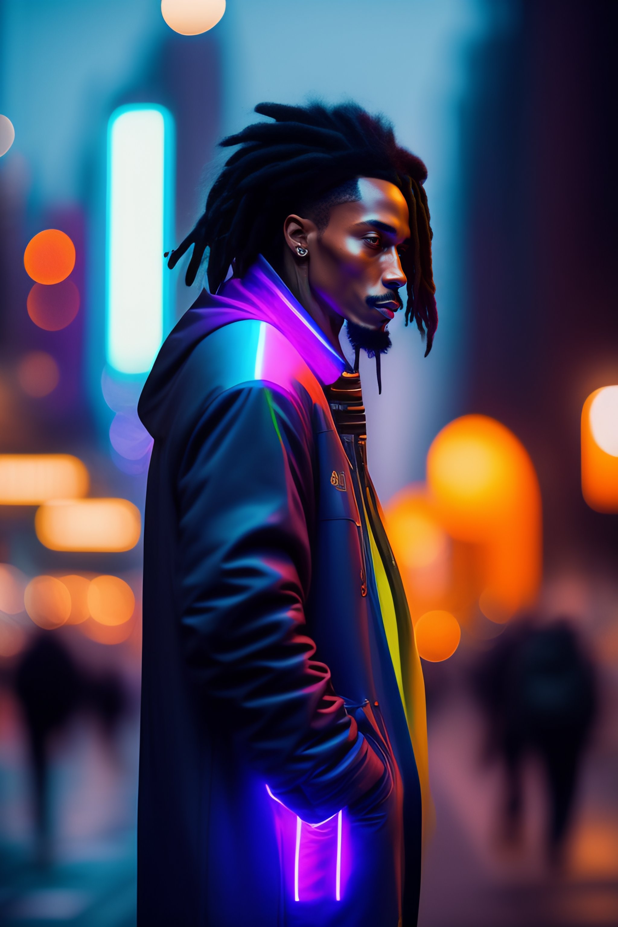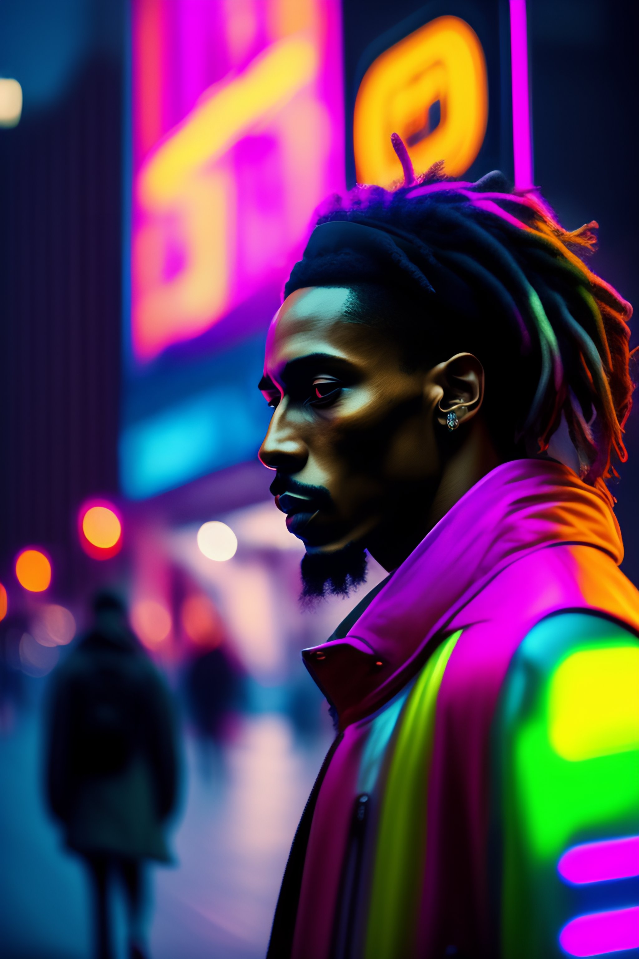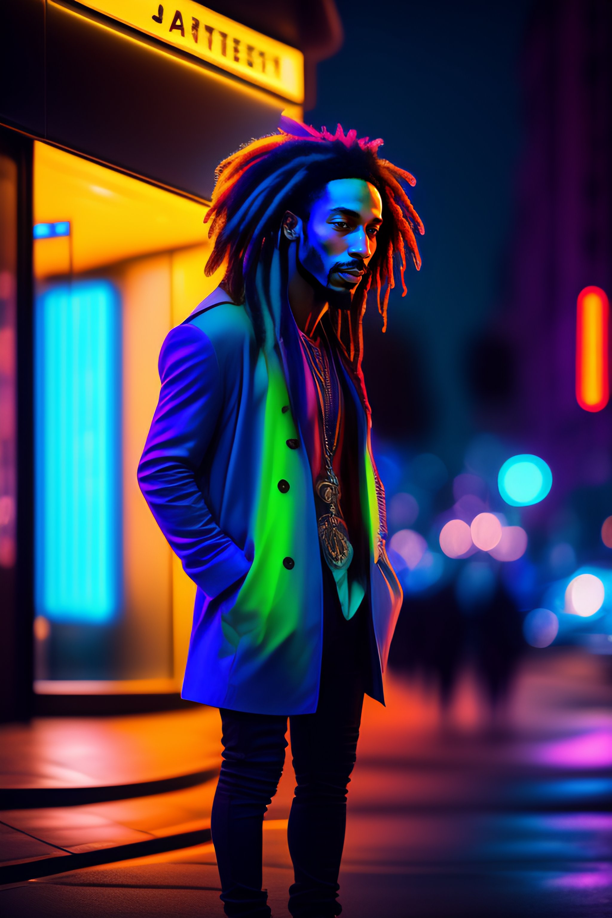 Slow shutter speed photo of a cyberpunk bob marley with neon joint, architecture, public realm, by jonathan solte and zac retz