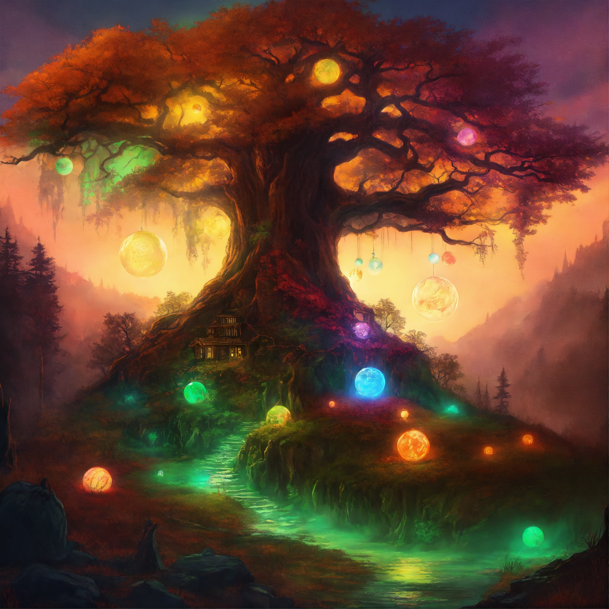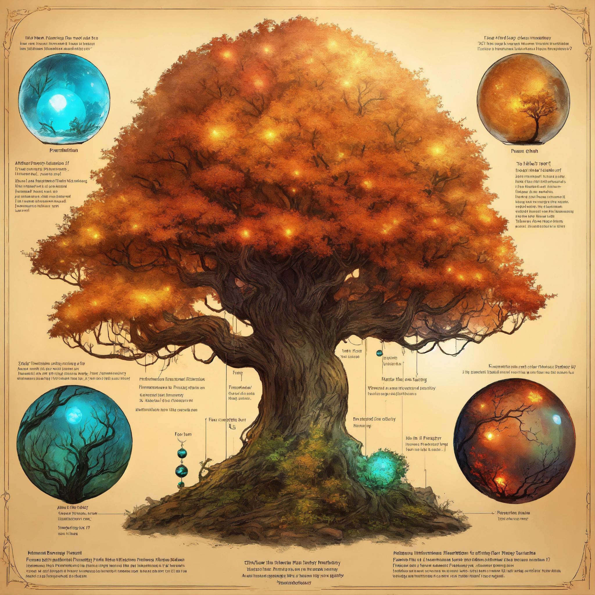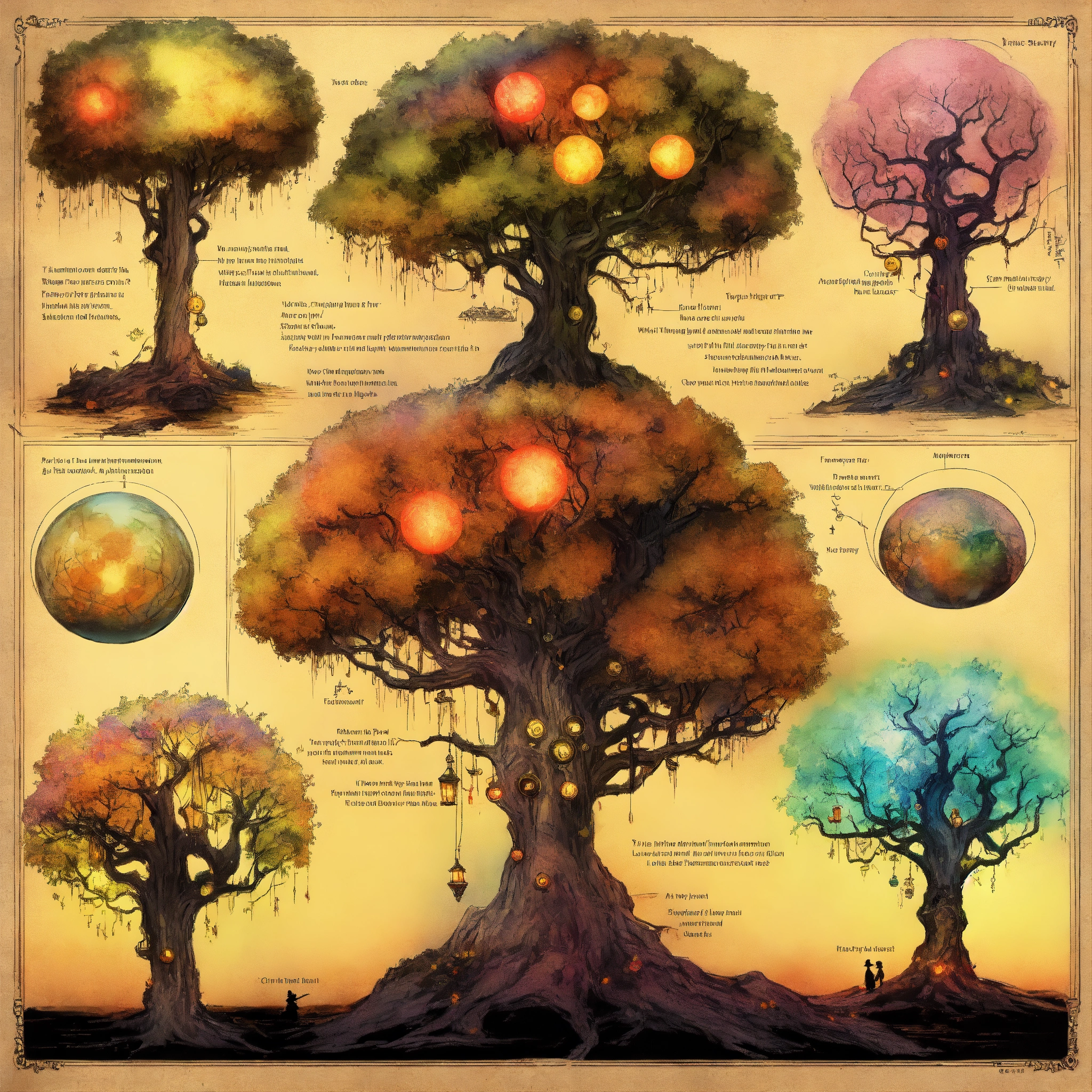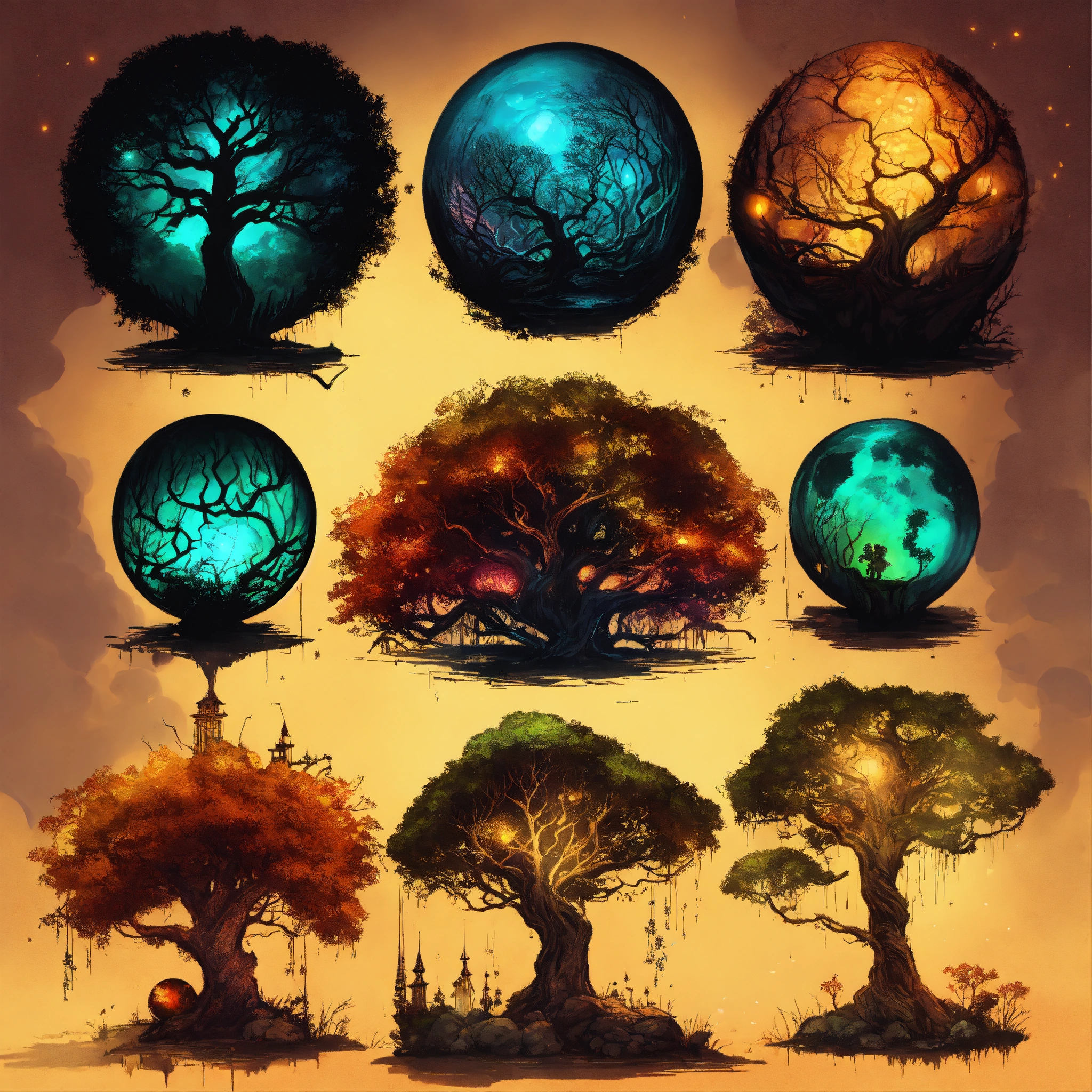 Information sheet with different scary, fantasy, fantasy, fantasy, huge hybrid tree examples, glowing orbs. colored ink, fantasy