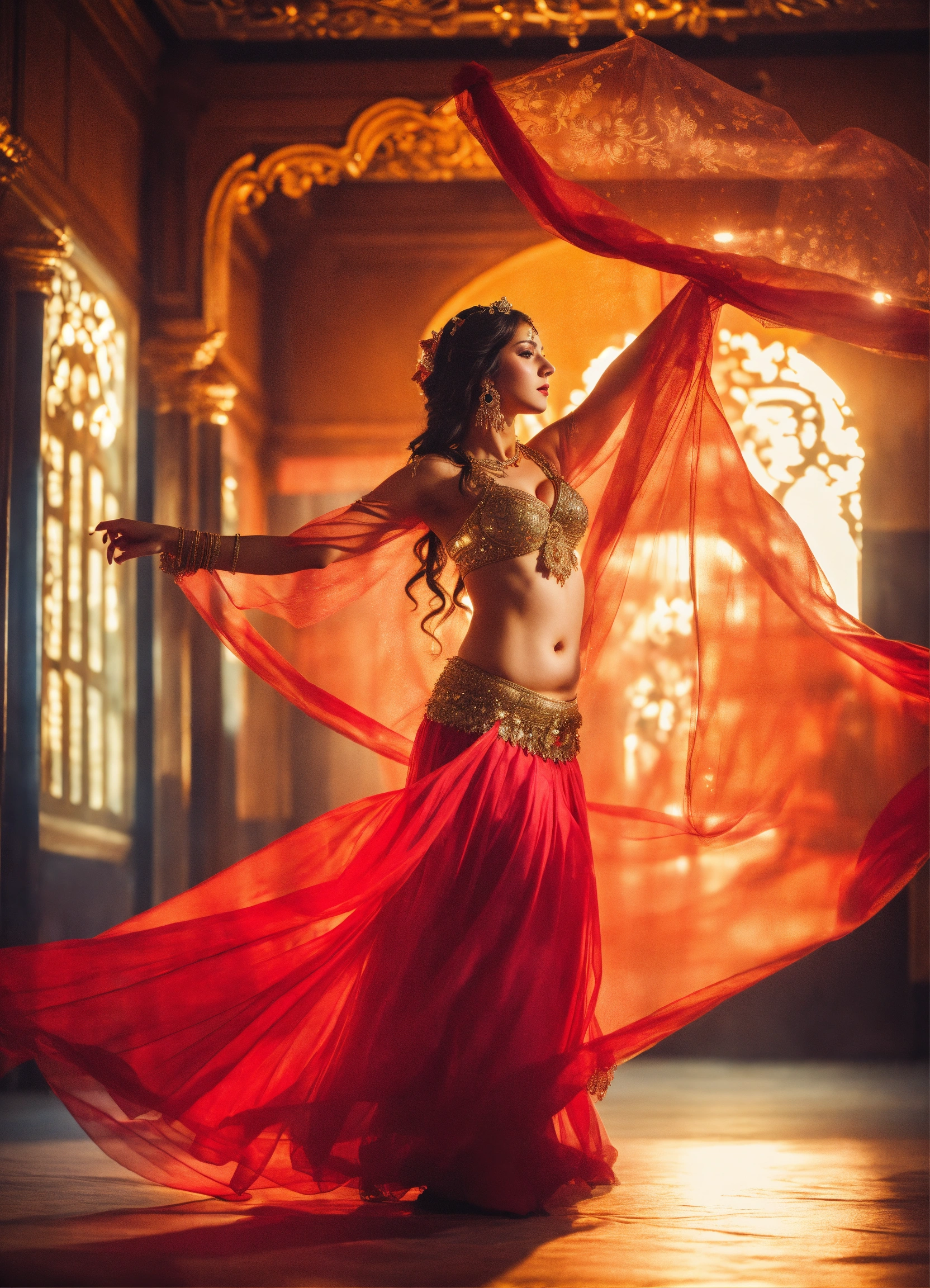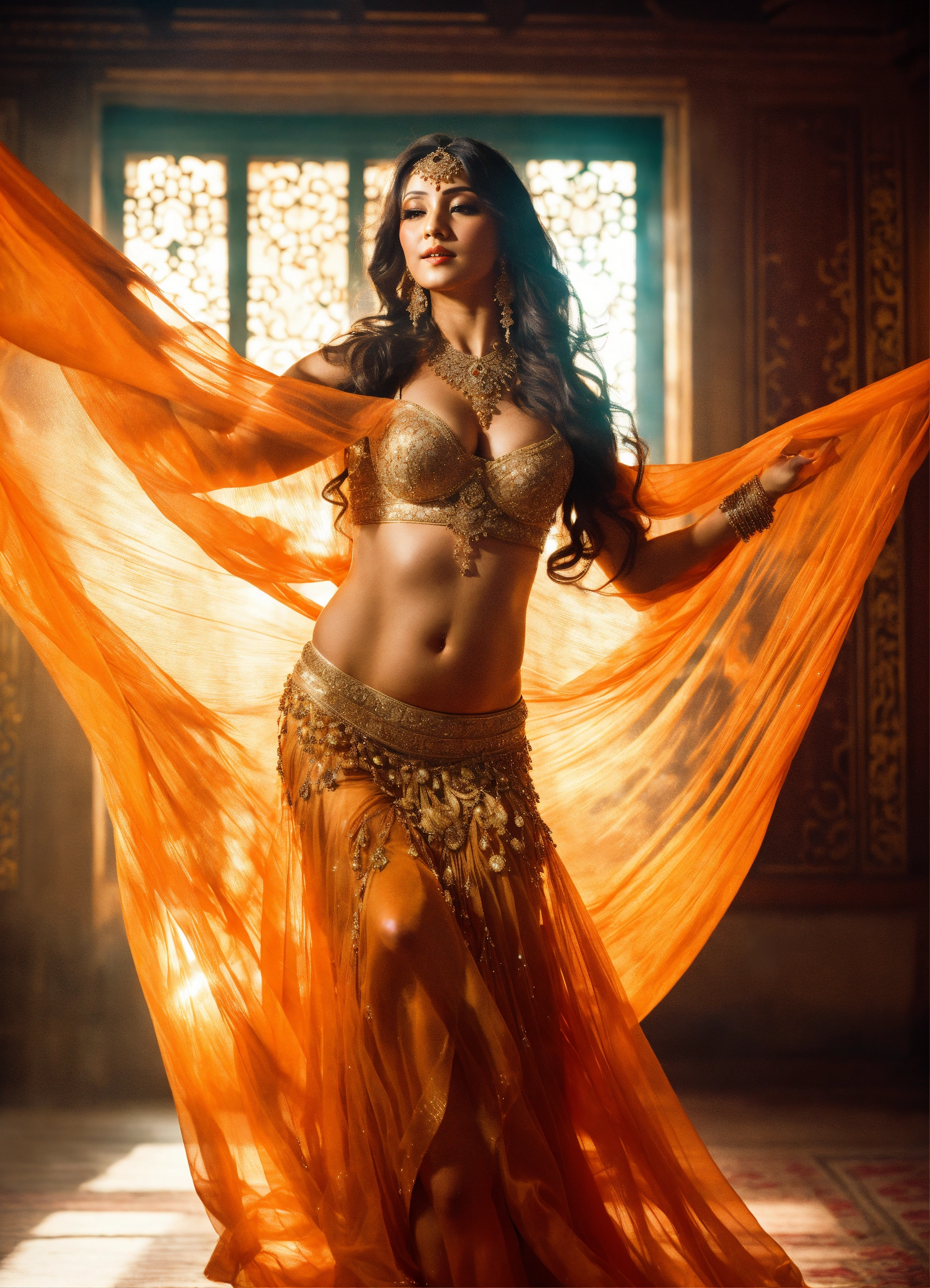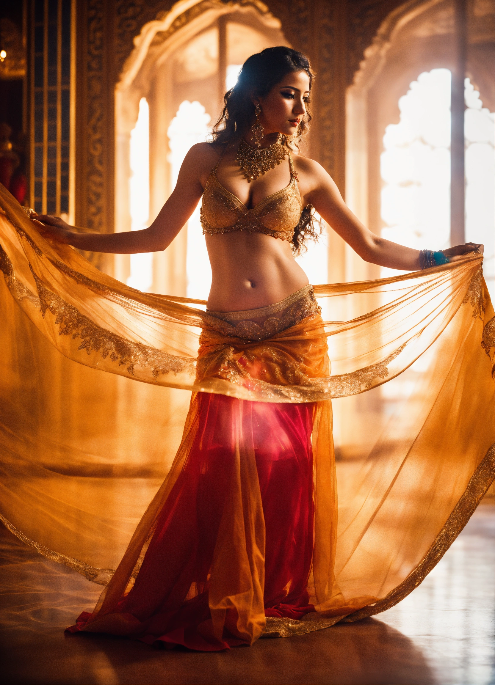 Detailed photo portrait of a dynamic sensuous spinning belly dancer and wearing a transparent skirt, holding up a transparent veil in an oriental palace, spinning her body, lighting from upper right, chin up looking at viewer