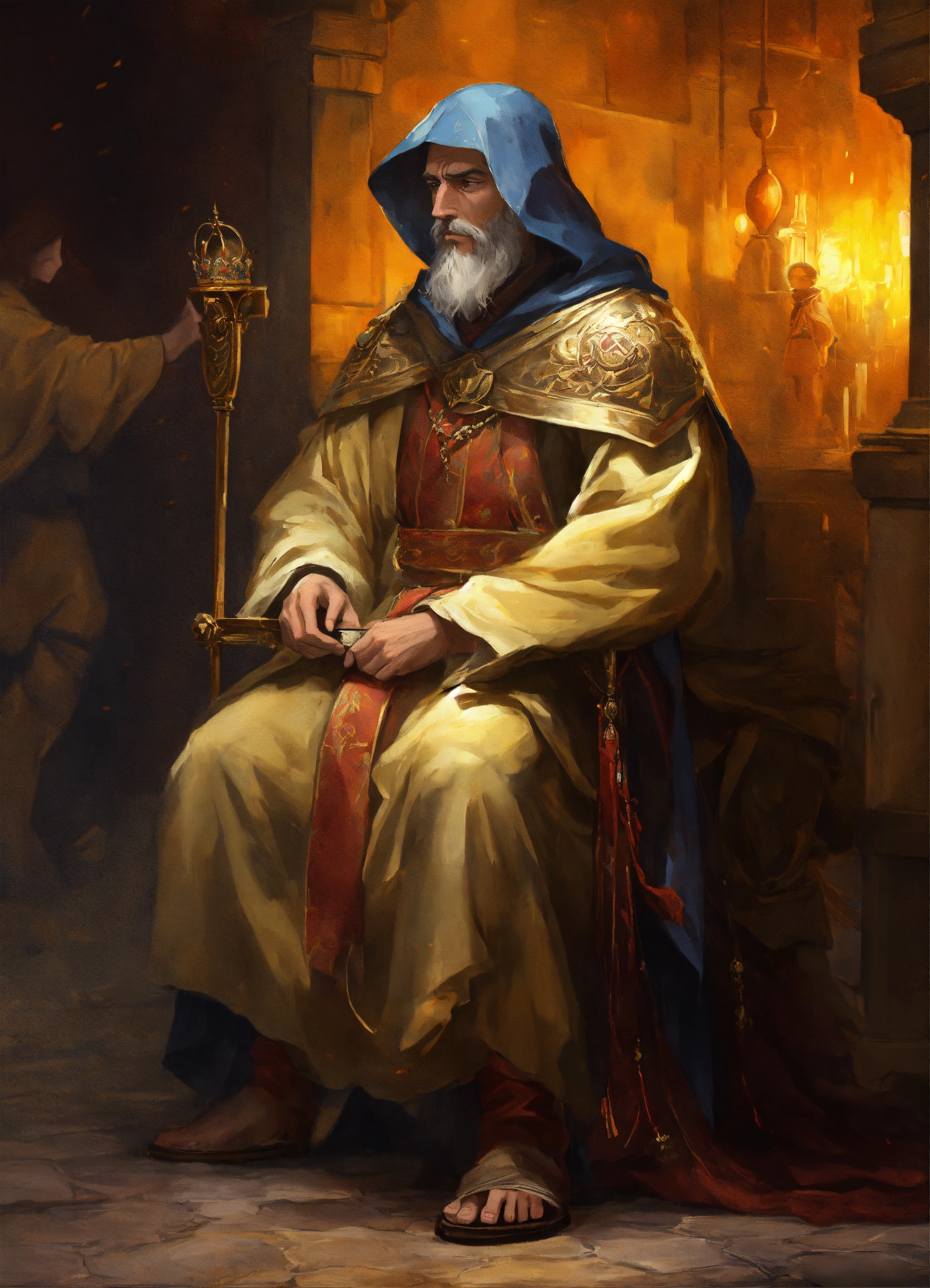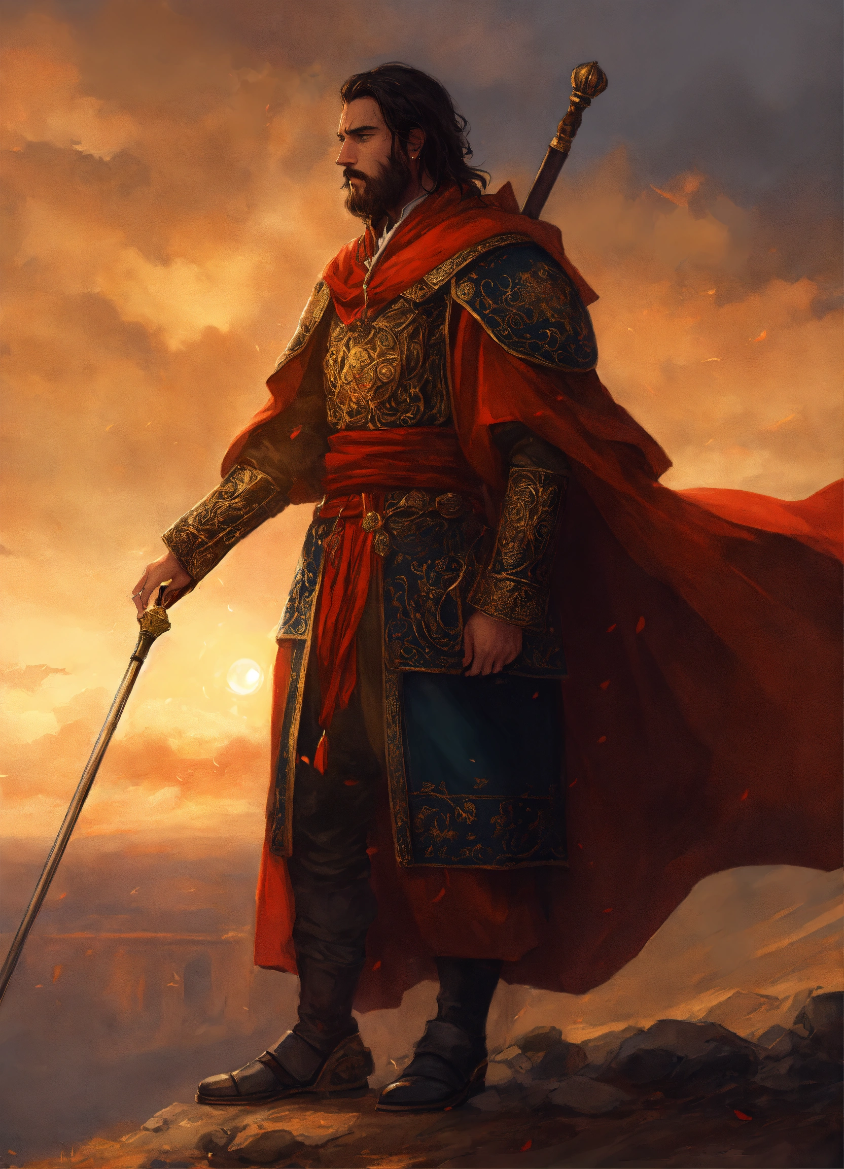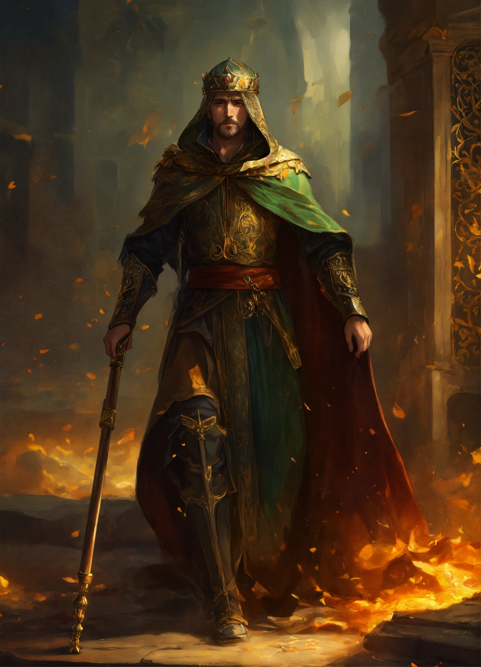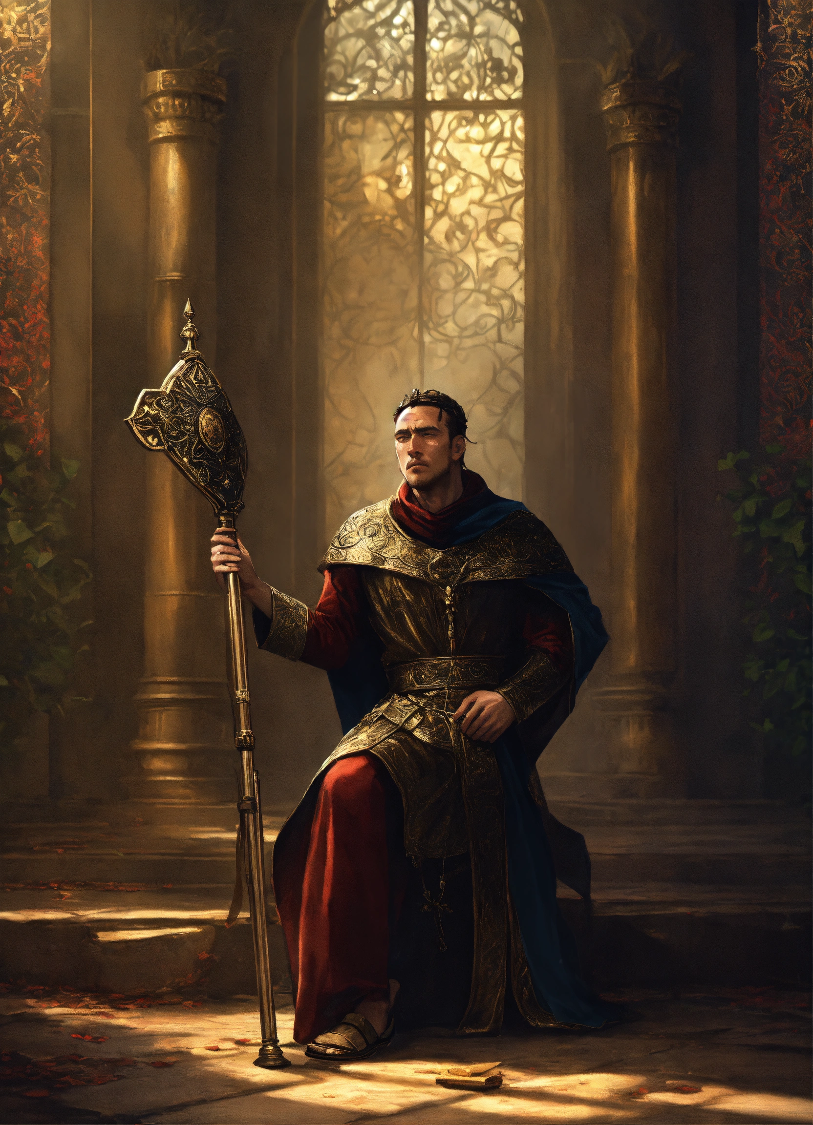 Cover for the book in a fantasy style.. a man is tired, sick, weak, sad, serious, handsome. the emperor, the embodiment of light, crippled in war, lame, with a hunched back, stands hunched over, leaning with both hands on a crutch. his legs are paralyzed, damaged, it’s hard for him to stand. any movement causes him pain. a light wind blows his dark hair and clothes, similar to the vestments of medieval monks, his hair is hidden a monk's scarf, with a crown on top of it. a beautiful face is concentrated. lips tightly compressed. it seems that in just a moment he will fall. and yet he stands here, in front of the people. they must hear from their ruler that the war is over.
