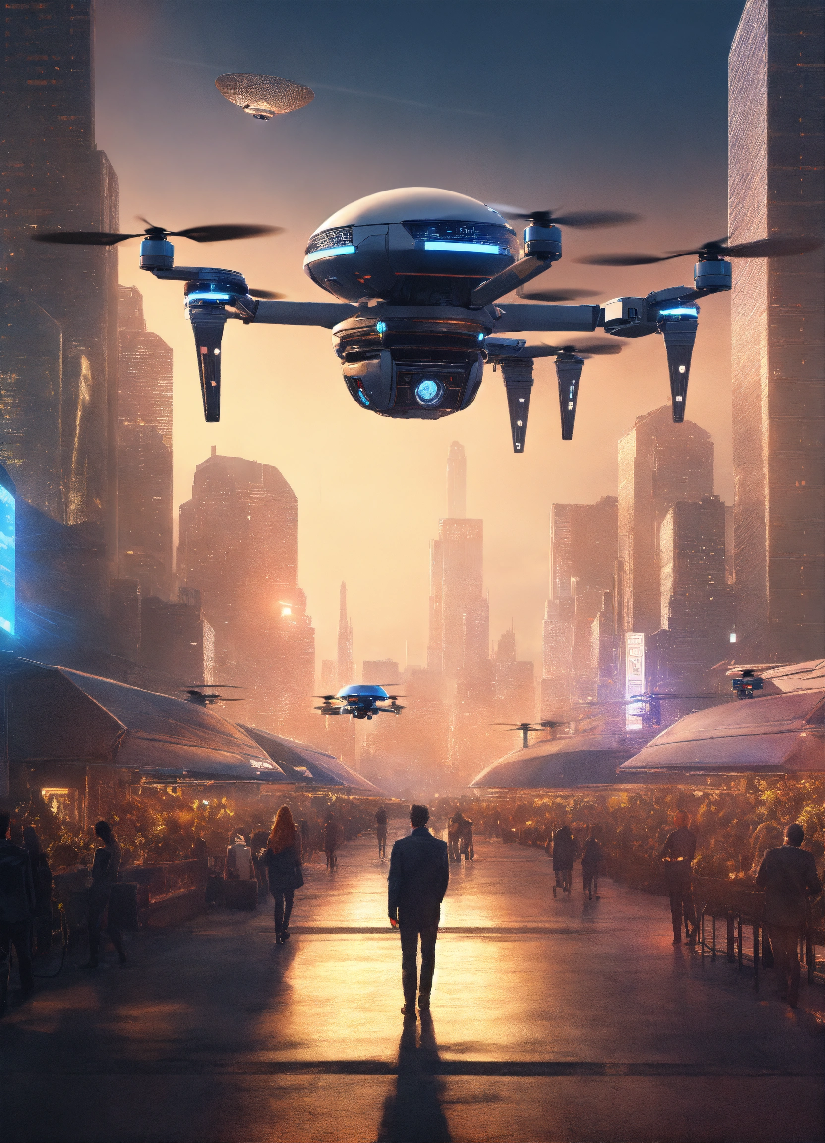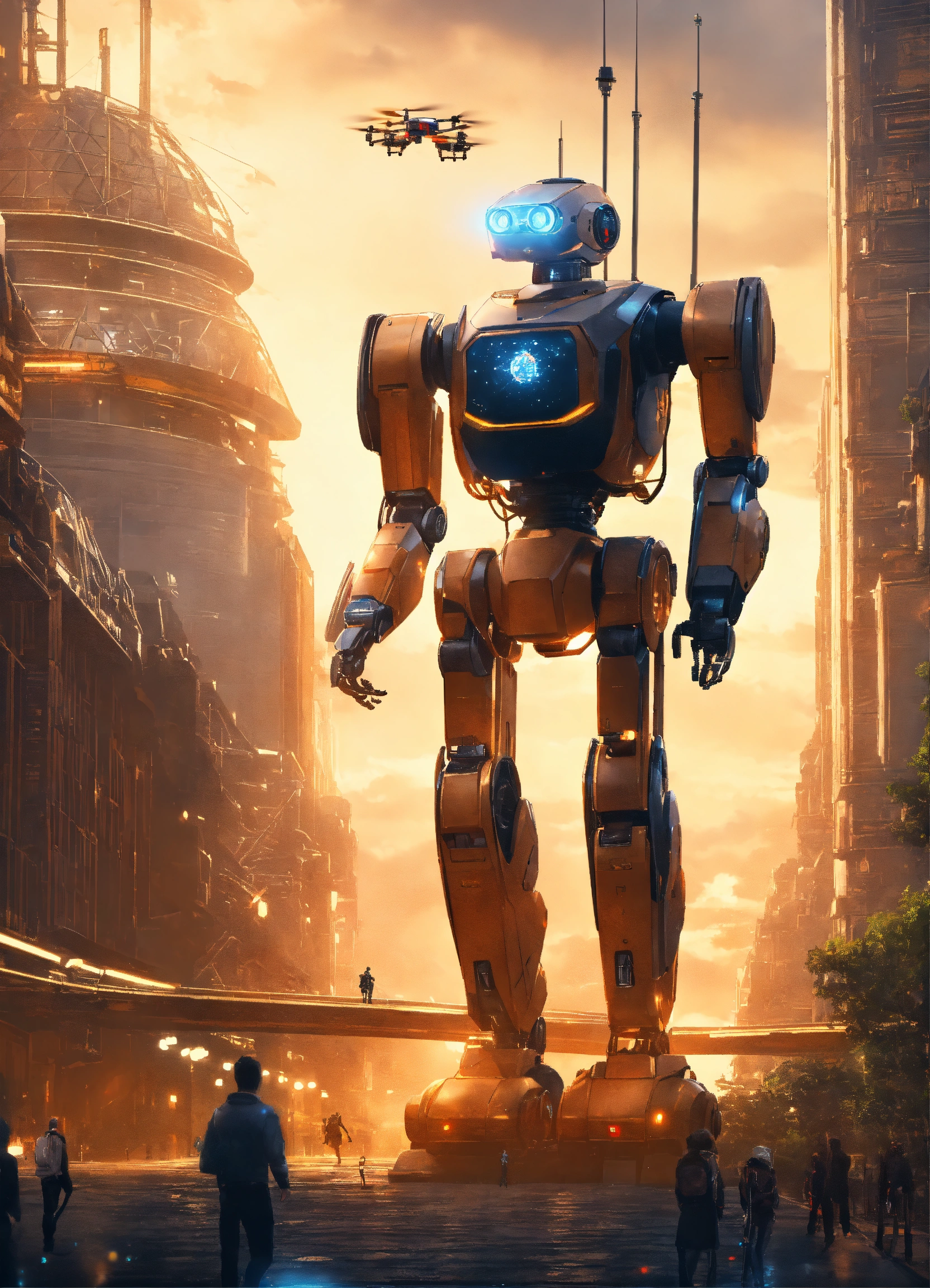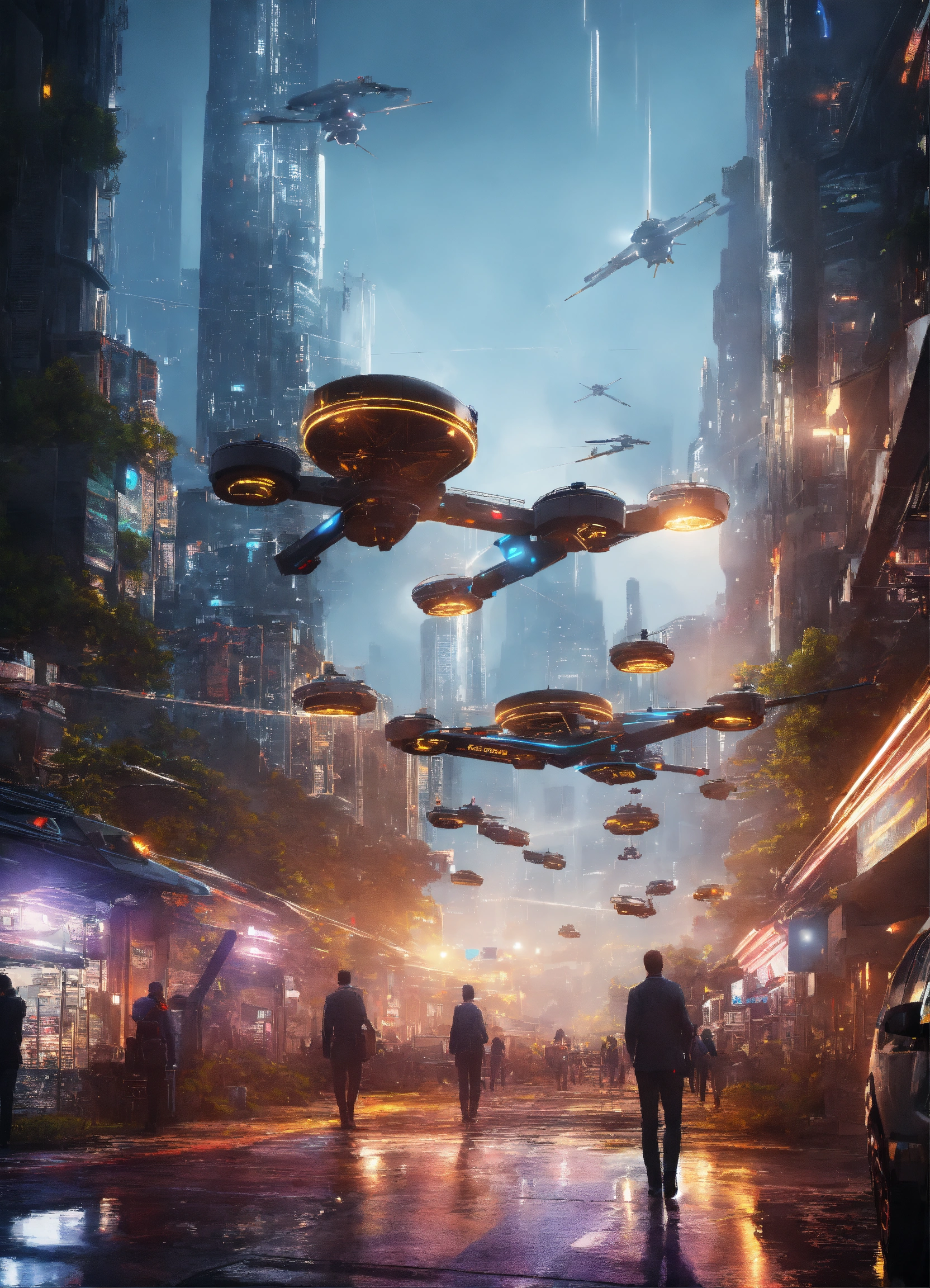 A technologically advanced city where robots and humans coexist in synchrony. utopian future. cinematic light, drones in the air.