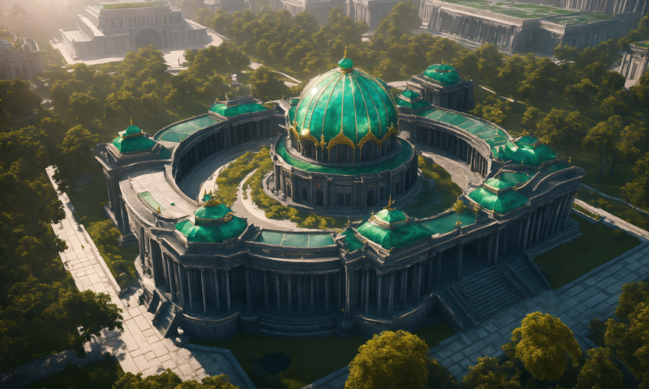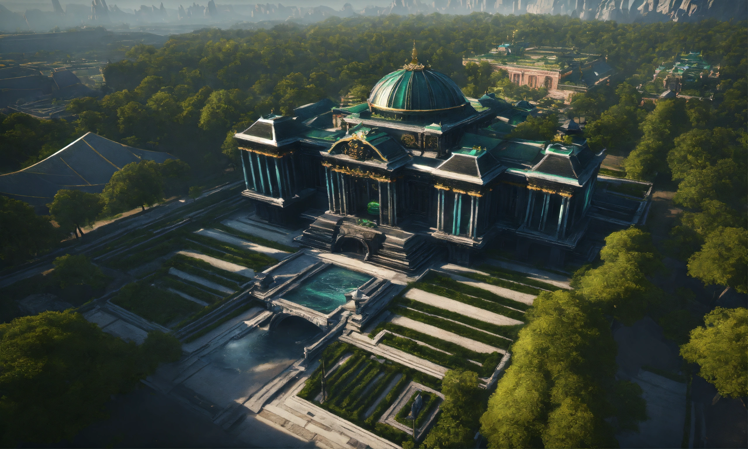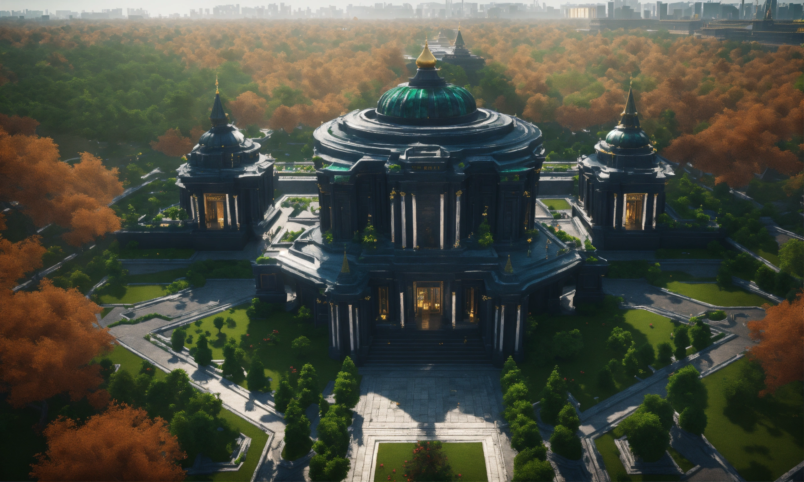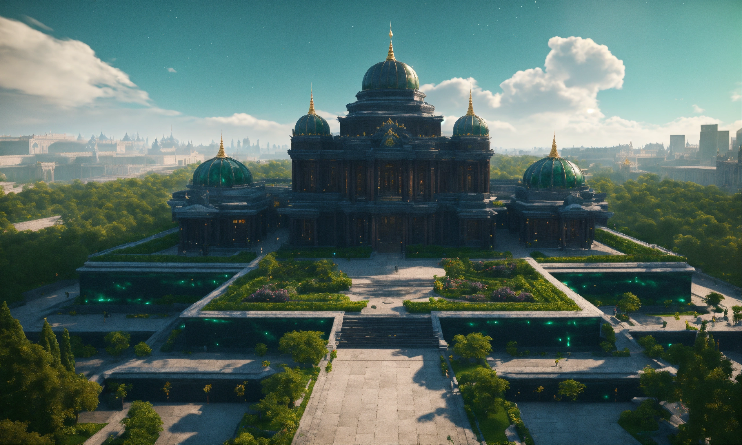 Overhead view of a massive black marble and jade royal palace, symmetrical, russian architecture, in the middle of a sci fi city, surrounded by elegant gardens, unreal engine, 8k, hd