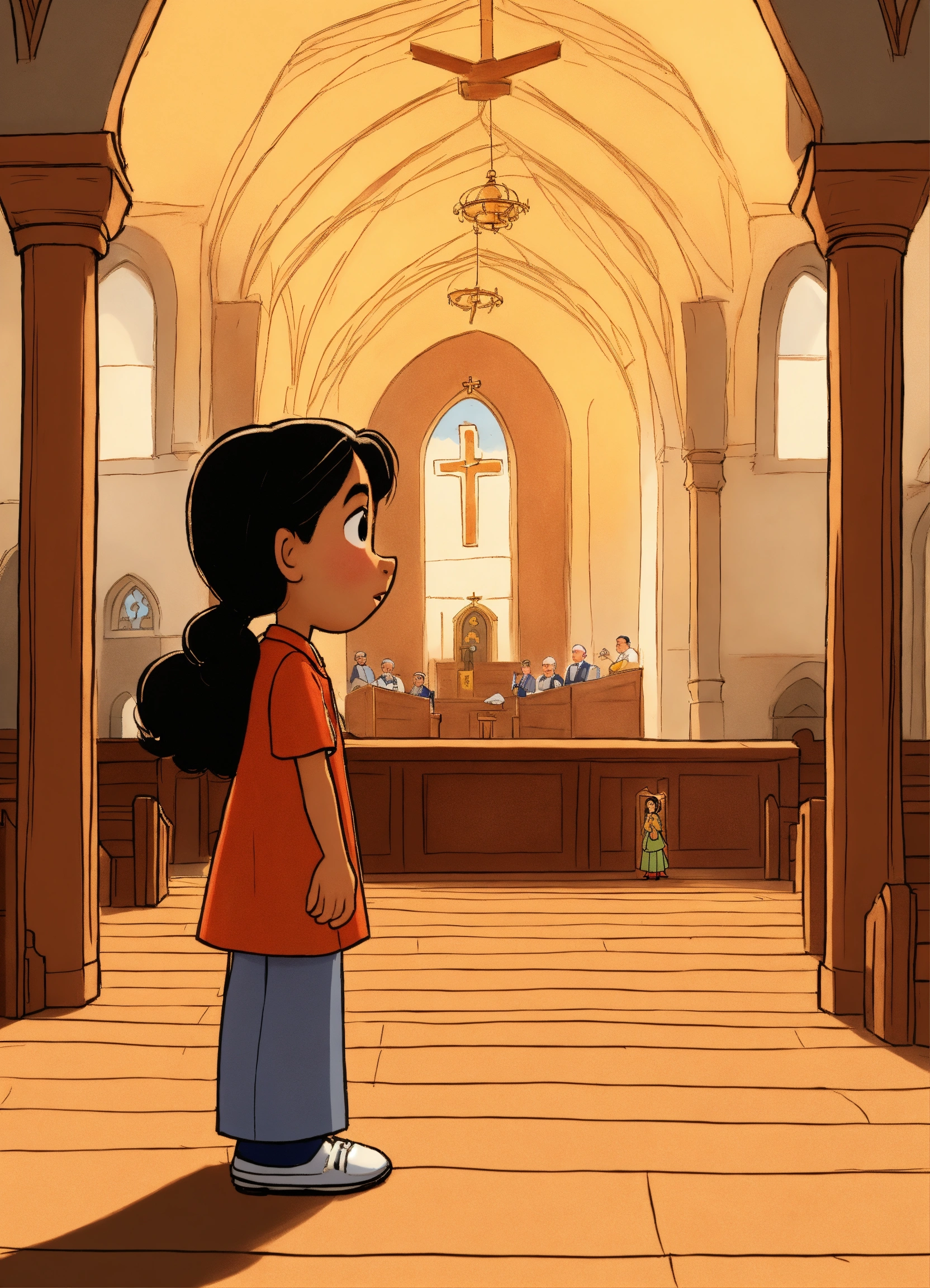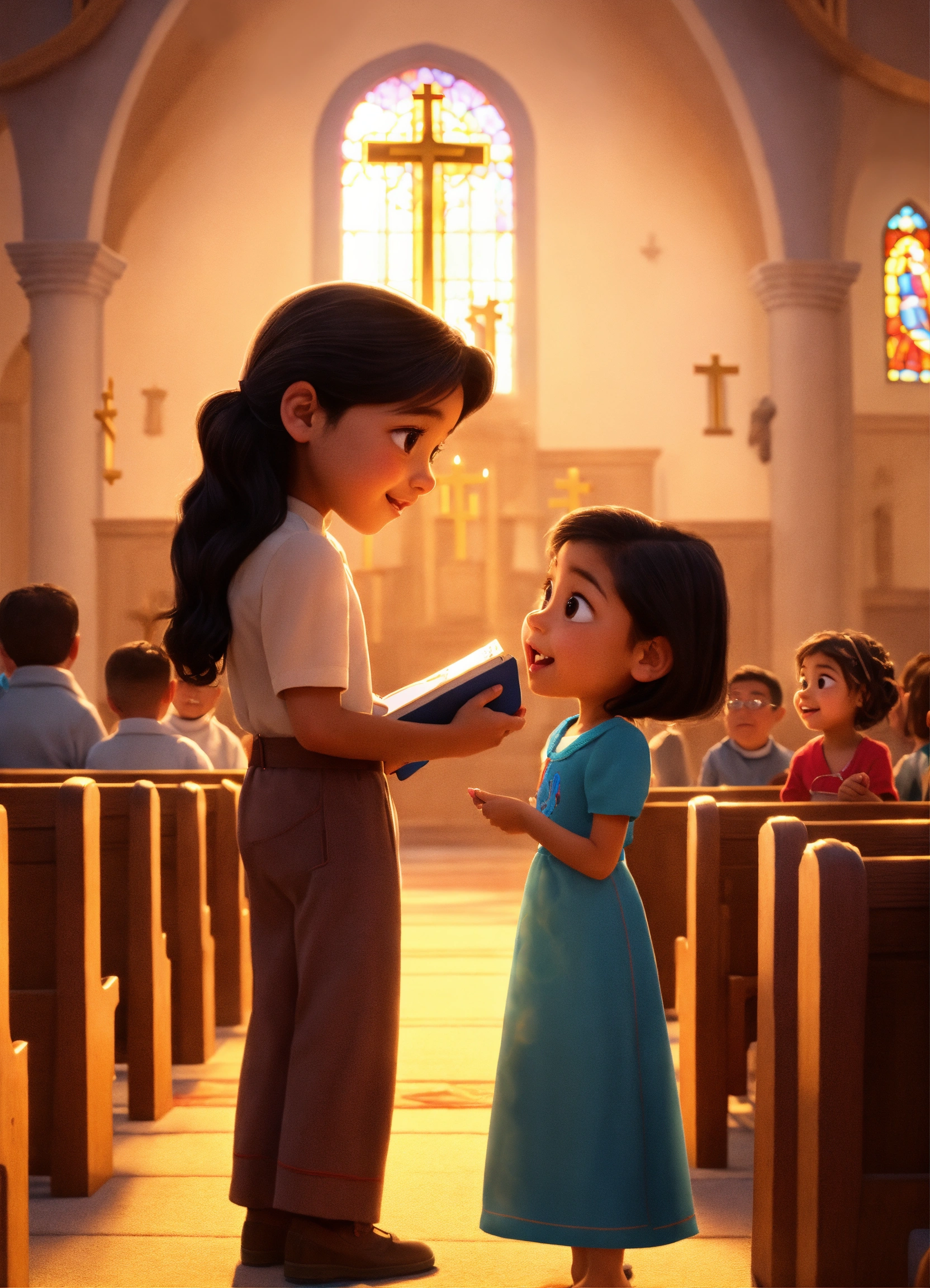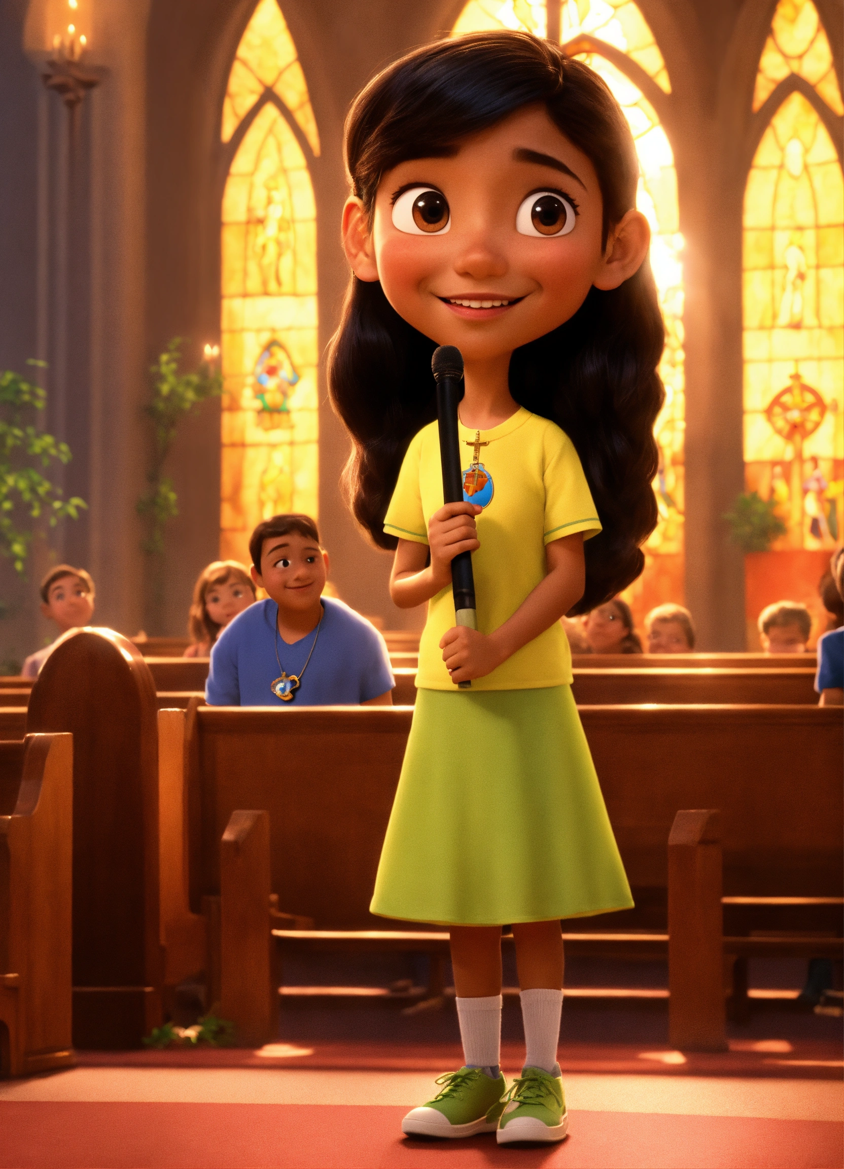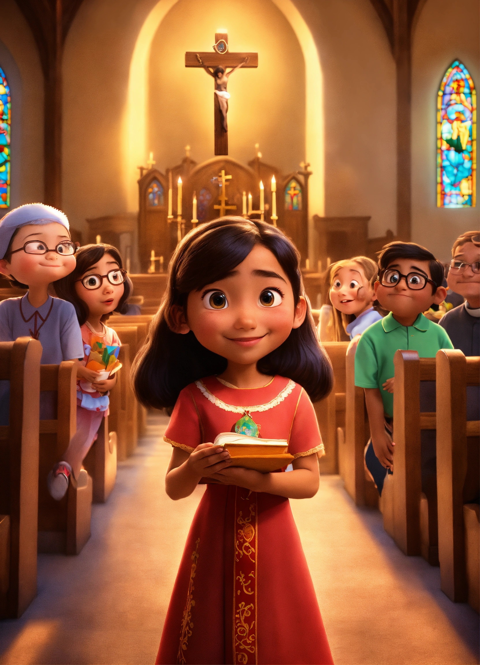Pixar animation of a hispanic 9 year old mia at the local church, sharing her idea with the priest. pixar style cartoon