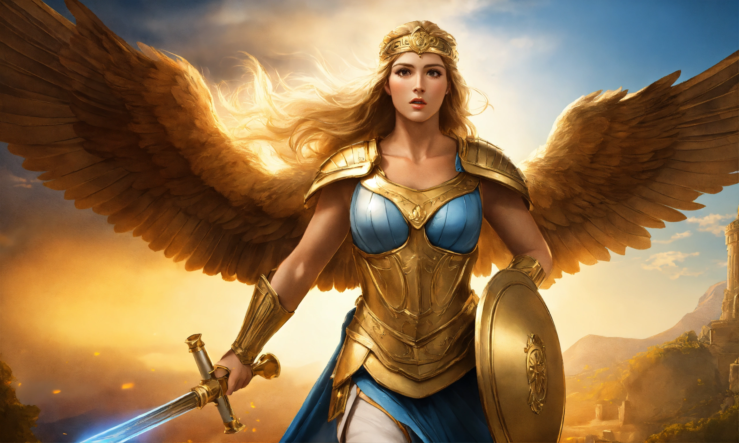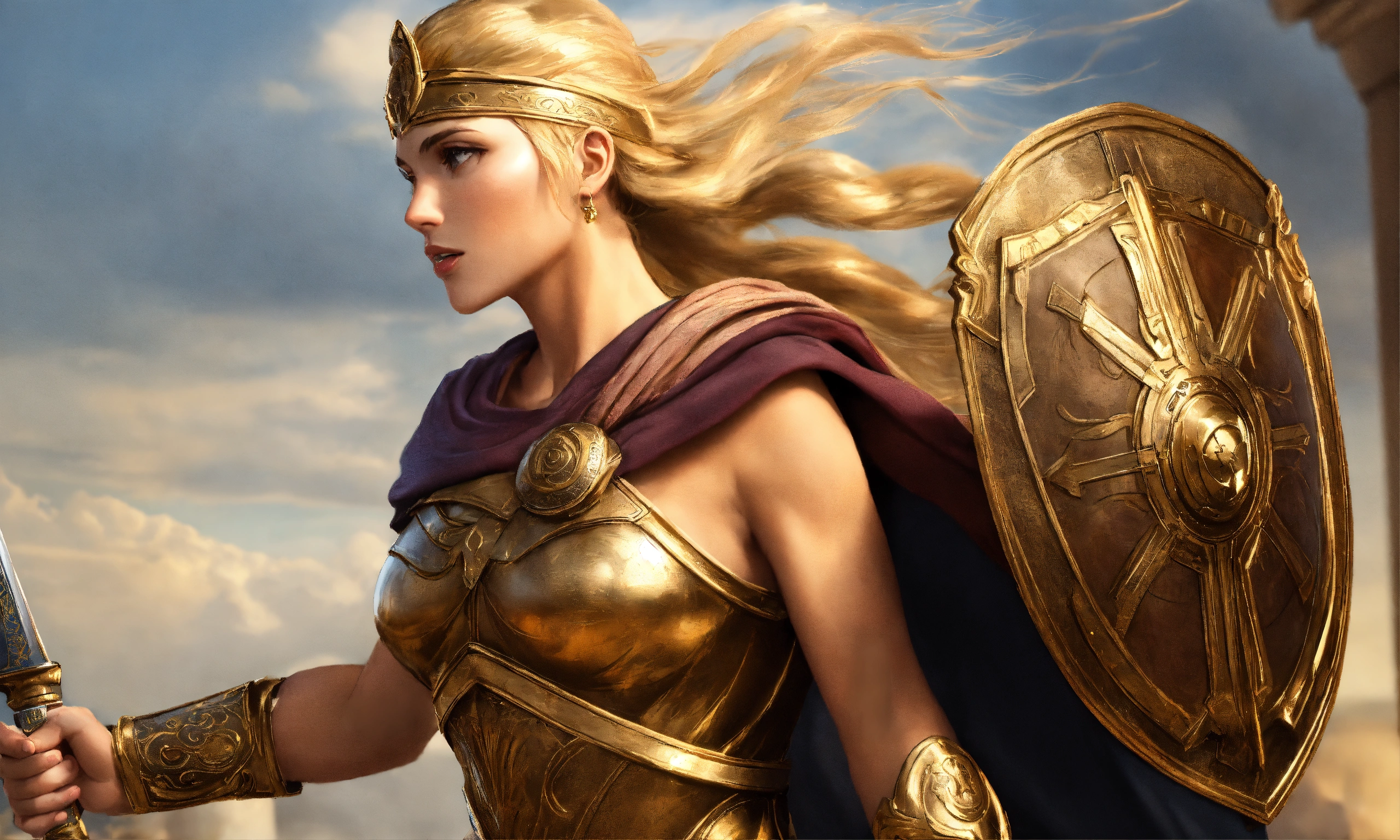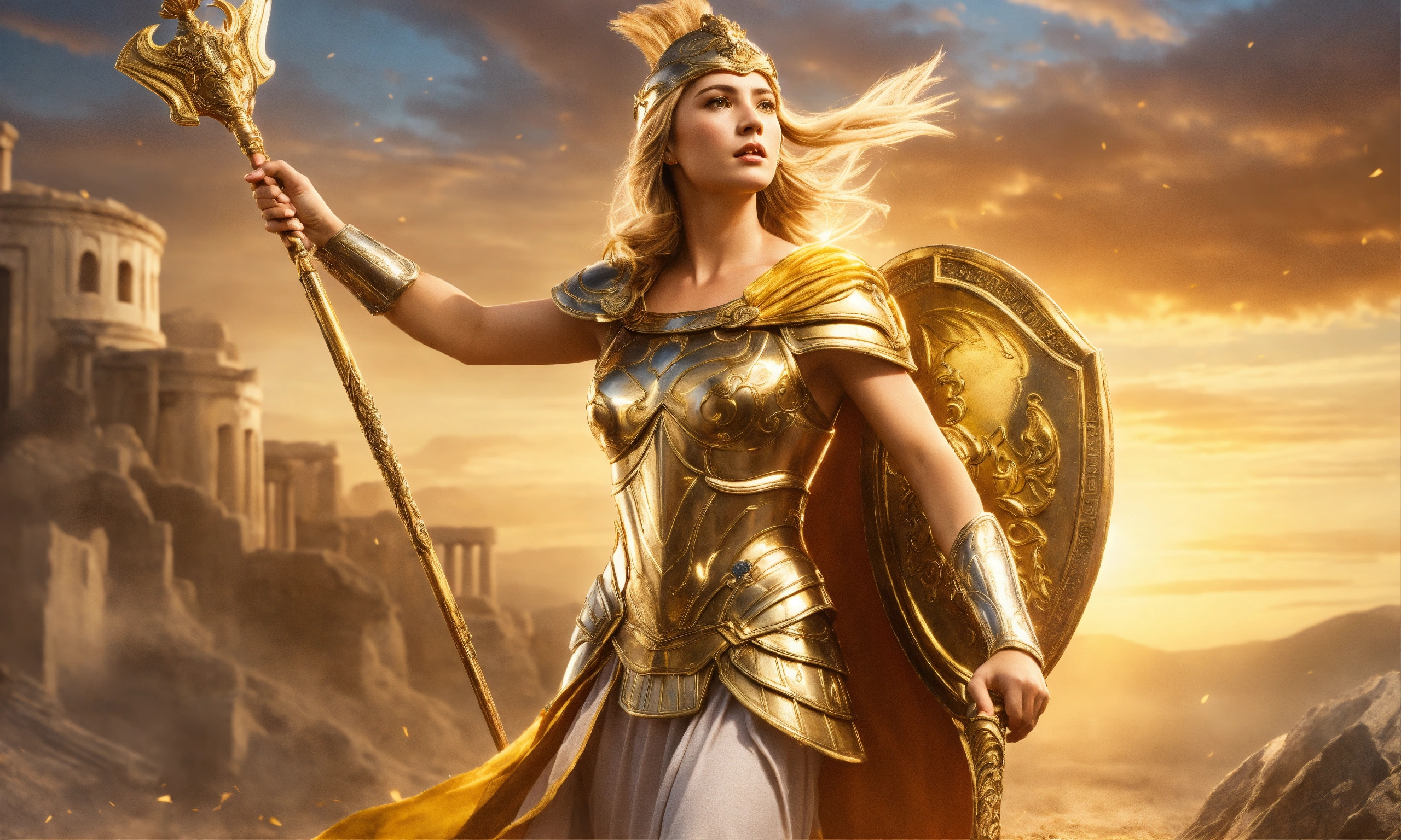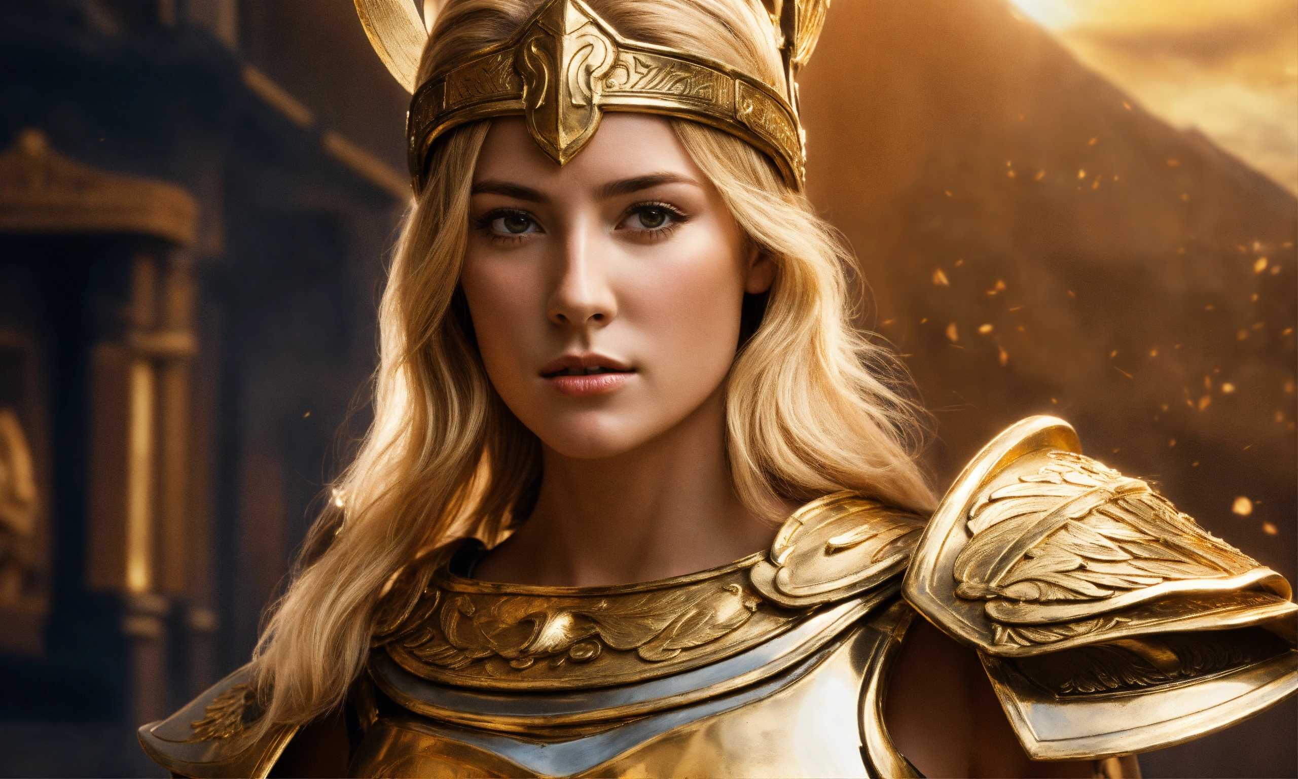 Greek goddess athena with blonde hair and wearing armor with gold trimming, she's being chased by greek god hephaestus who has brown hair and a brown beard, he's 50 years old, hyper-realistic