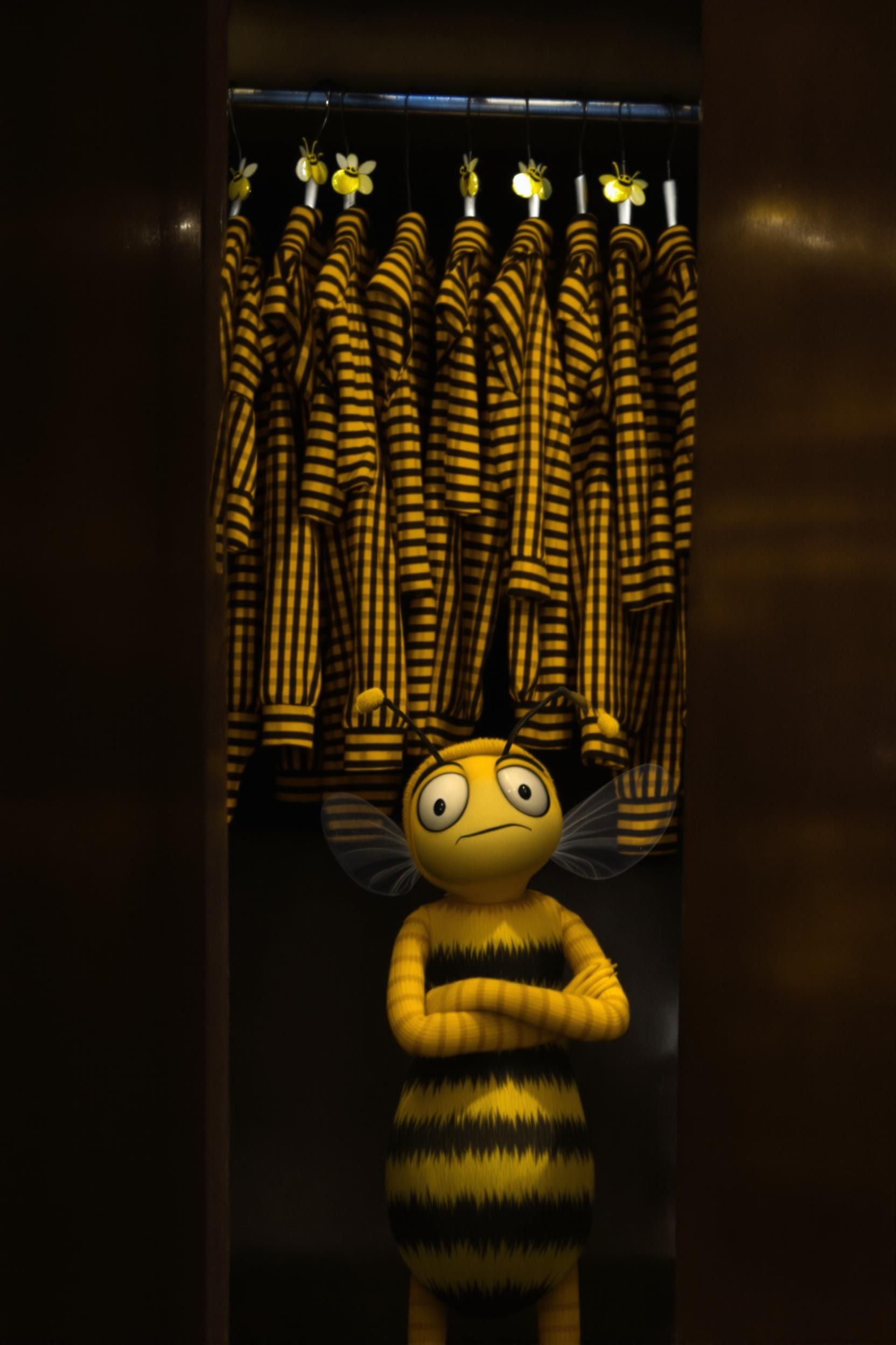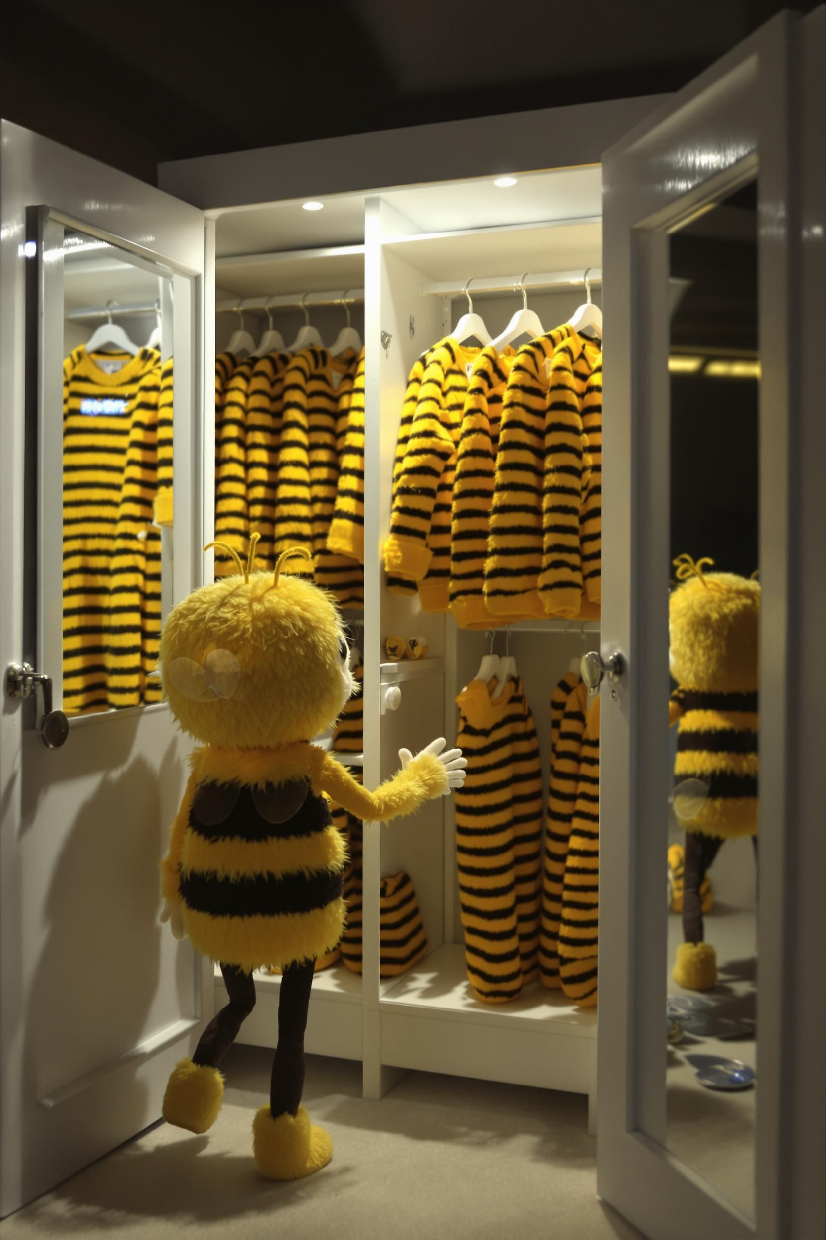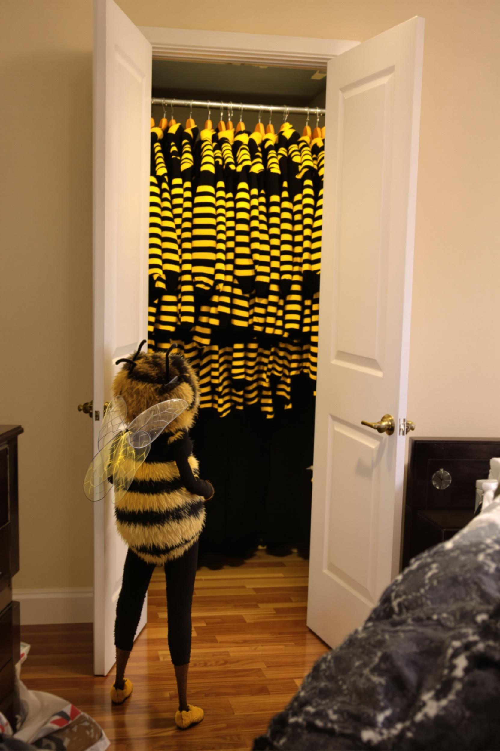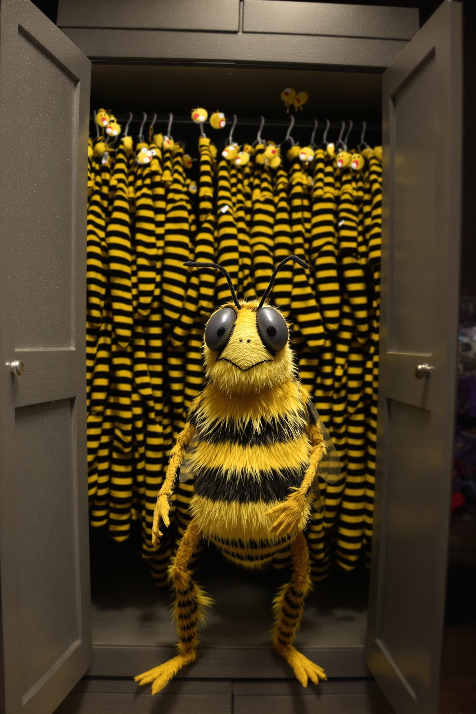Take with analog iphone with flash. drainy pic. a bee standing in fornt of her closet, thinking what to wear, while every clothes in the closet look the same (bee look), fotorealistik