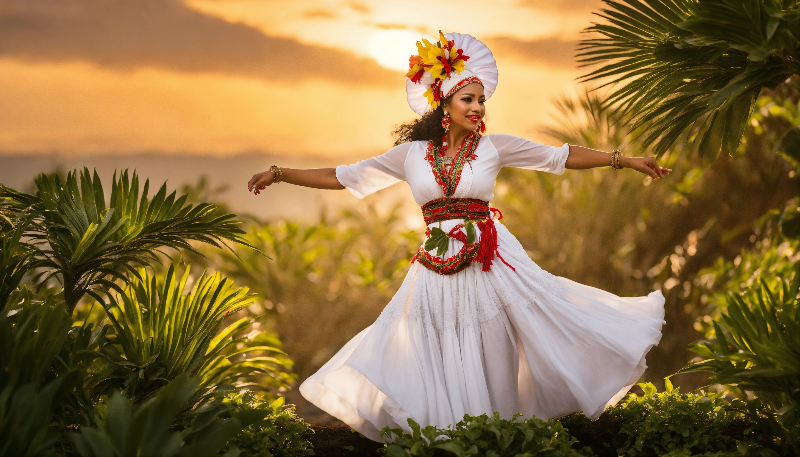 Traditional bomba y plena dancer from puerto rico, she is wearing traditional white bomba dress and head wrap, shes giving life to the plants around her as she’s dancing, keep the design simple