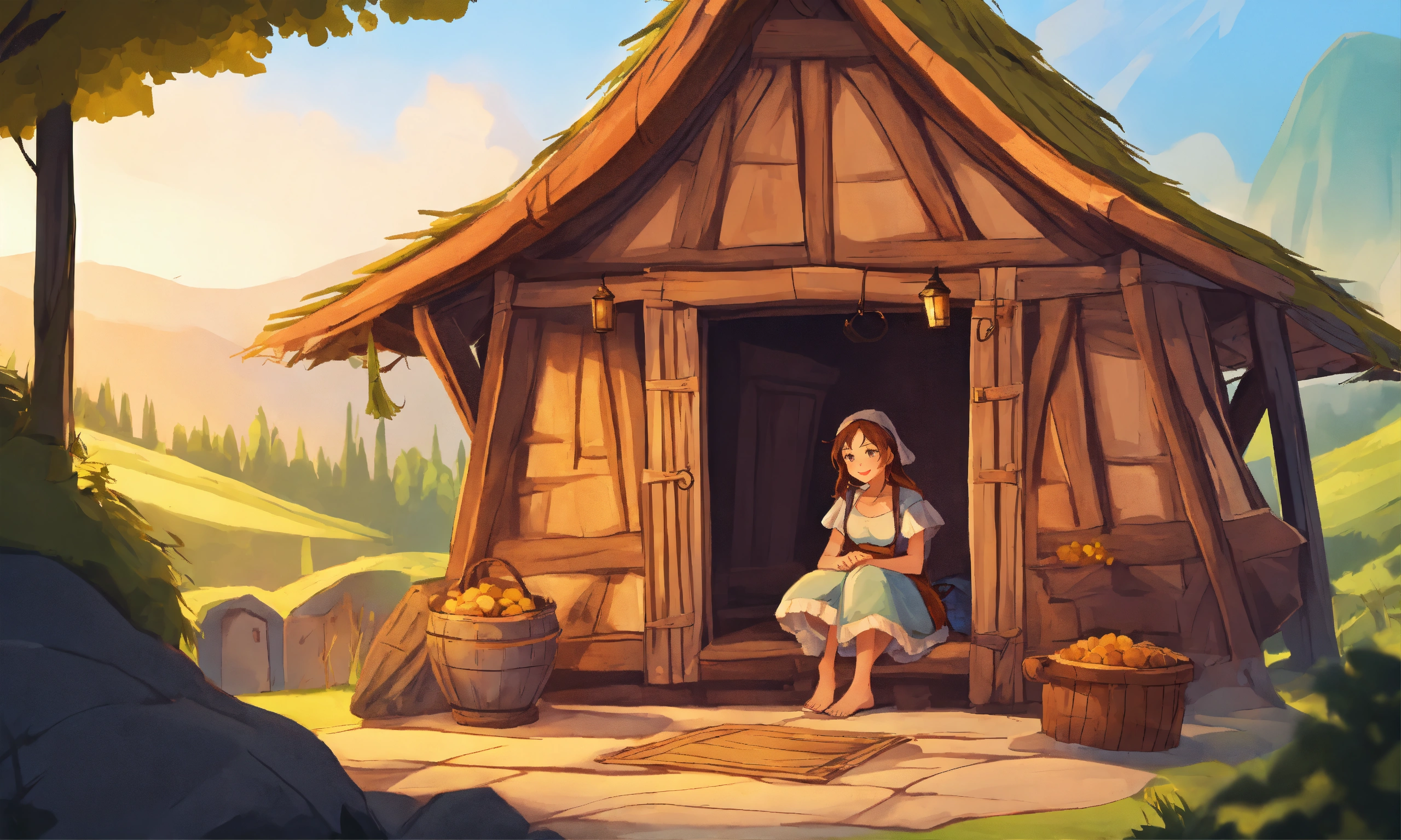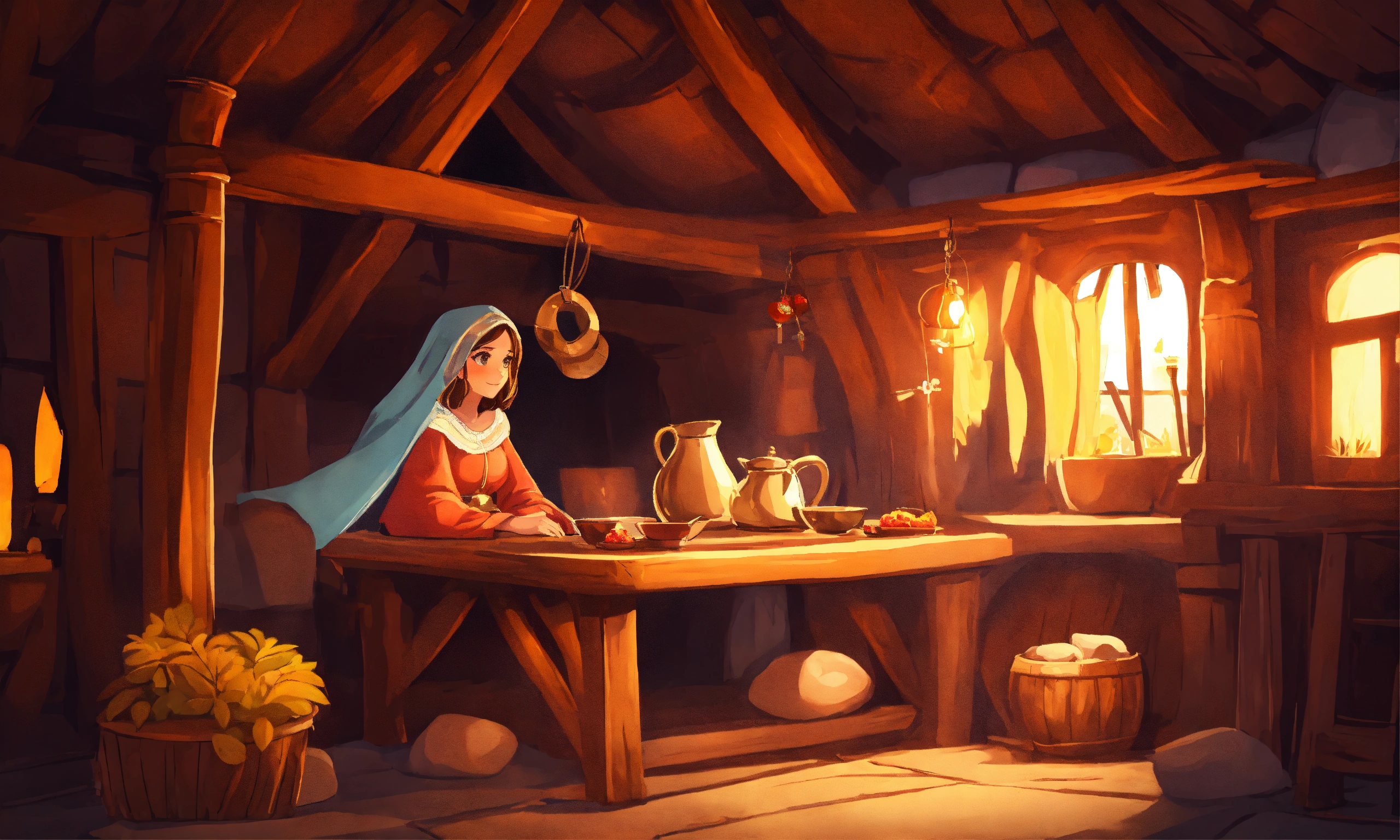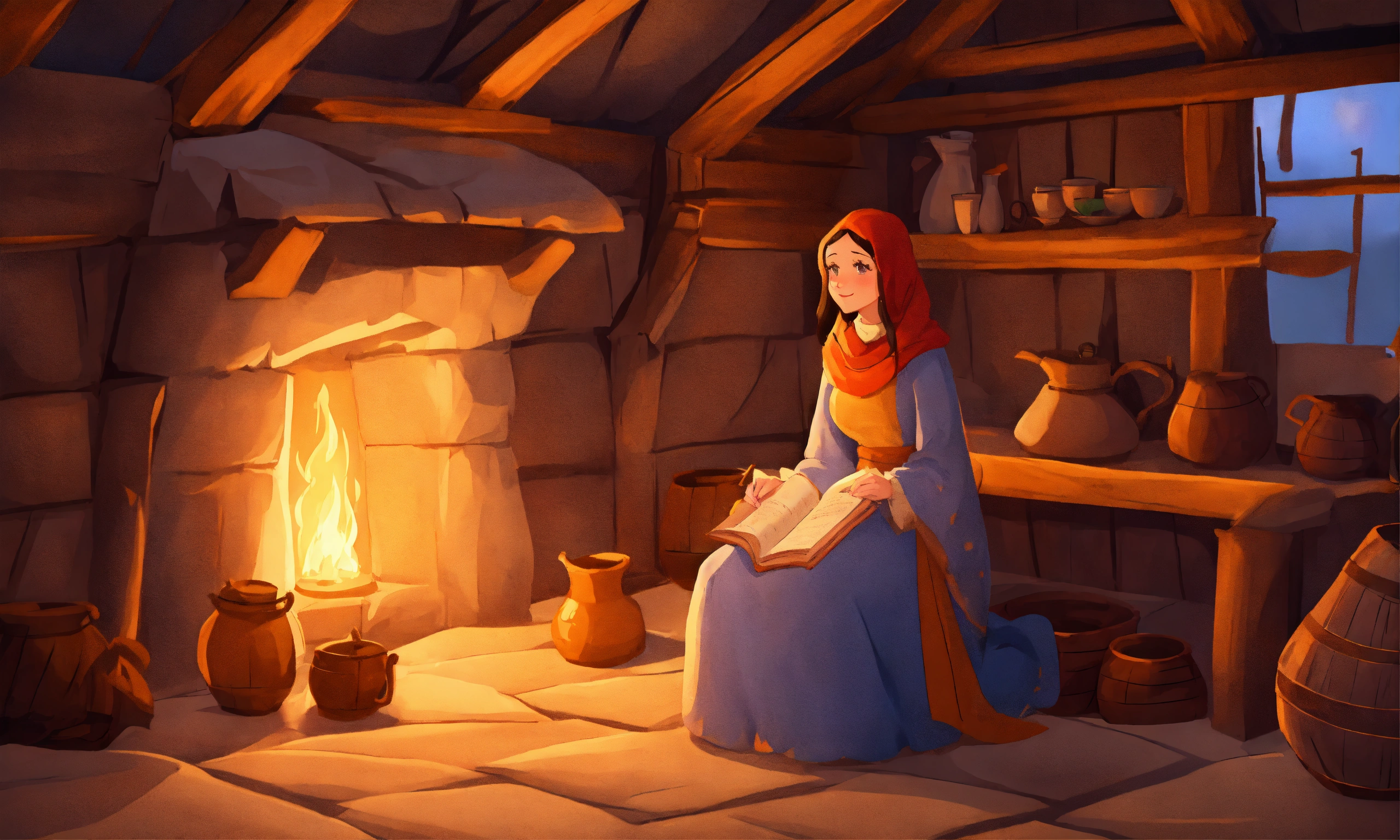 One cartoon style women in a cozy medieval hut